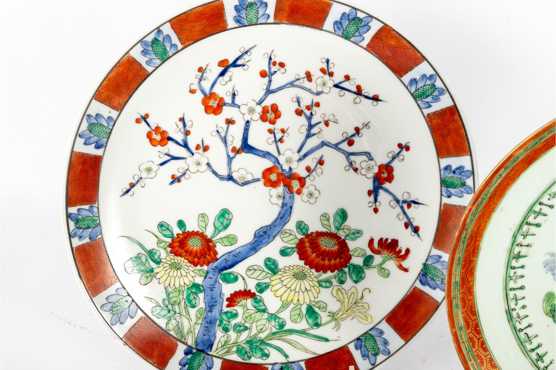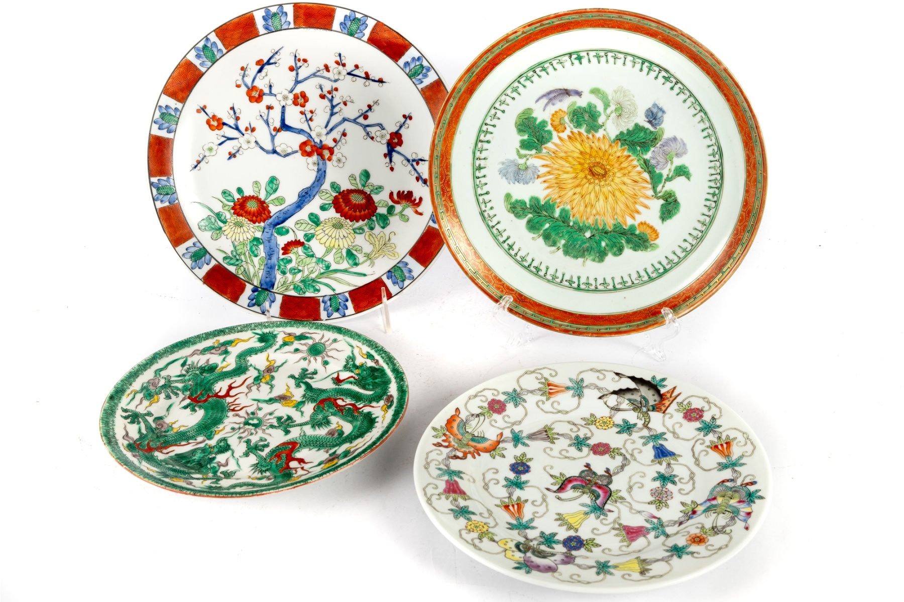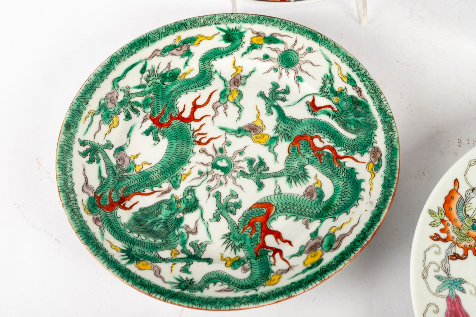 This set of four antique 19th century Asian porcelain plates are lavishly decorated, showcasing masterful craftsmanship and vibrant artistry. Each plate is adorned with intricate designs, prominently featuring dragons and florals in beautiful famille verte.