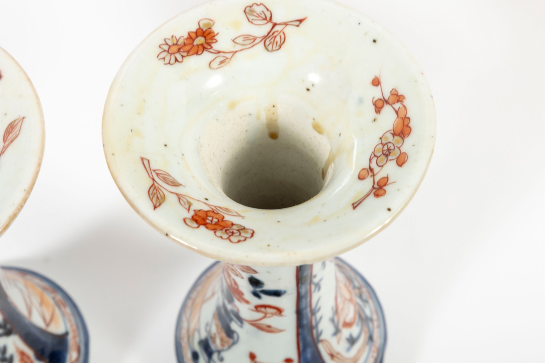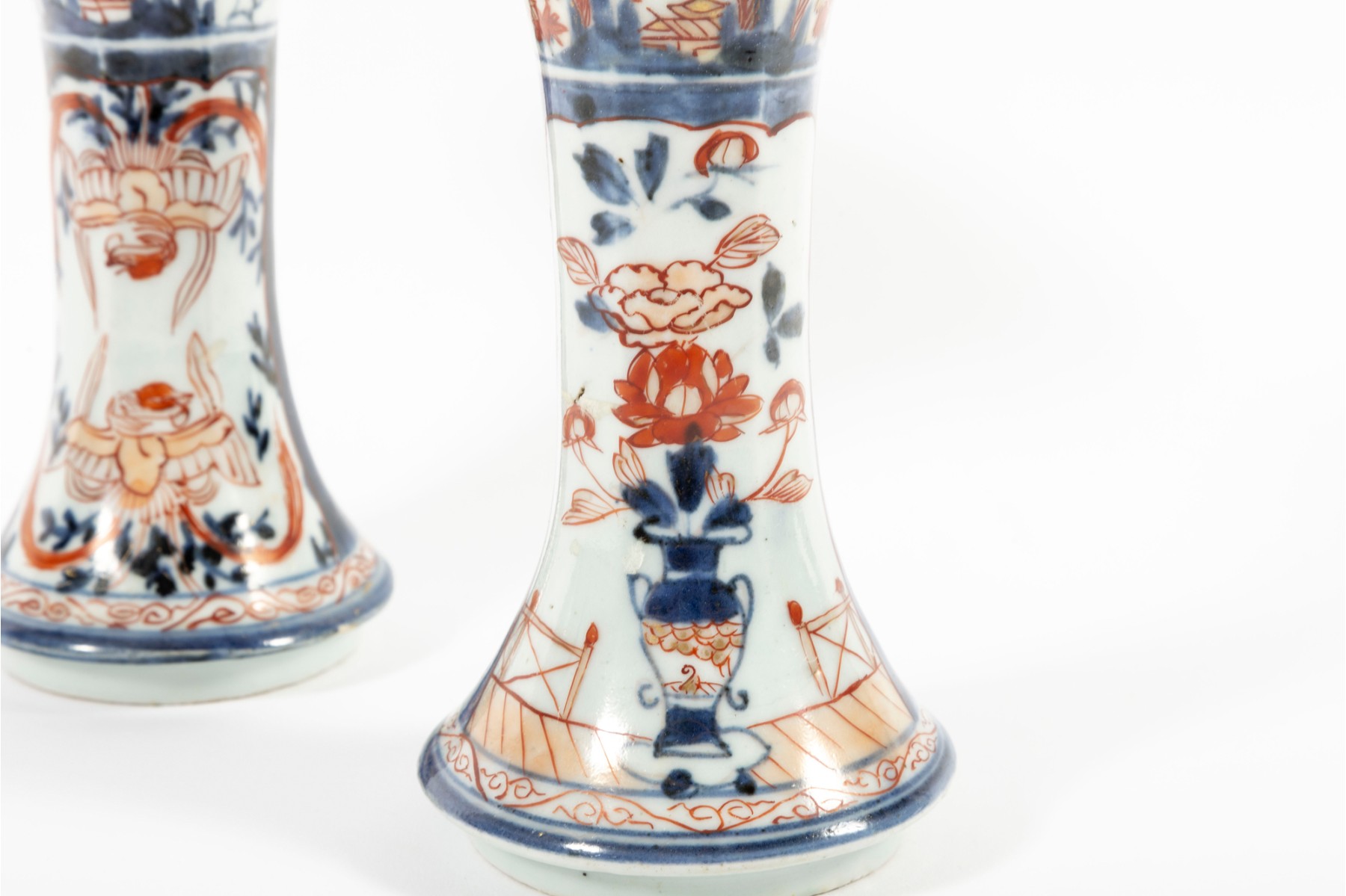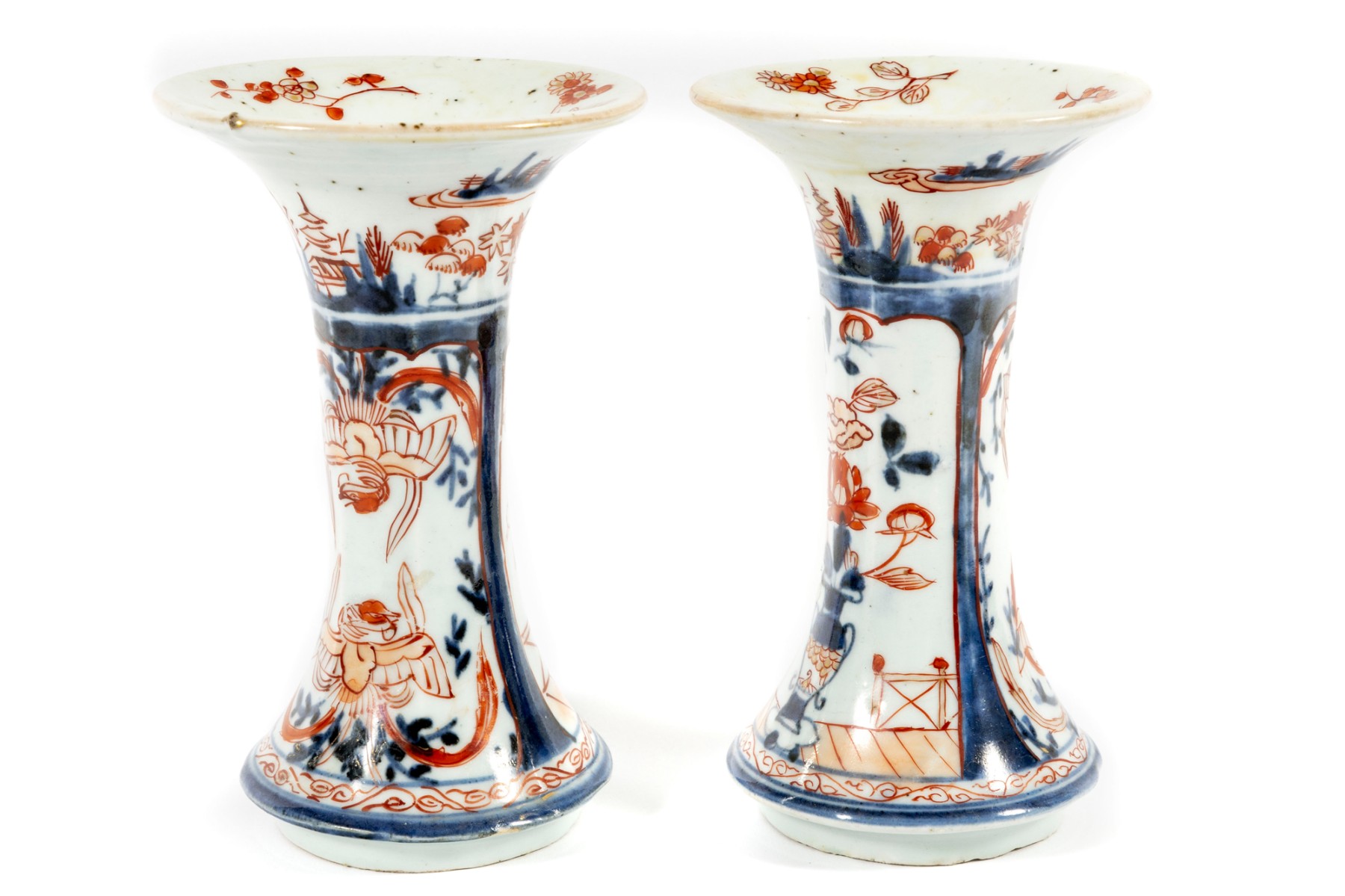 A pair of exquisite imari porcelain trumpet vases finely decorated in hand-painted panel scenes including florals and birds. Japanese, circa 19th century.