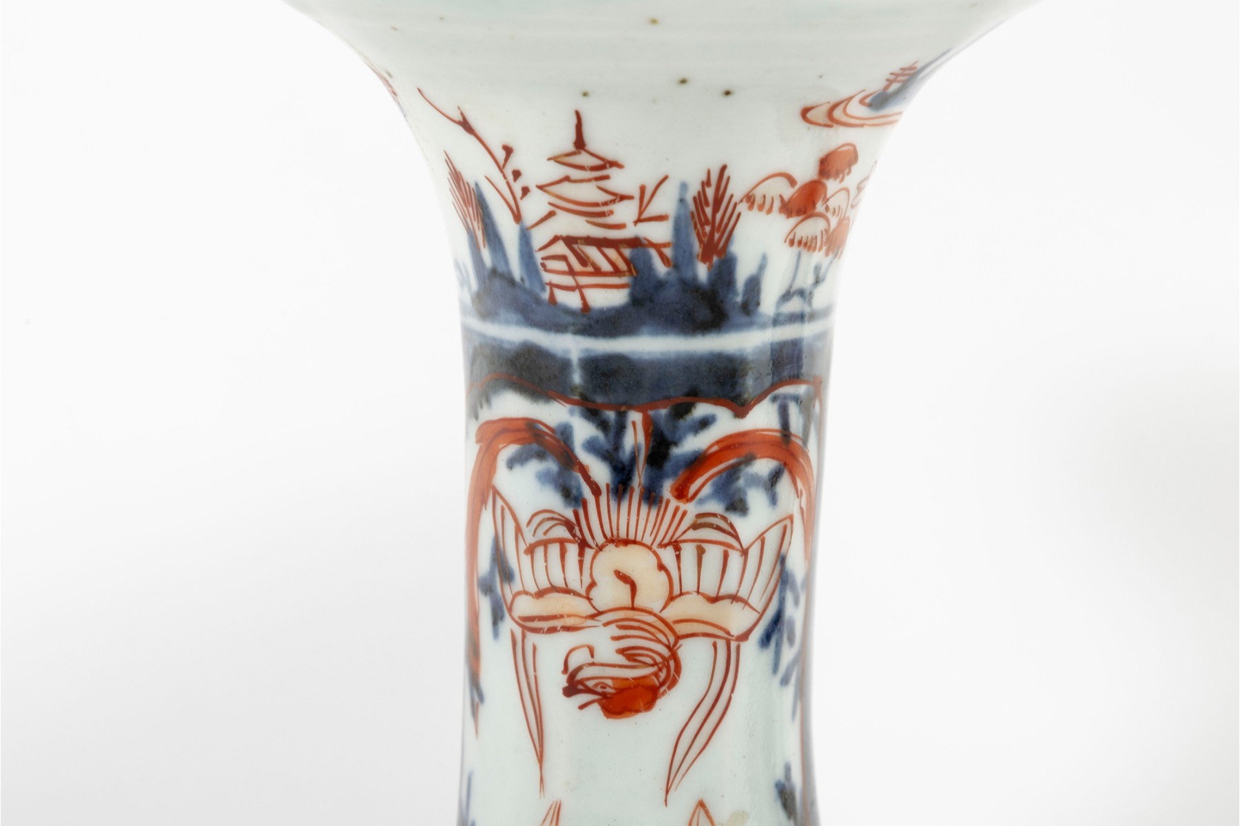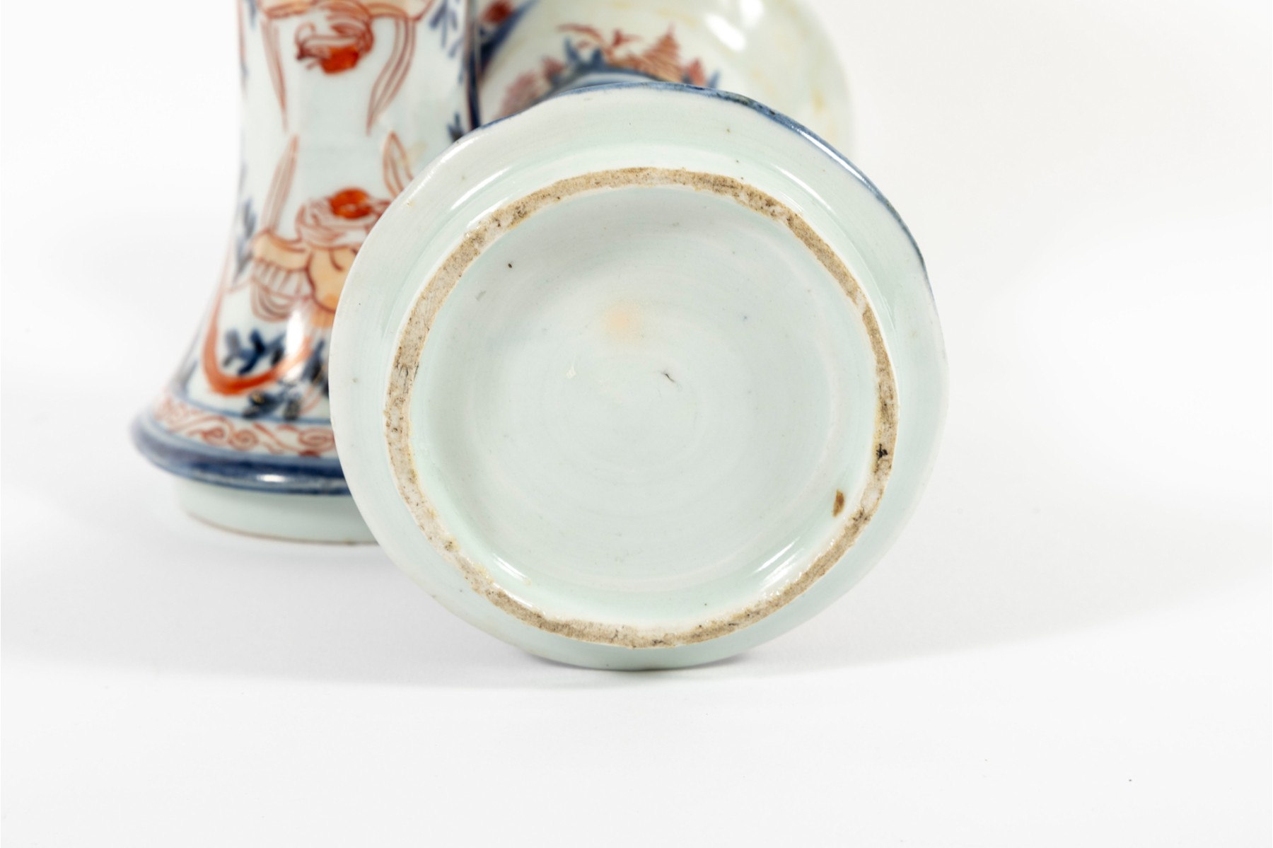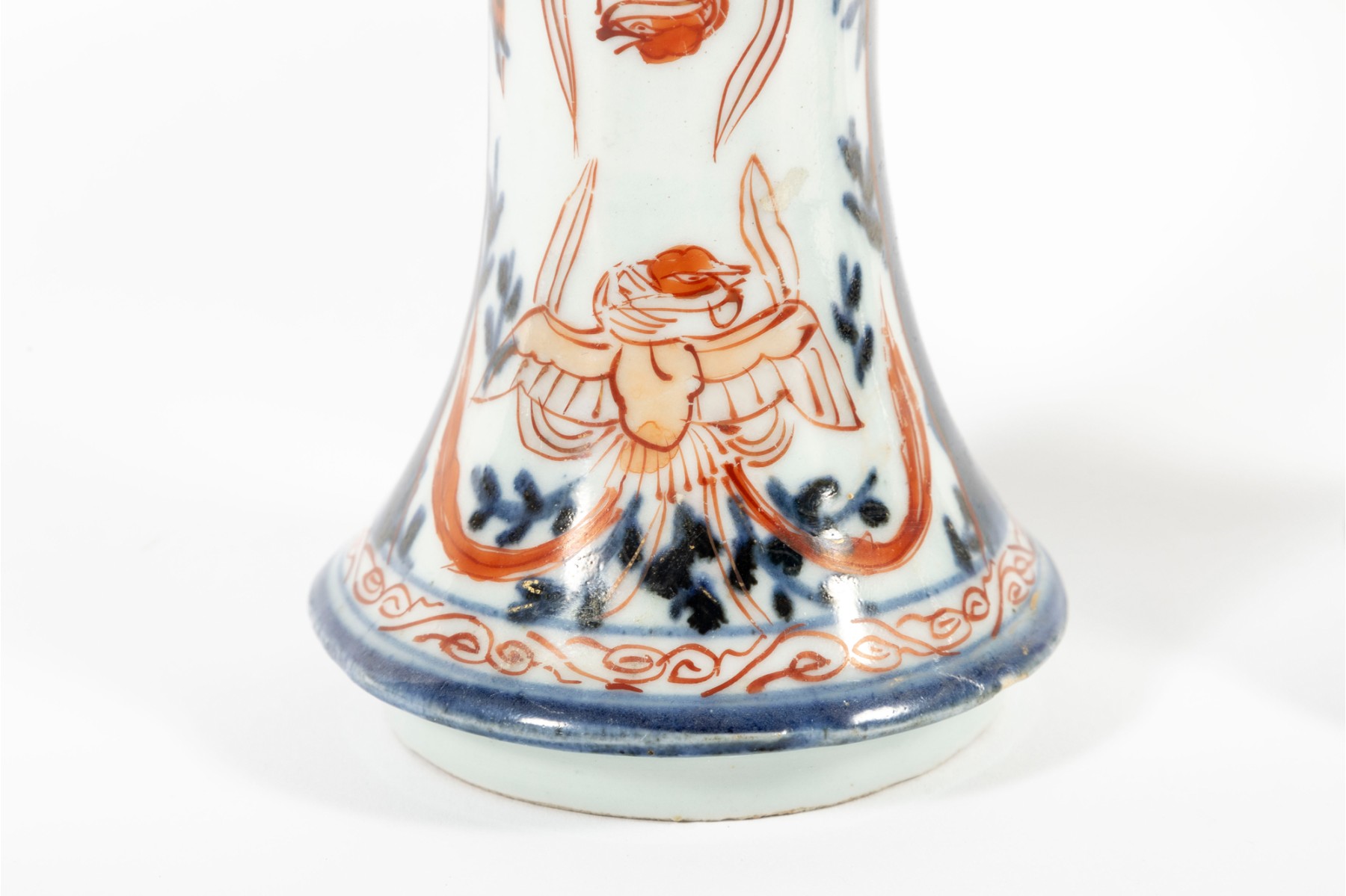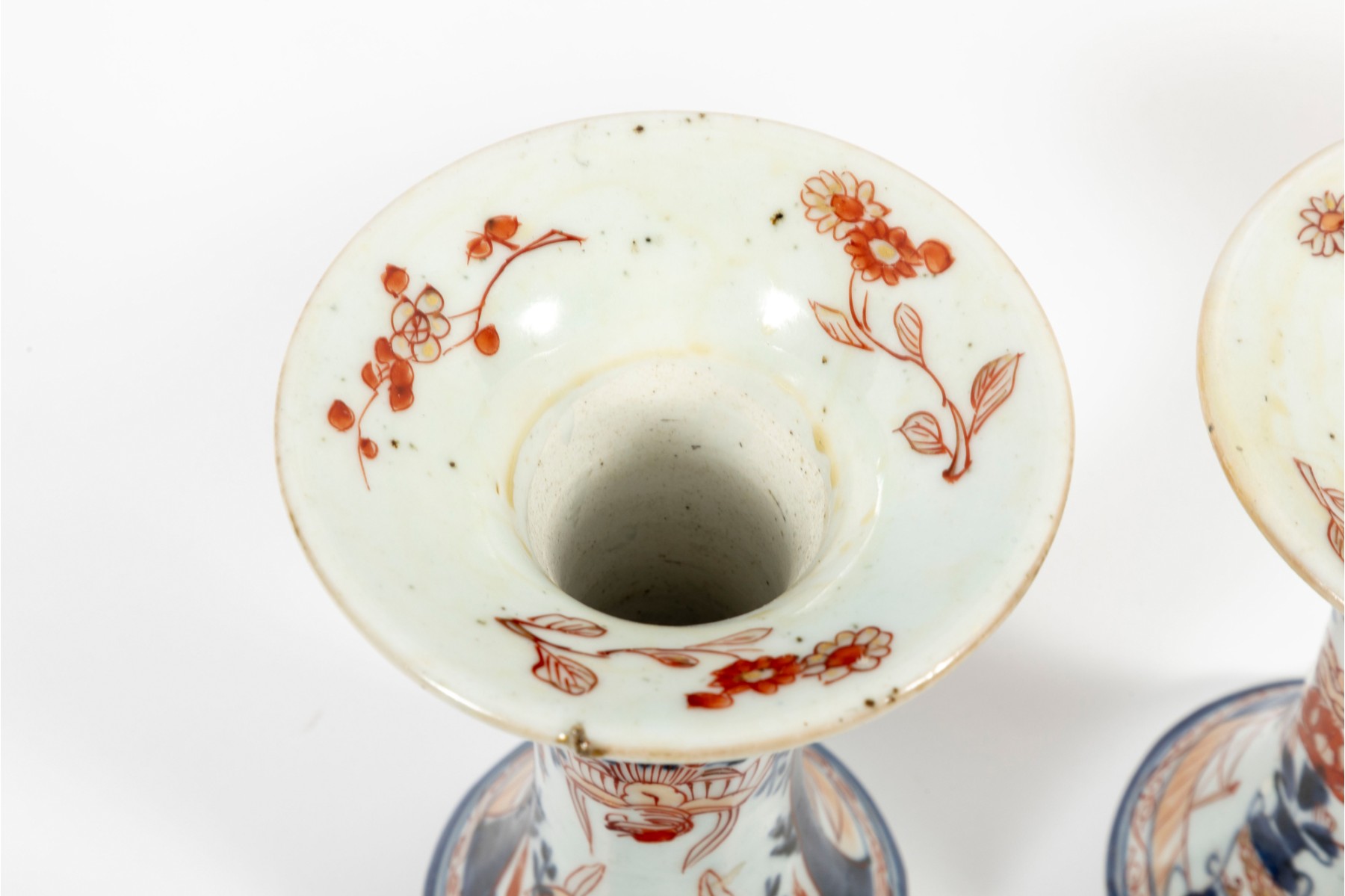 A pair of exquisite imari porcelain trumpet vases finely decorated in hand-painted panel scenes including florals and birds. Japanese, circa 19th century.