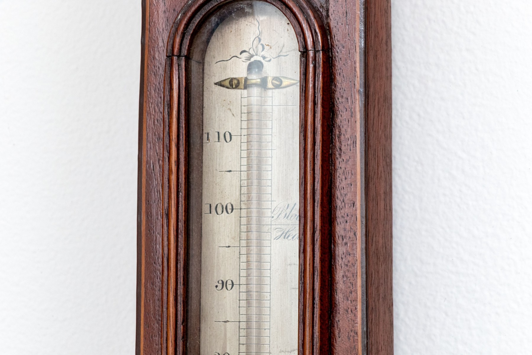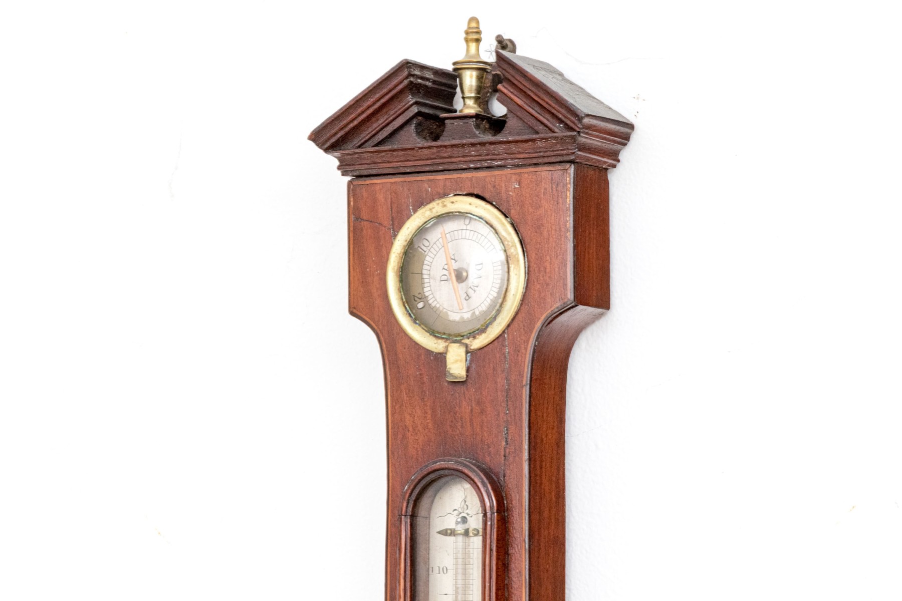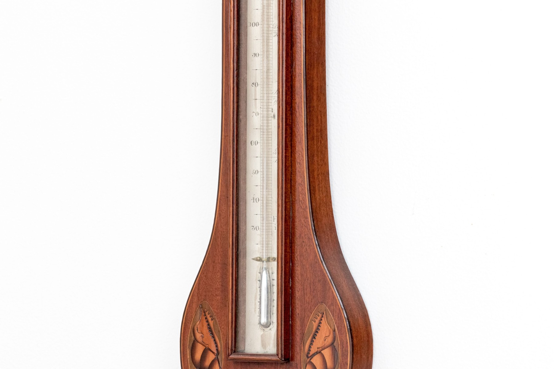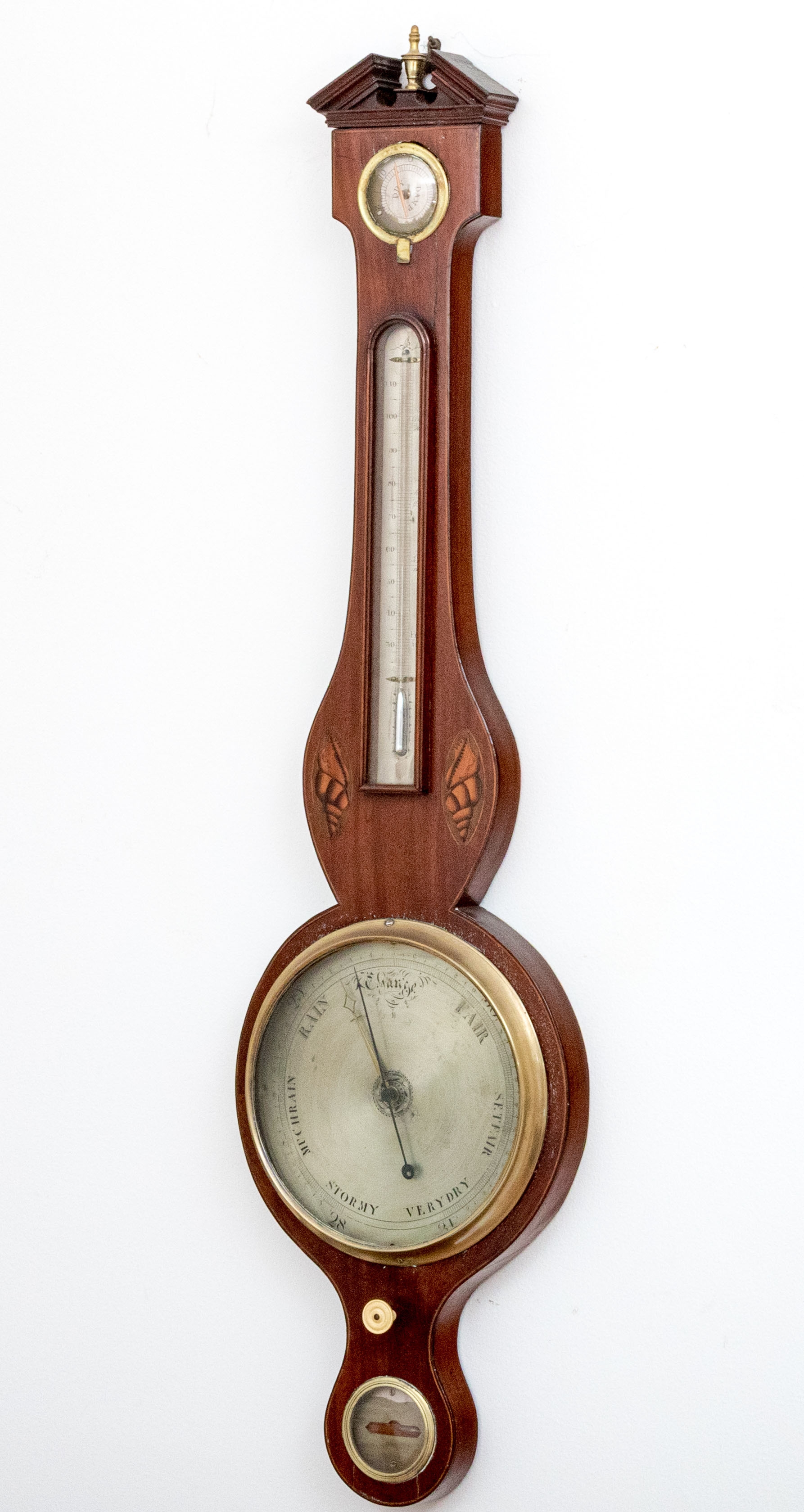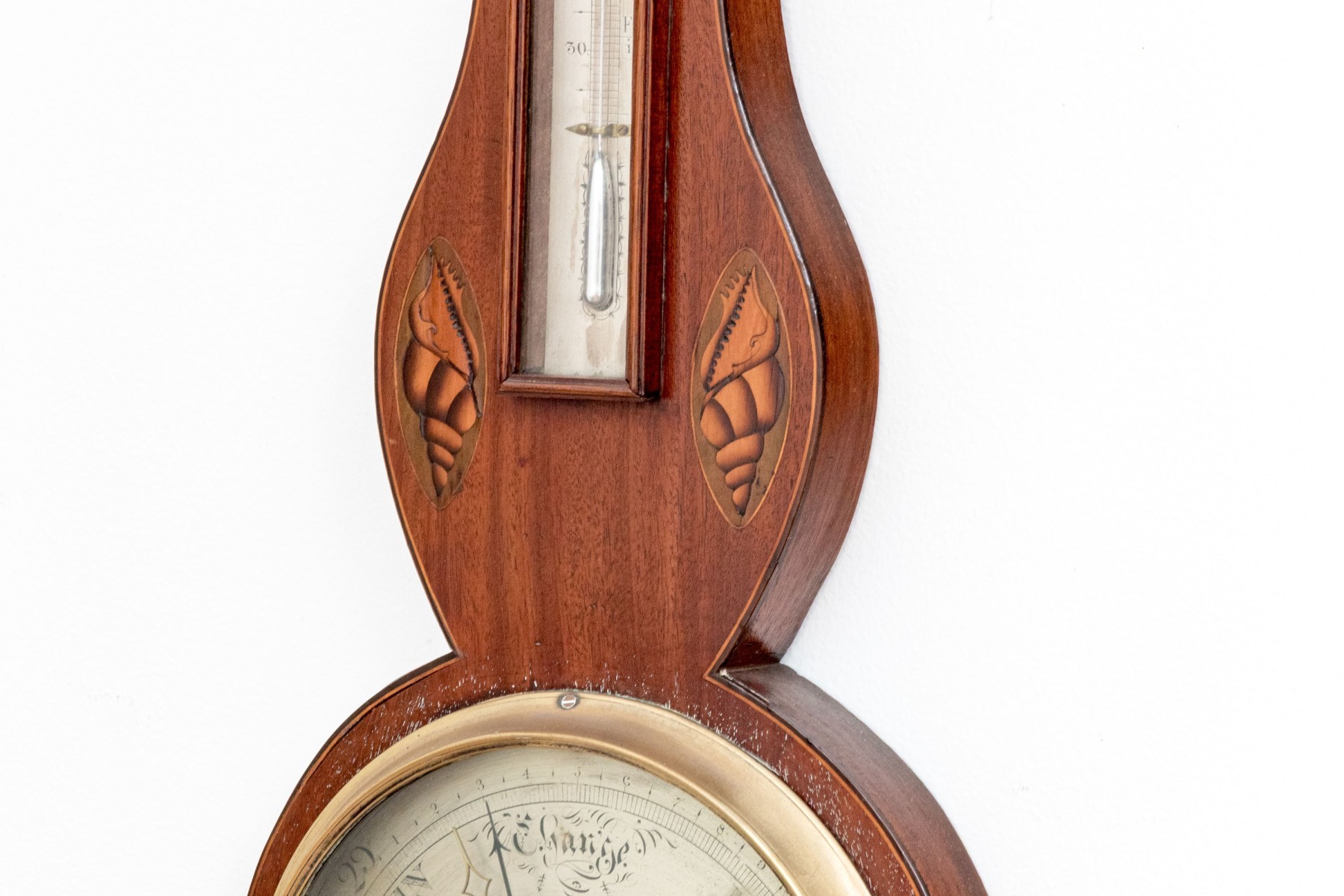 A gorgeous 19th century barometer designed with stately Regency flare with a broken bonnet pediment adorned with a brass urn finial at the center heralding a series of four dials, one including mercury. The body has a wonderful balance of curves and straight lines, and is decorated with two inlaid conch shell motifs.