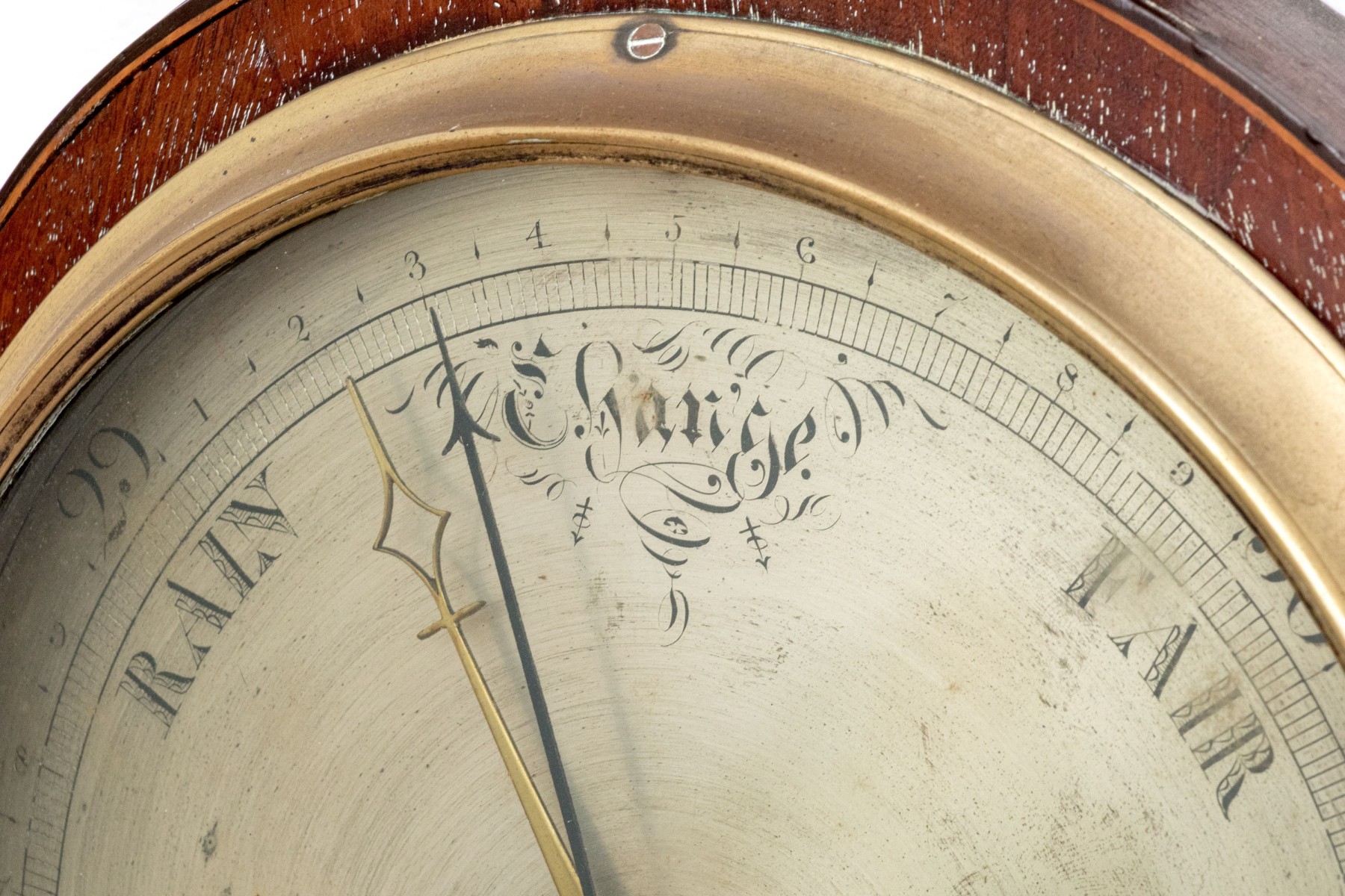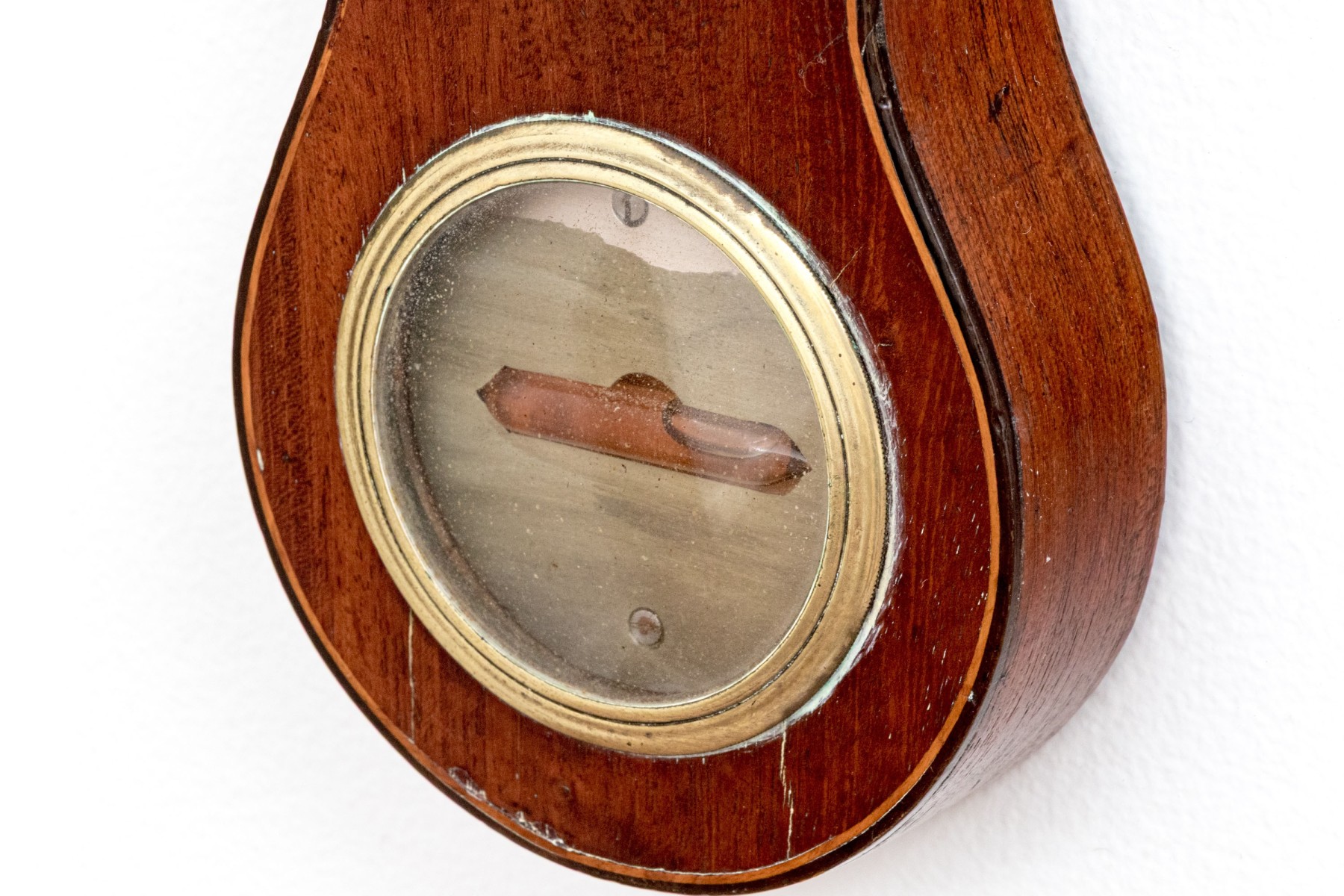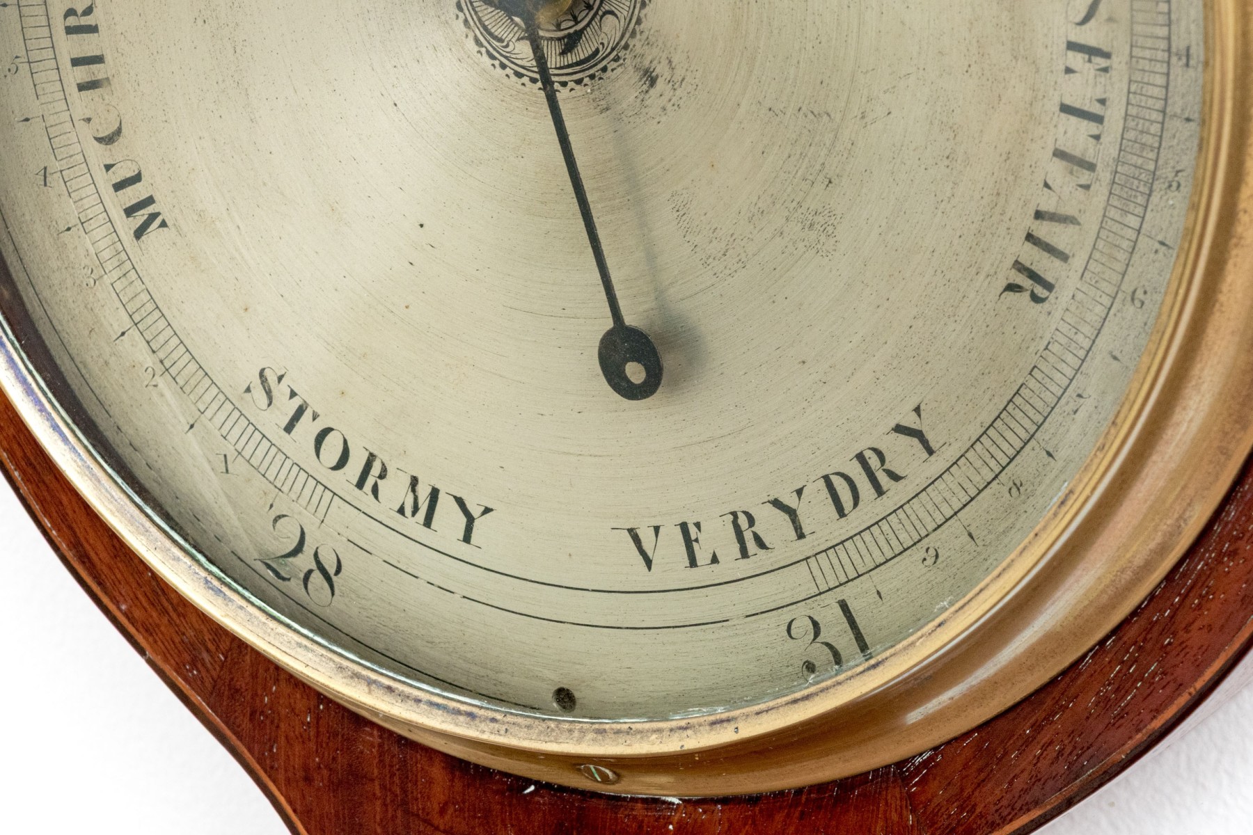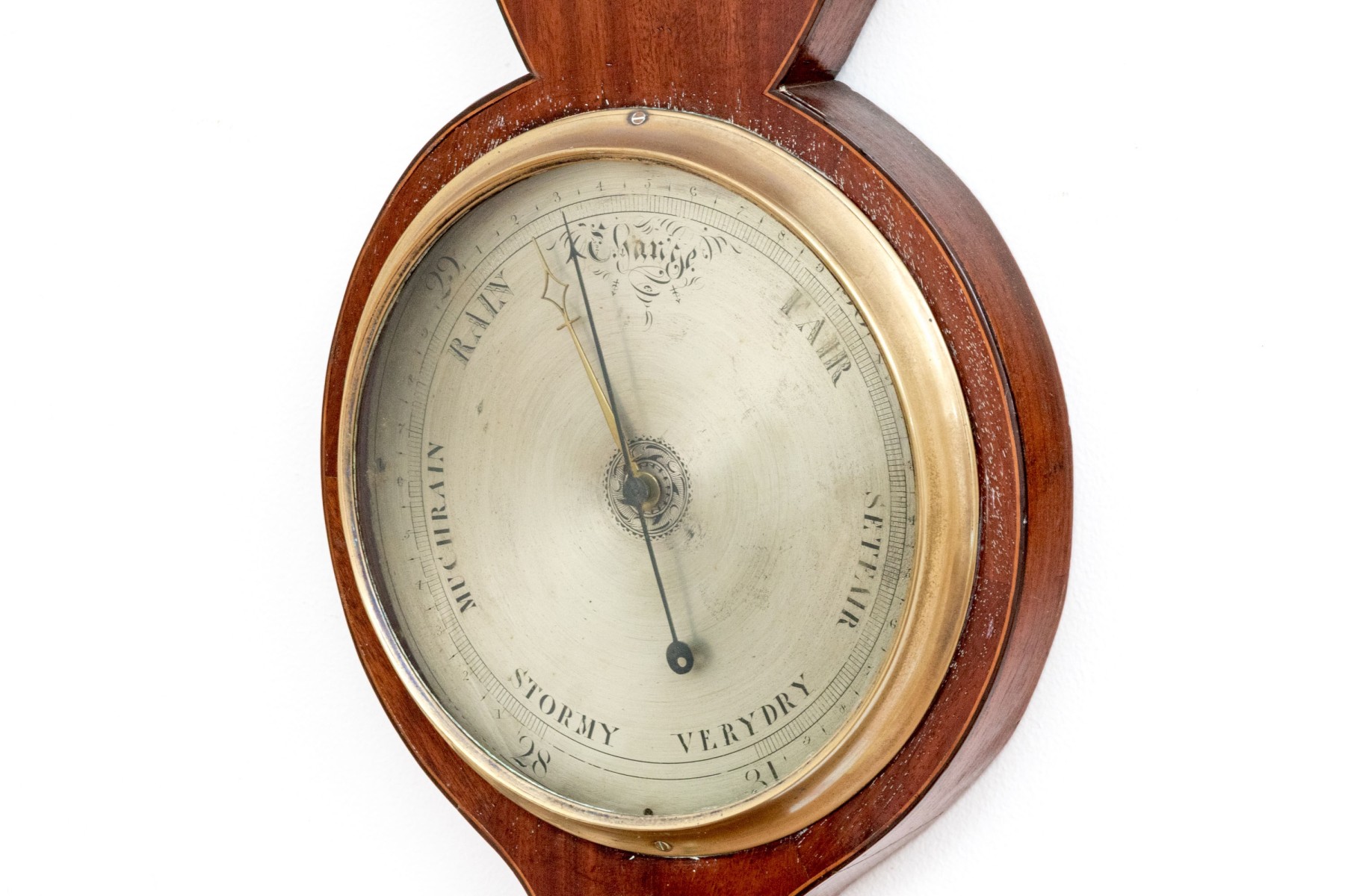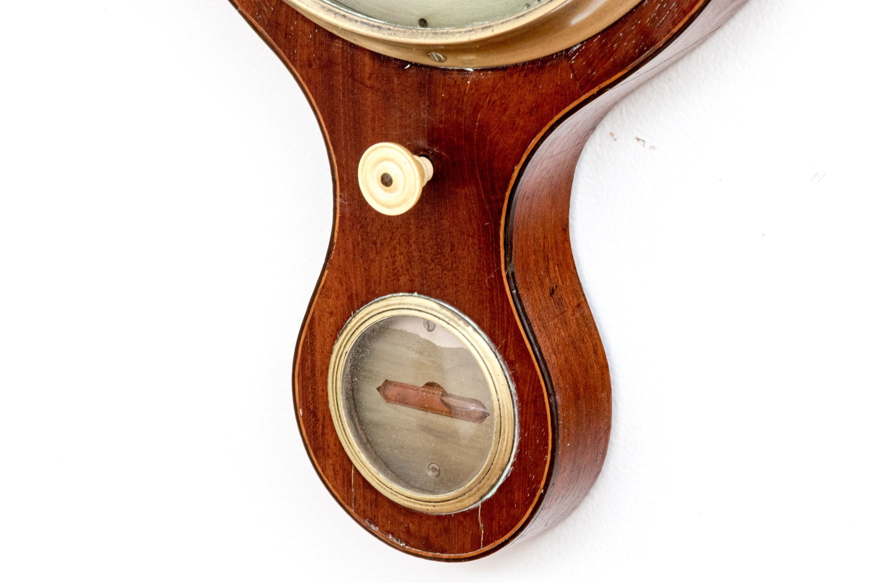 A gorgeous 19th century barometer designed with stately Regency flare with a broken bonnet pediment adorned with a brass urn finial at the center heralding a series of four dials, one including mercury. The body has a wonderful balance of curves and straight lines, and is decorated with two inlaid conch shell motifs.