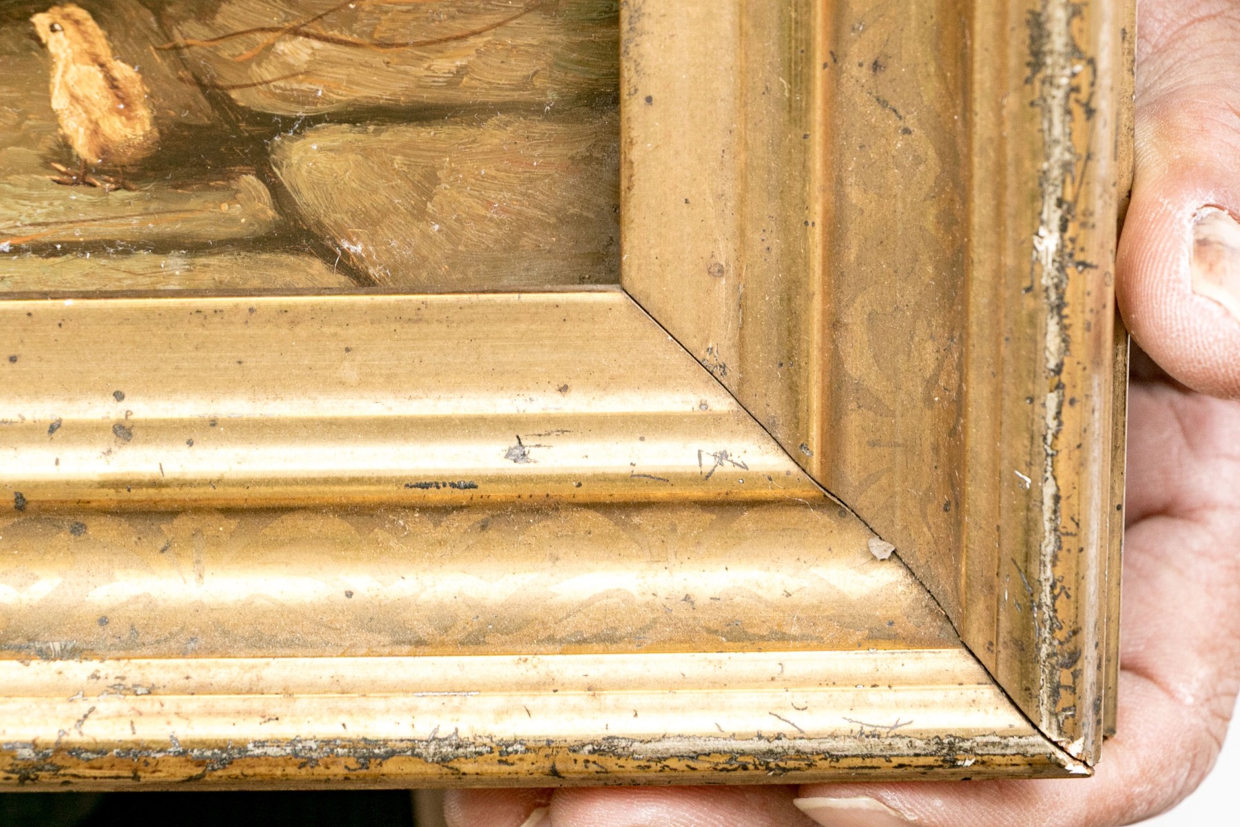 Unsigned. A chicken and her sweet chicks are feeding on the stone barn floor. Along with pigeons on the trough and pavement near the bucket and broom. Presented in a fine period gilt wood frame.