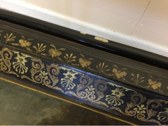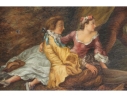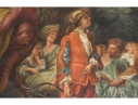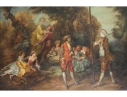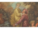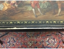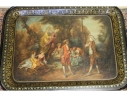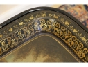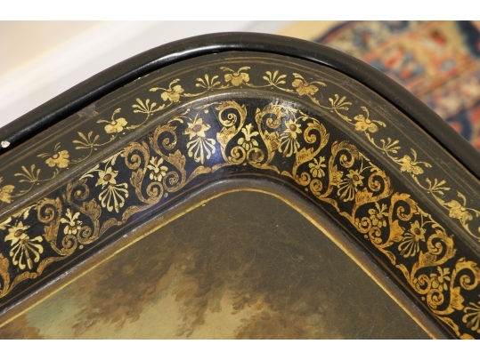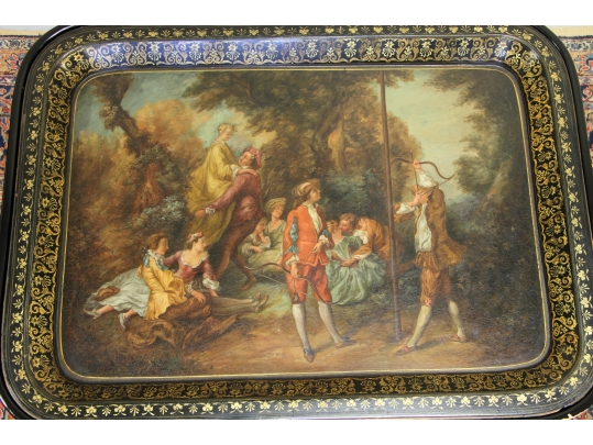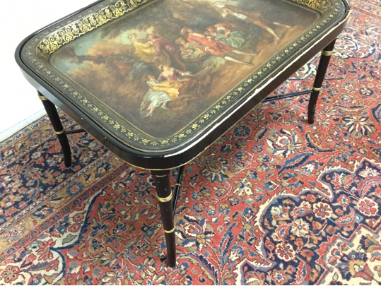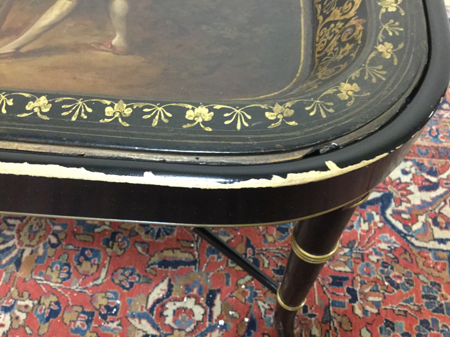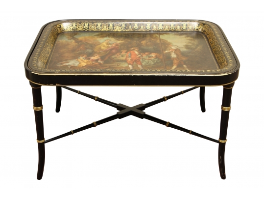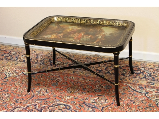 Handprinted figural scene on paper mache tray with elaborate gilt embellishments on a later Regency style bamboo form stand with X stretcher.