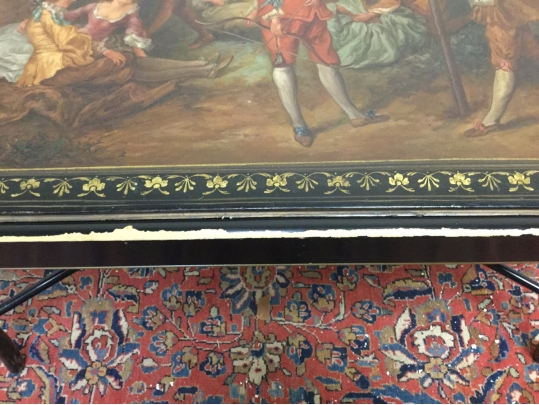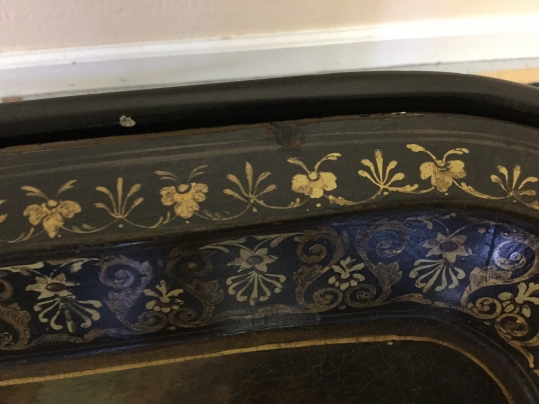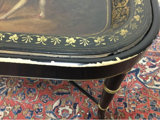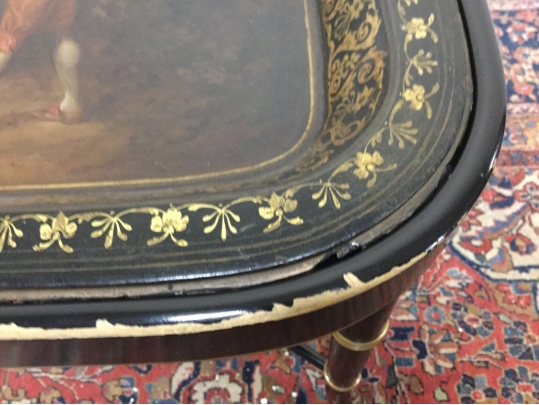 Condition: There is craquelure throughout, a few spots of loss to the tray edge, a few spots of loss in the craquelure itself, loss to the ebonized stand edge.