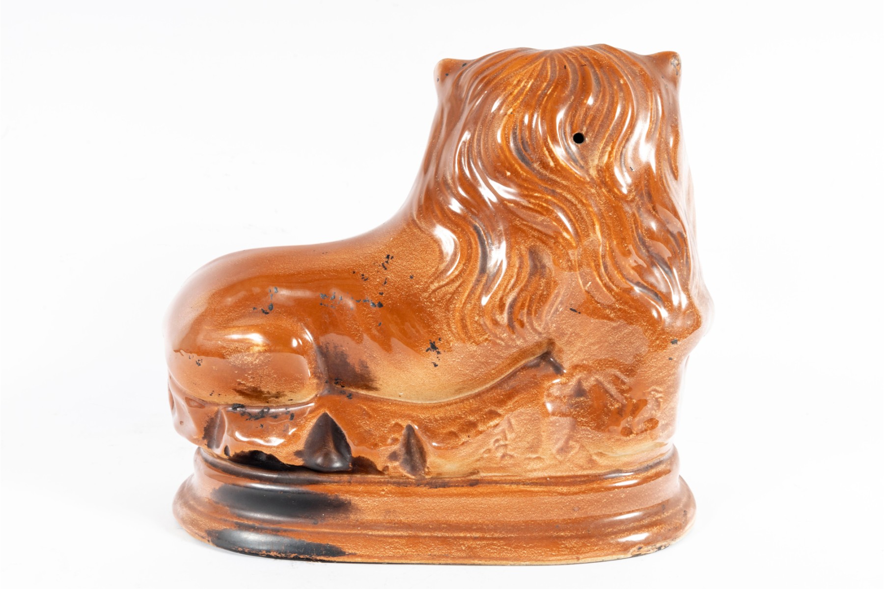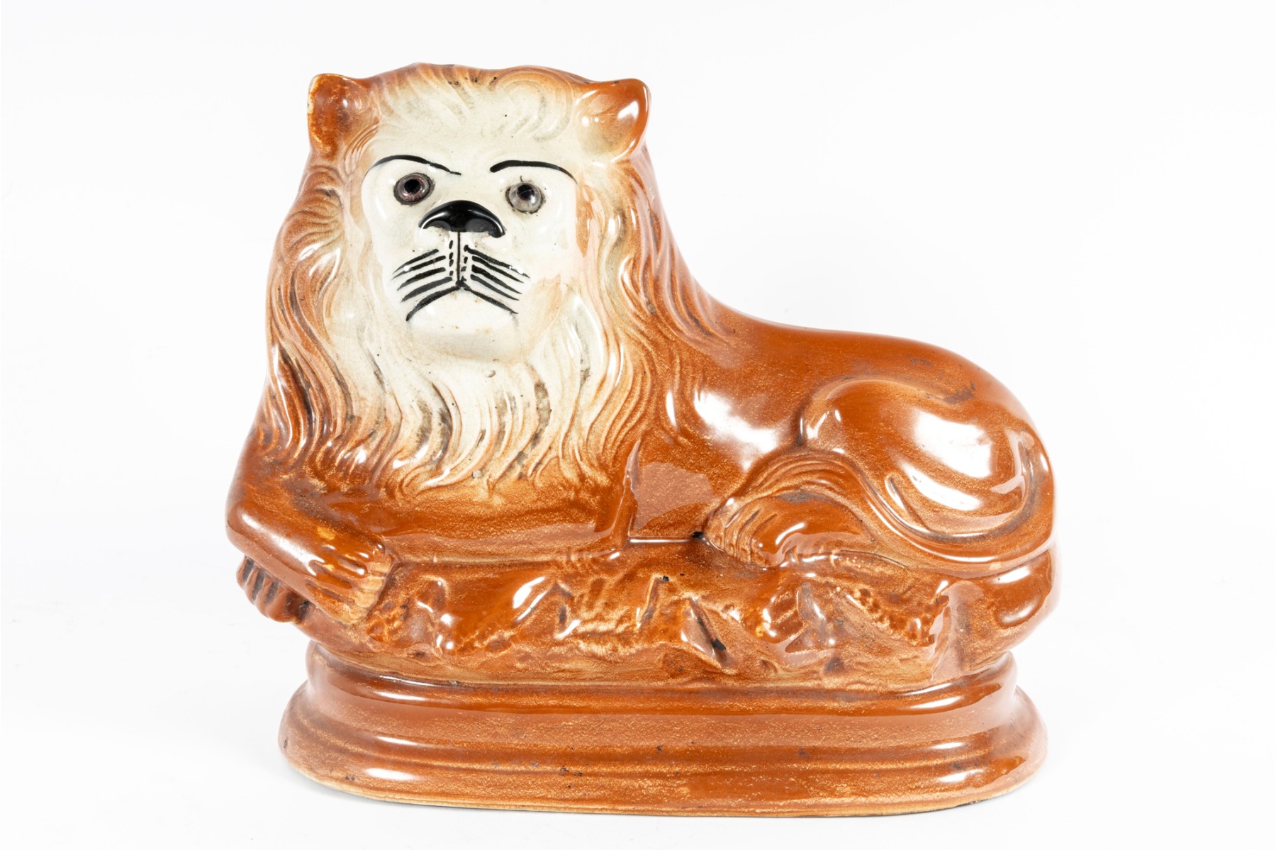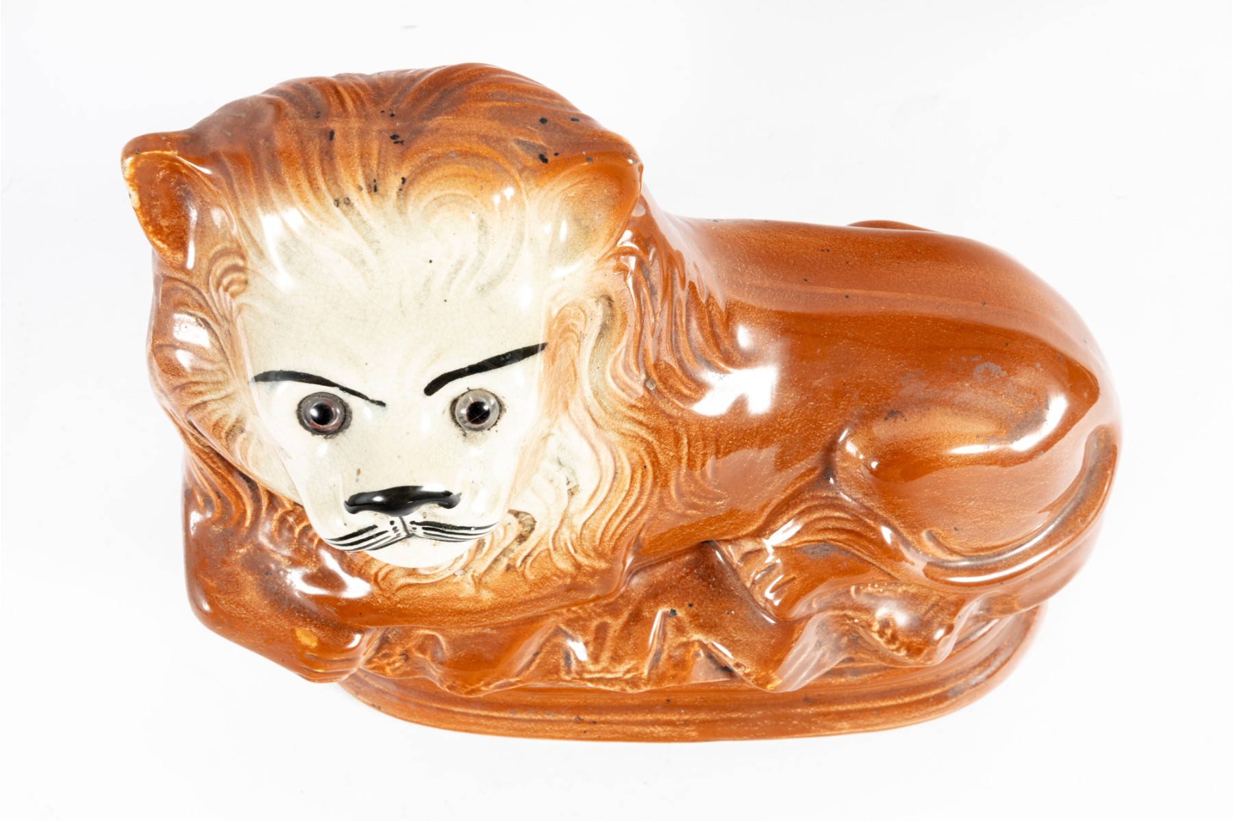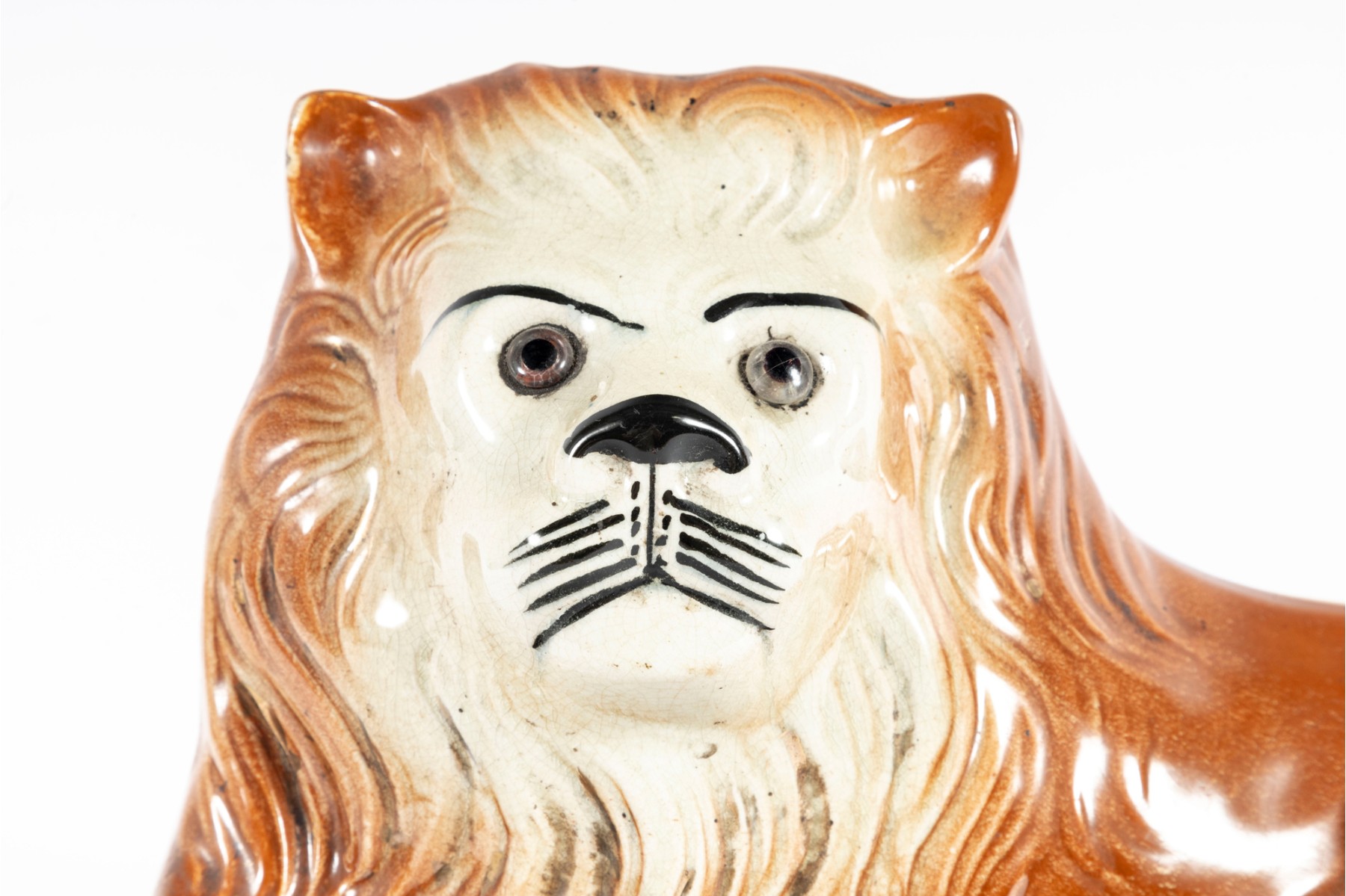 This Staffordshire earthenware lion, dating to circa 1850, is a fine example of Victorian-era English pottery. Handcrafted with great attention to detail, the lion features a proud, majestic pose typical of the period’s animal figurines complete with glass eyes and hand-painted facial features.