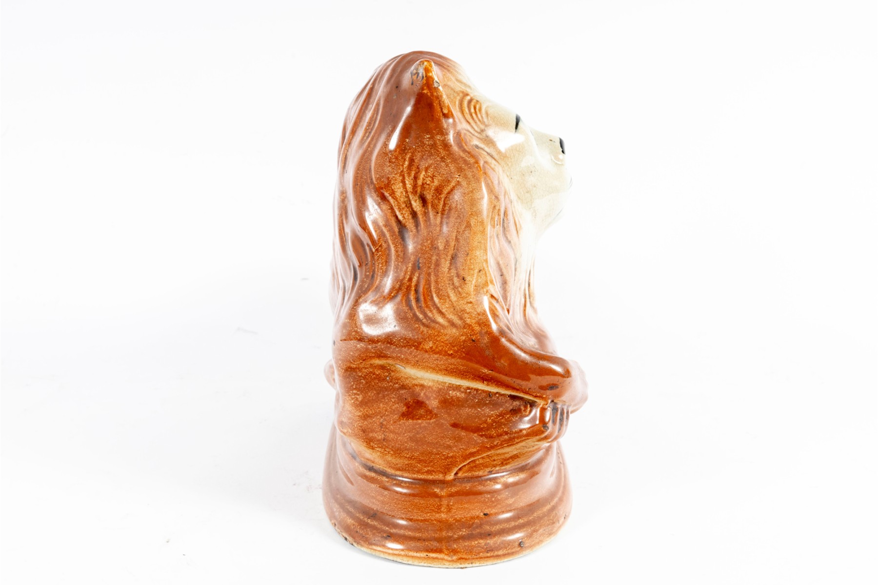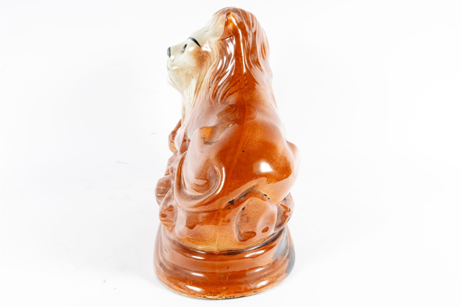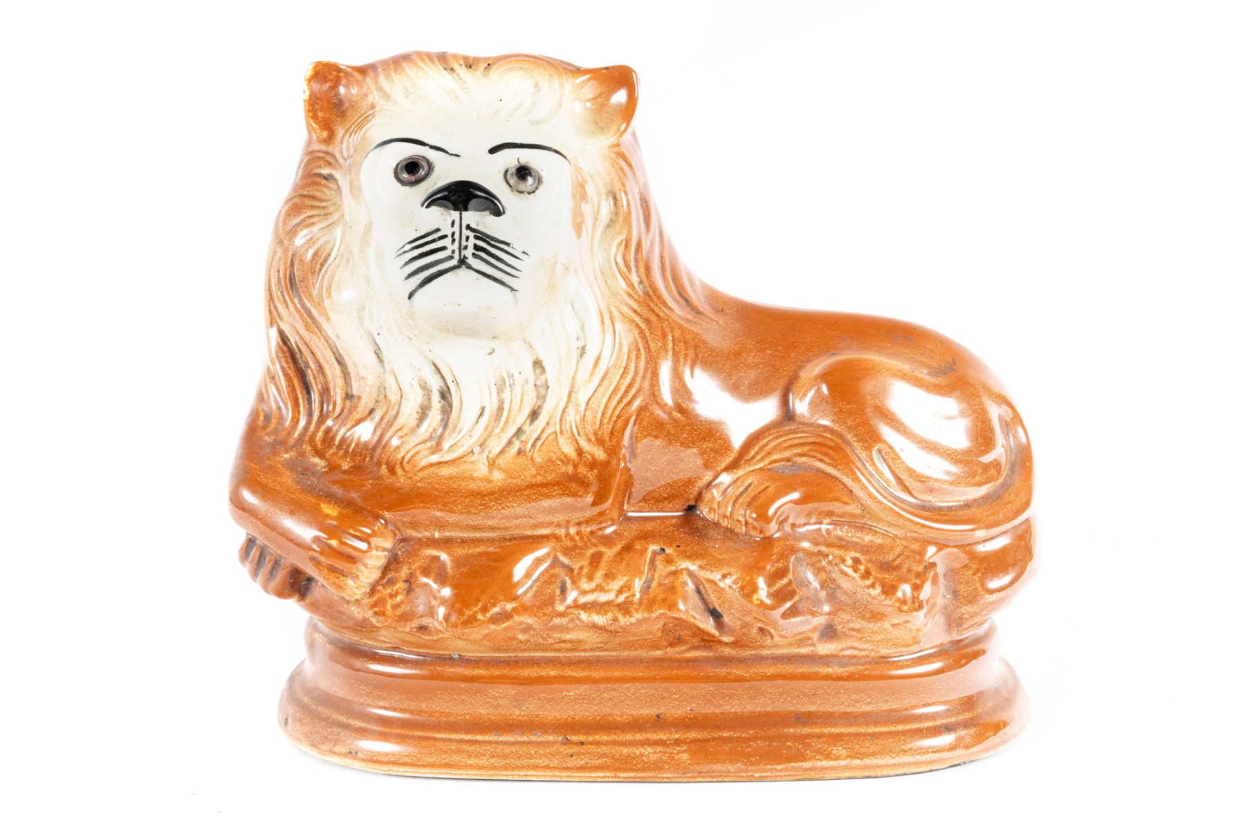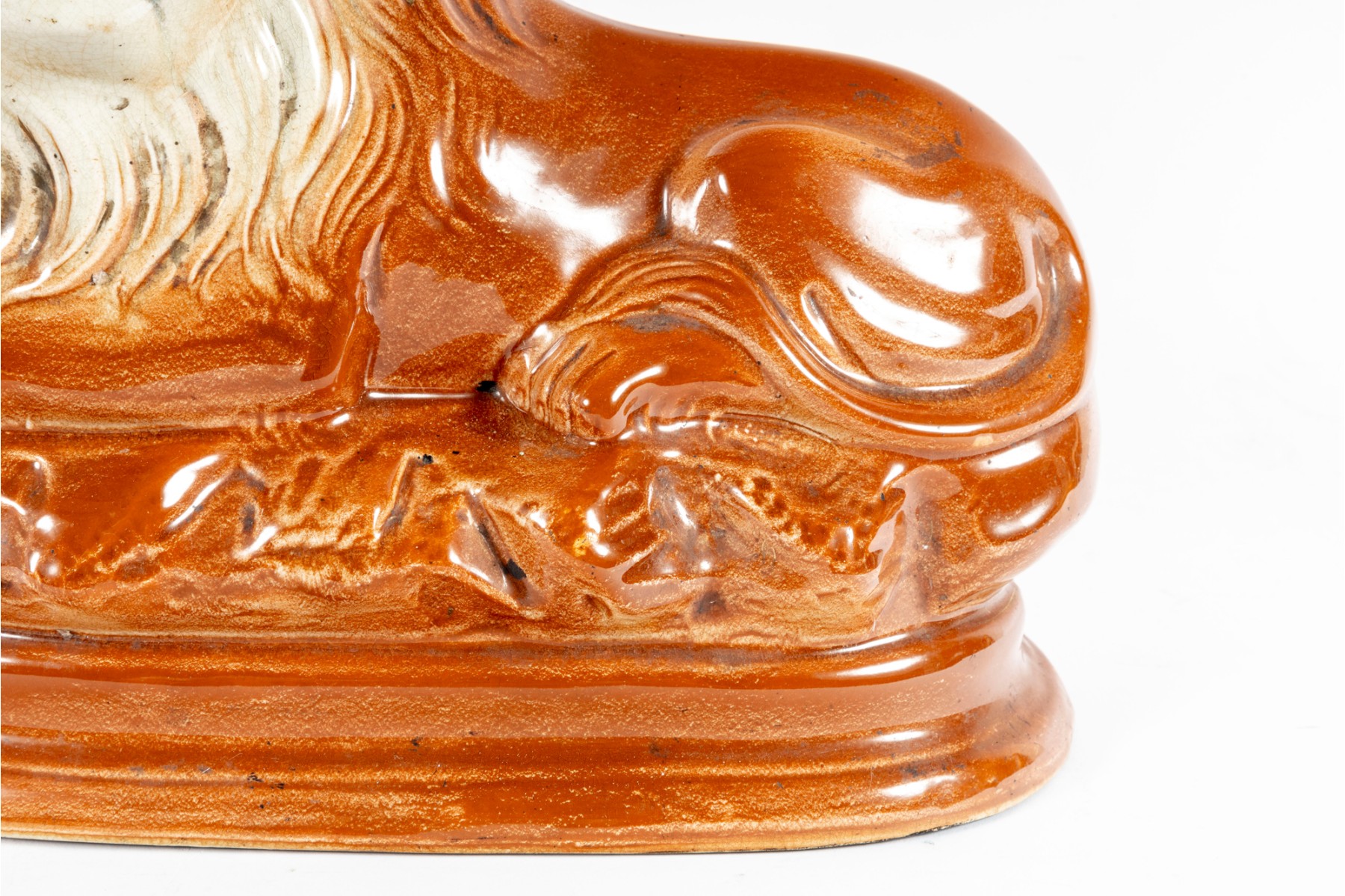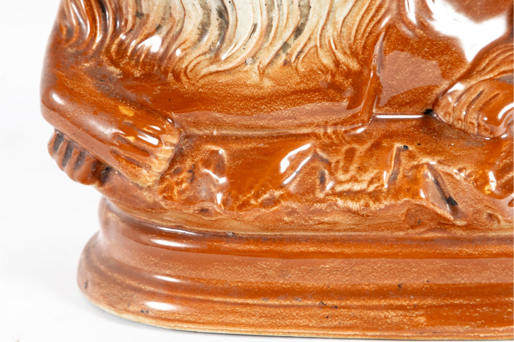 This Staffordshire earthenware lion, dating to circa 1850, is a fine example of Victorian-era English pottery. Handcrafted with great attention to detail, the lion features a proud, majestic pose typical of the period’s animal figurines complete with glass eyes and hand-painted facial features.