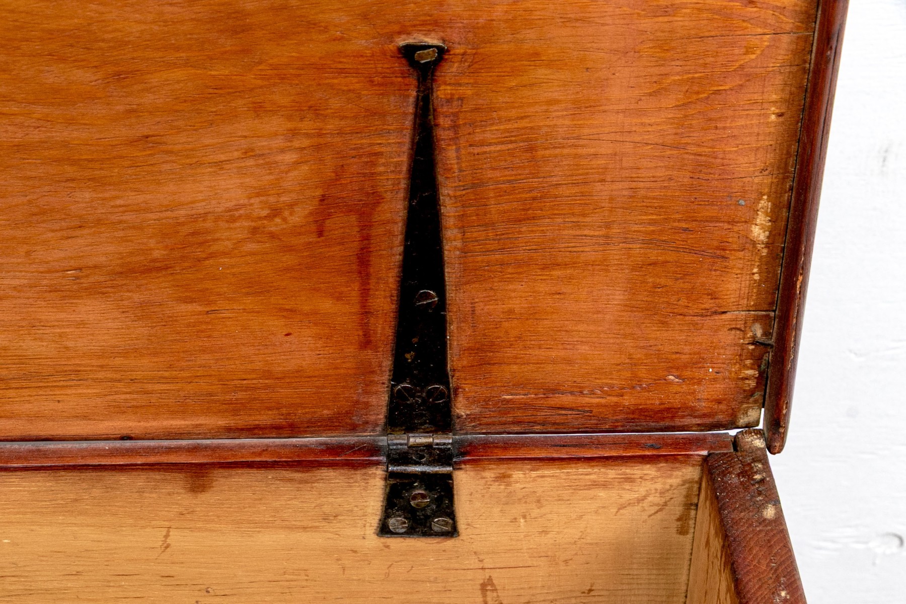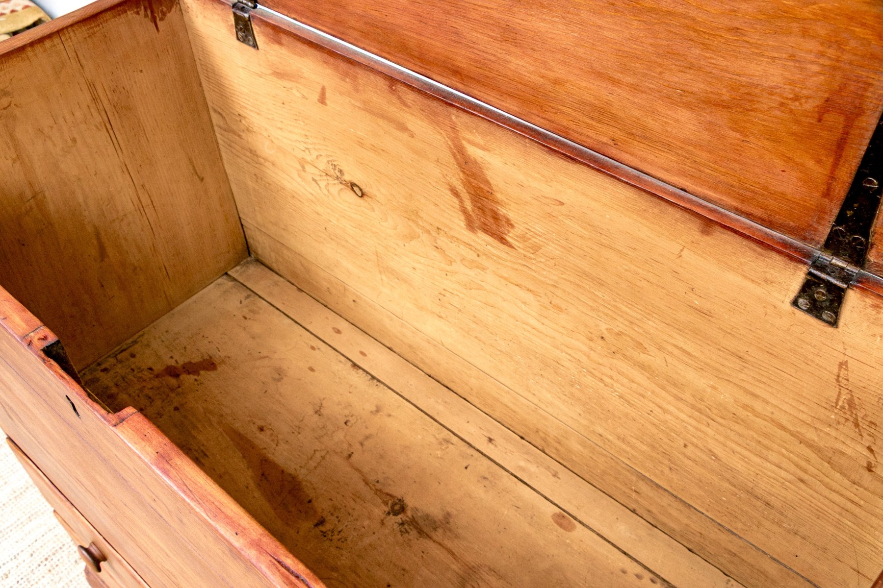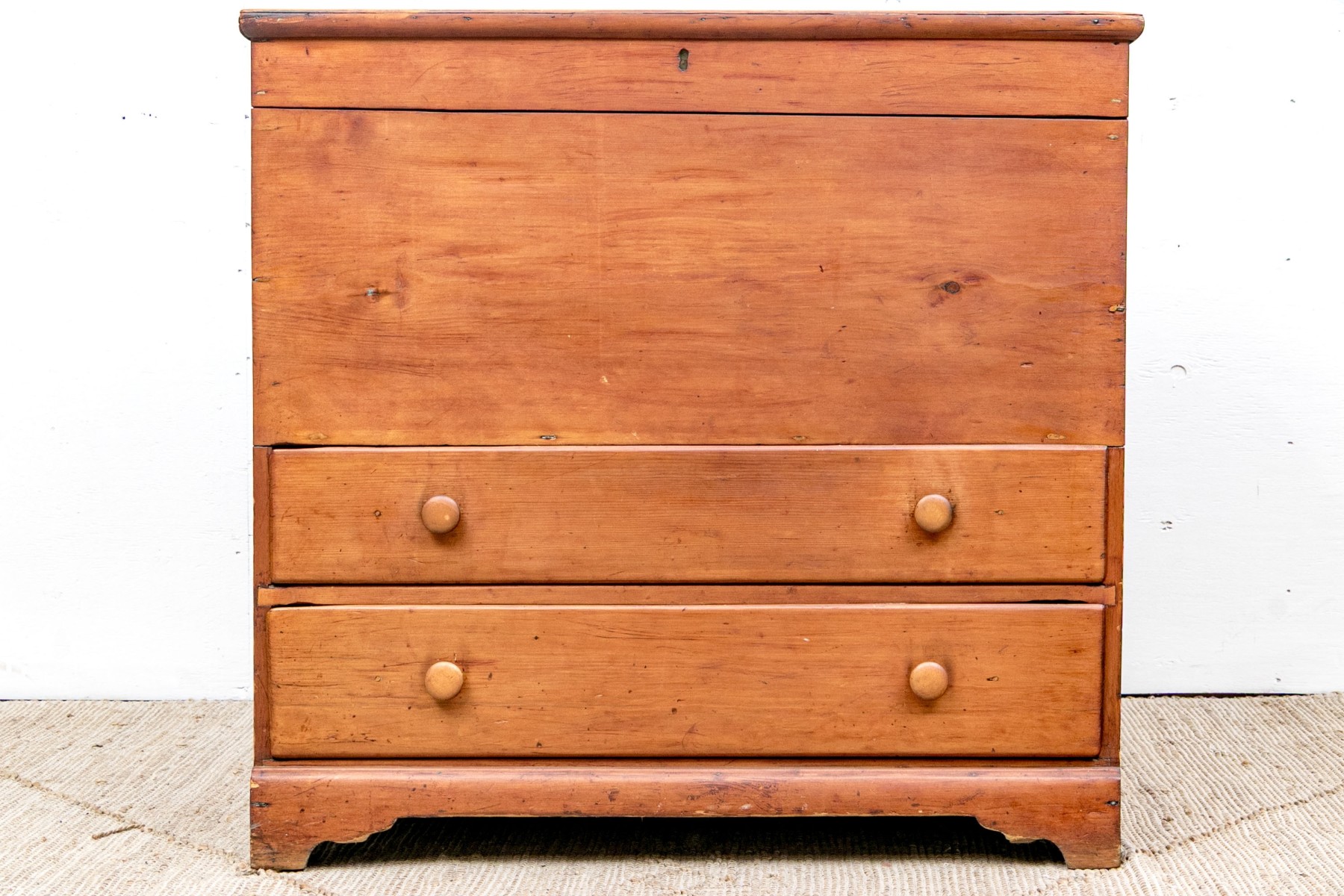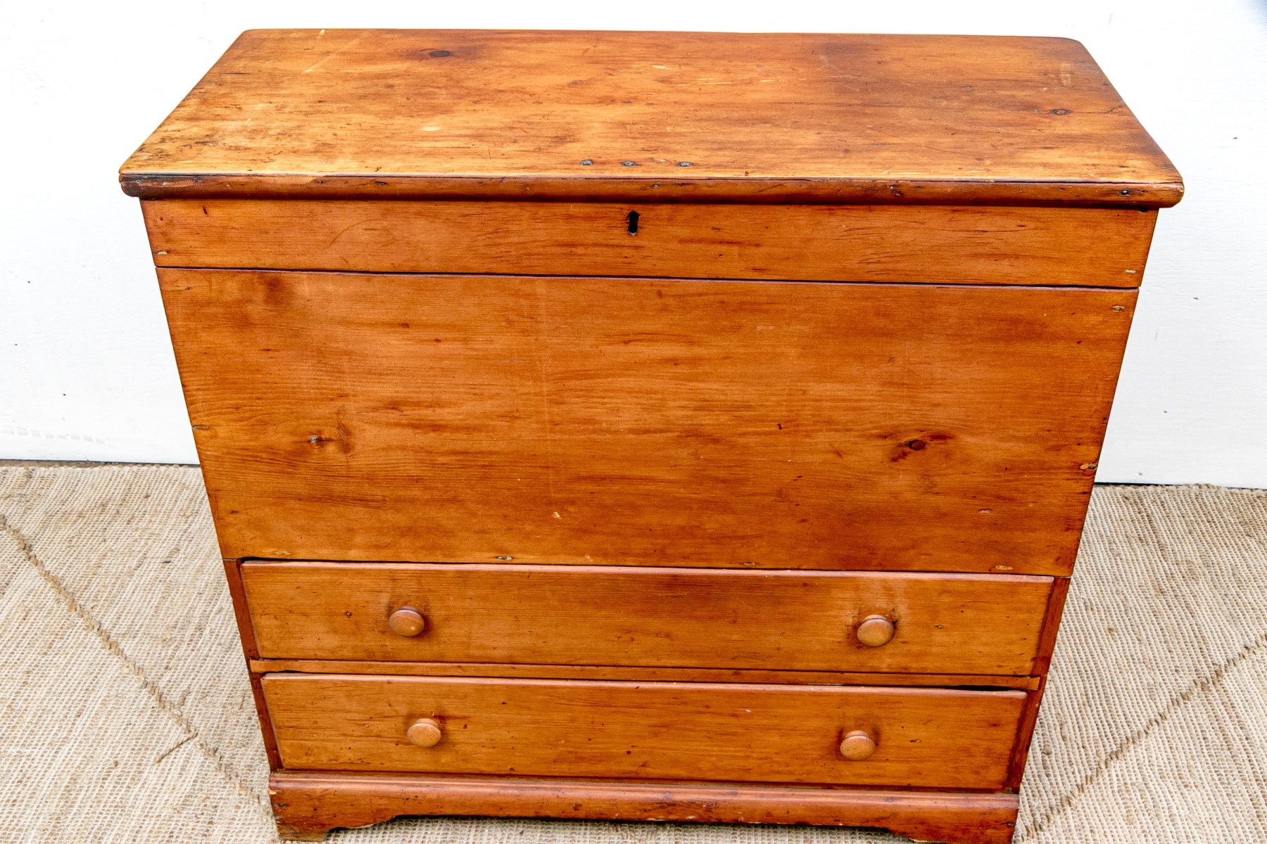 The deep top chest with hinged lid (lacking the key) over two long drawers with knob pulls. Raised on a scalloped skirt rail front and sides.