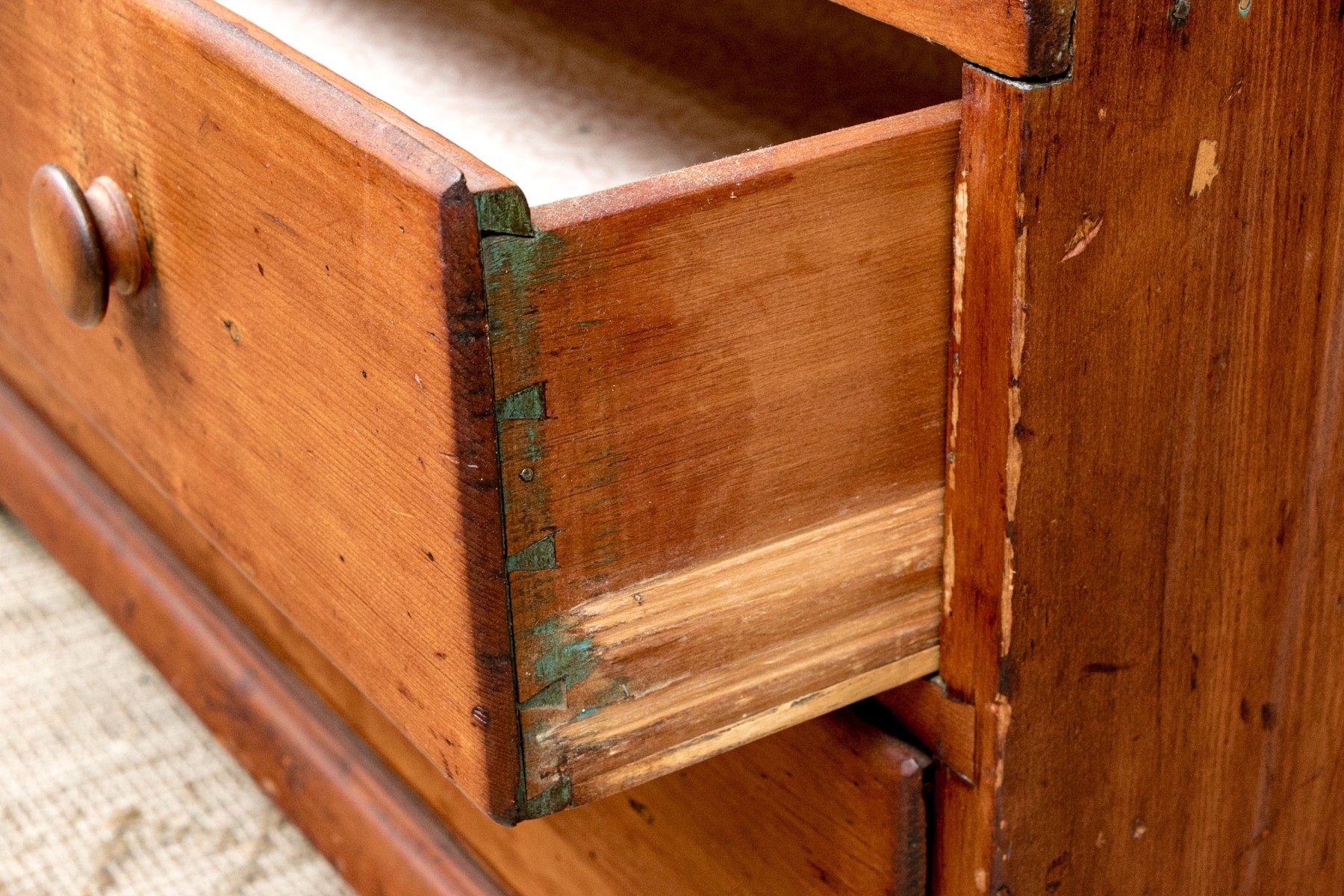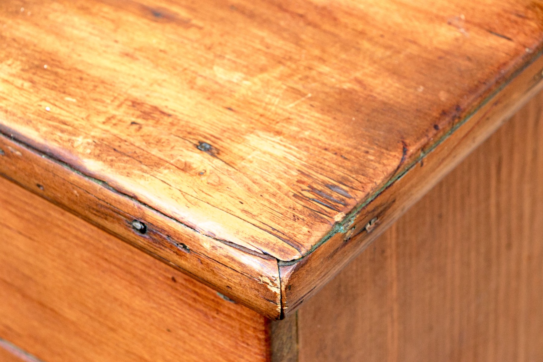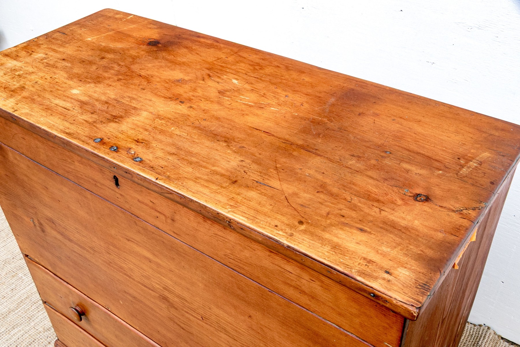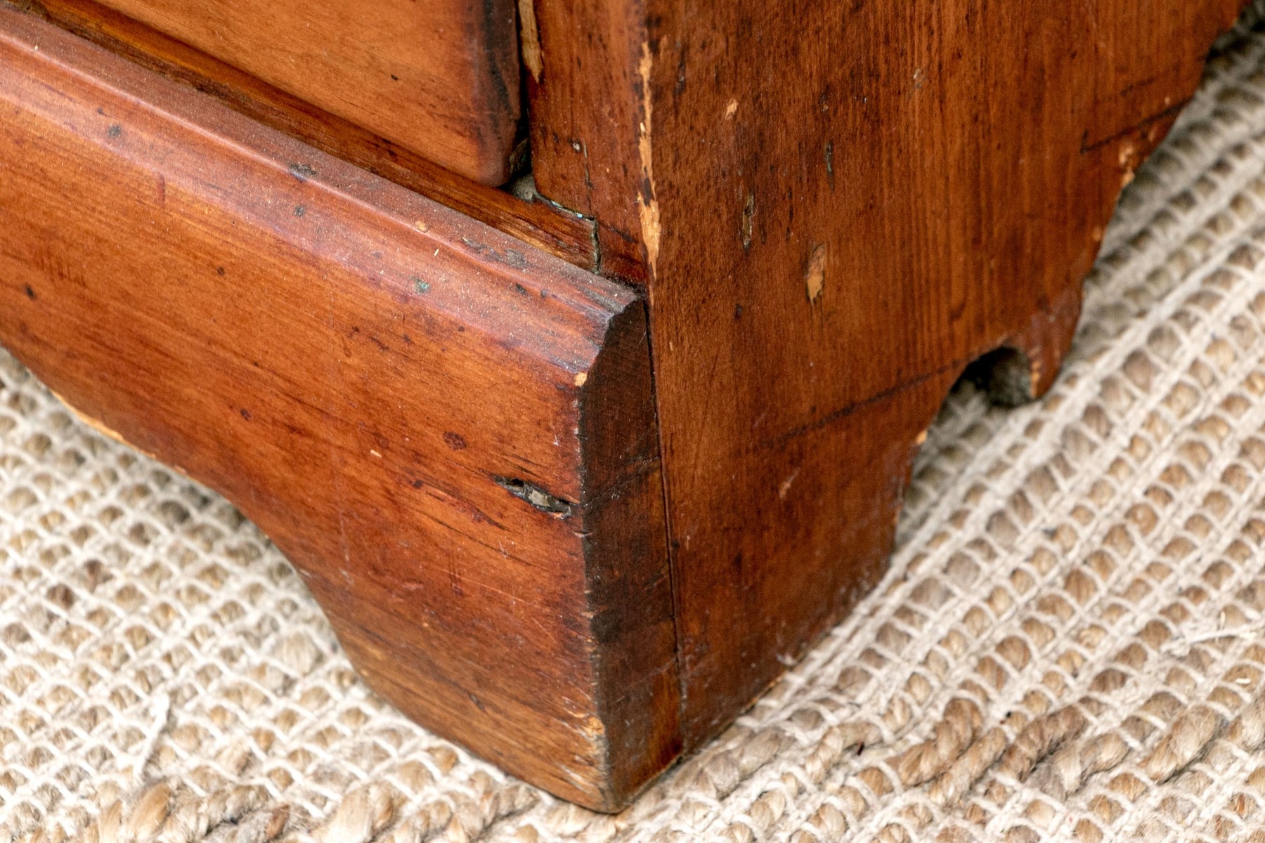 The deep top chest with hinged lid (lacking the key) over two long drawers with knob pulls. Raised on a scalloped skirt rail front and sides.