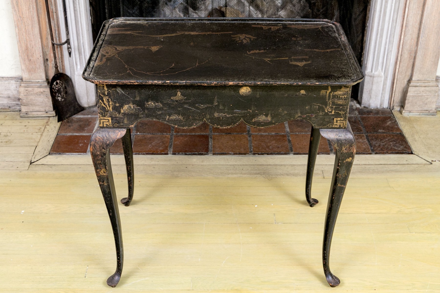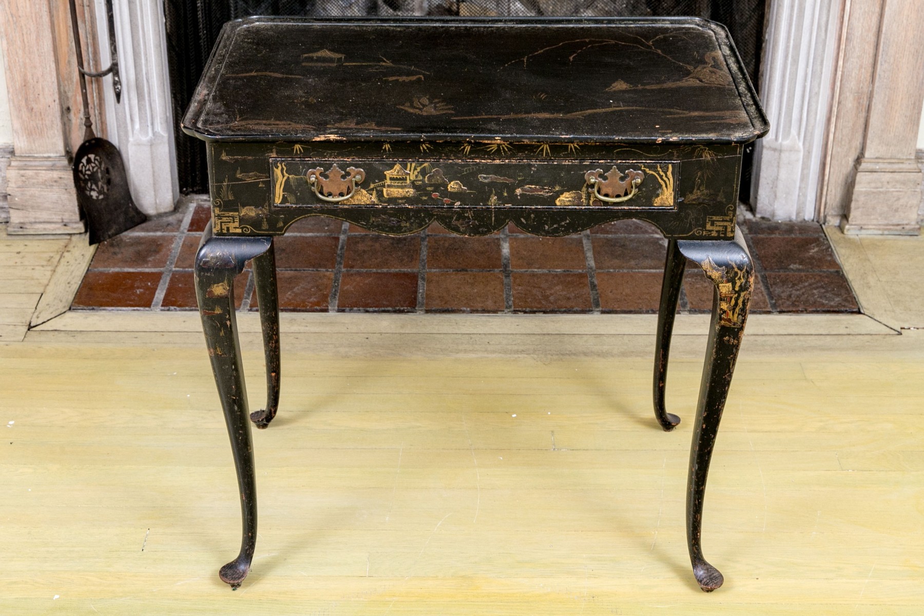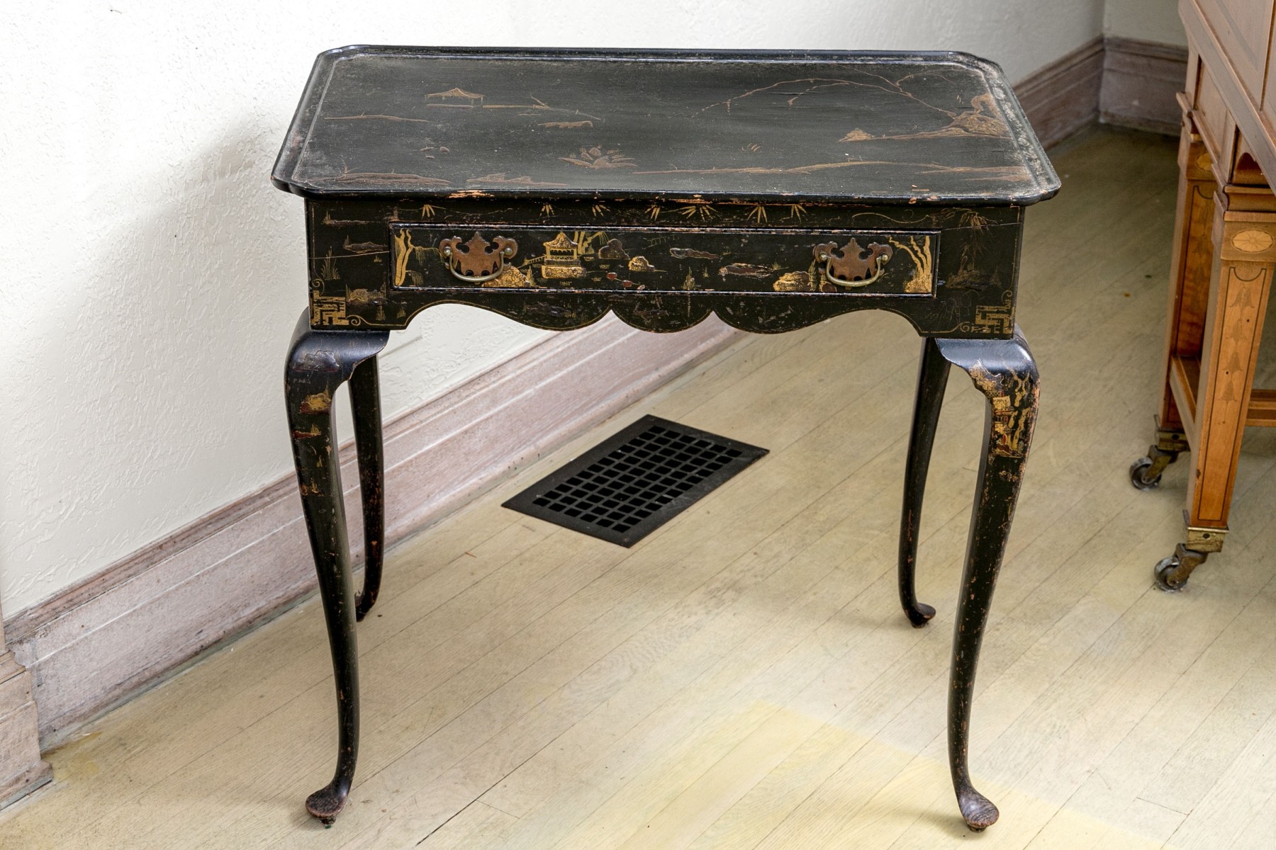 A fabulous 20th century chinoiserie accent table raised upon four wonderfully carved cabriole legs with pad feet. The case is fitted with a single drawer and tray formed top. There is a wonderfully carved, scalloped apron around the case.