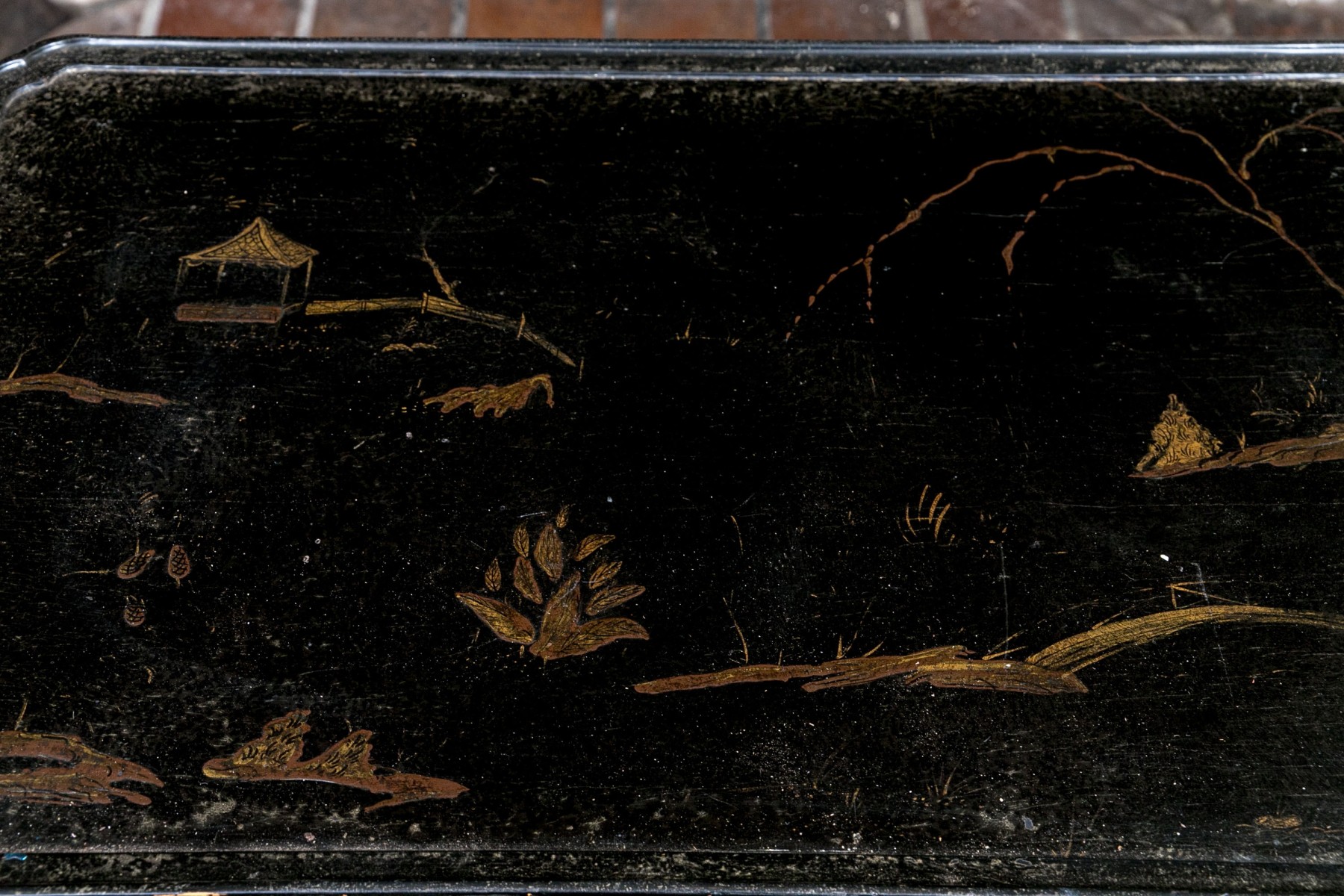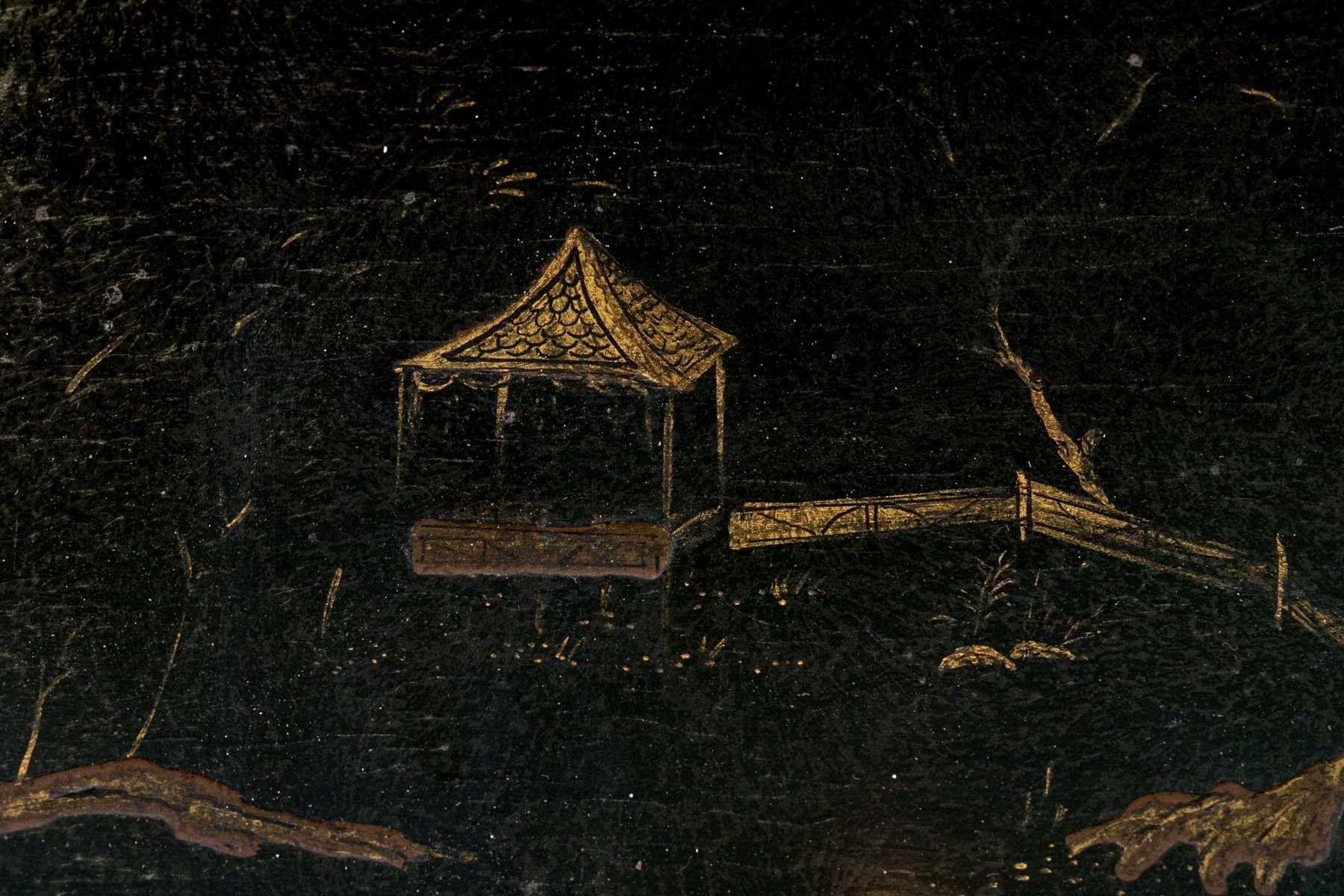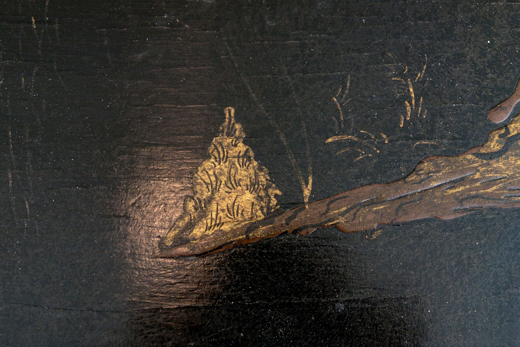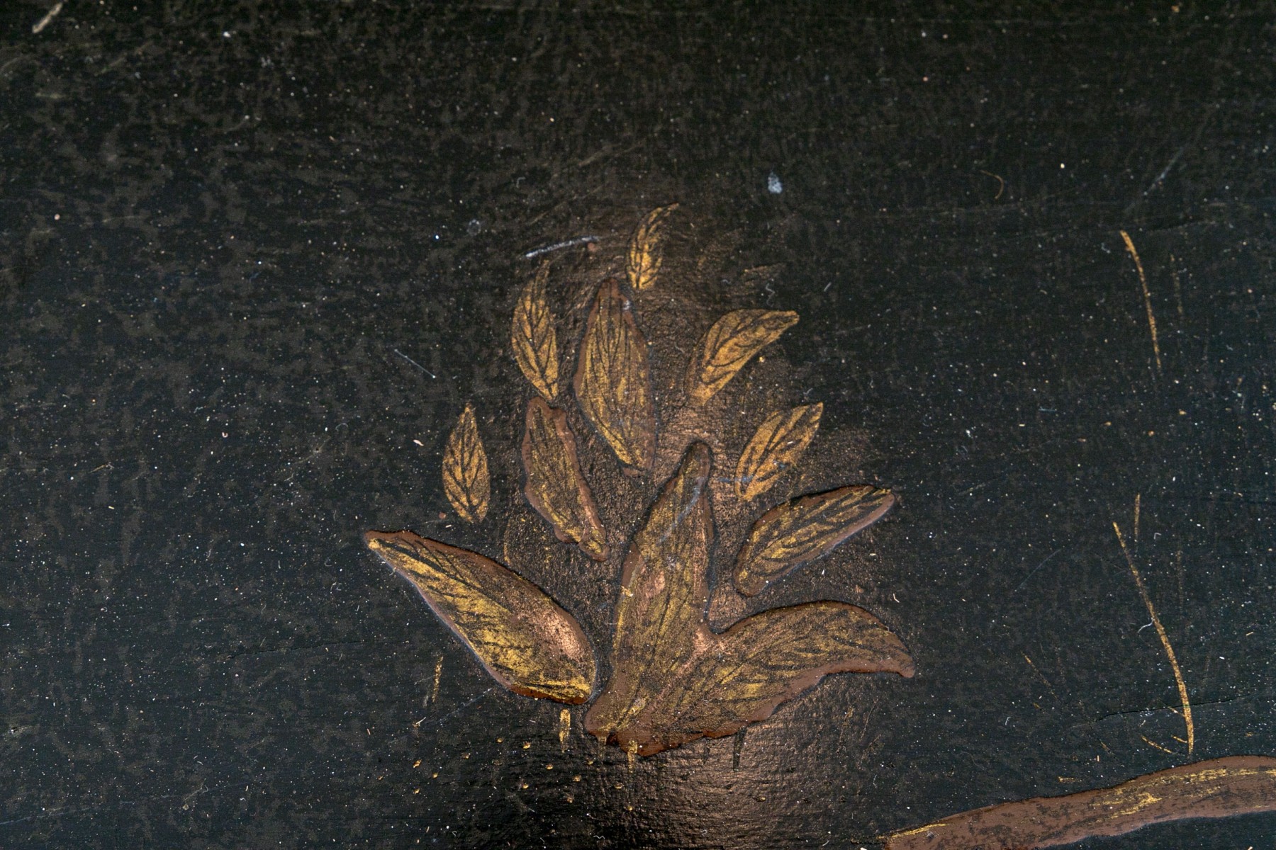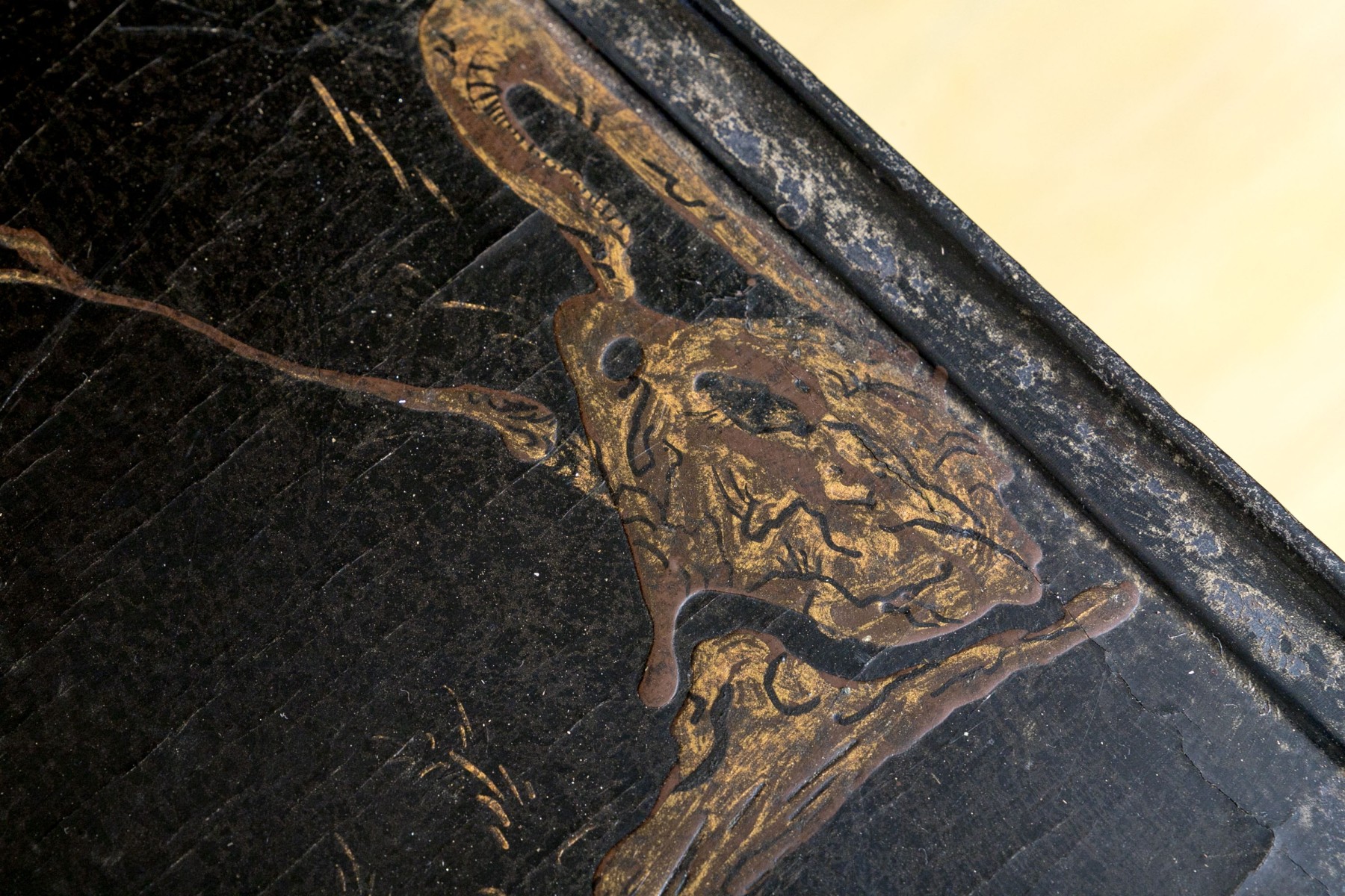 Some wear to the laquered decoration with notable wear to the pad feet on all four legs. There is some wear around the tray top trim border and other wear commensurate with age and use.