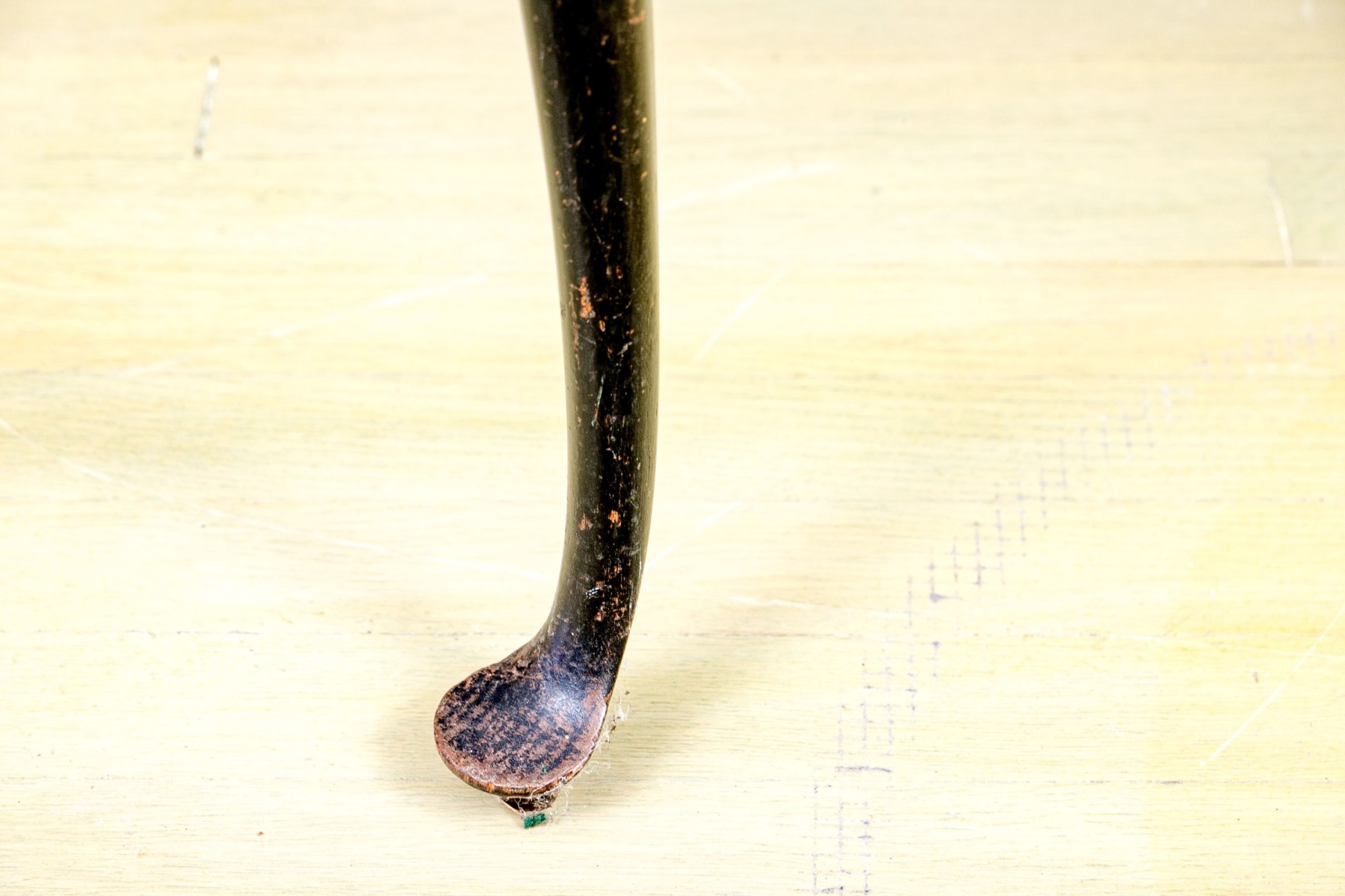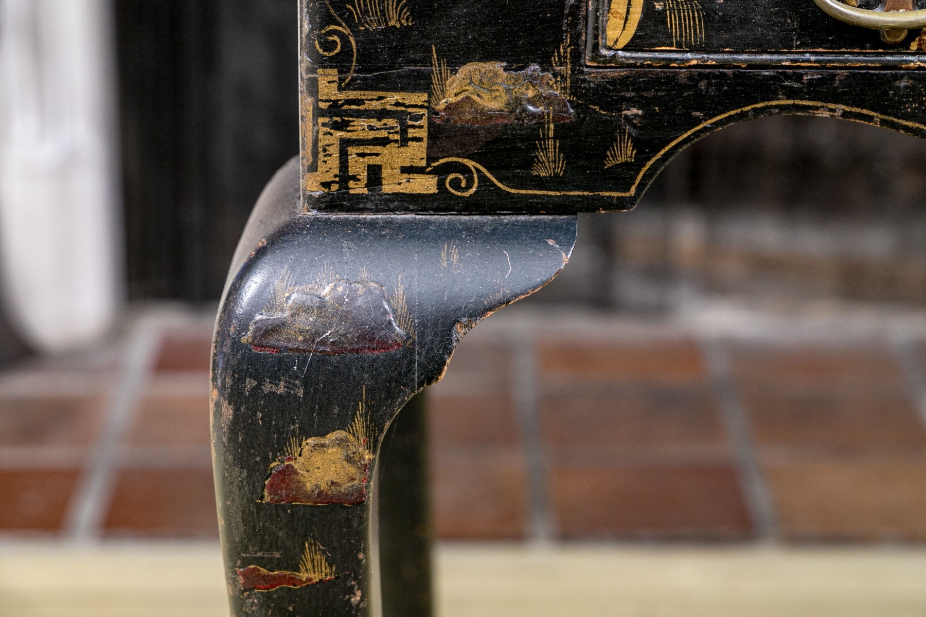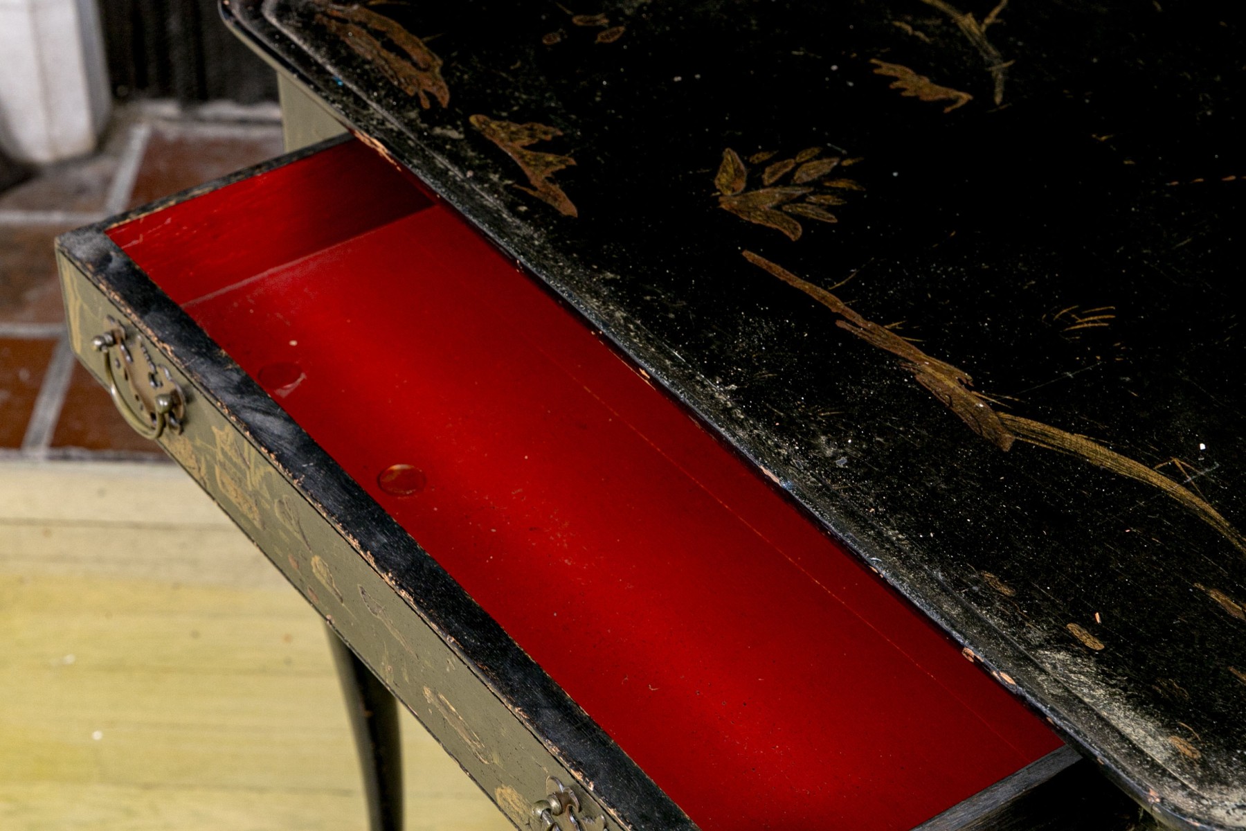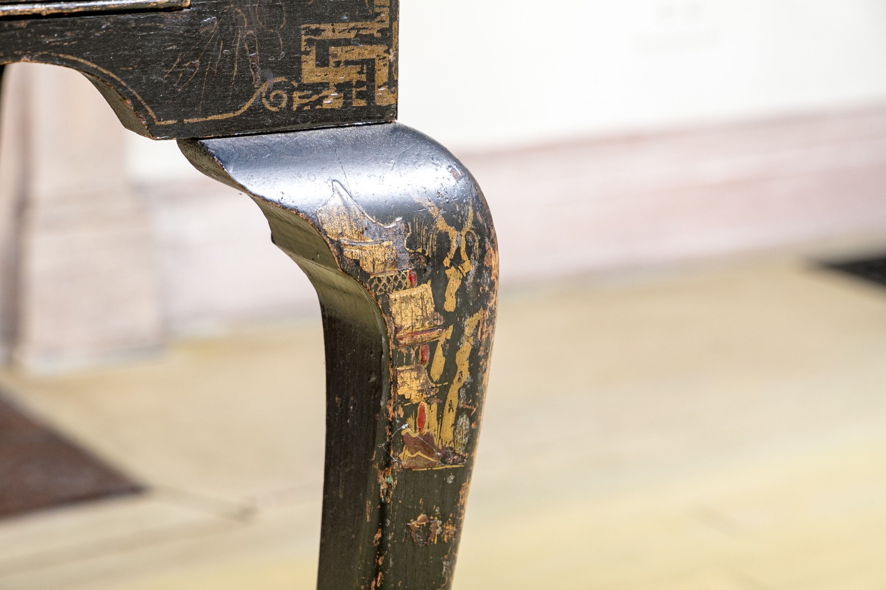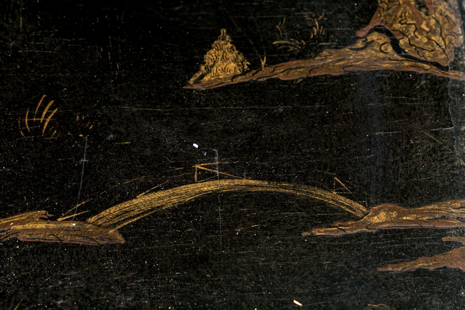 Some wear to the laquered decoration with notable wear to the pad feet on all four legs. There is some wear around the tray top trim border and other wear commensurate with age and use.
