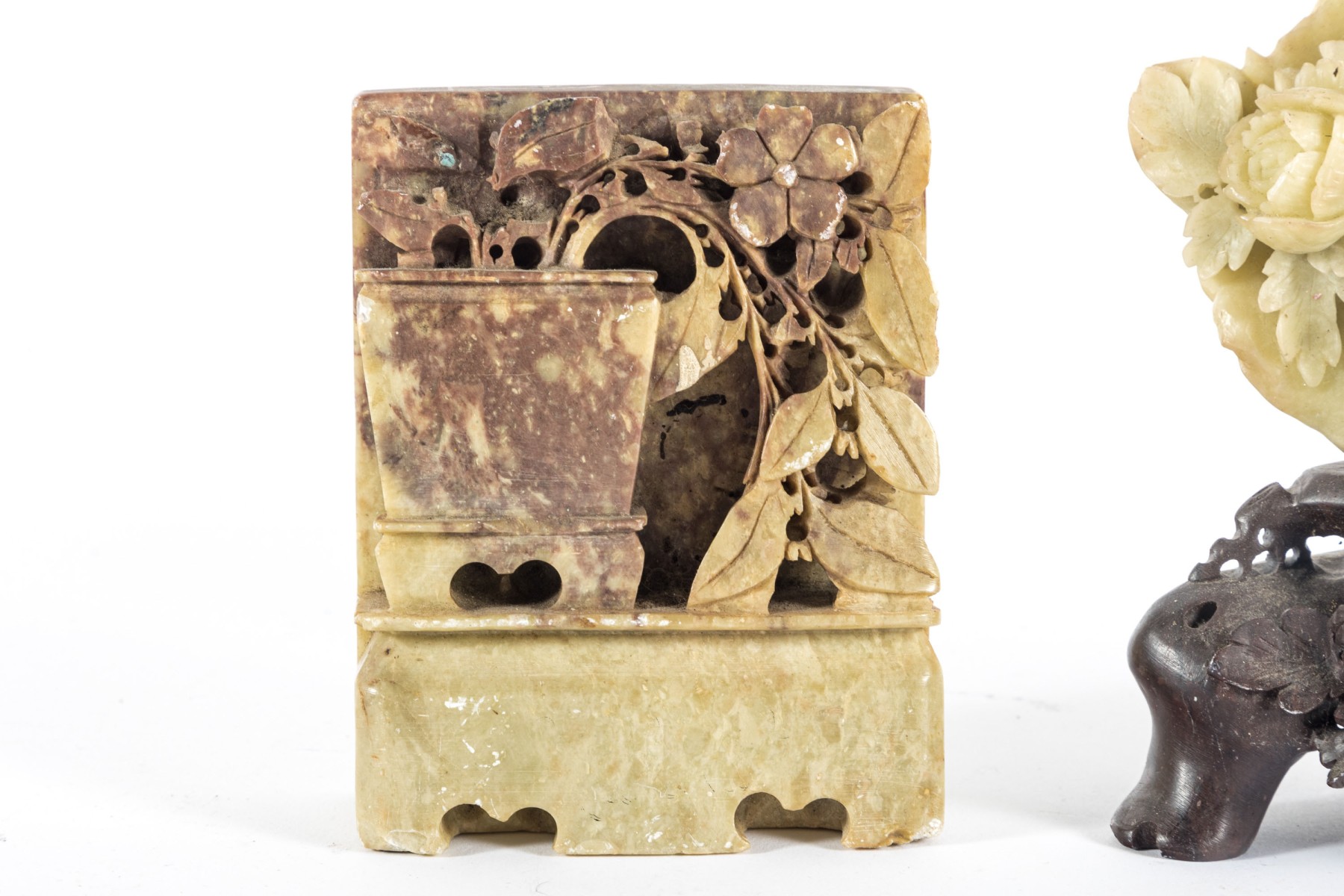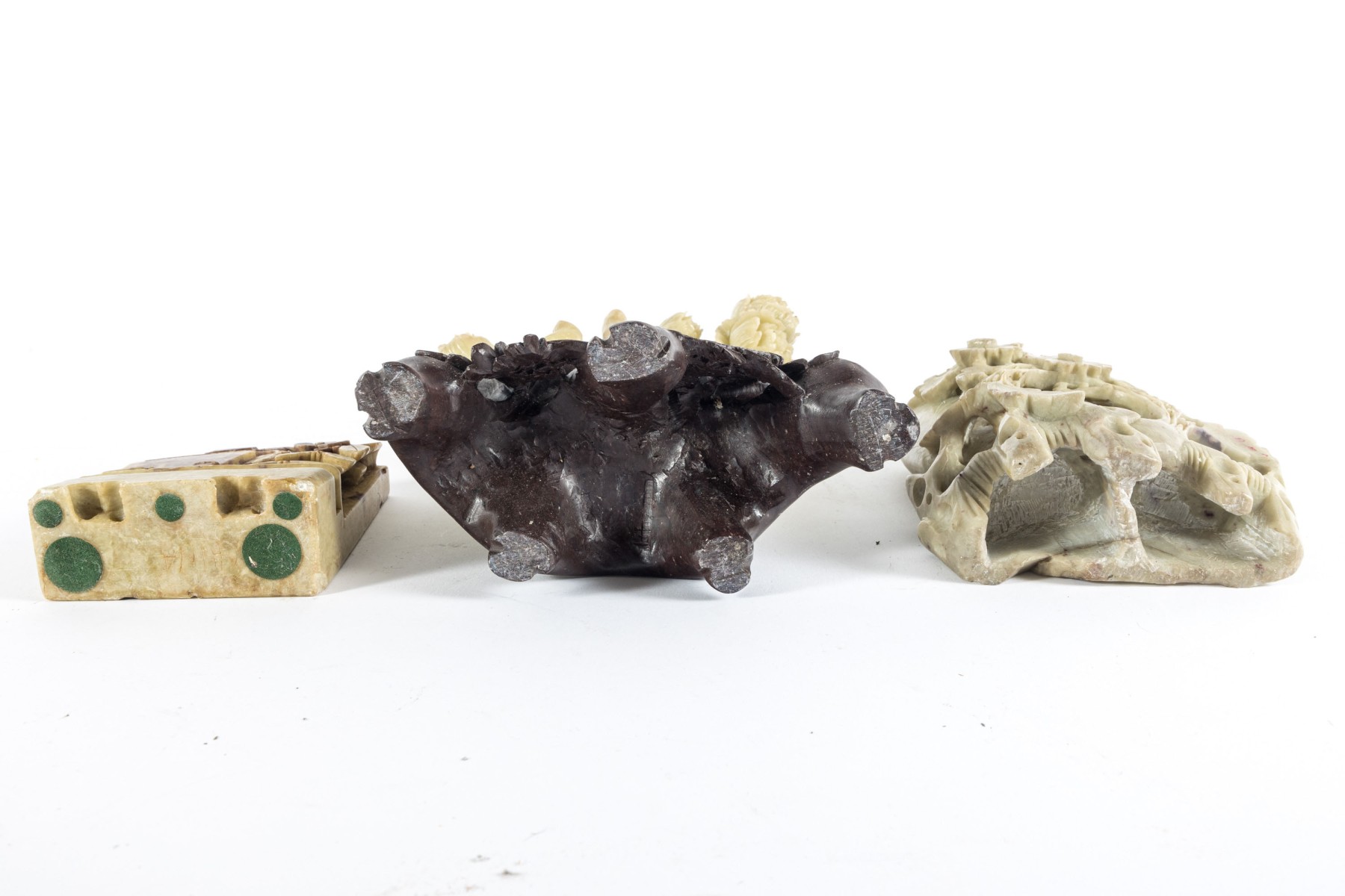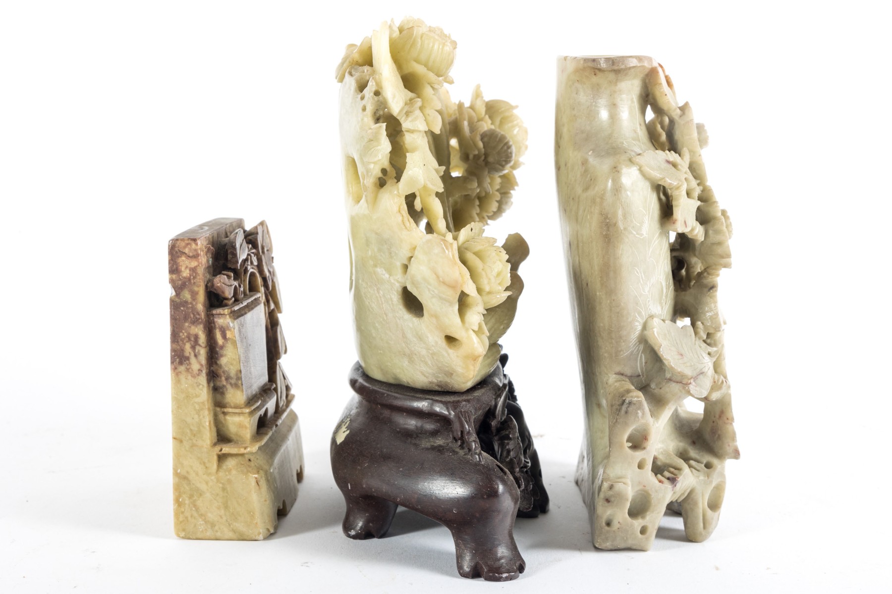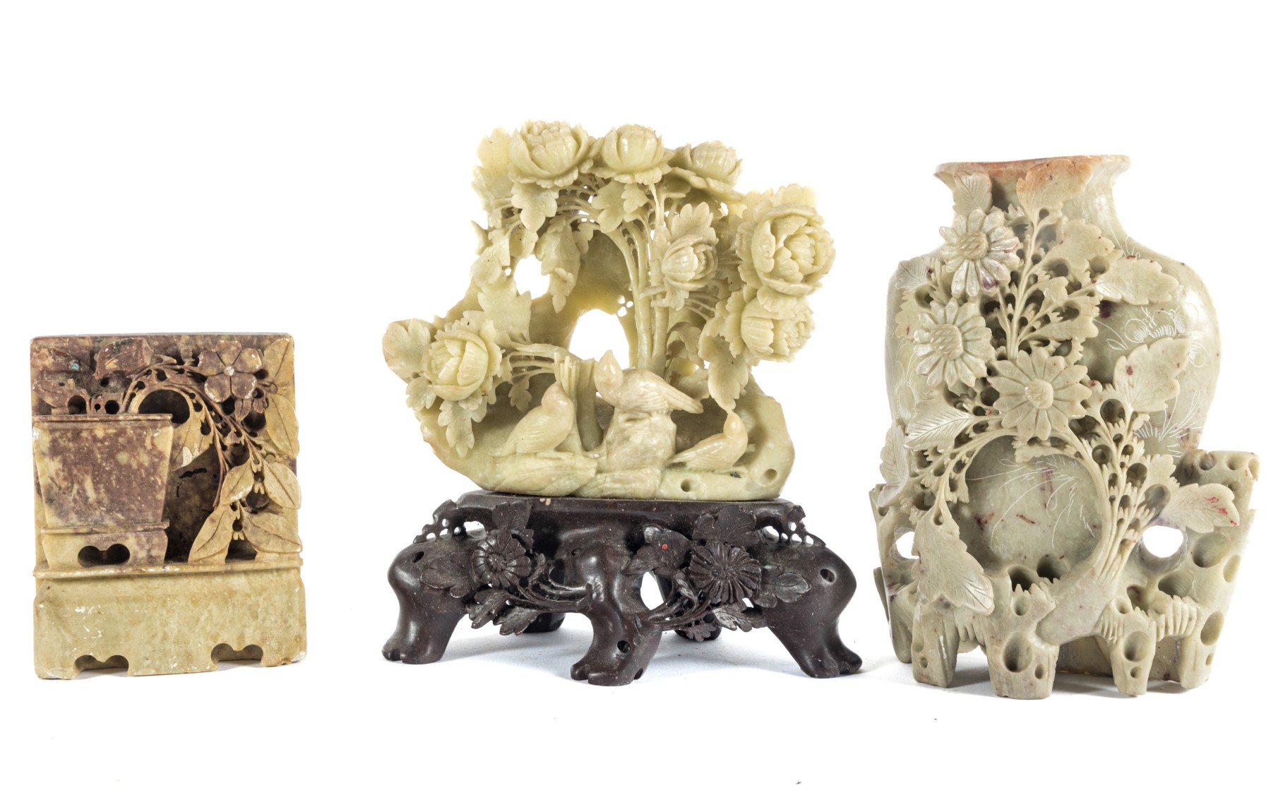 A trio of 1930's Chinese soapstone carvings laden with florals and foliate reliefs. See photos for details.