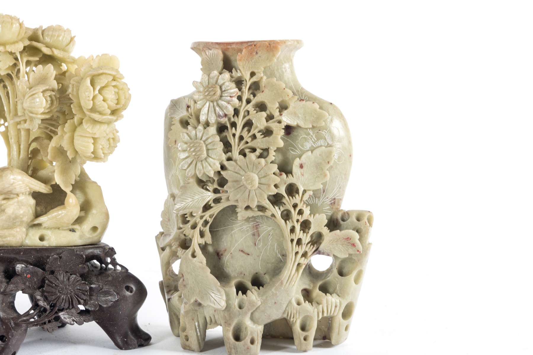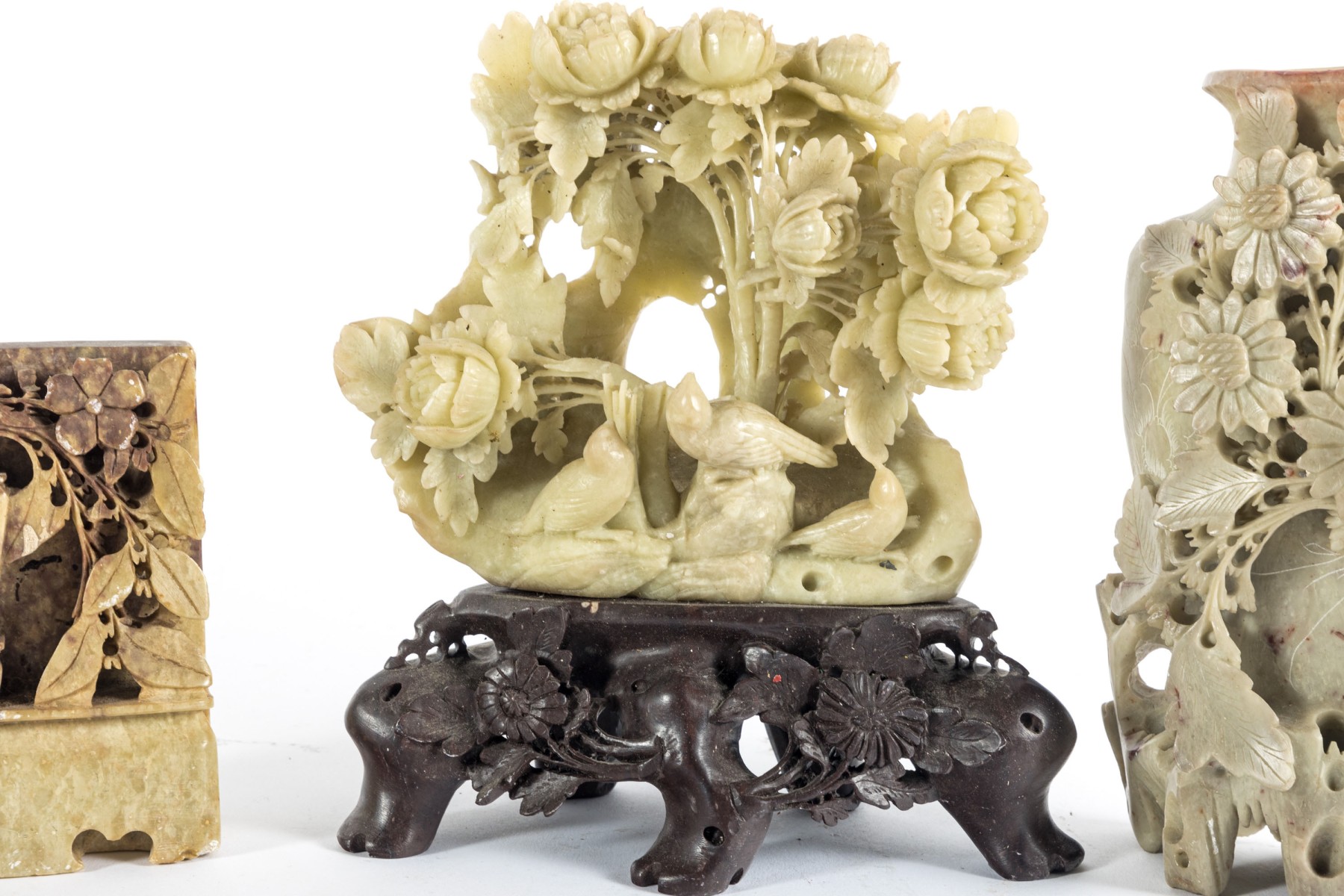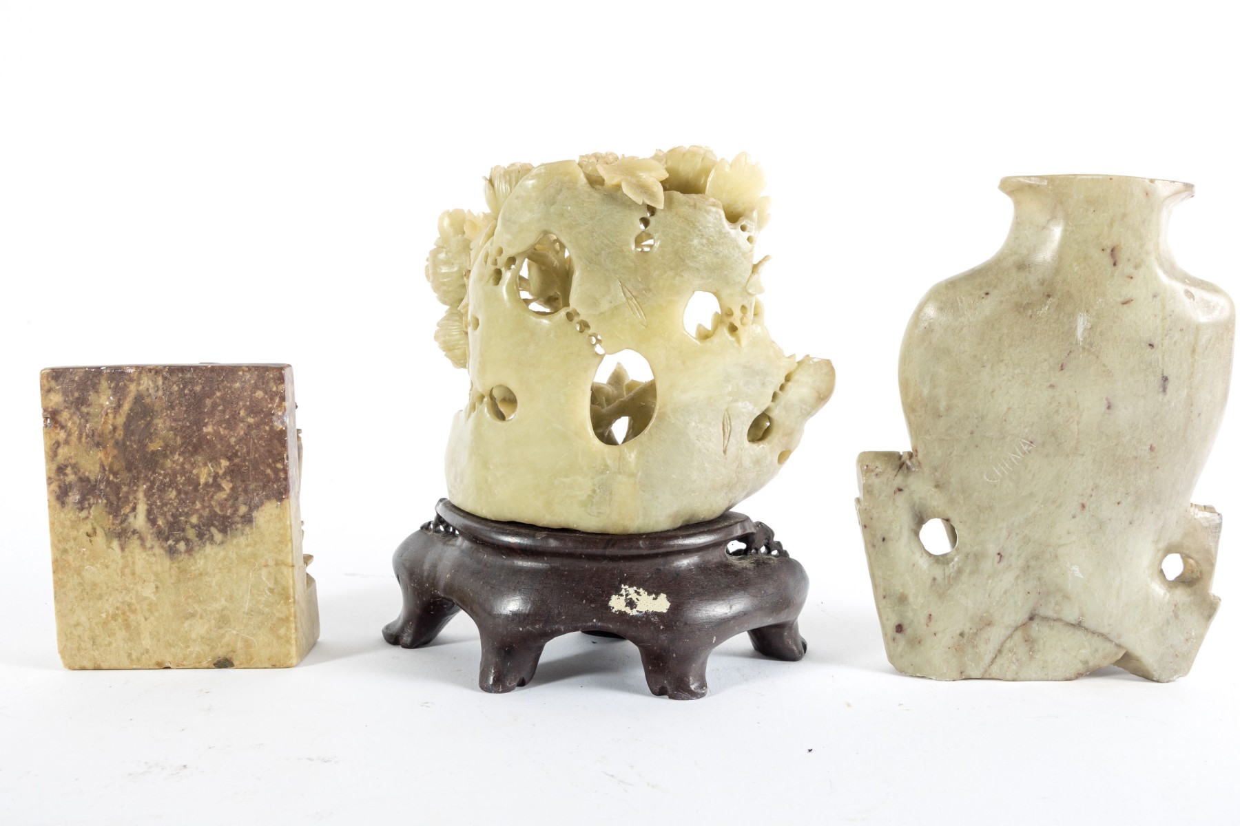 A trio of 1930's Chinese soapstone carvings laden with florals and foliate reliefs. See photos for details.