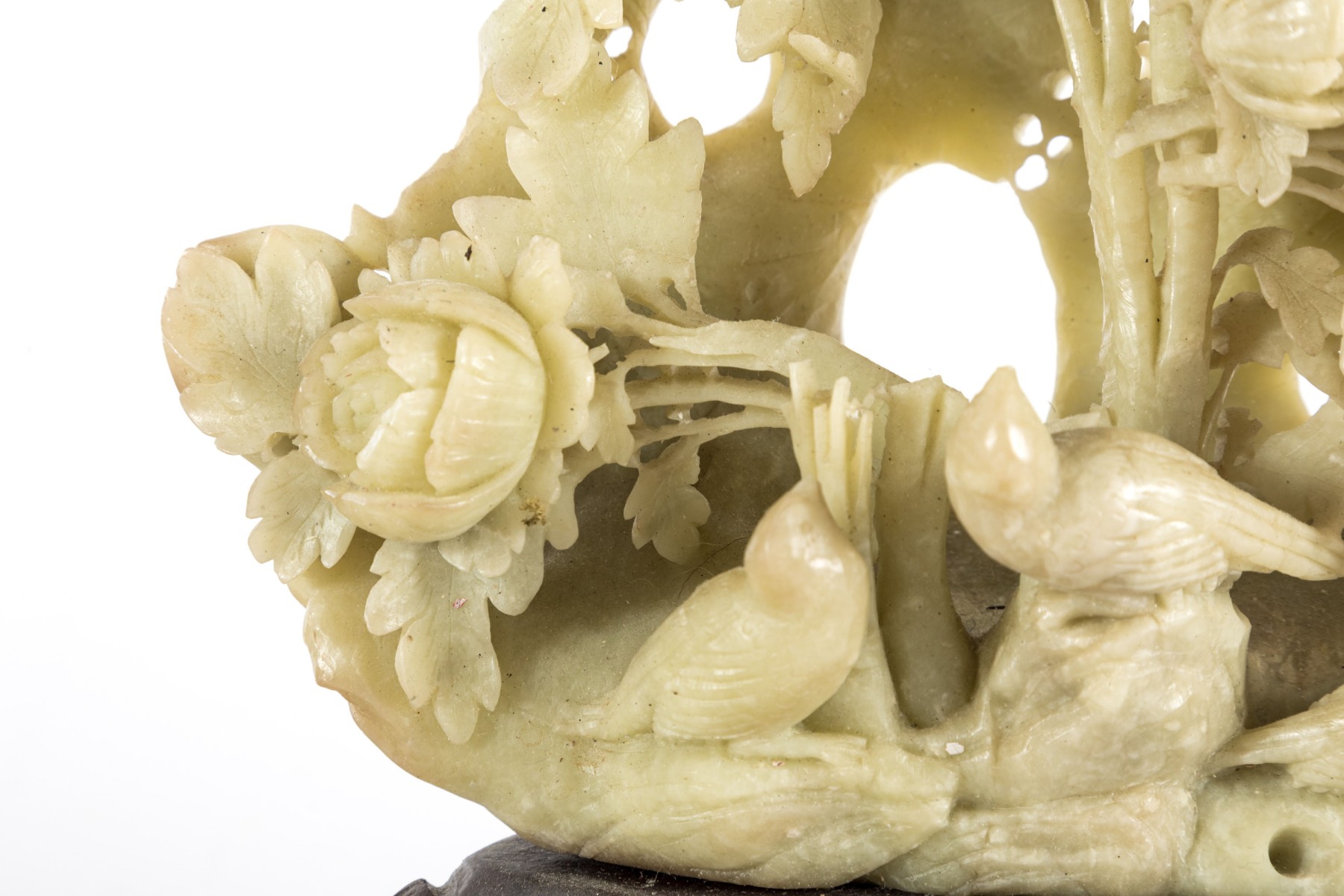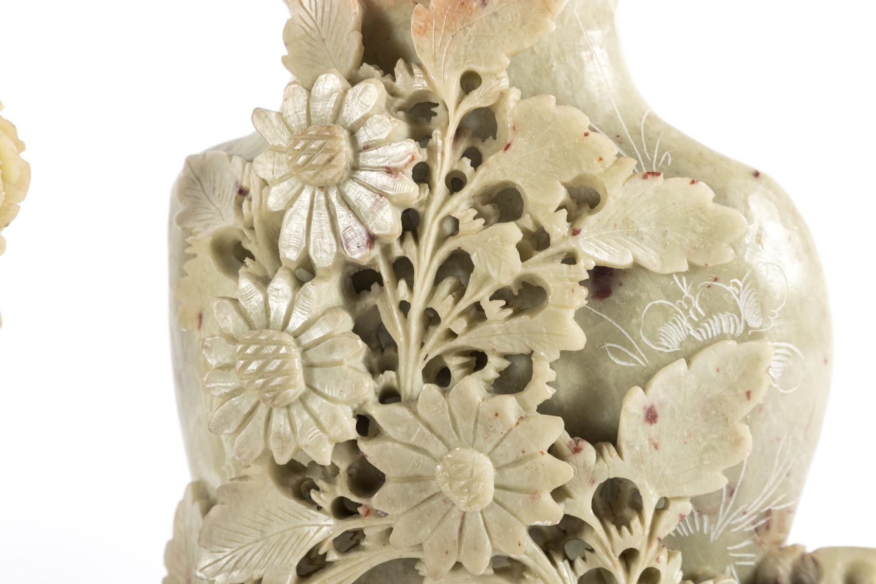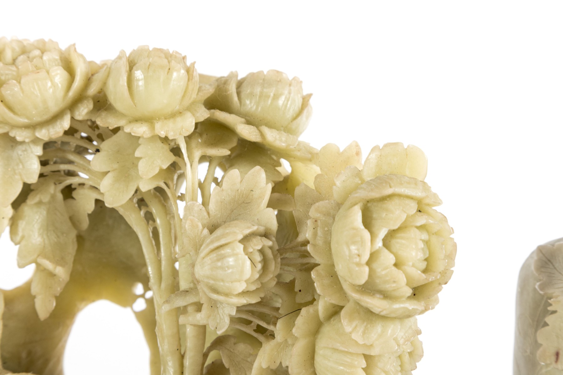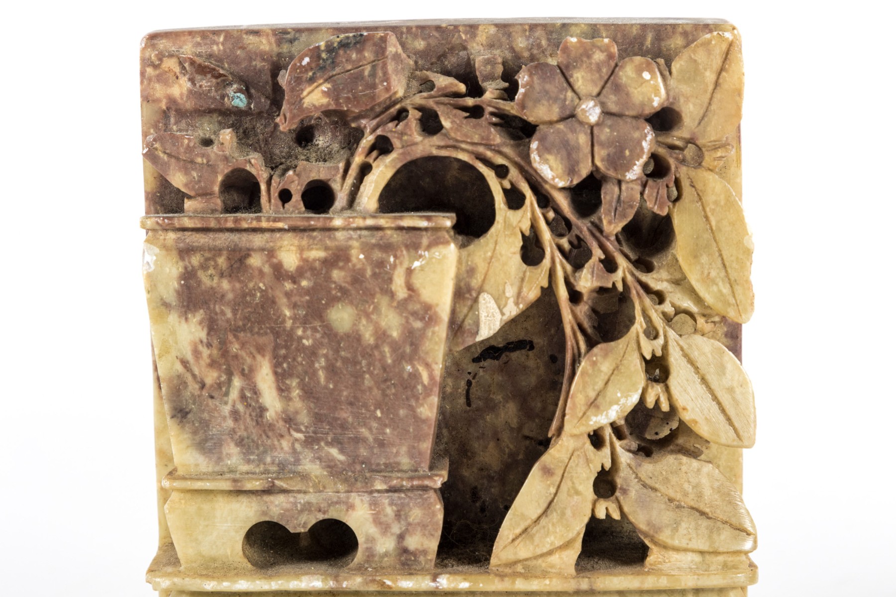 A trio of 1930's Chinese soapstone carvings laden with florals and foliate reliefs. See photos for details.