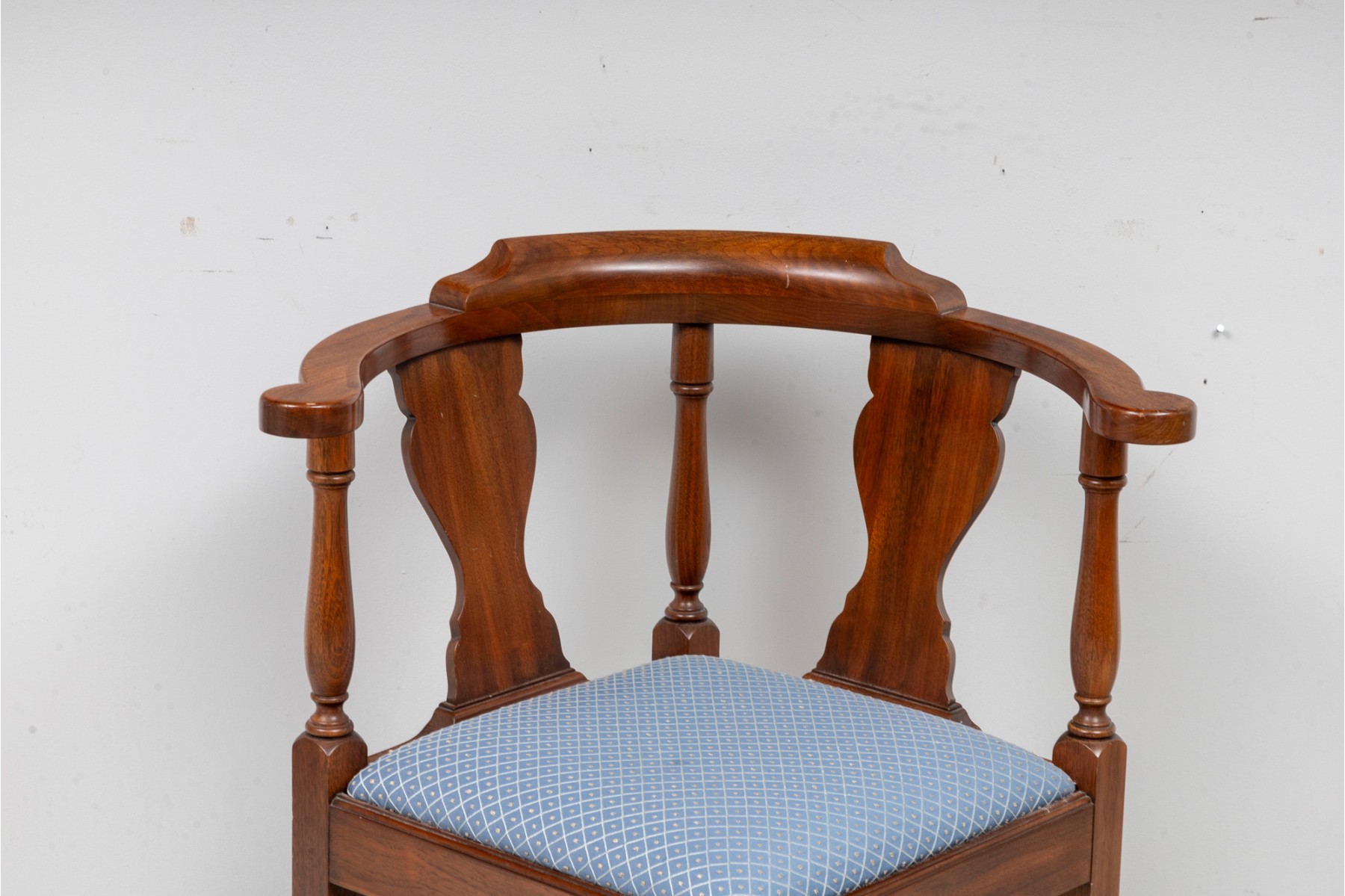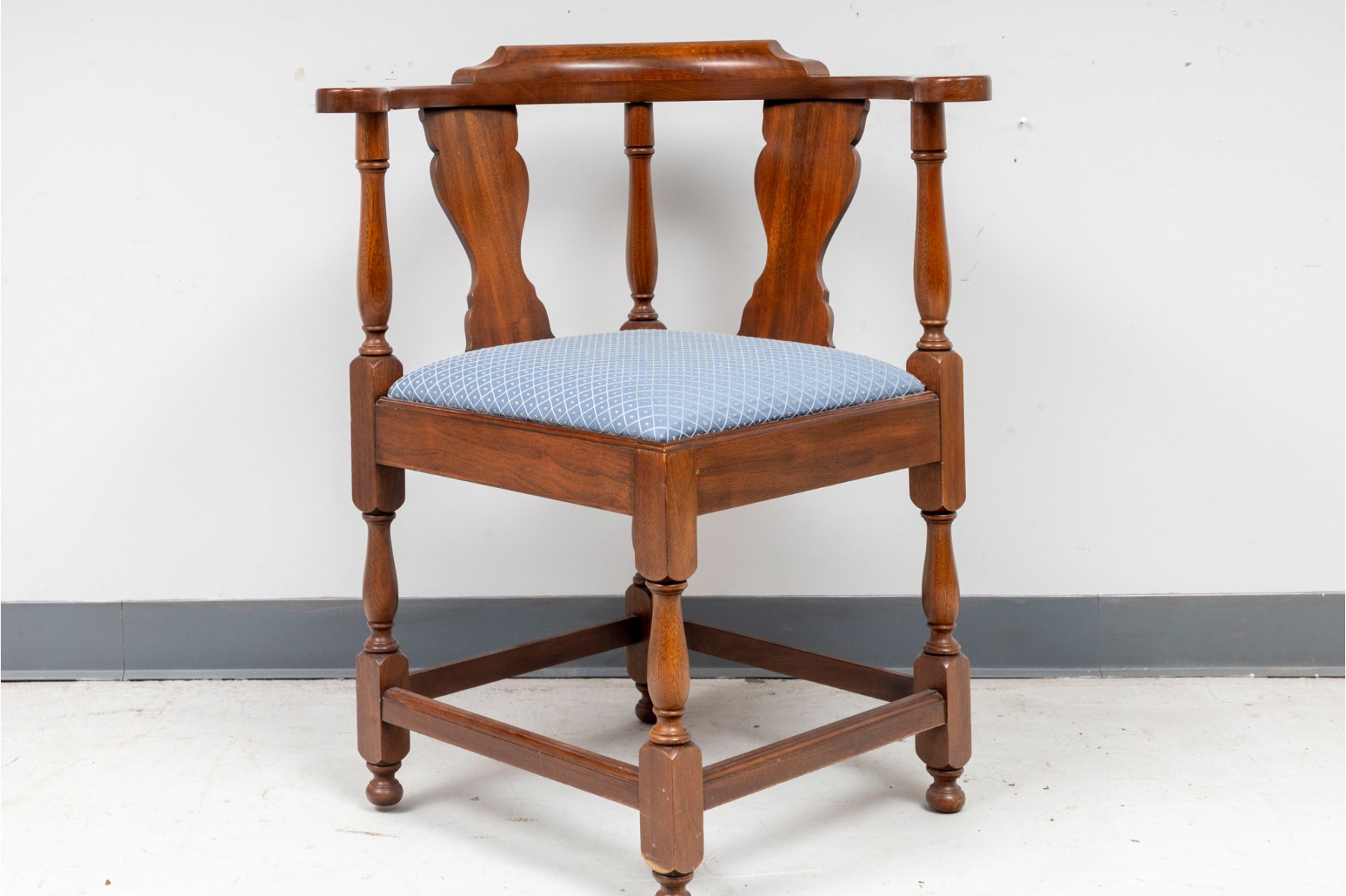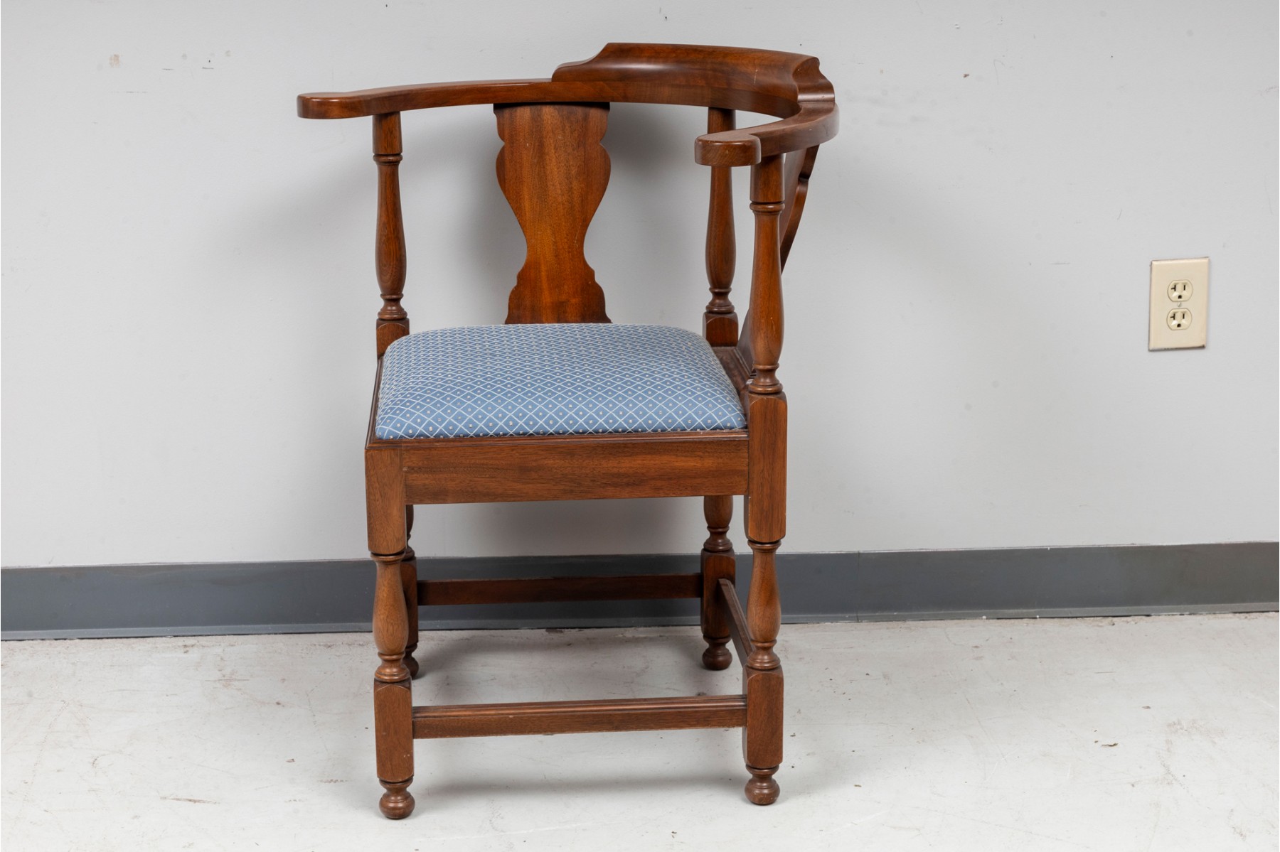 A stately 20th century Georgian style corner chair with vasy form back-splat and perimeter stretcher.