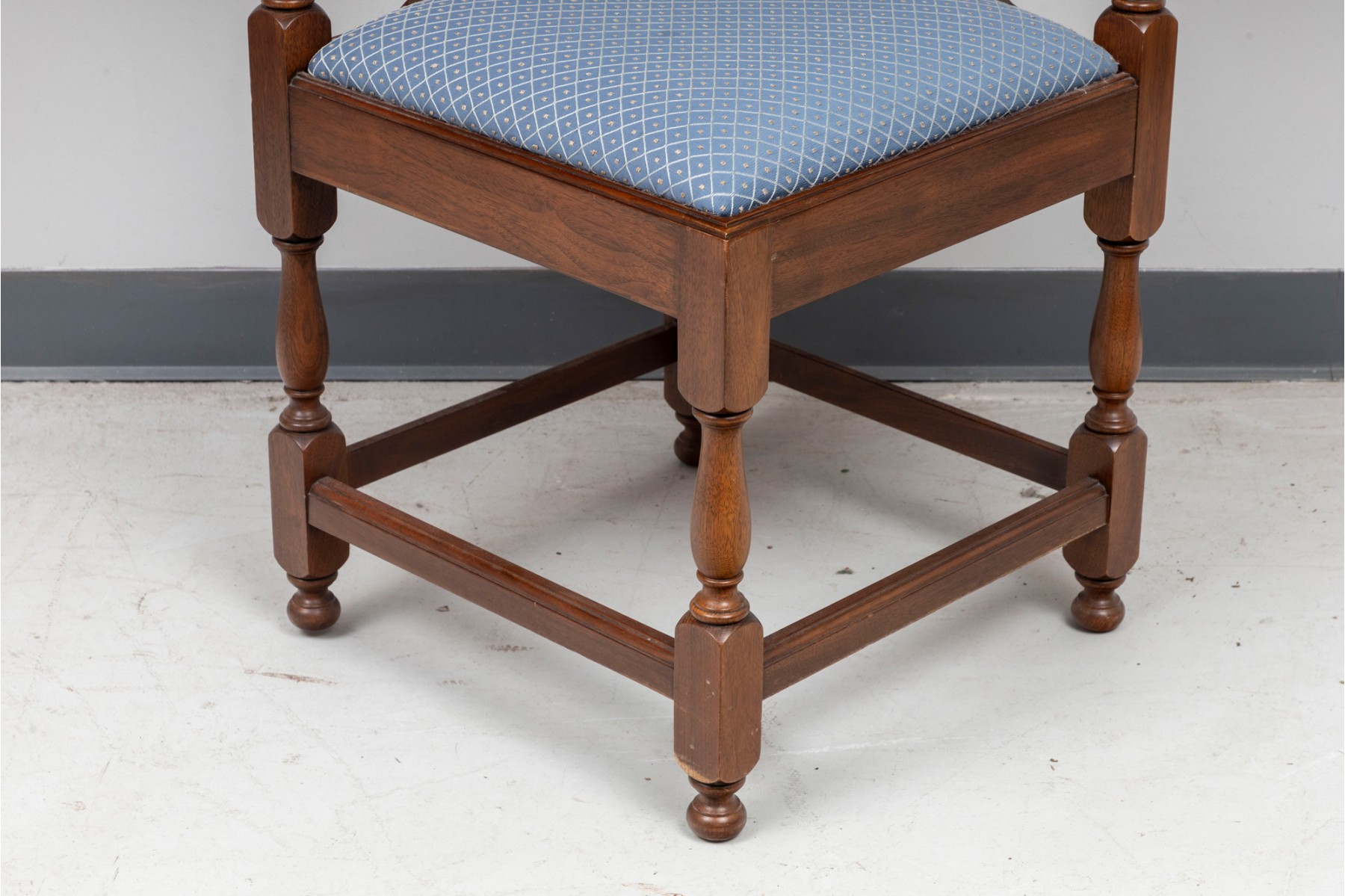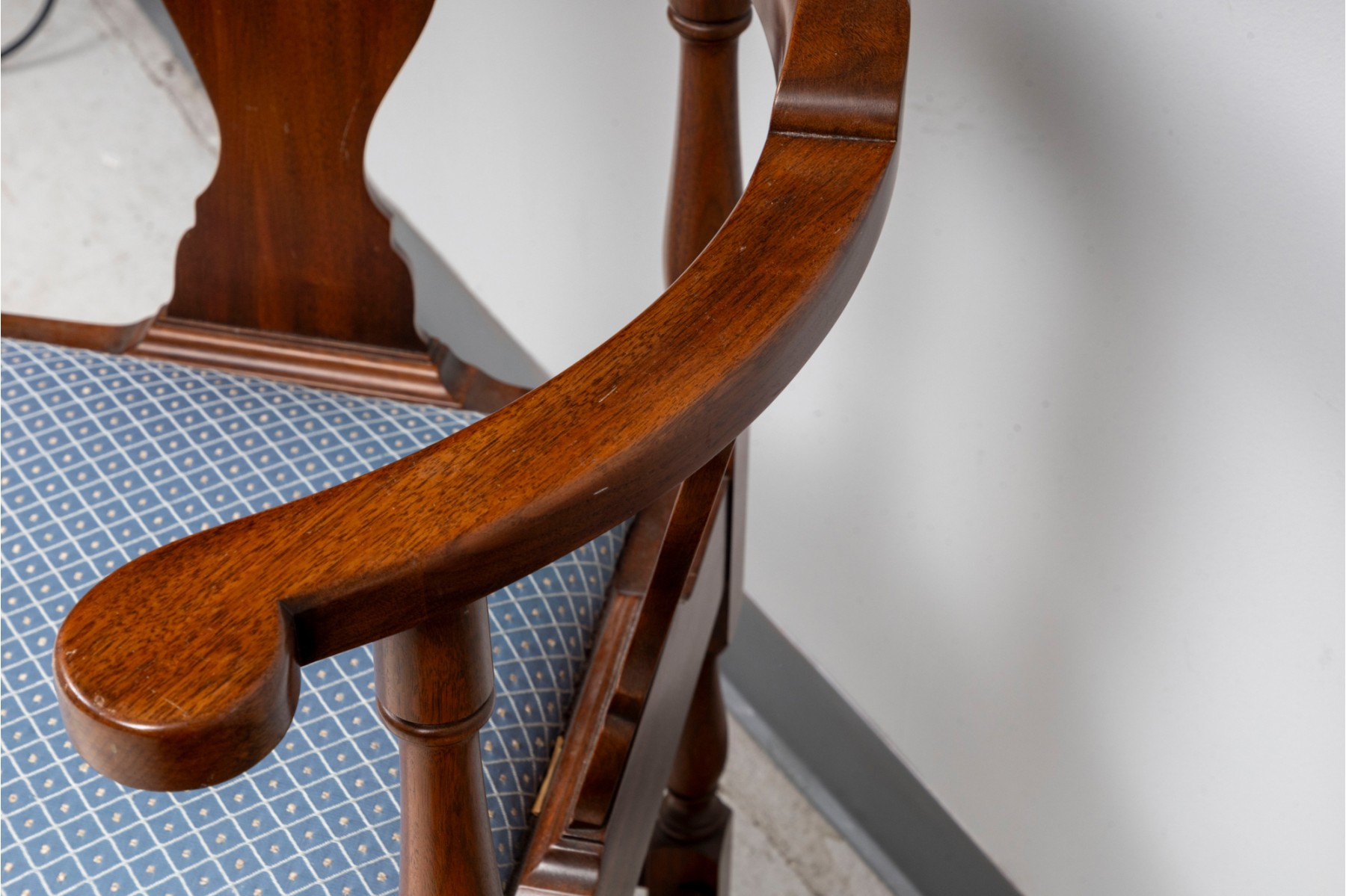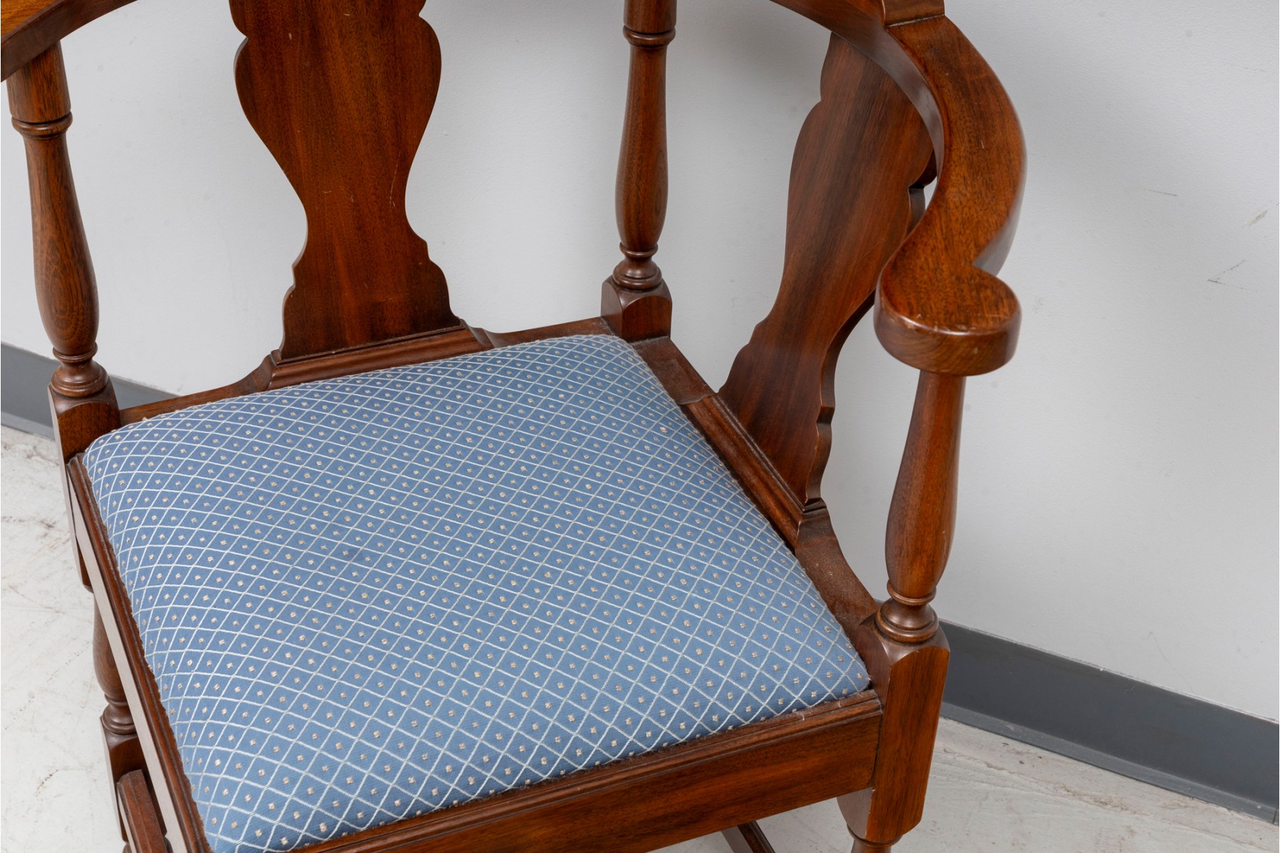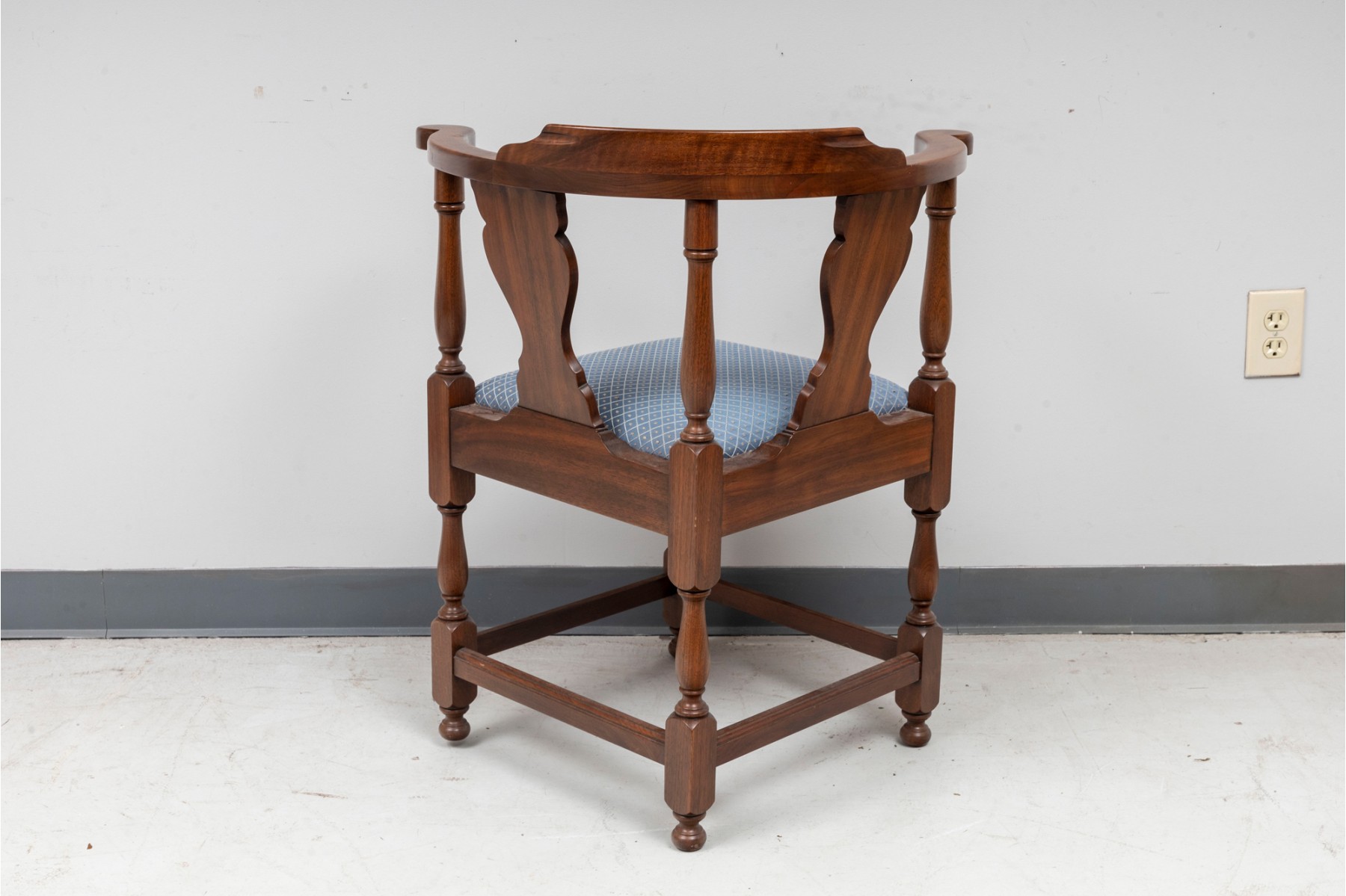 A stately 20th century Georgian style corner chair with vasy form back-splat and perimeter stretcher.