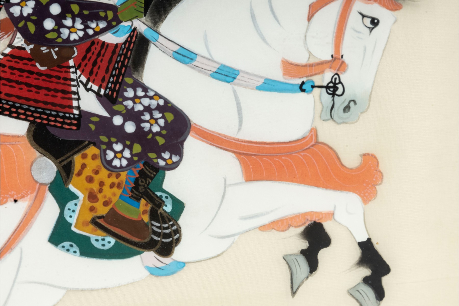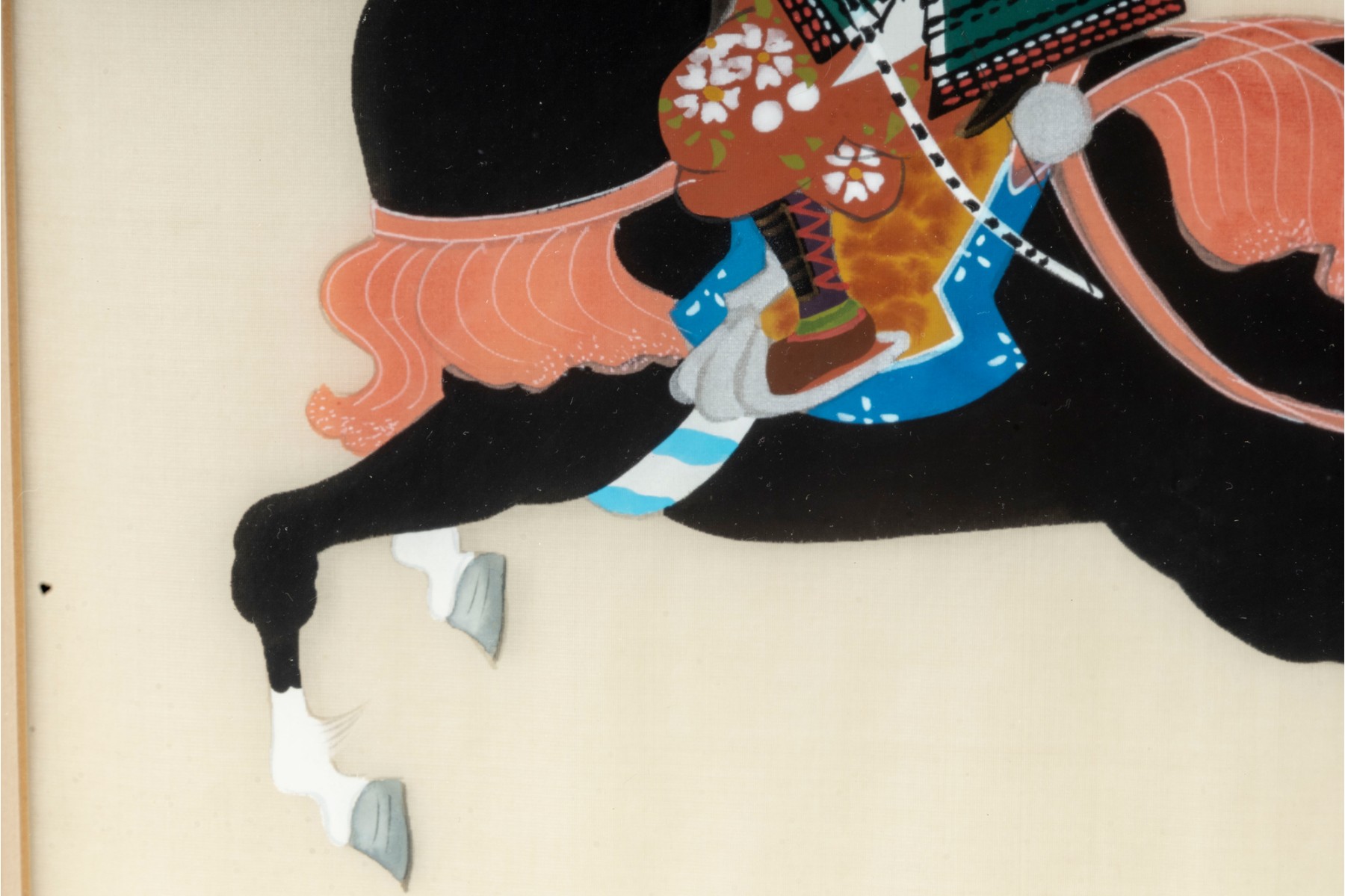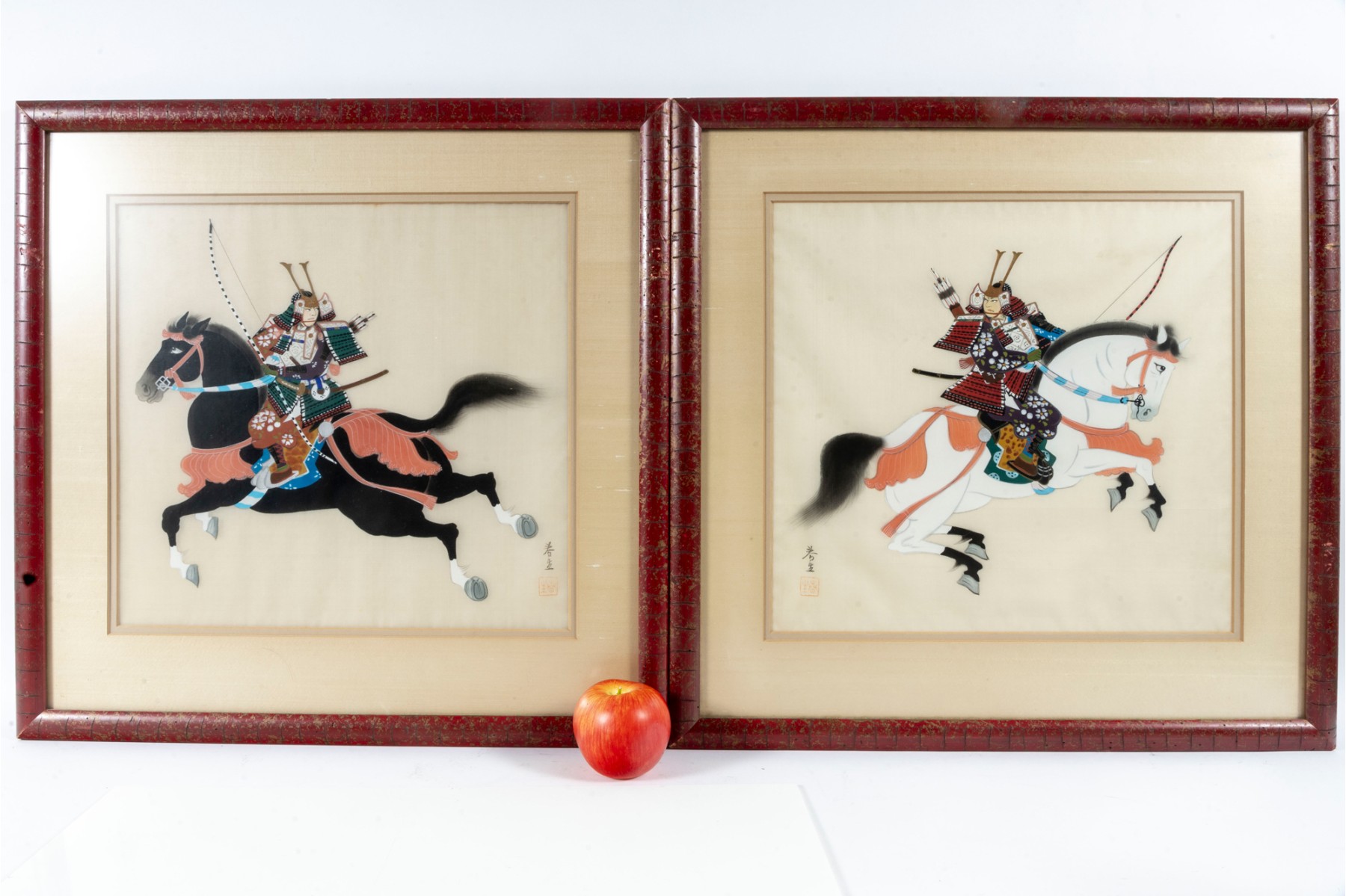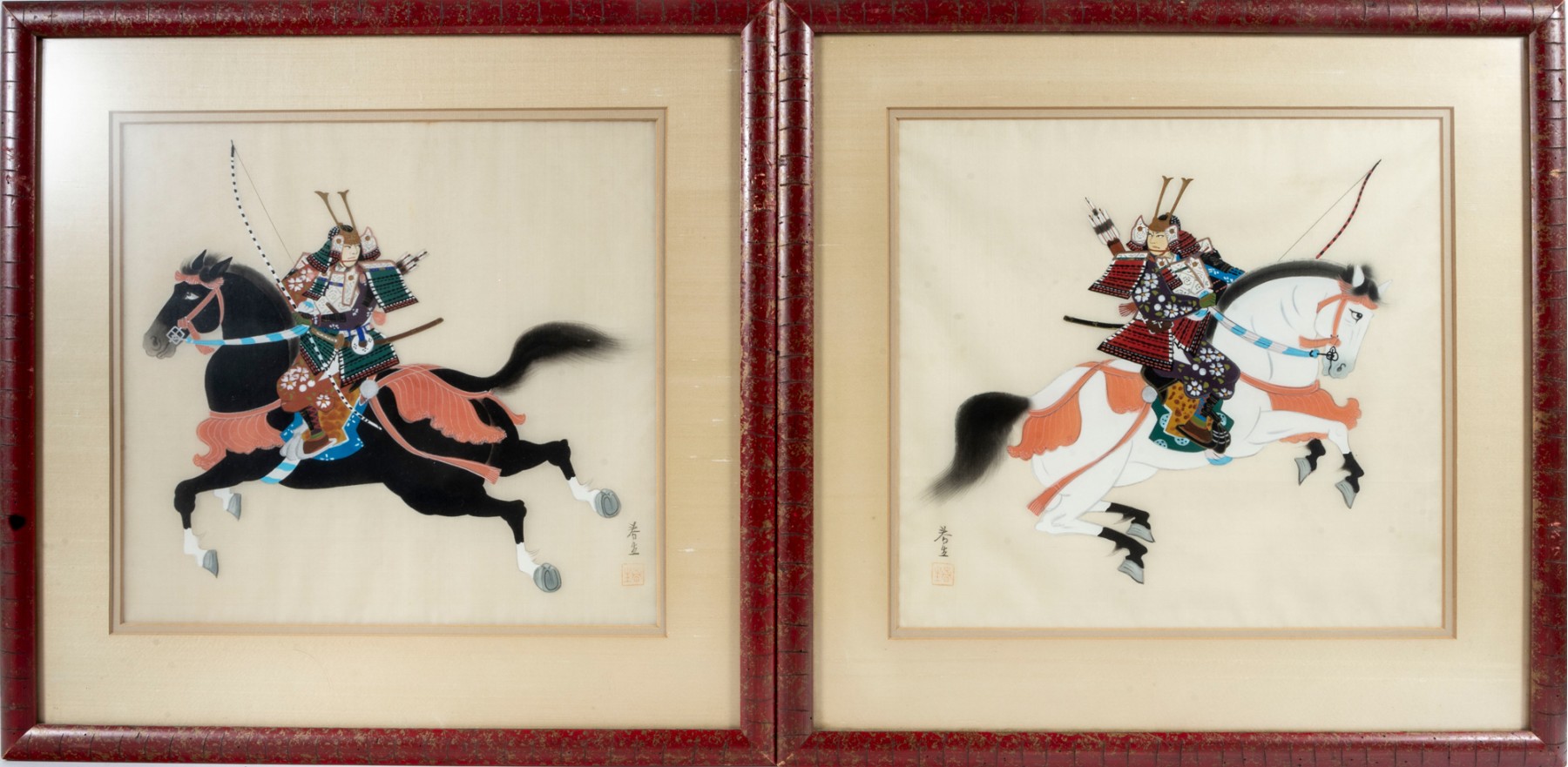 A pair of early 20th century Japanese watercolor on silk paintings depicting two Kamakura Shogunate era warriors on horseback, both sporting traditional Kuwagata maedate's -- the ornamental and symbolic crests of Japanese samurai armor. Both artworks are signed with seals, and are presented within red wood frames, contained behind glass, and complimented by two mat-borders in khaki.