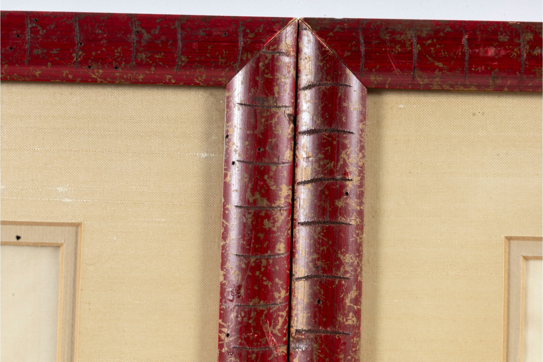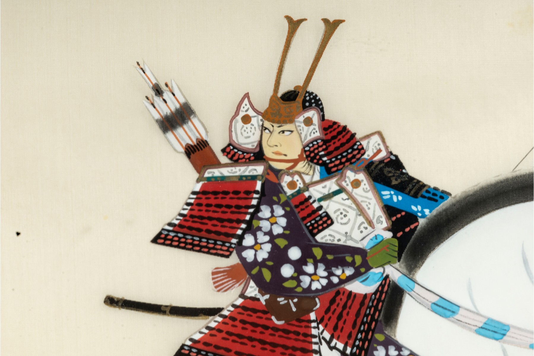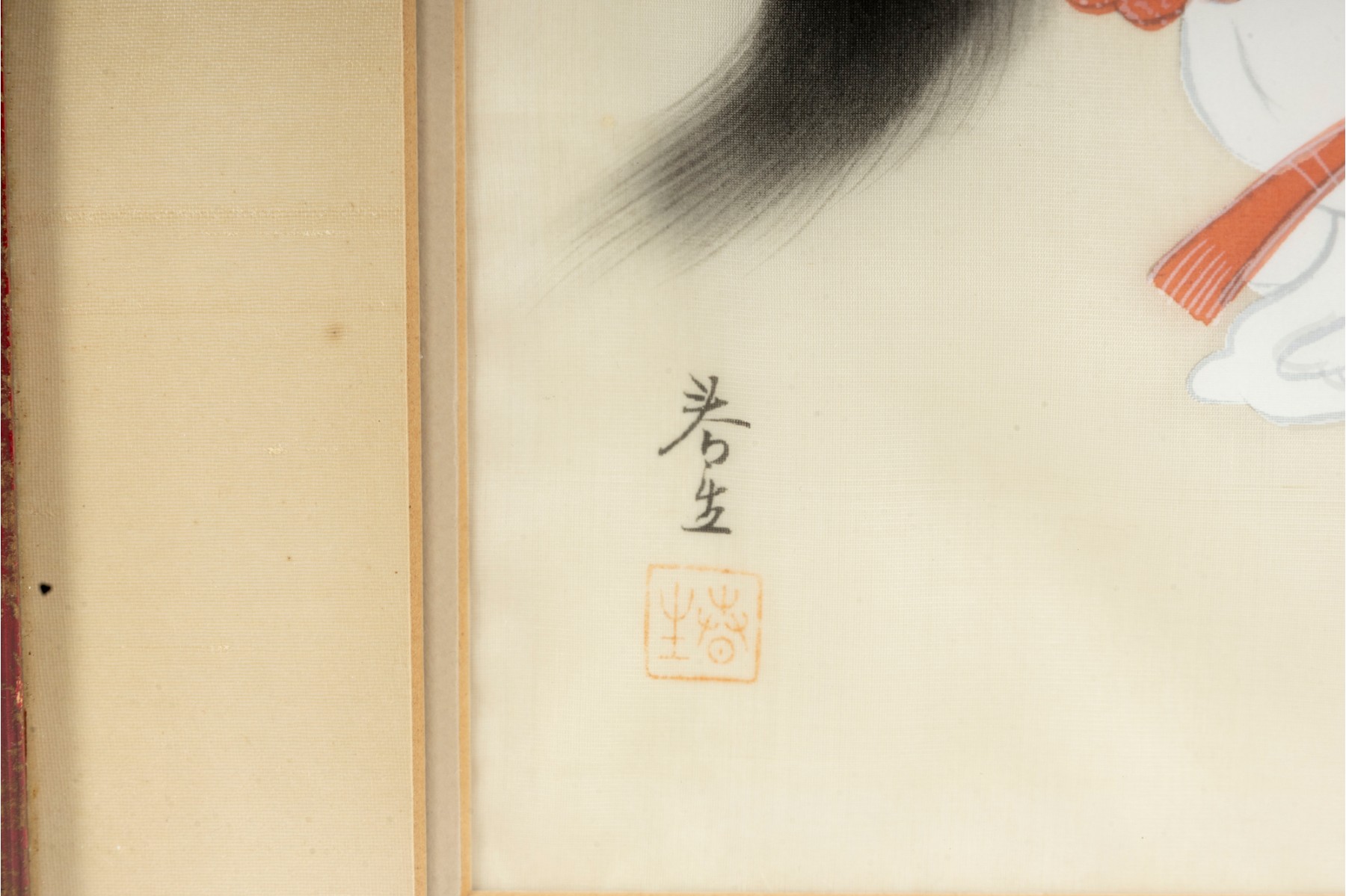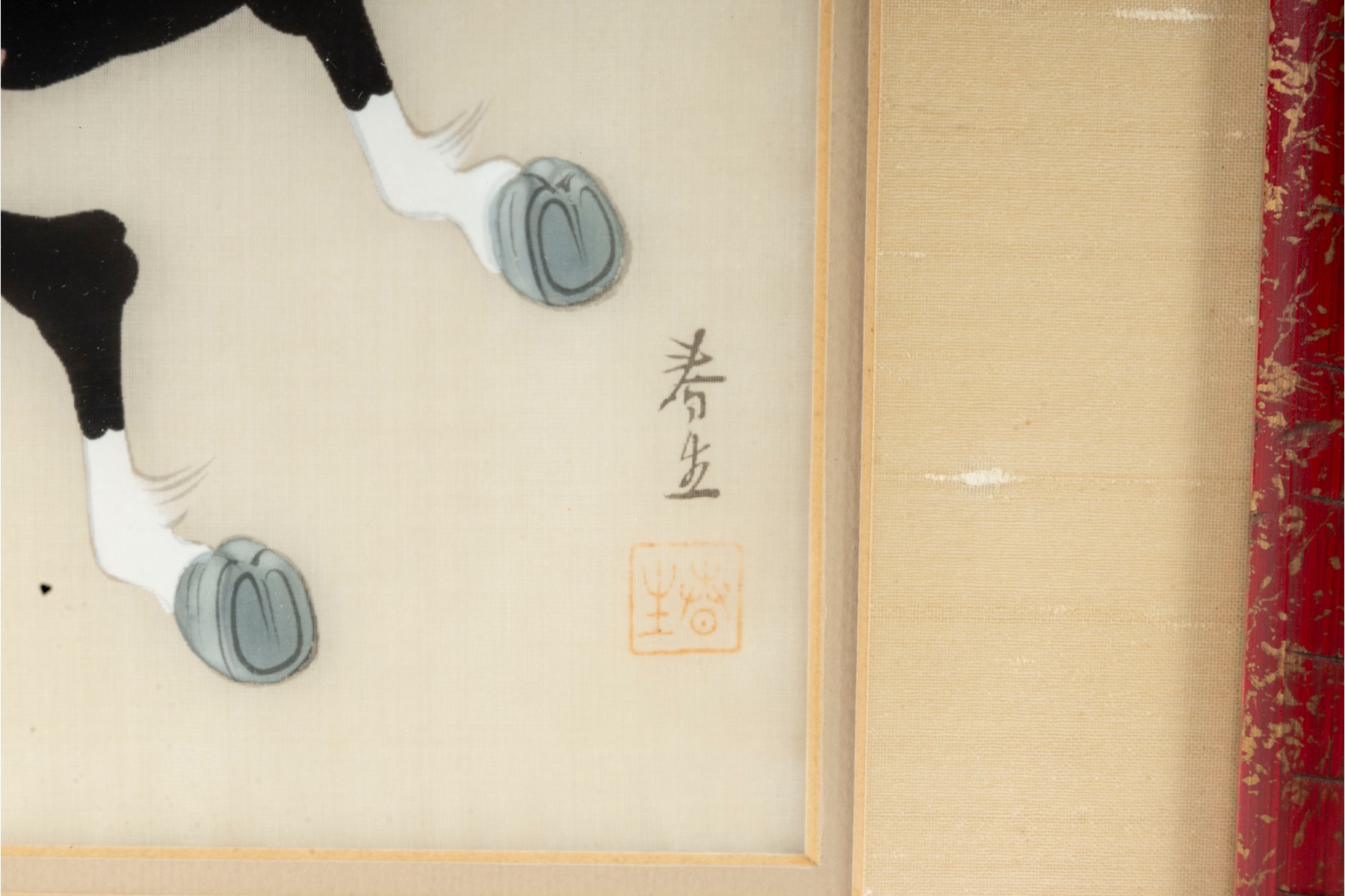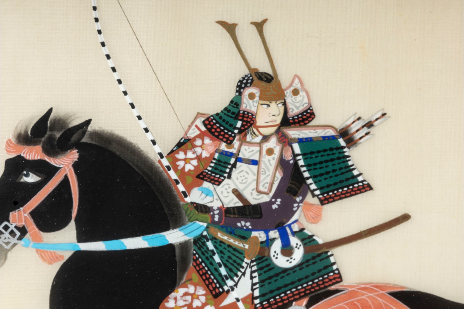 A pair of early 20th century Japanese watercolor on silk paintings depicting two Kamakura Shogunate era warriors on horseback, both sporting traditional Kuwagata maedate's -- the ornamental and symbolic crests of Japanese samurai armor. Both artworks are signed with seals, and are presented within red wood frames, contained behind glass, and complimented by two mat-borders in khaki.