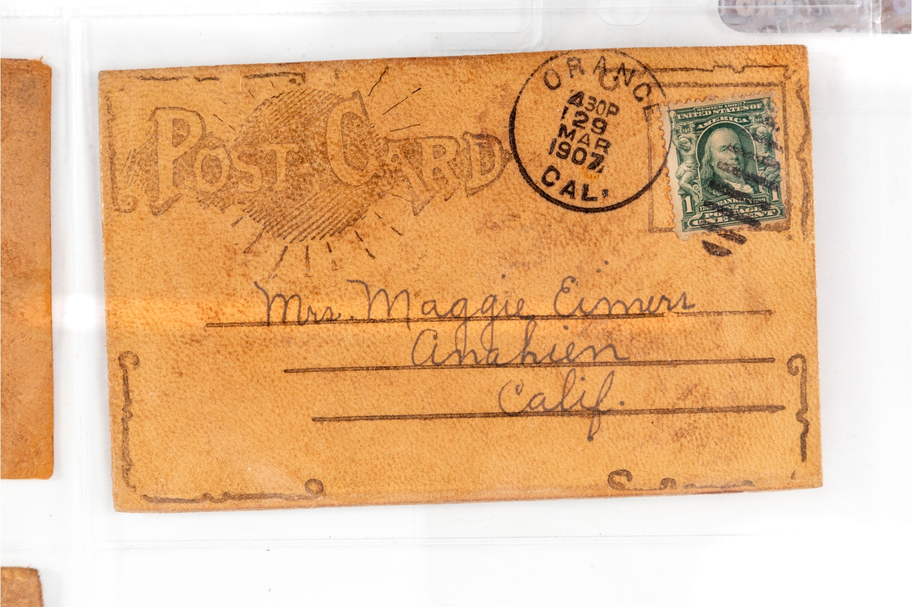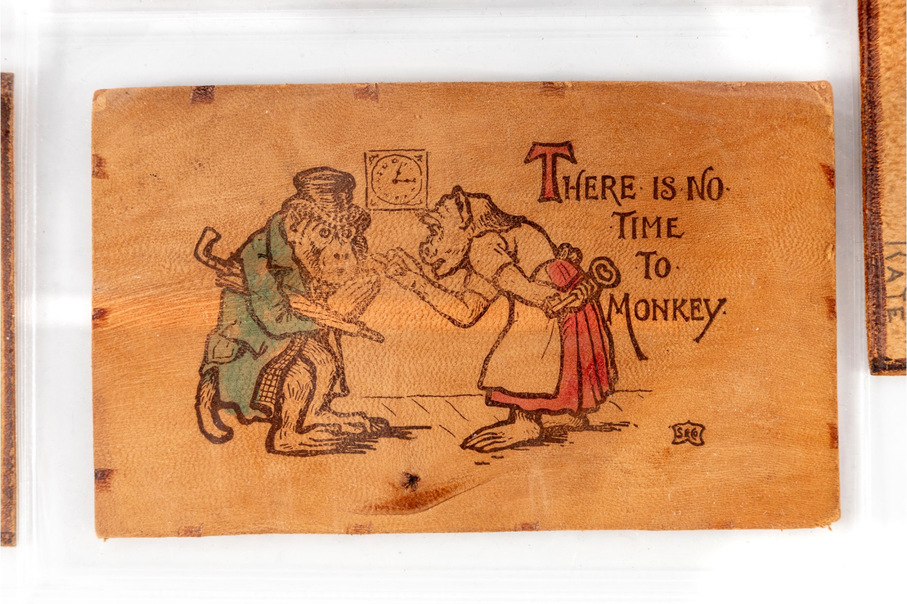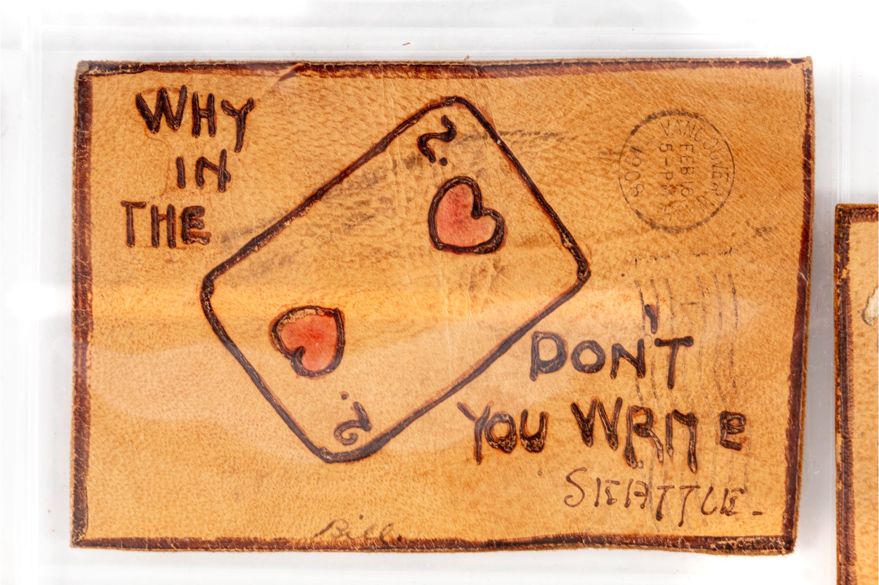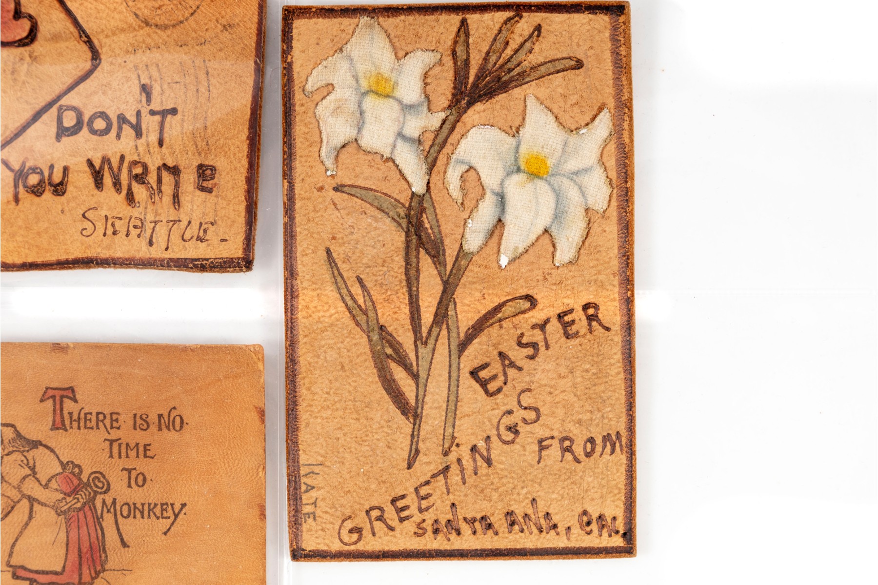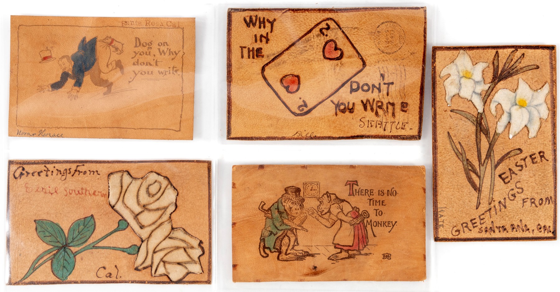 This unique set of vintage leather postcards are a charming relic from the early 20th century, when leather postcards were popular for their novelty and durability. Crafted from genuine leather, the postcard features hand-tooled or embossed designs, which may include whimsical images, greetings, or short messages. Five in total.