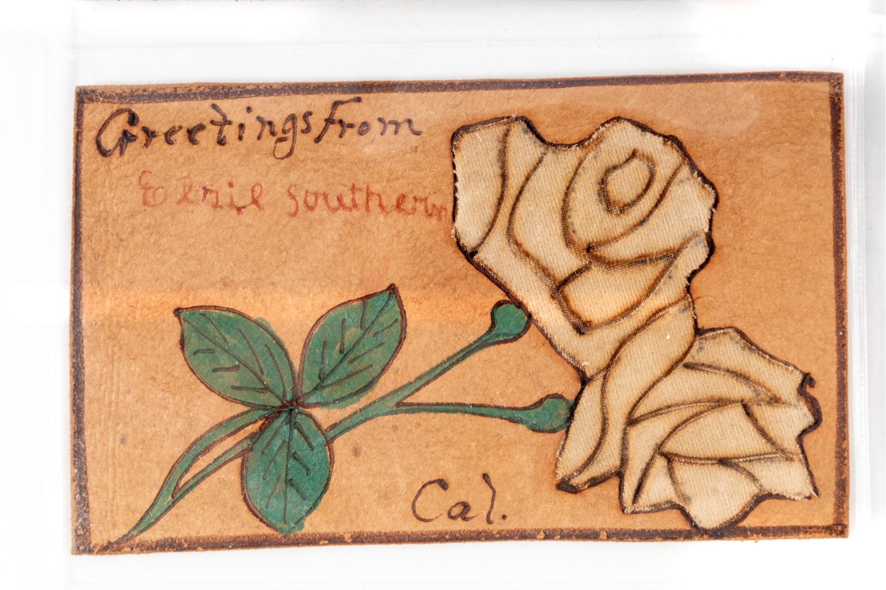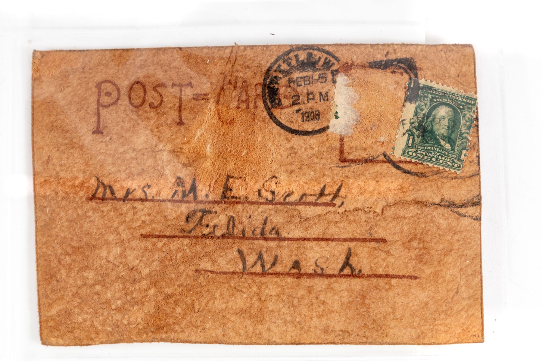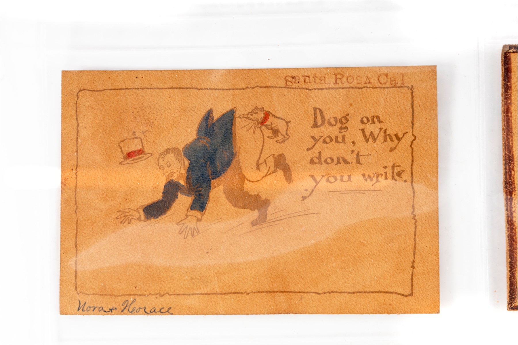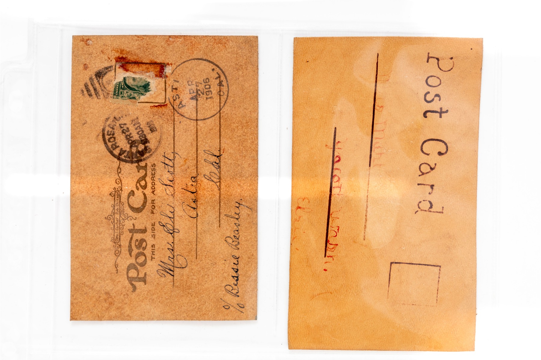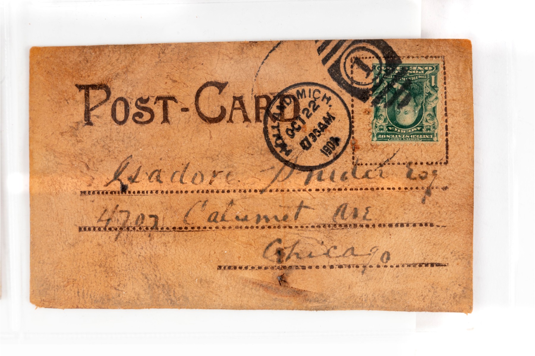 This unique set of vintage leather postcards are a charming relic from the early 20th century, when leather postcards were popular for their novelty and durability. Crafted from genuine leather, the postcard features hand-tooled or embossed designs, which may include whimsical images, greetings, or short messages. Five in total.