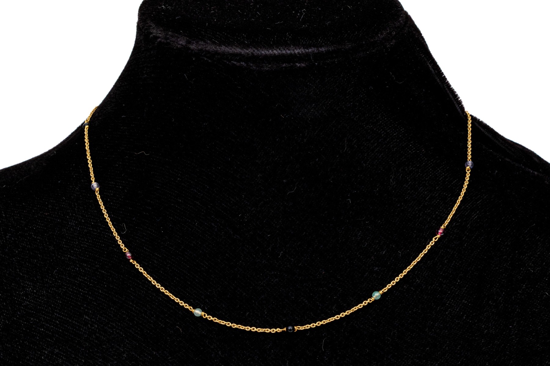 22k yellow gold lovely multi stone bead and fine chain link necklace. This pretty necklace features 2.5mm beads of garnet, onyx and prasiolite, and is finished with a shepherd's hook style clasp