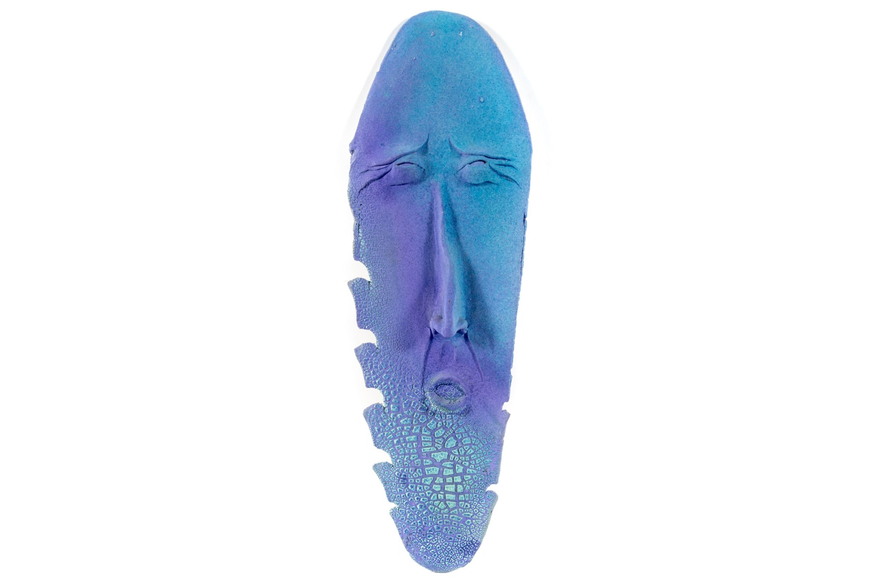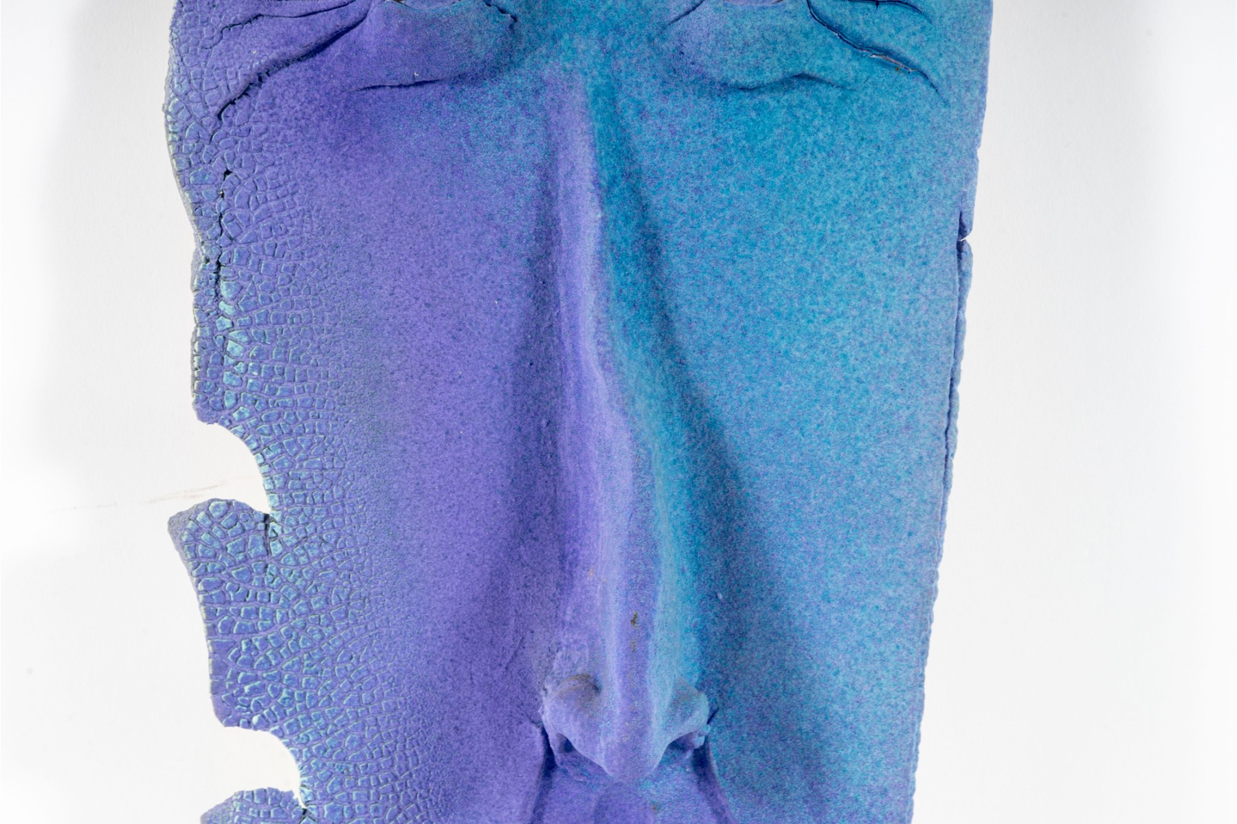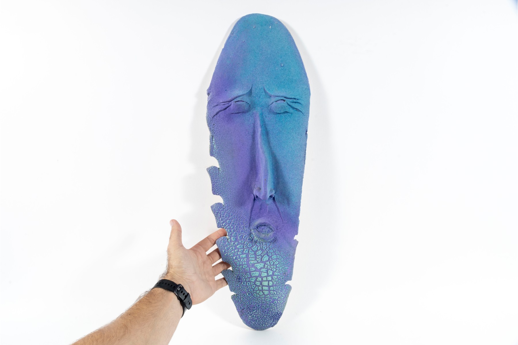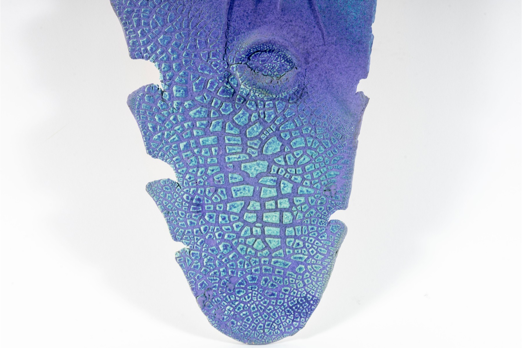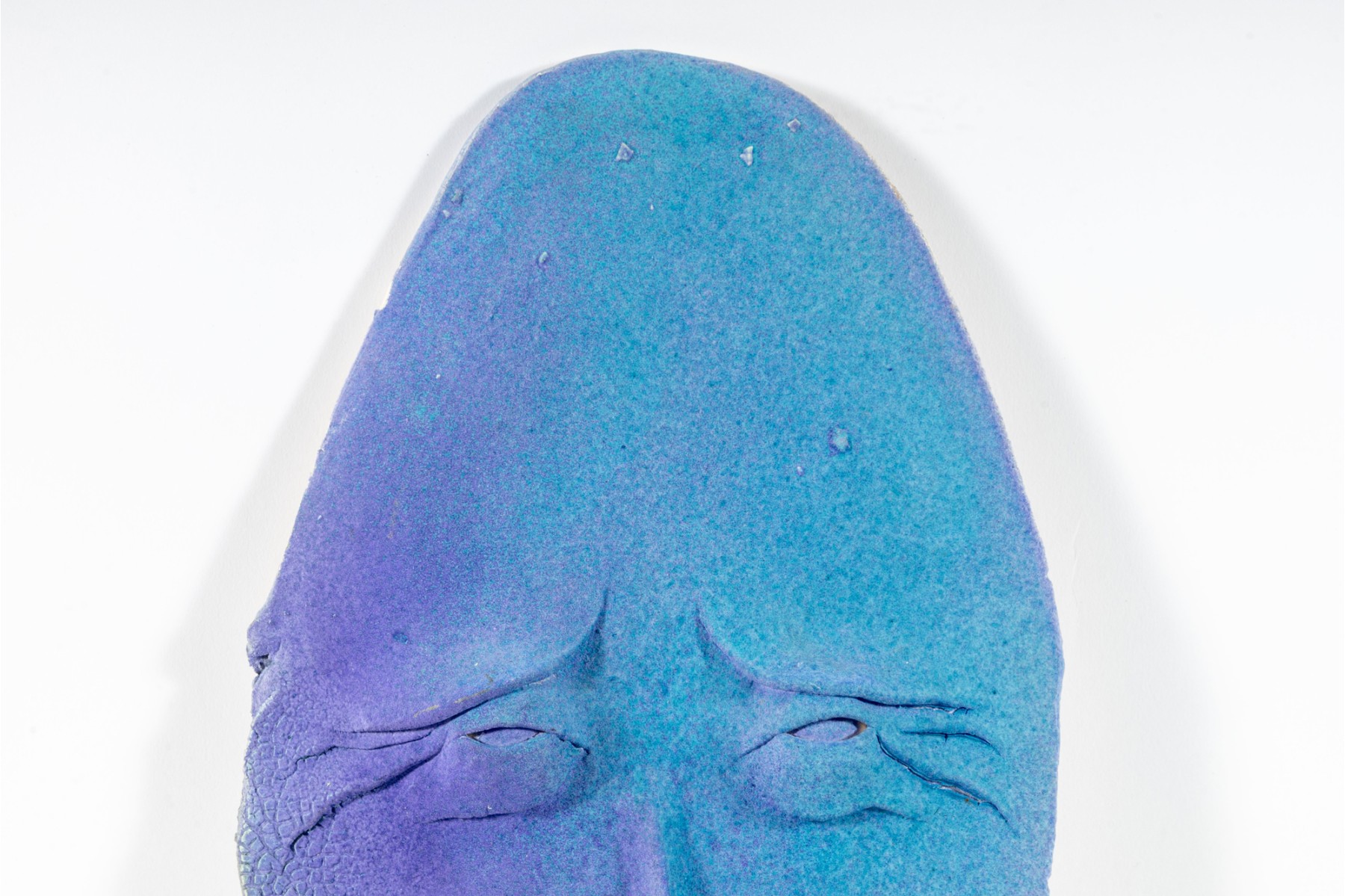A stunning pottery wall sculpture hand-crafted by Mark Ferri of Asheville, North Carolina. Dawning a beautiful vibrant blue/violet matte overglaze gradient with textured details, this eclectic porcelain mask is ready to hang. A clear signature resides on the back. Not dated.