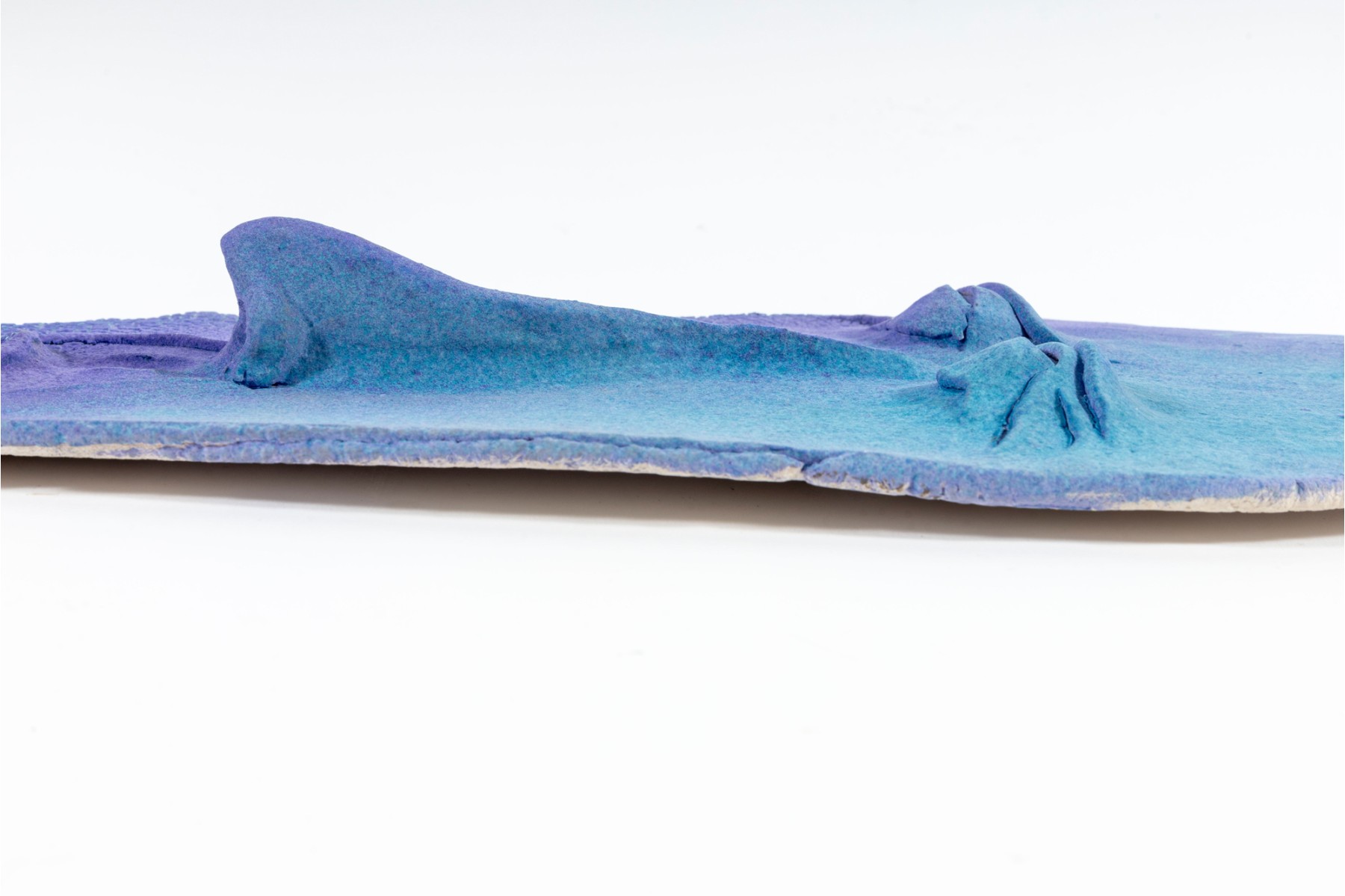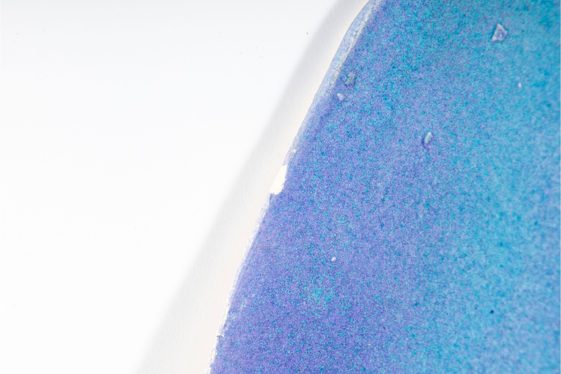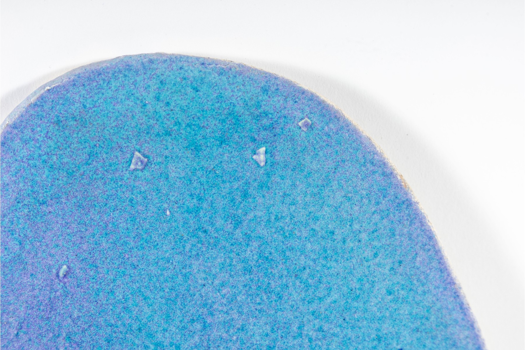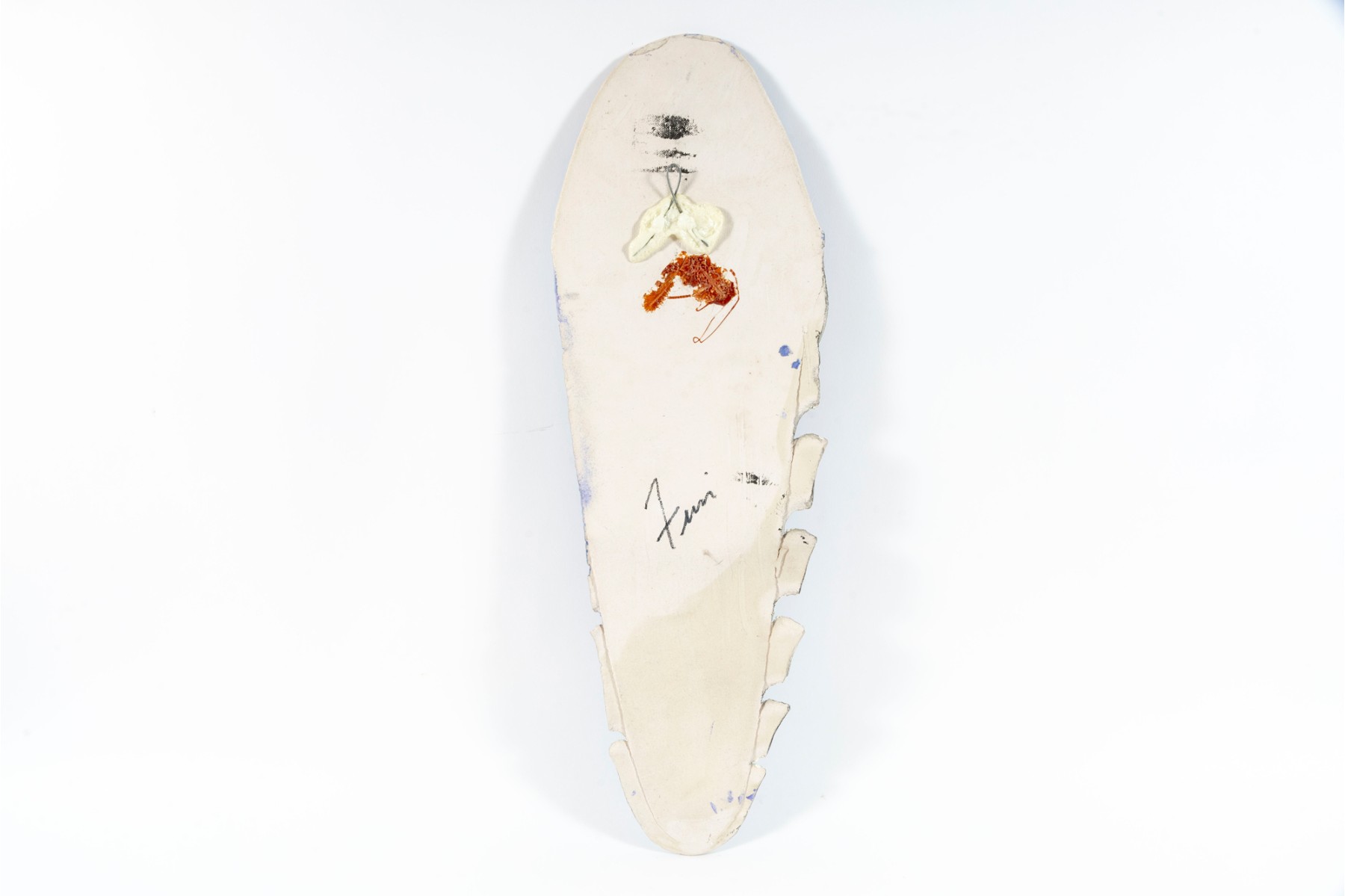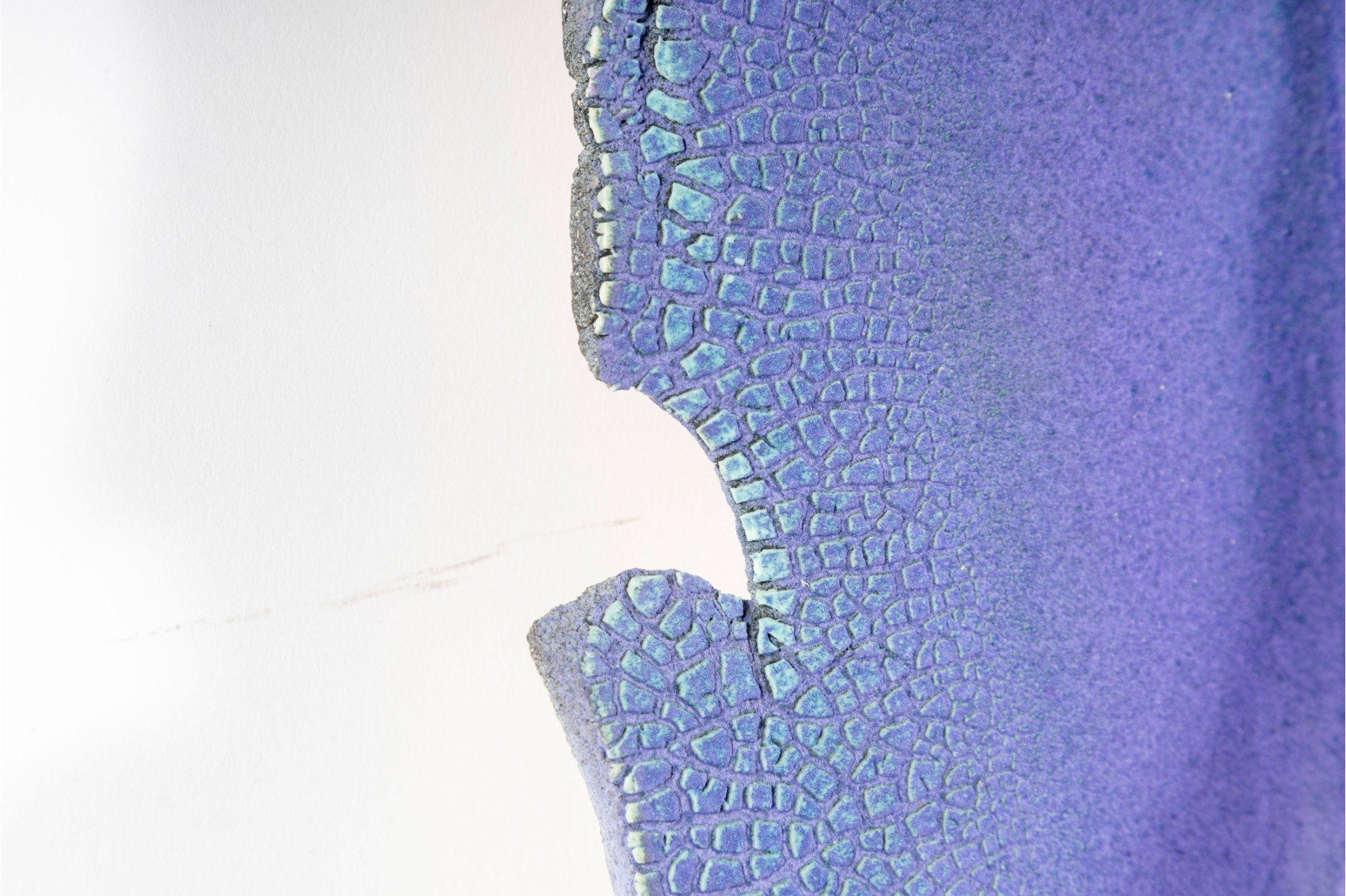 A stunning pottery wall sculpture hand-crafted by Mark Ferri of Asheville, North Carolina. Dawning a beautiful vibrant blue/violet matte overglaze gradient with textured details, this eclectic porcelain mask is ready to hang. A clear signature resides on the back. Not dated.