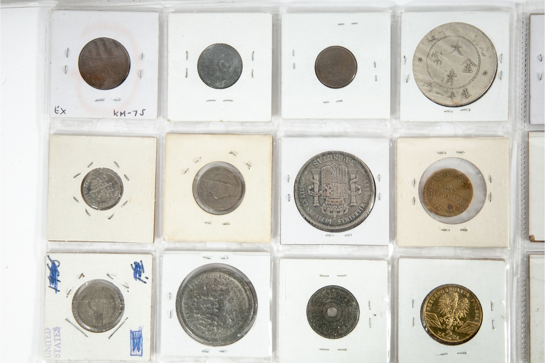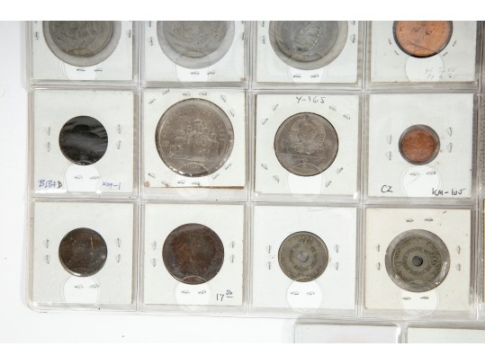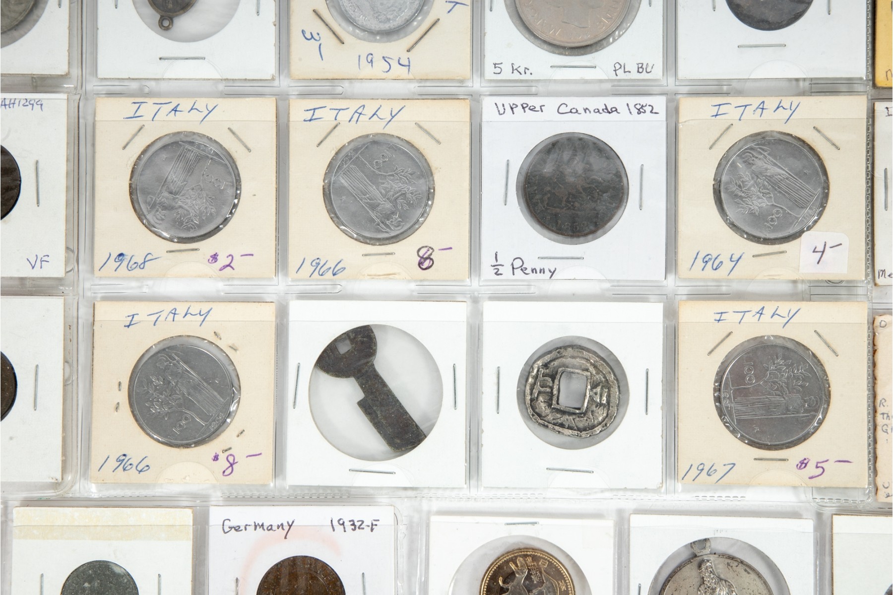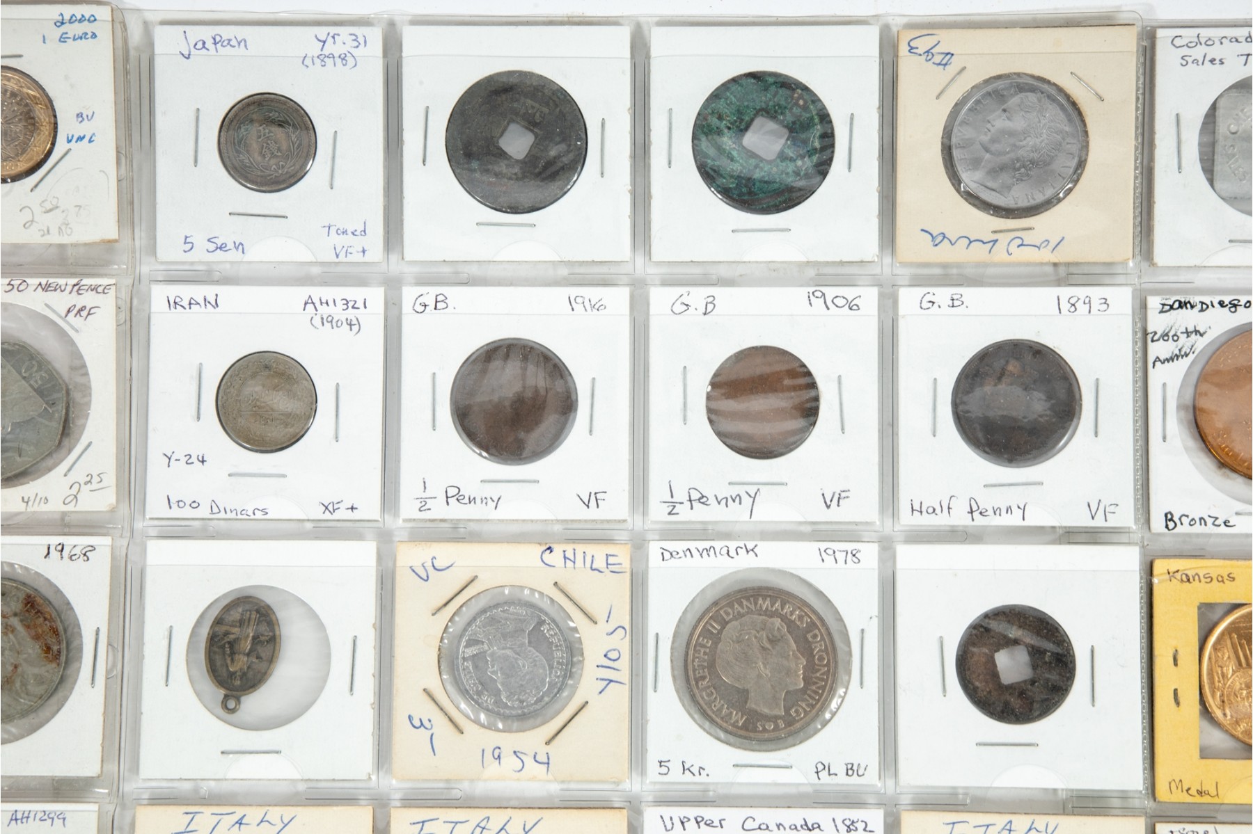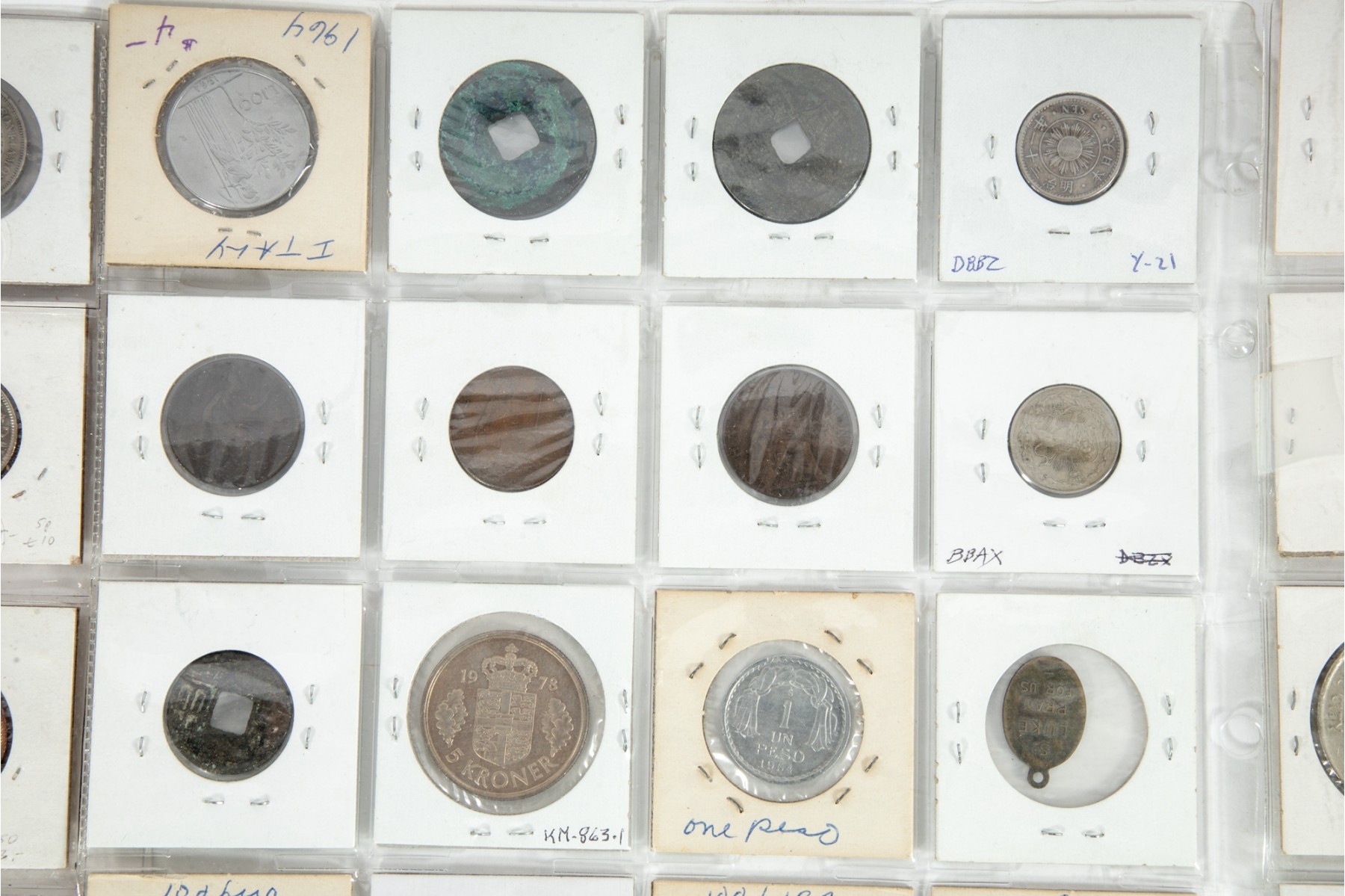 This collection includes 5 sleeves of assorted world coins and medals, each containing a variety of denominations and designs from multiple countries across different eras. The coins vary in material, ranging from copper and nickel to more precious metals.
