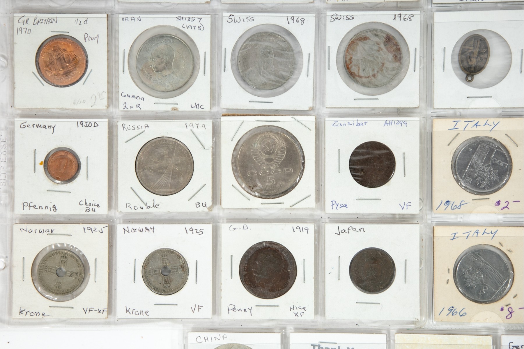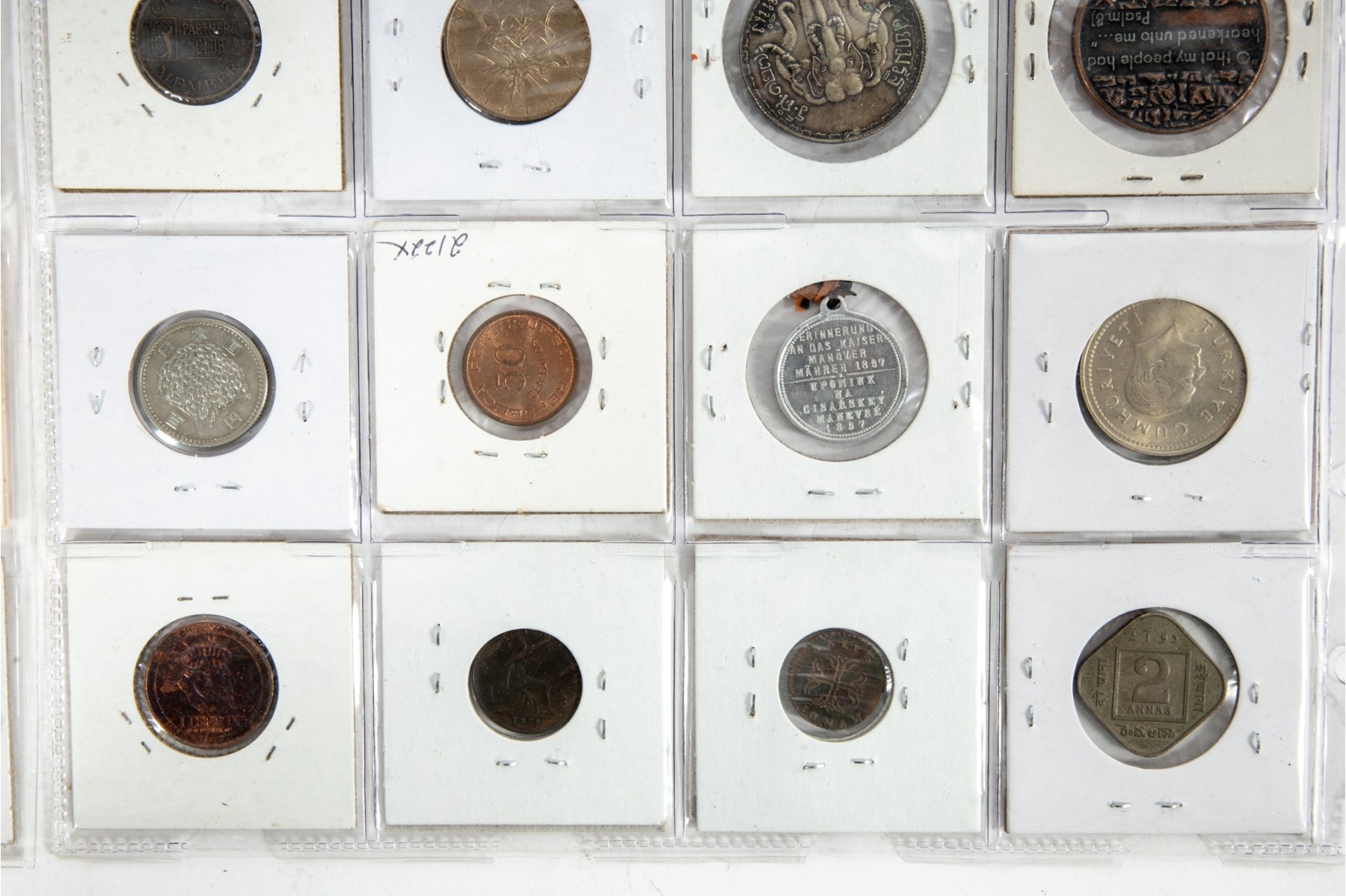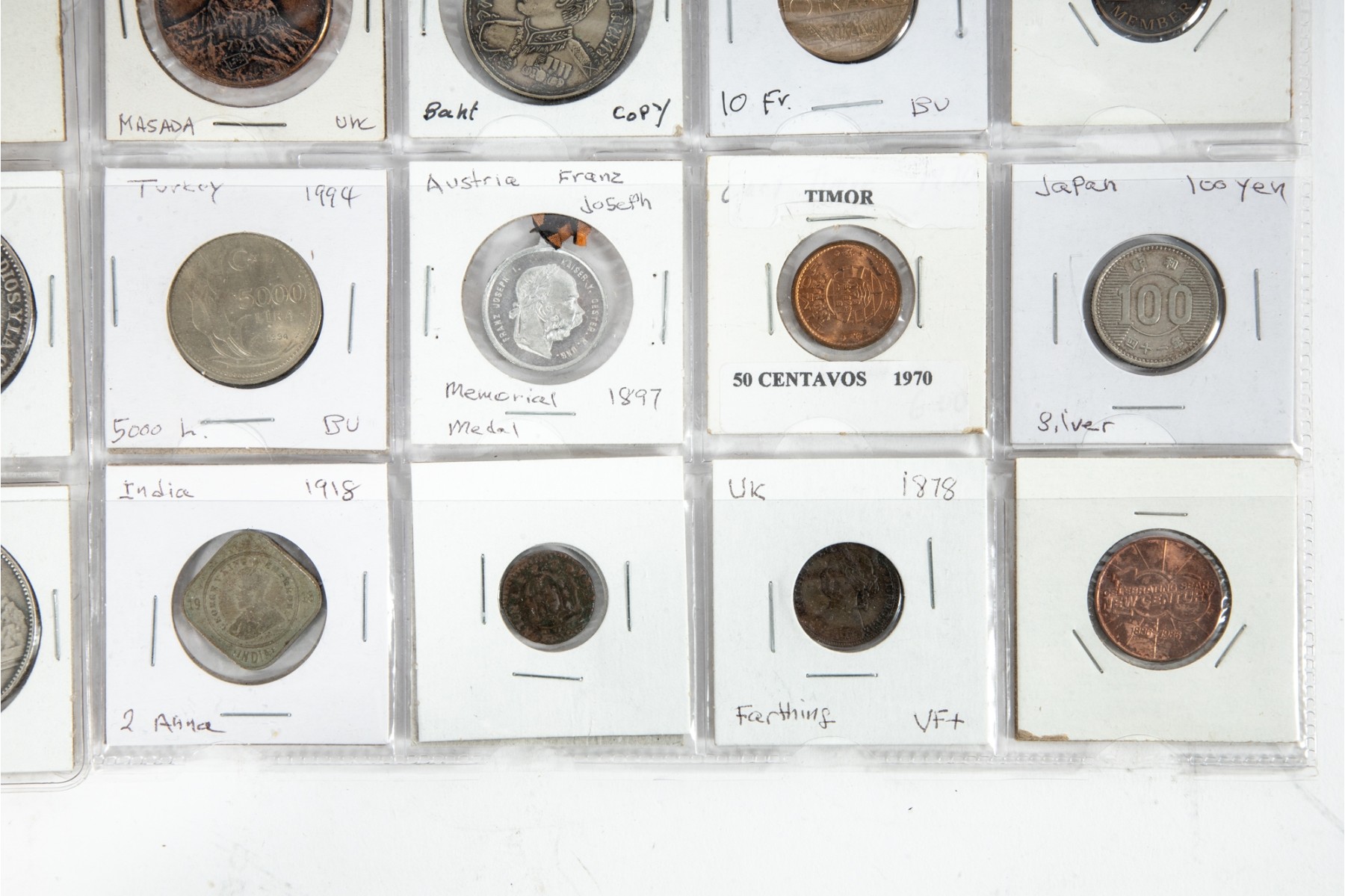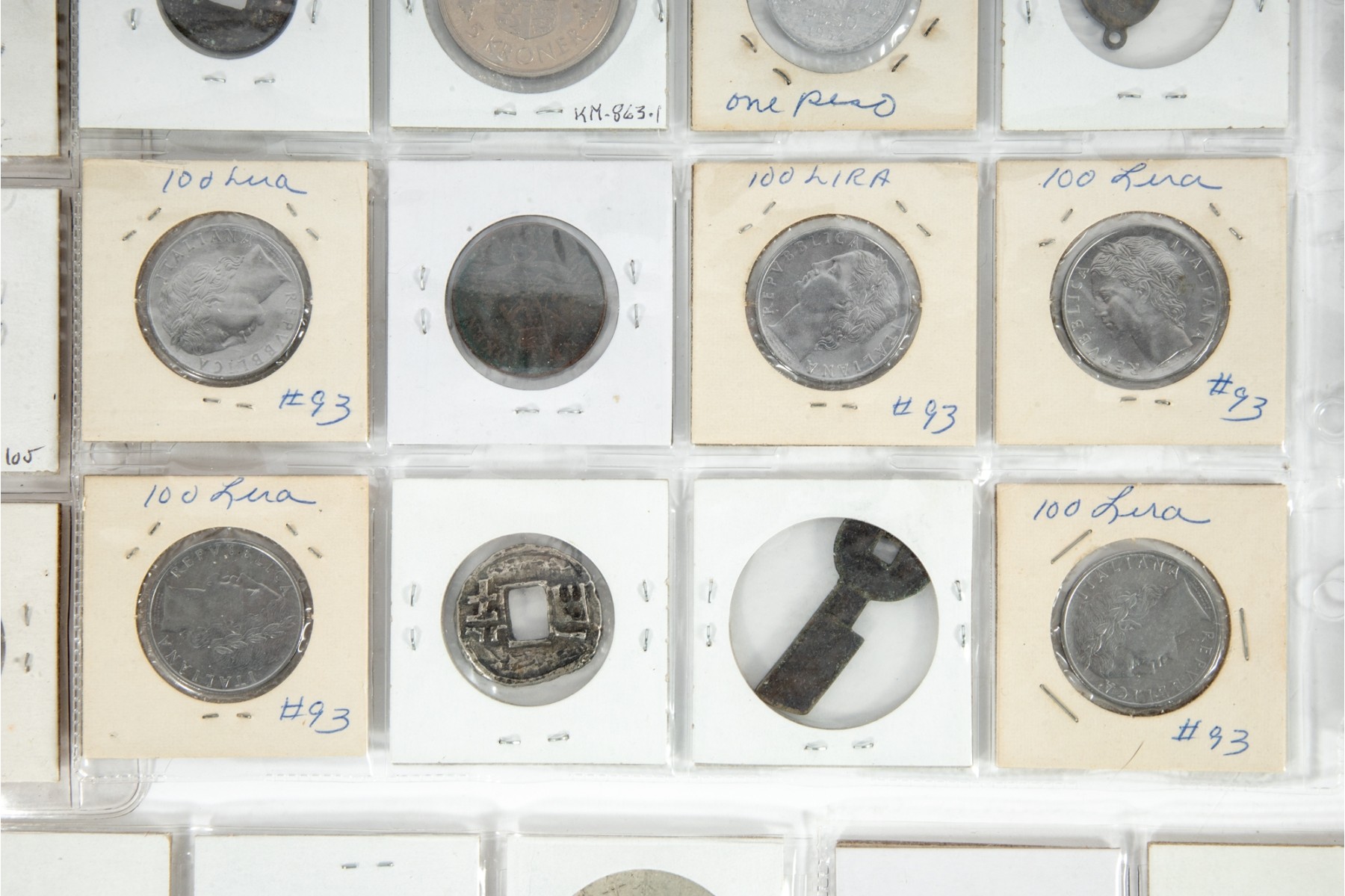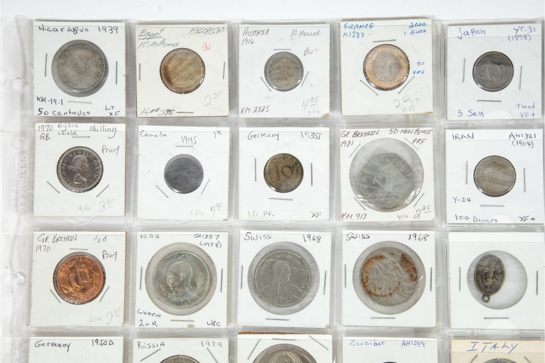This collection includes 5 sleeves of assorted world coins and medals, each containing a variety of denominations and designs from multiple countries across different eras. The coins vary in material, ranging from copper and nickel to more precious metals.