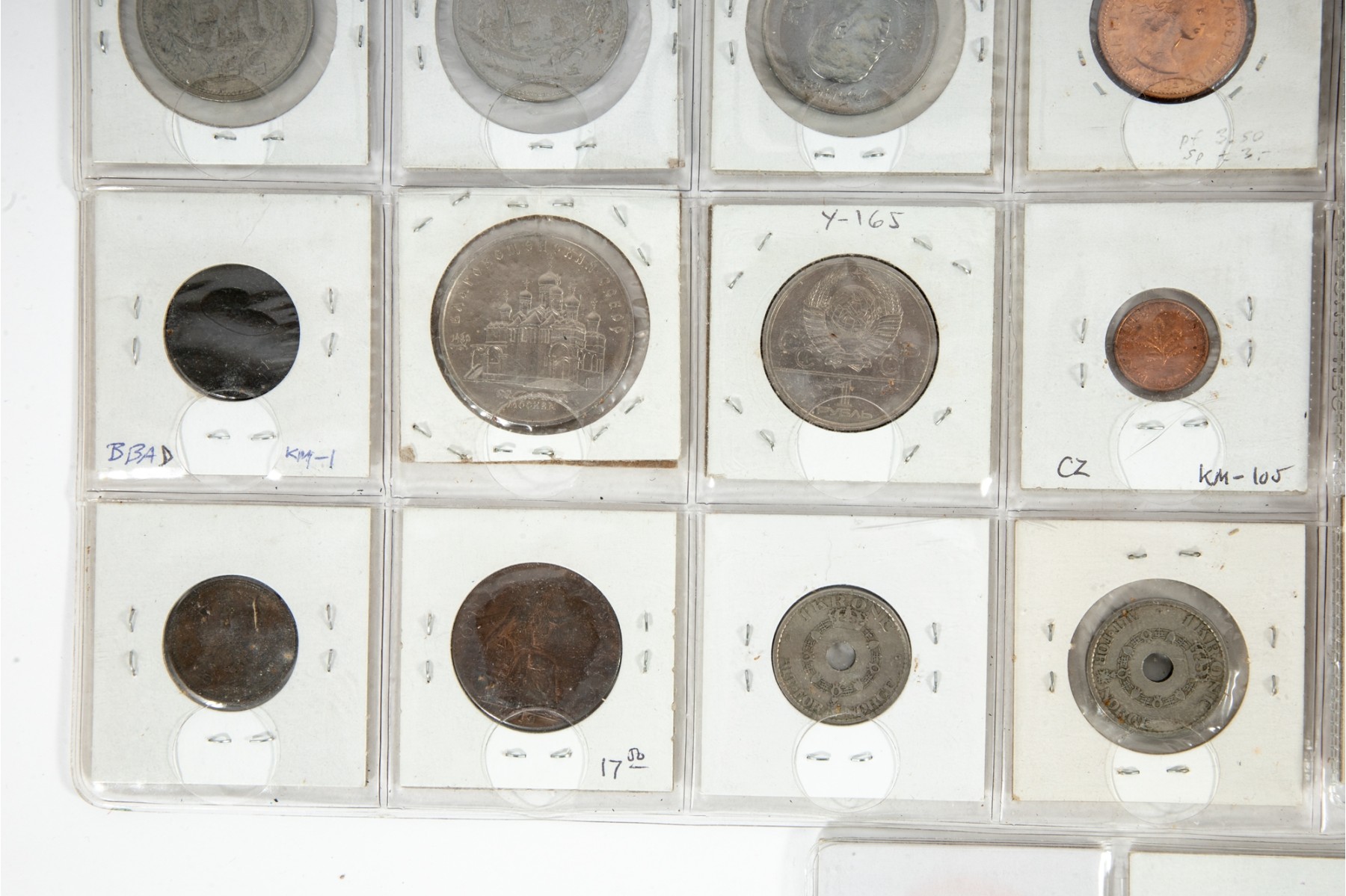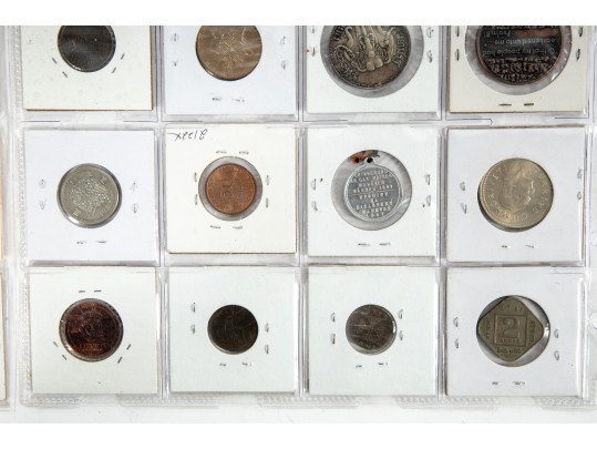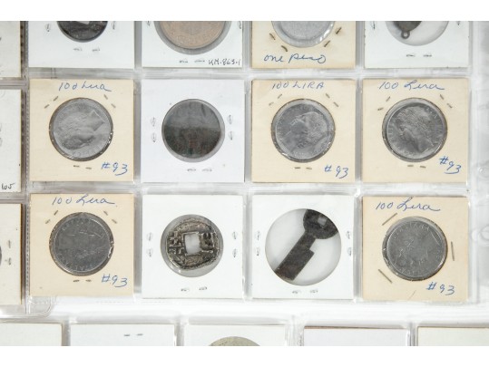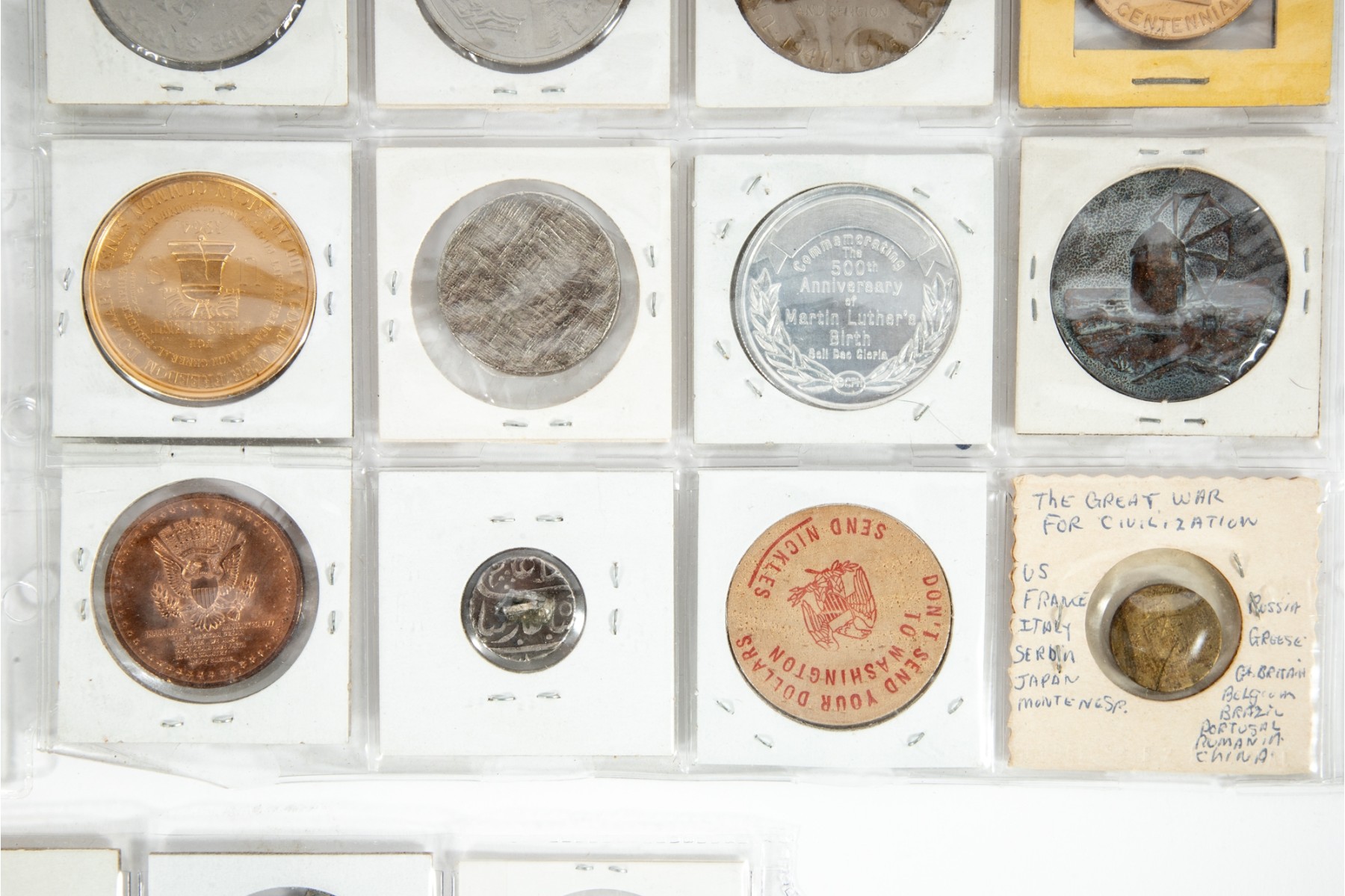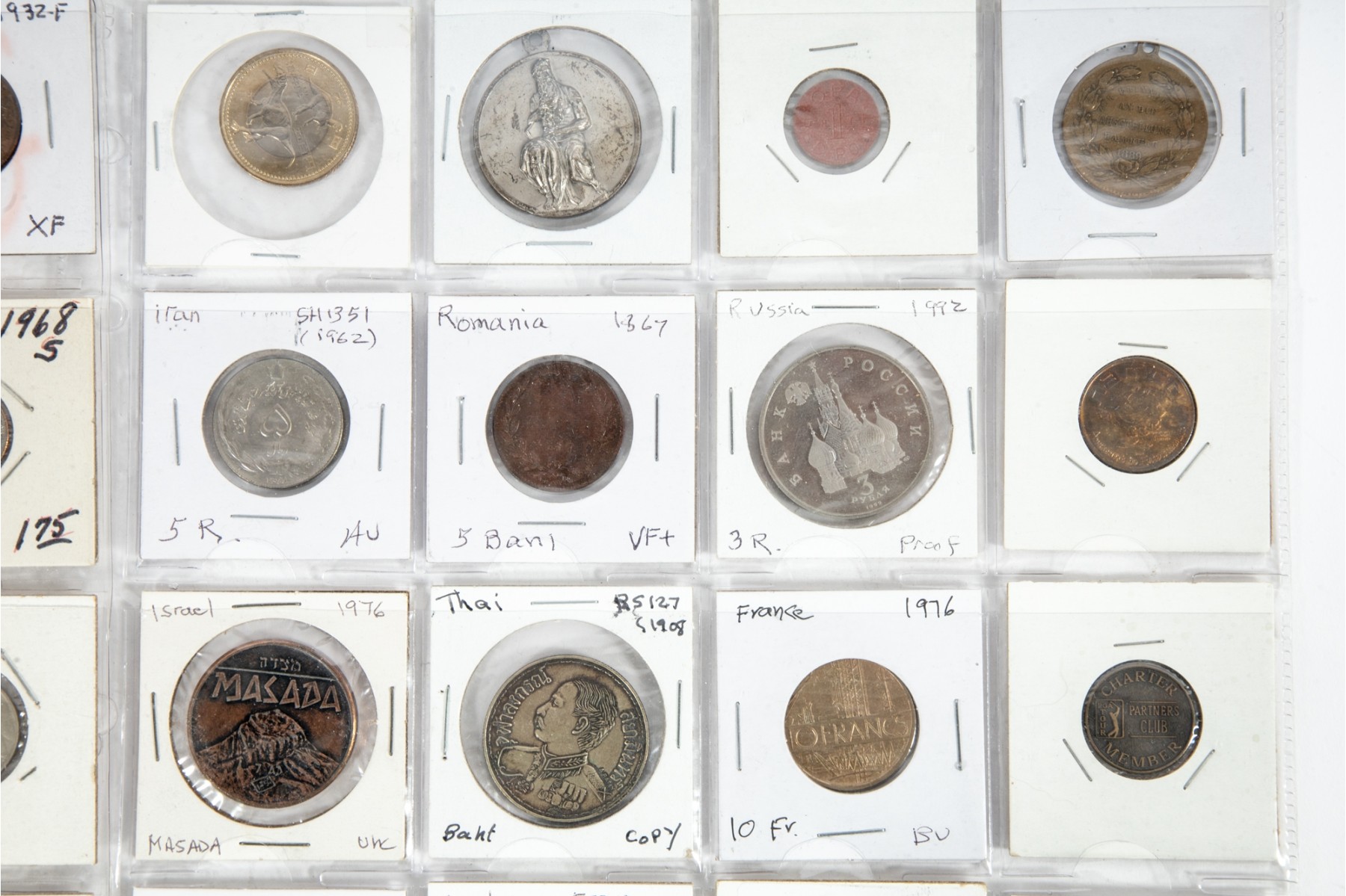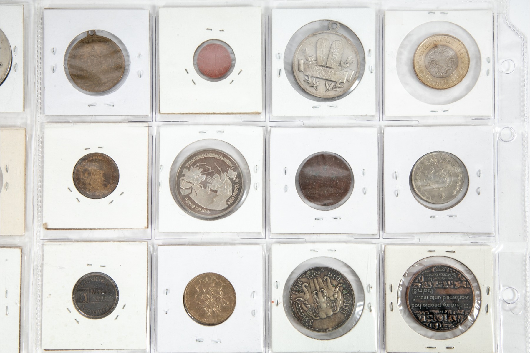 This collection includes 5 sleeves of assorted world coins and medals, each containing a variety of denominations and designs from multiple countries across different eras. The coins vary in material, ranging from copper and nickel to more precious metals.