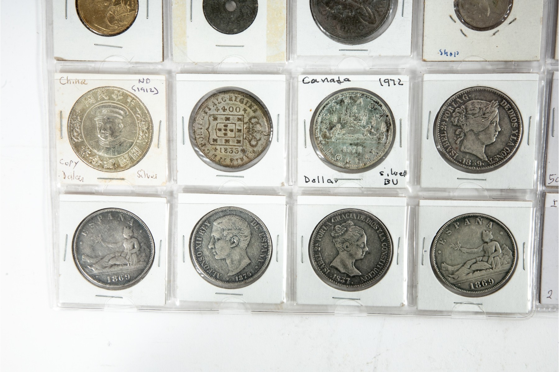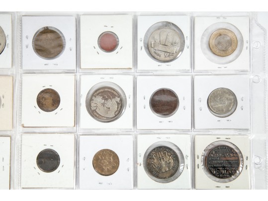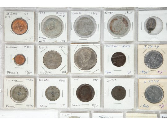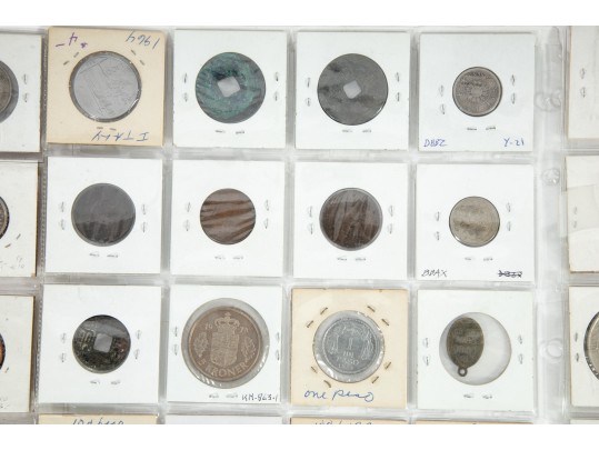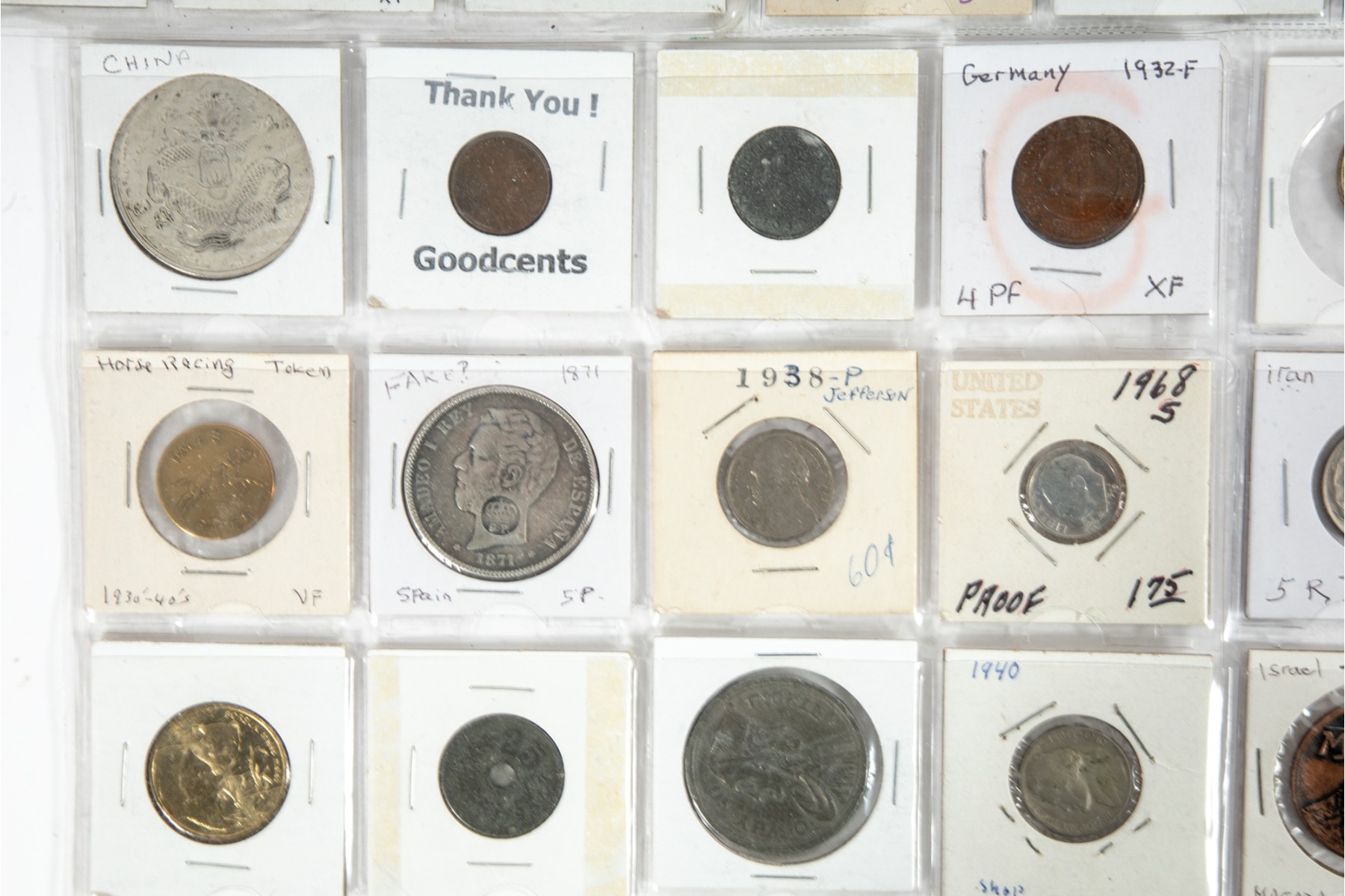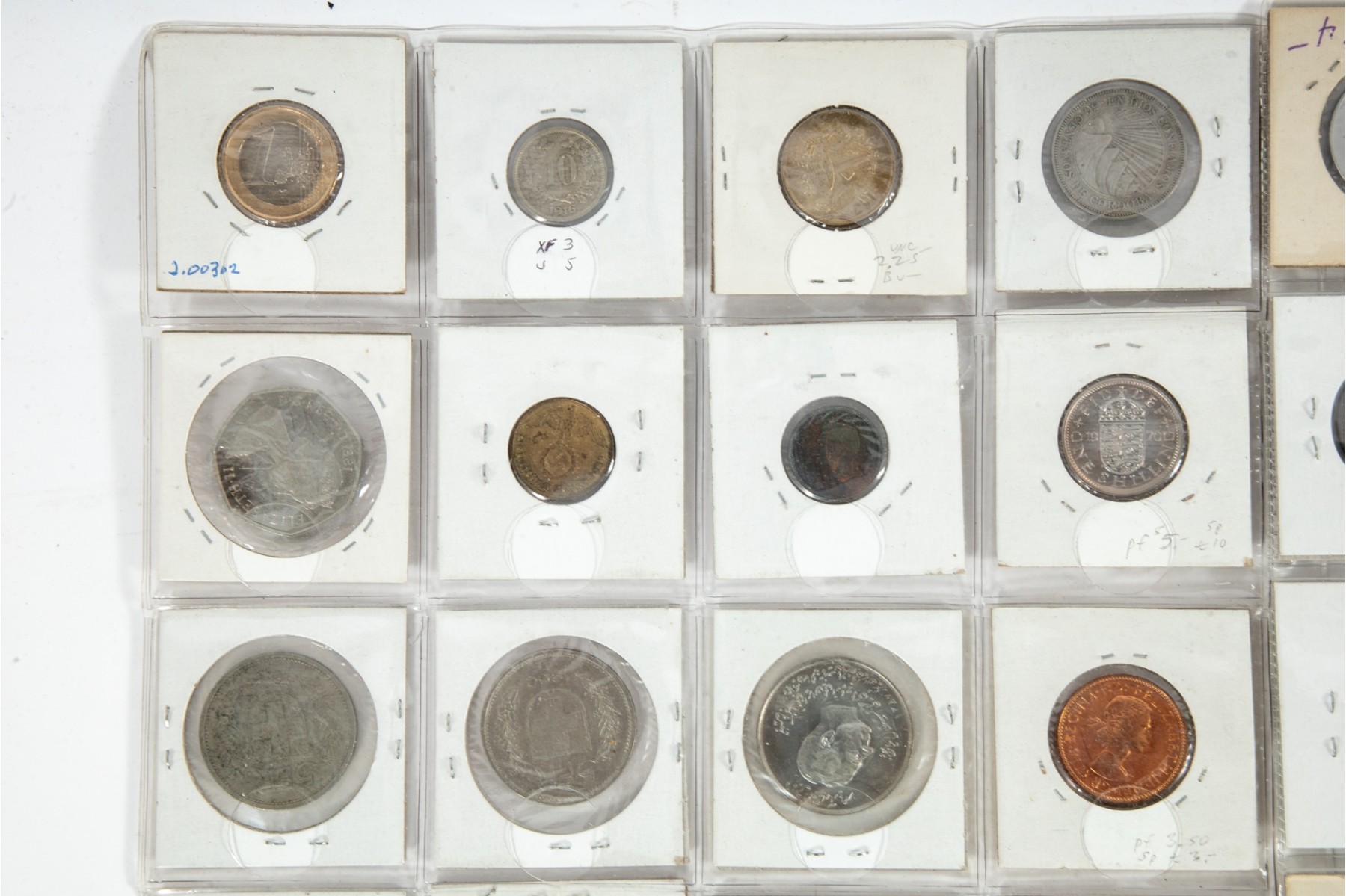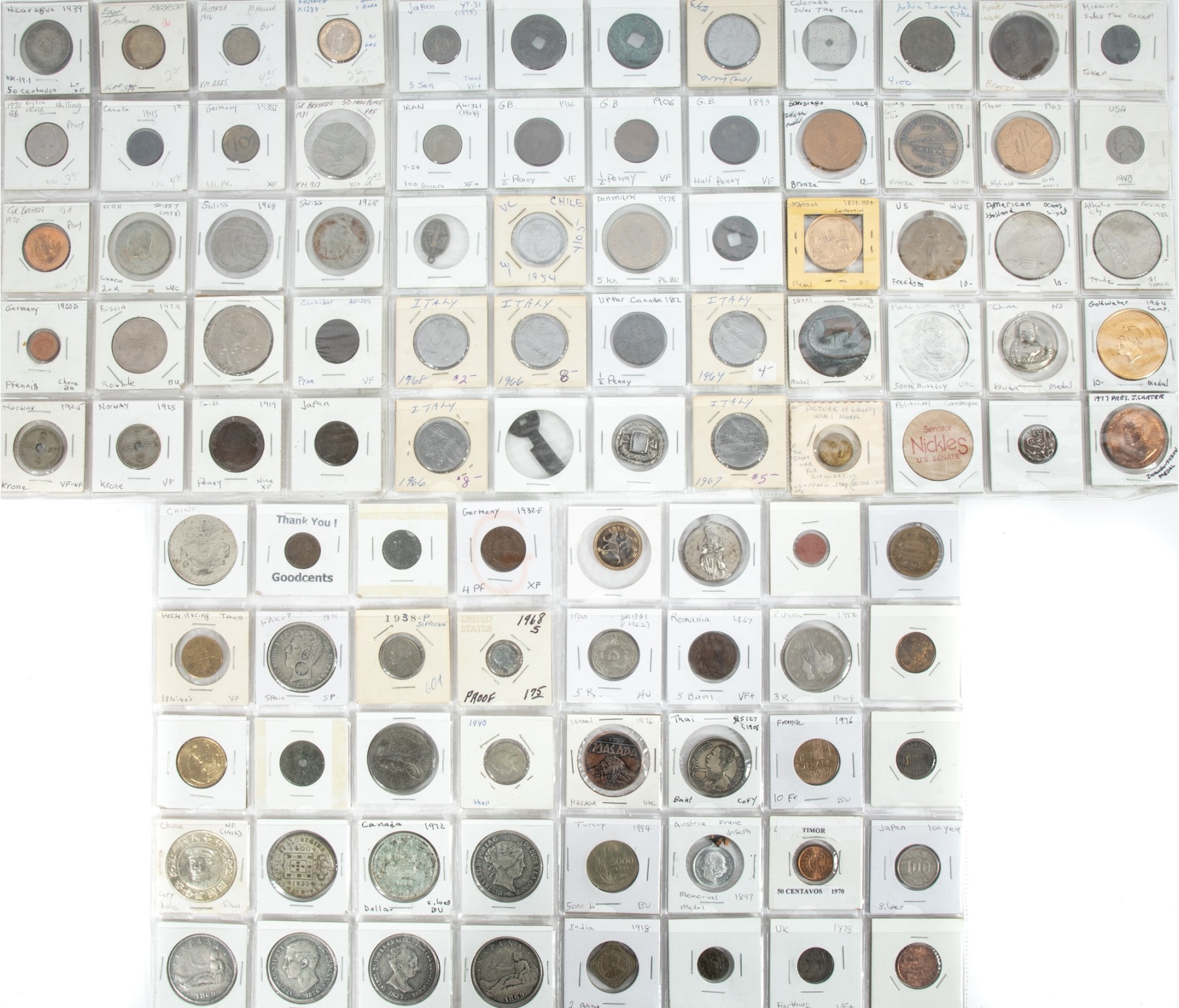 This collection includes 5 sleeves of assorted world coins and medals, each containing a variety of denominations and designs from multiple countries across different eras. The coins vary in material, ranging from copper and nickel to more precious metals.