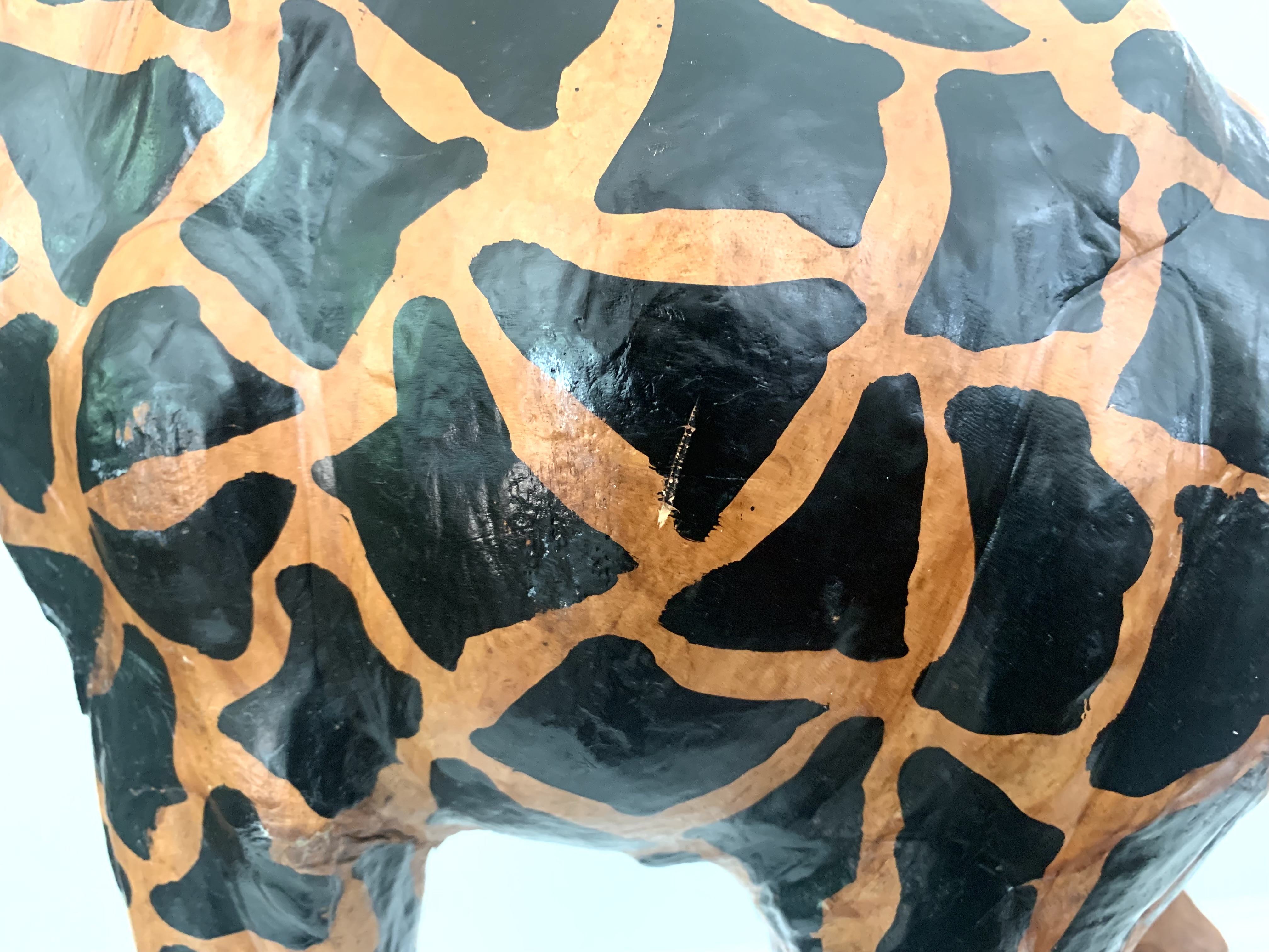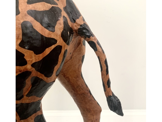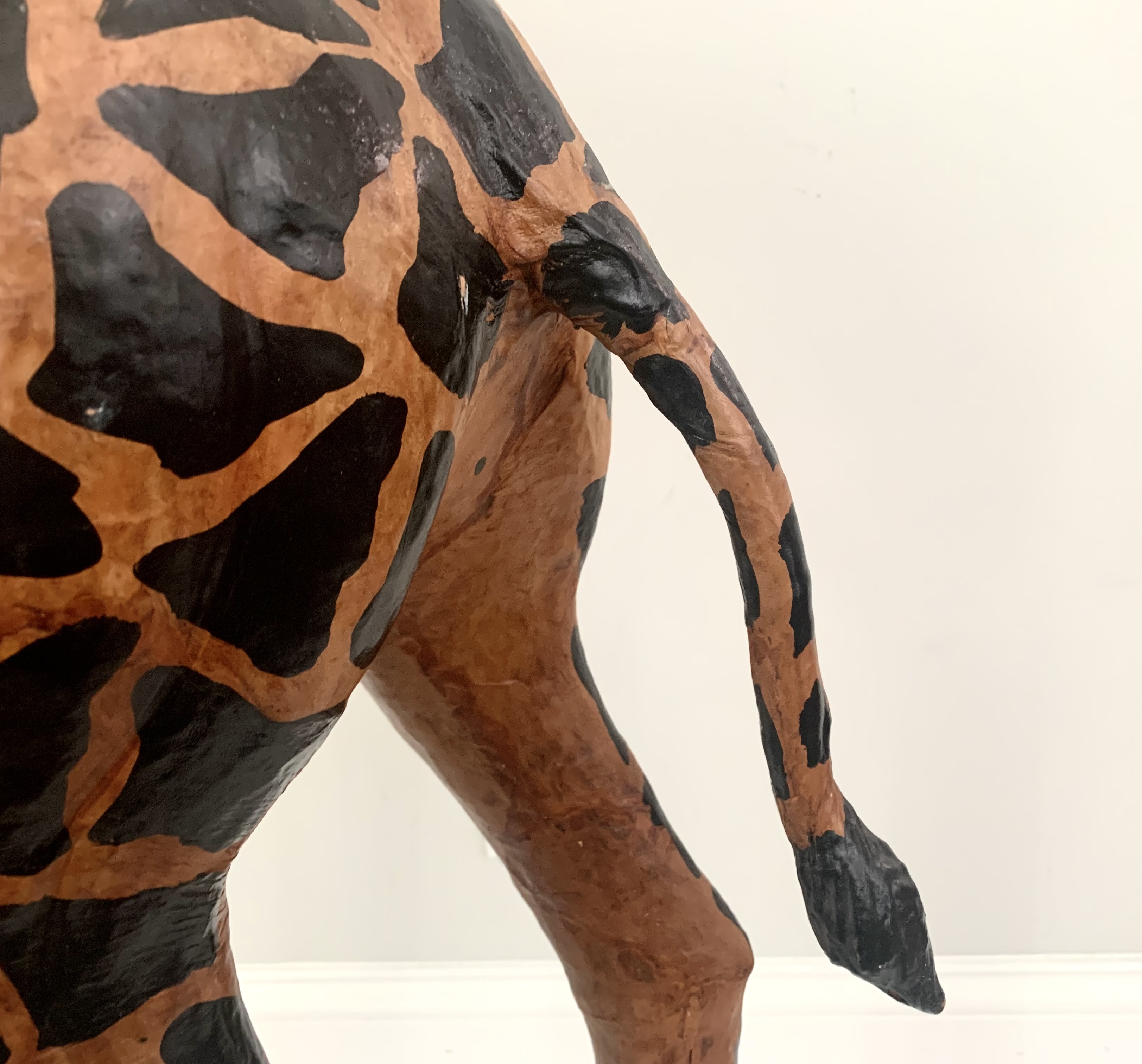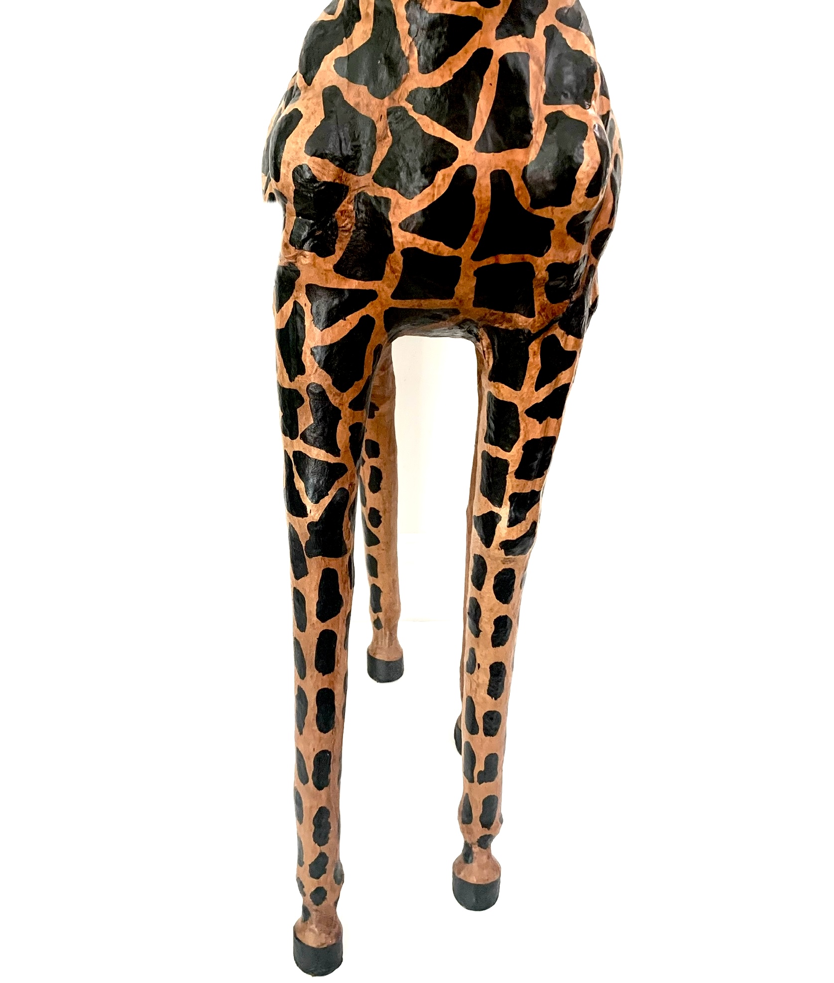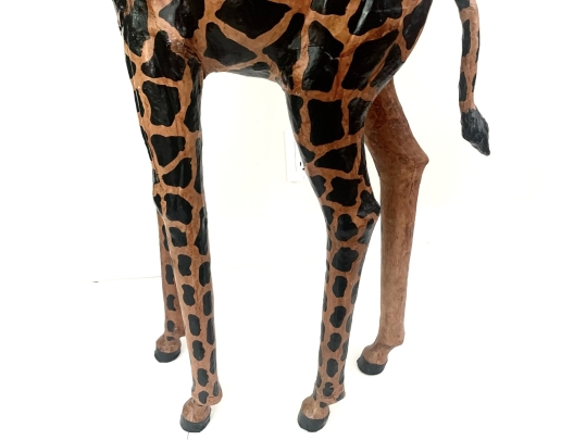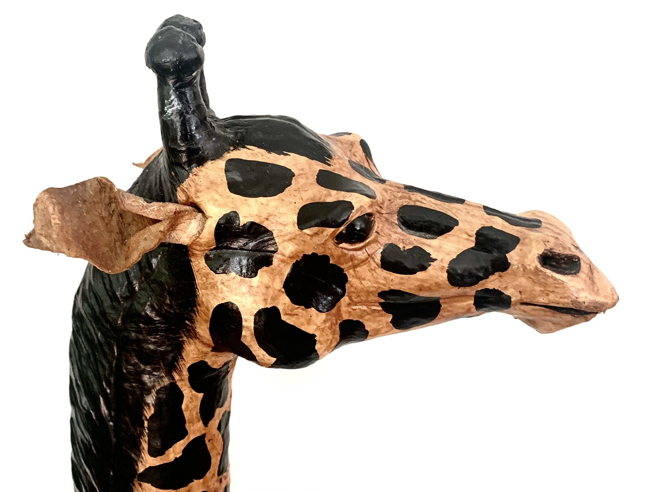 A nearly life-size baby giraffe leather wrapped sculpture with a patterned coat throughout, black carved mane, short hairy horns, elongated muzzle, black soulful eyes, long tail with tail tuft and resting upon long legs with black hoofs.