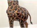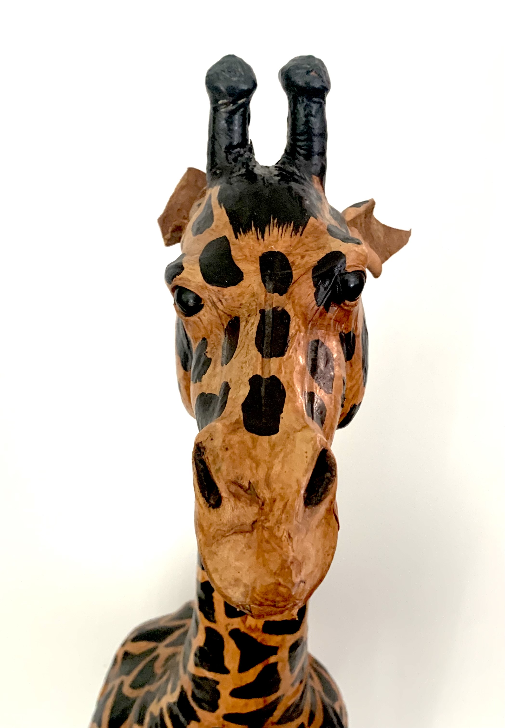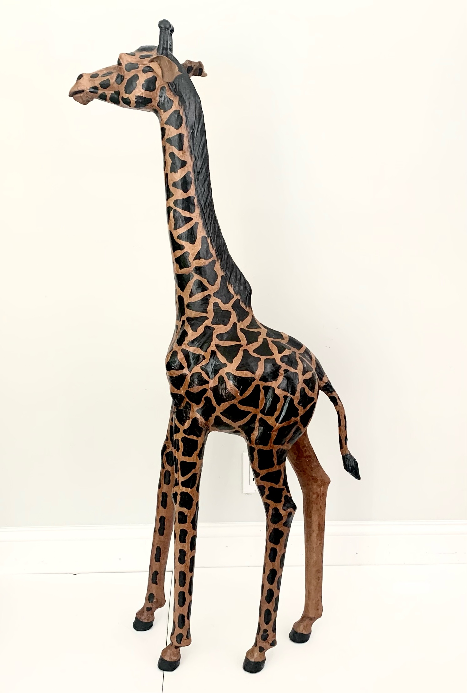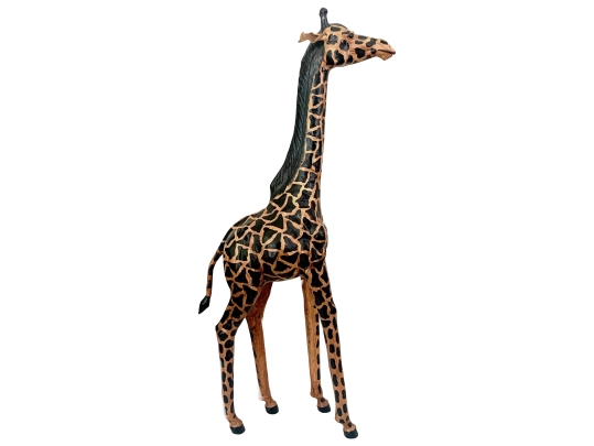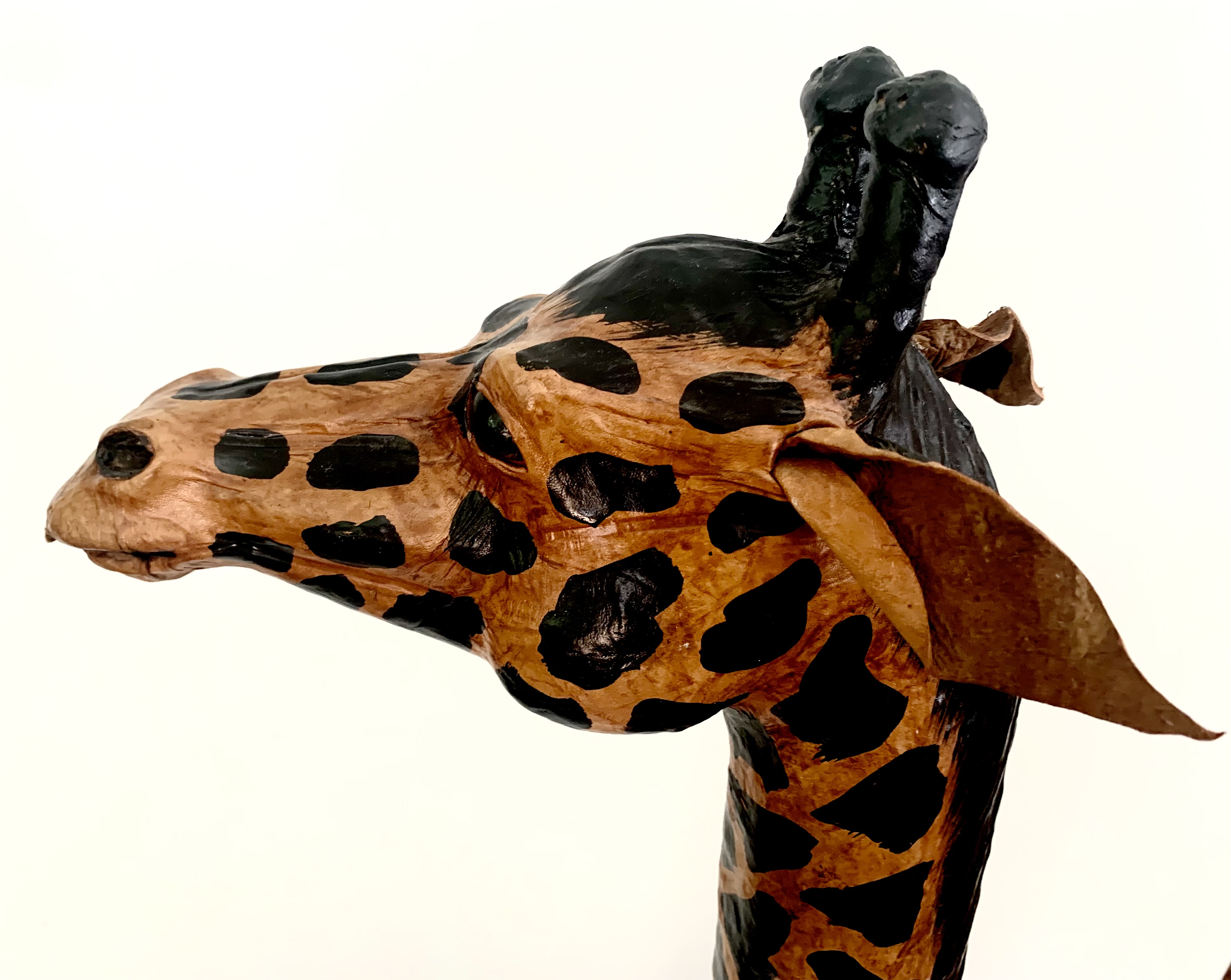 A nearly life-size baby giraffe leather wrapped sculpture with a patterned coat throughout, black carved mane, short hairy horns, elongated muzzle, black soulful eyes, long tail with tail tuft and resting upon long legs with black hoofs.
