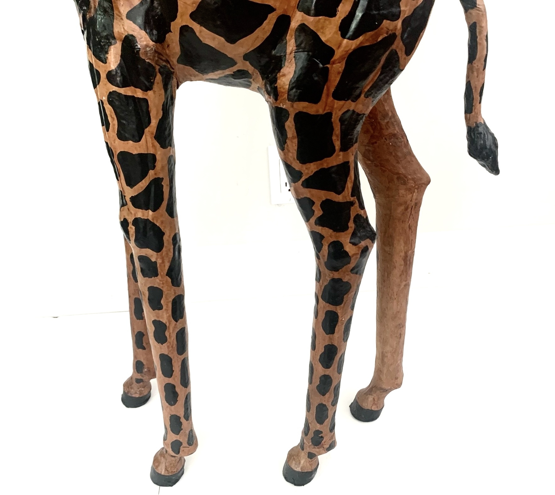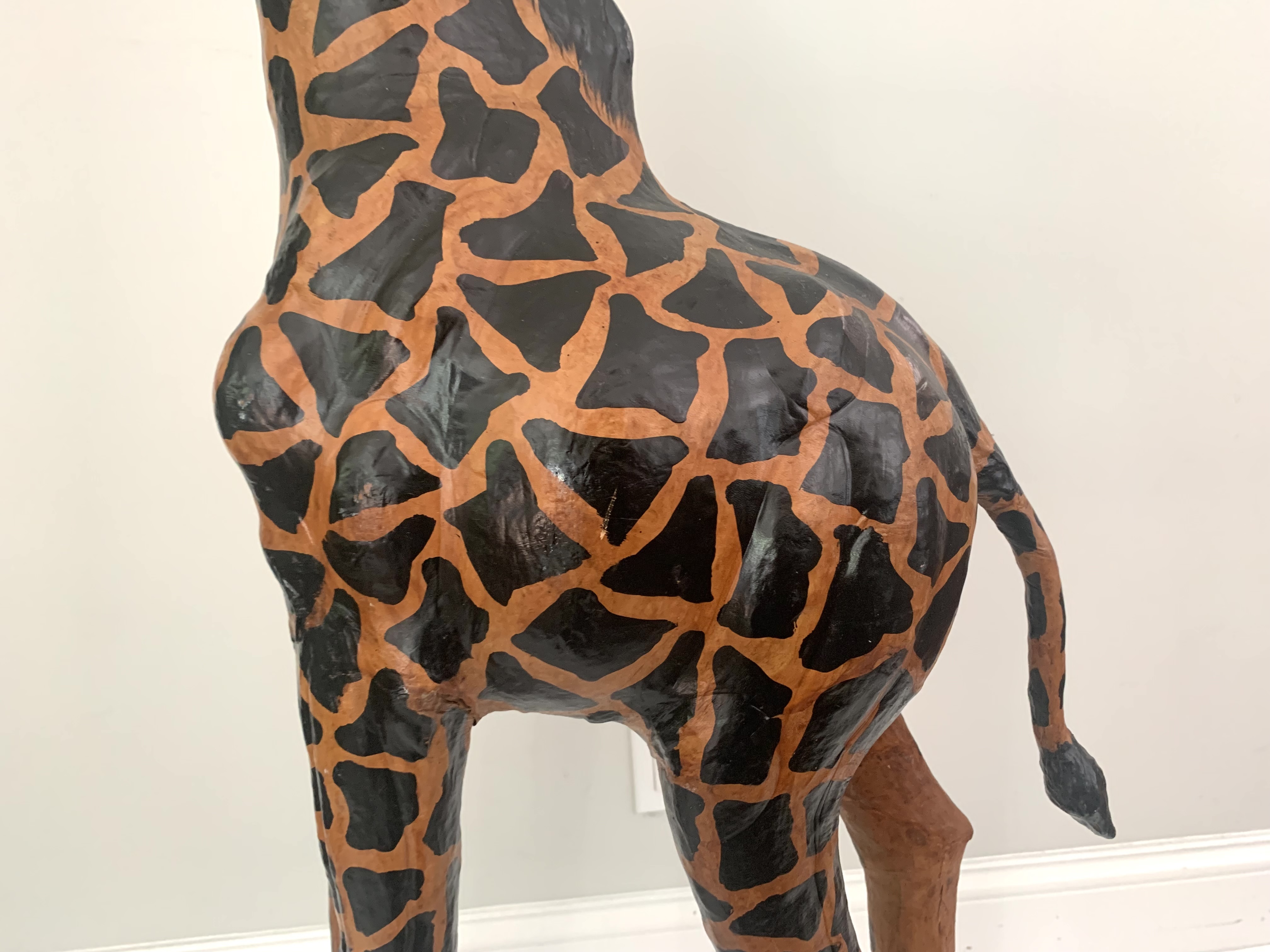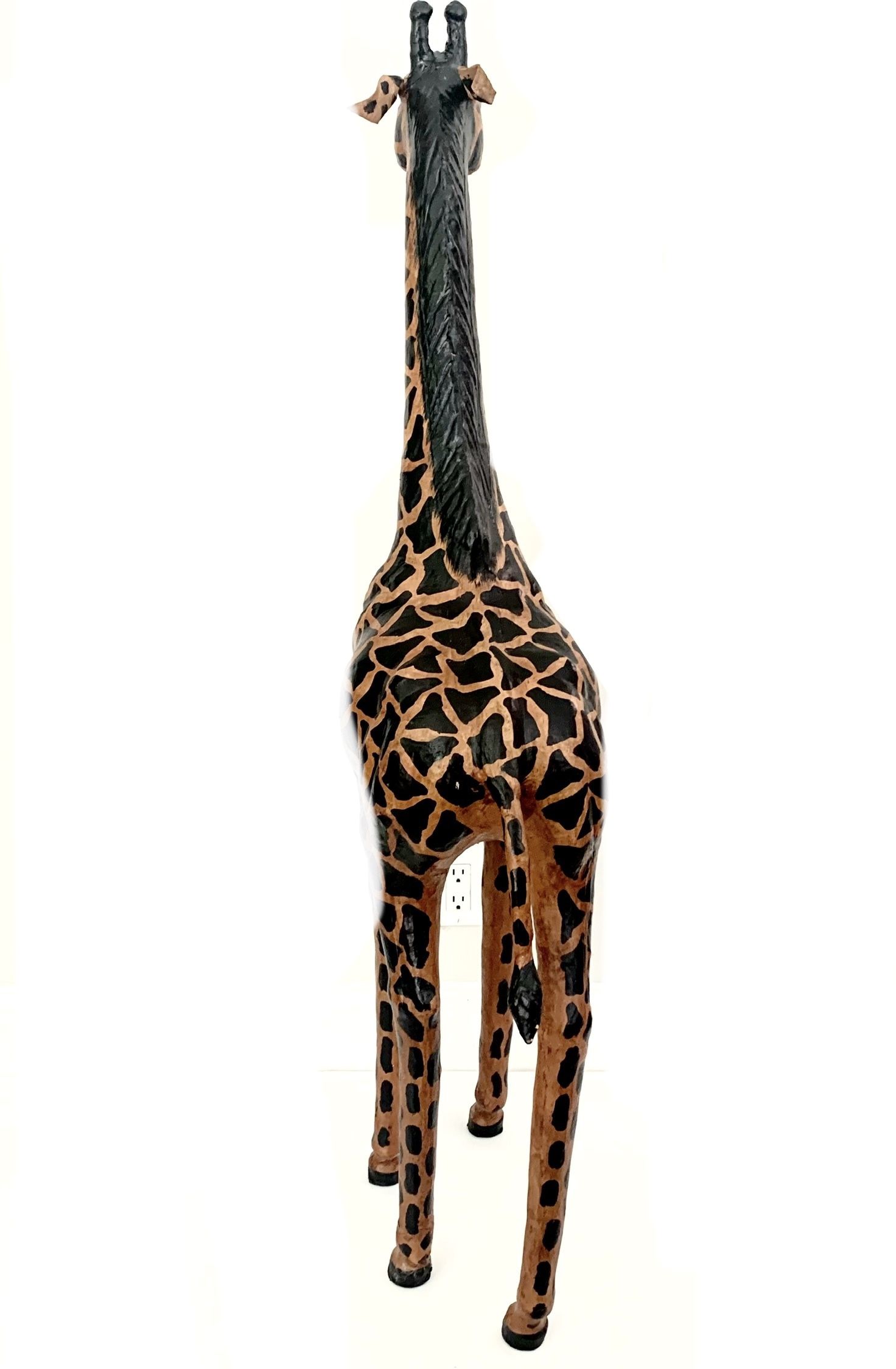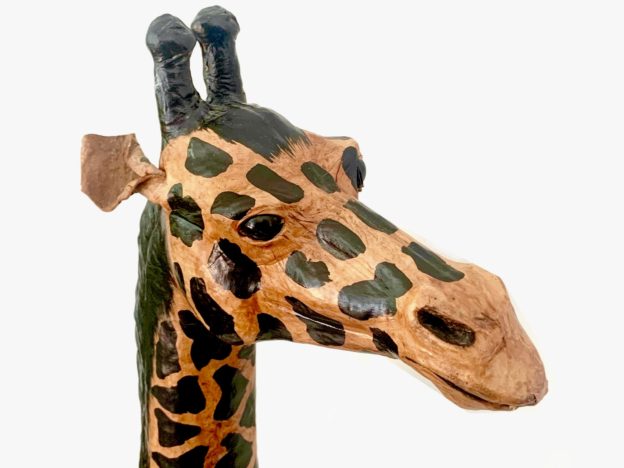 A nearly life-size baby giraffe leather wrapped sculpture with a patterned coat throughout, black carved mane, short hairy horns, elongated muzzle, black soulful eyes, long tail with tail tuft and resting upon long legs with black hoofs.