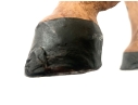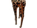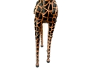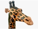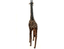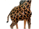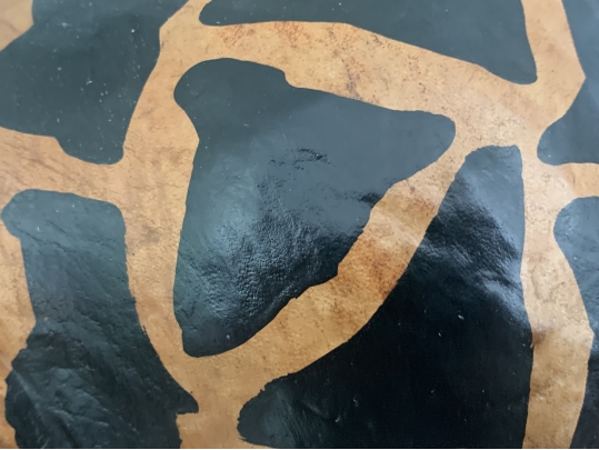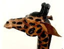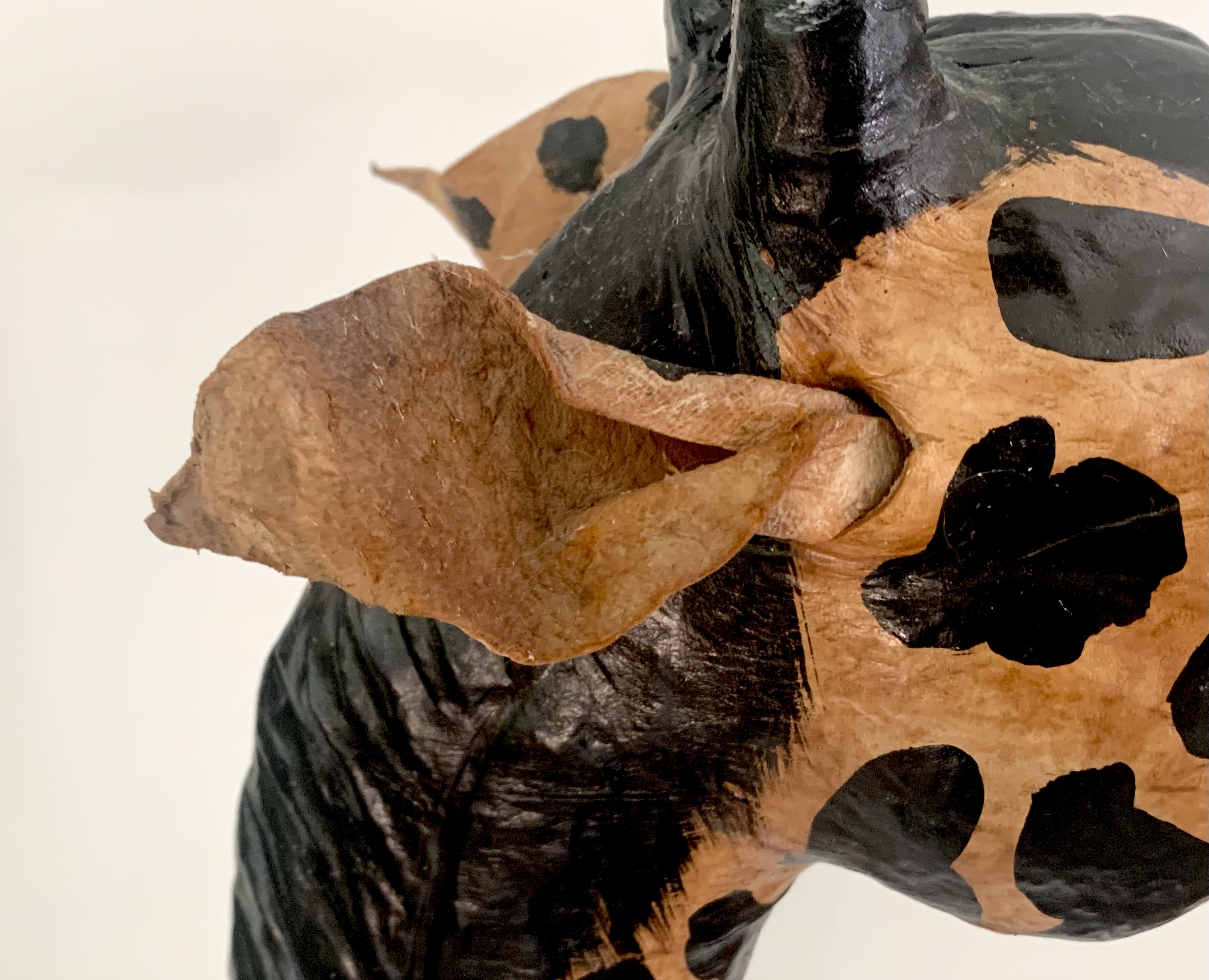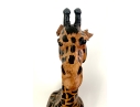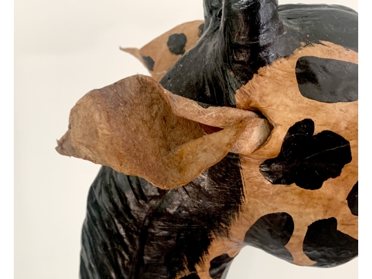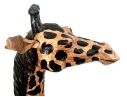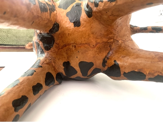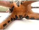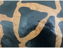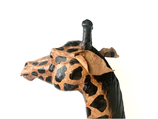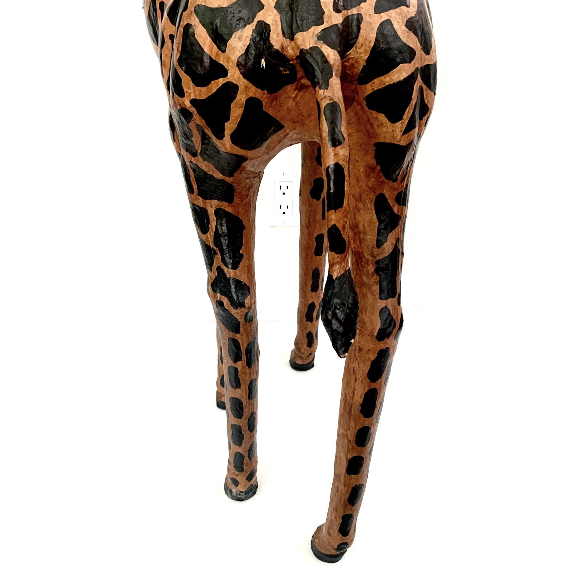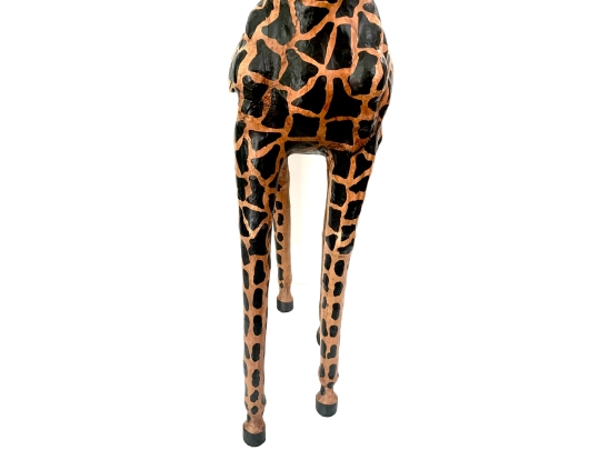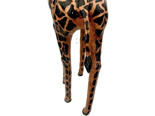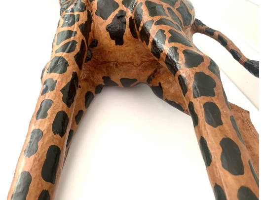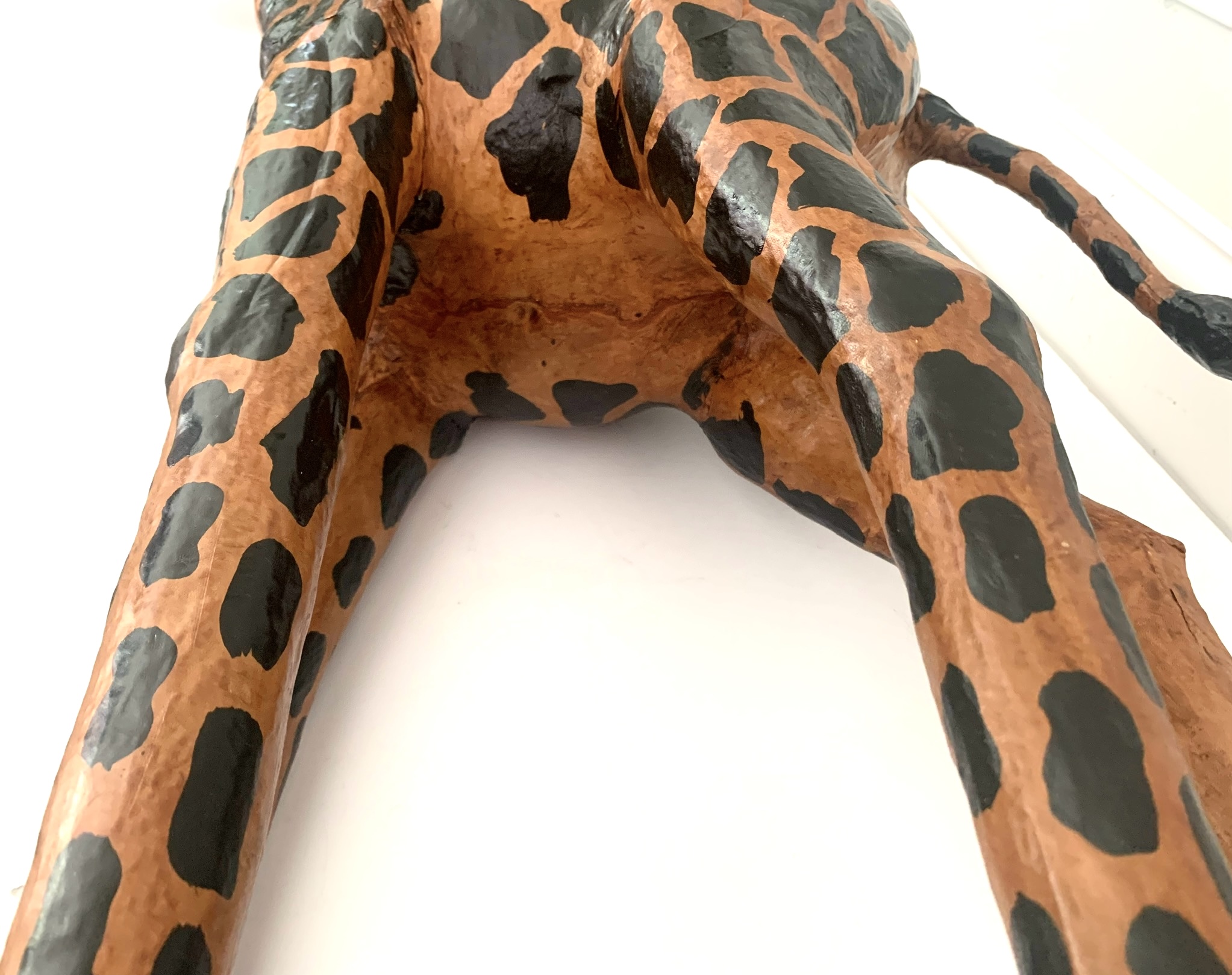A nearly life-size baby giraffe leather wrapped sculpture with a patterned coat throughout, black carved mane, short hairy horns, elongated muzzle, black soulful eyes, long tail with tail tuft and resting upon long legs with black hoofs.