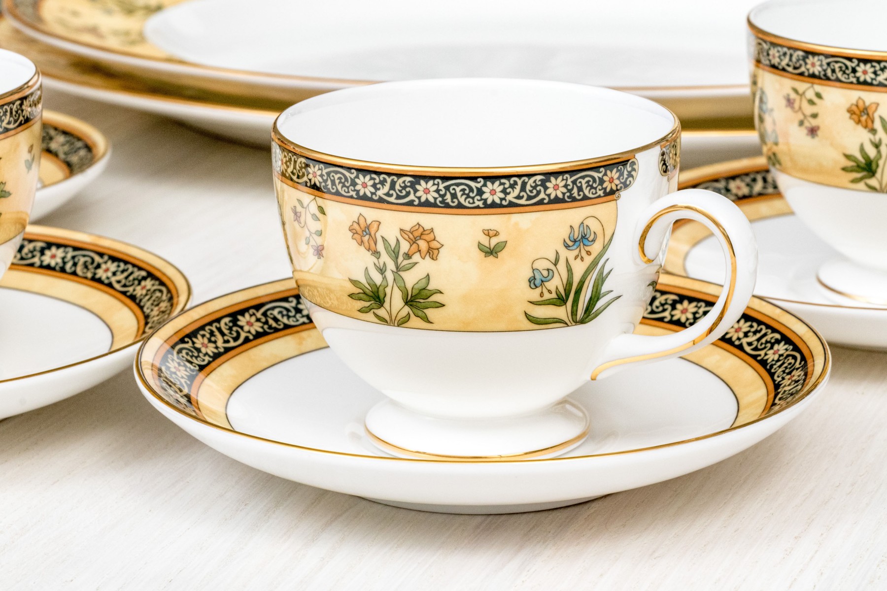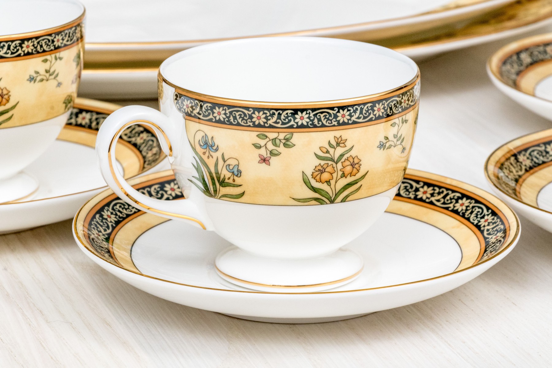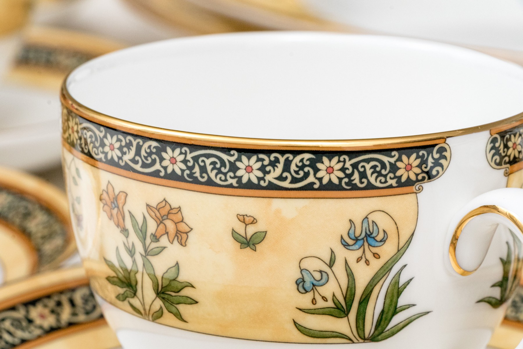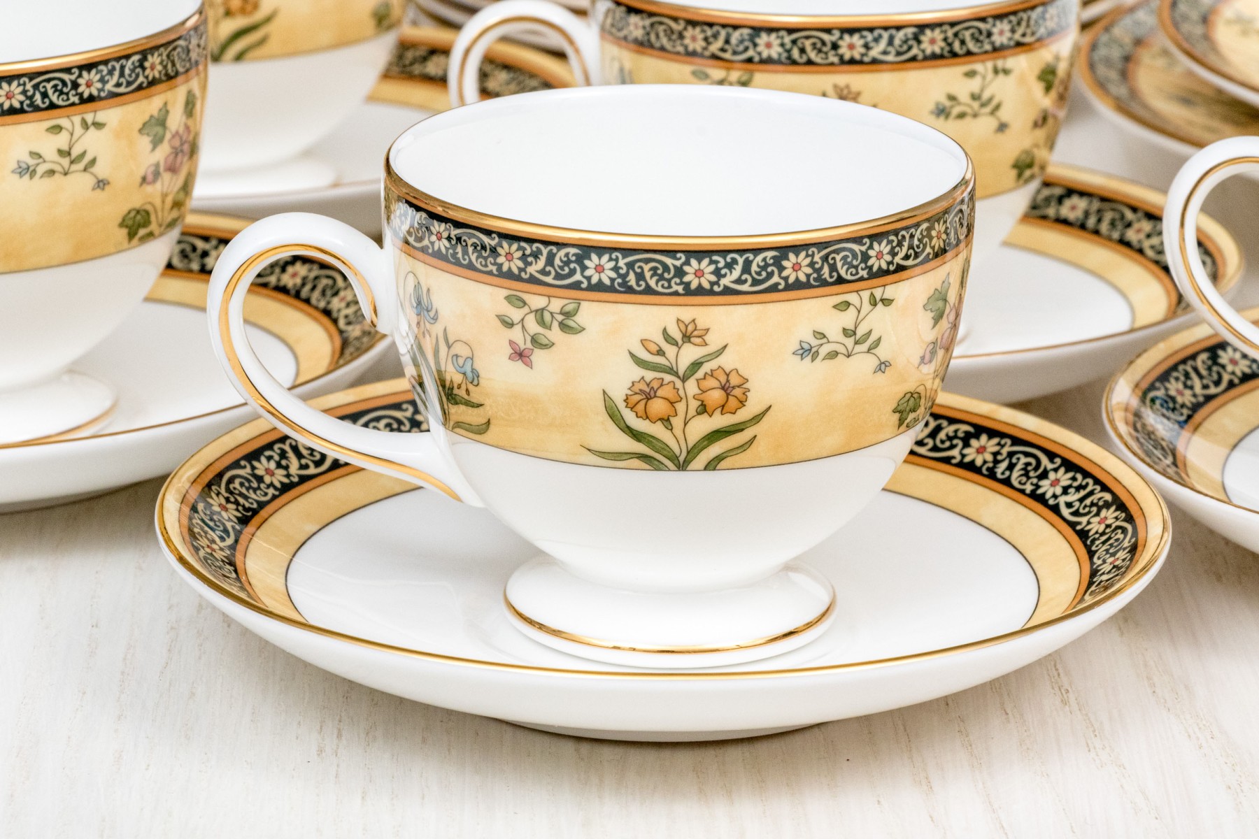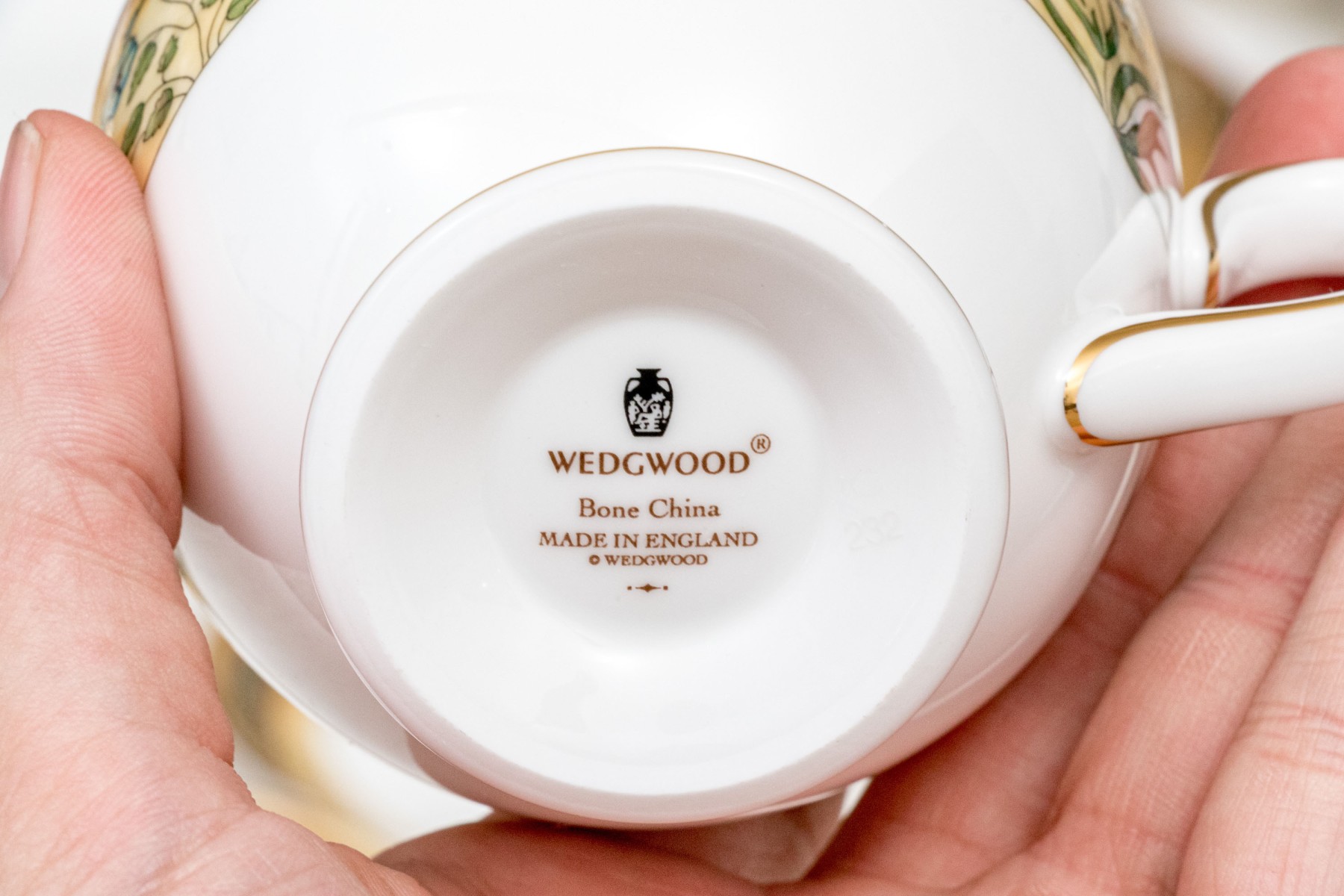 Attractive Wedgwood "India", white, fine bone china with gold trim detail and floral motif.