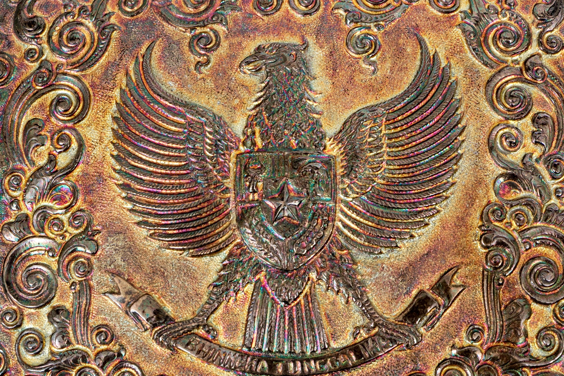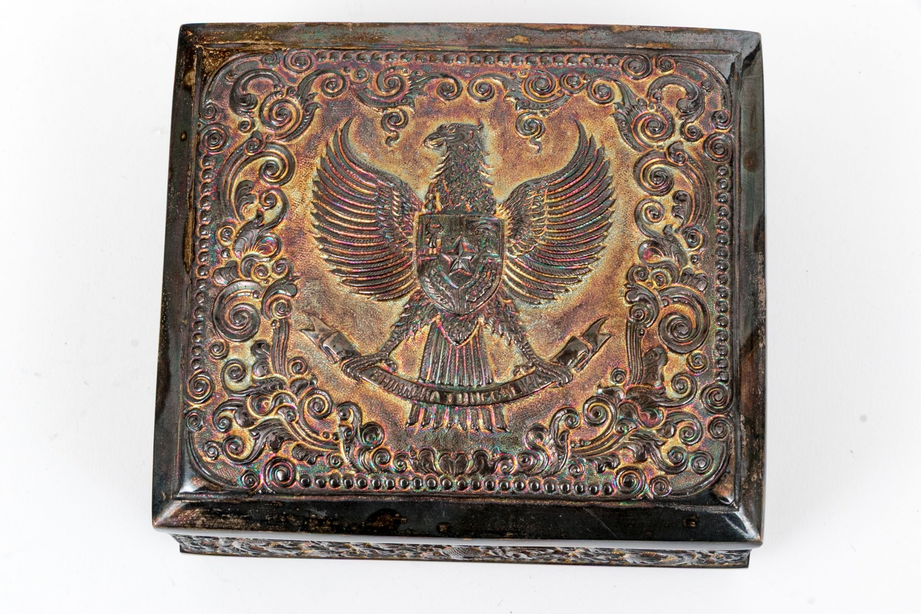 Square form with hinged lid. Marked underfoot. Top with Eagle with shield decoration.