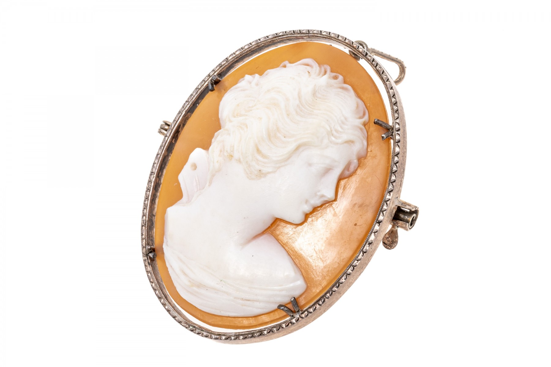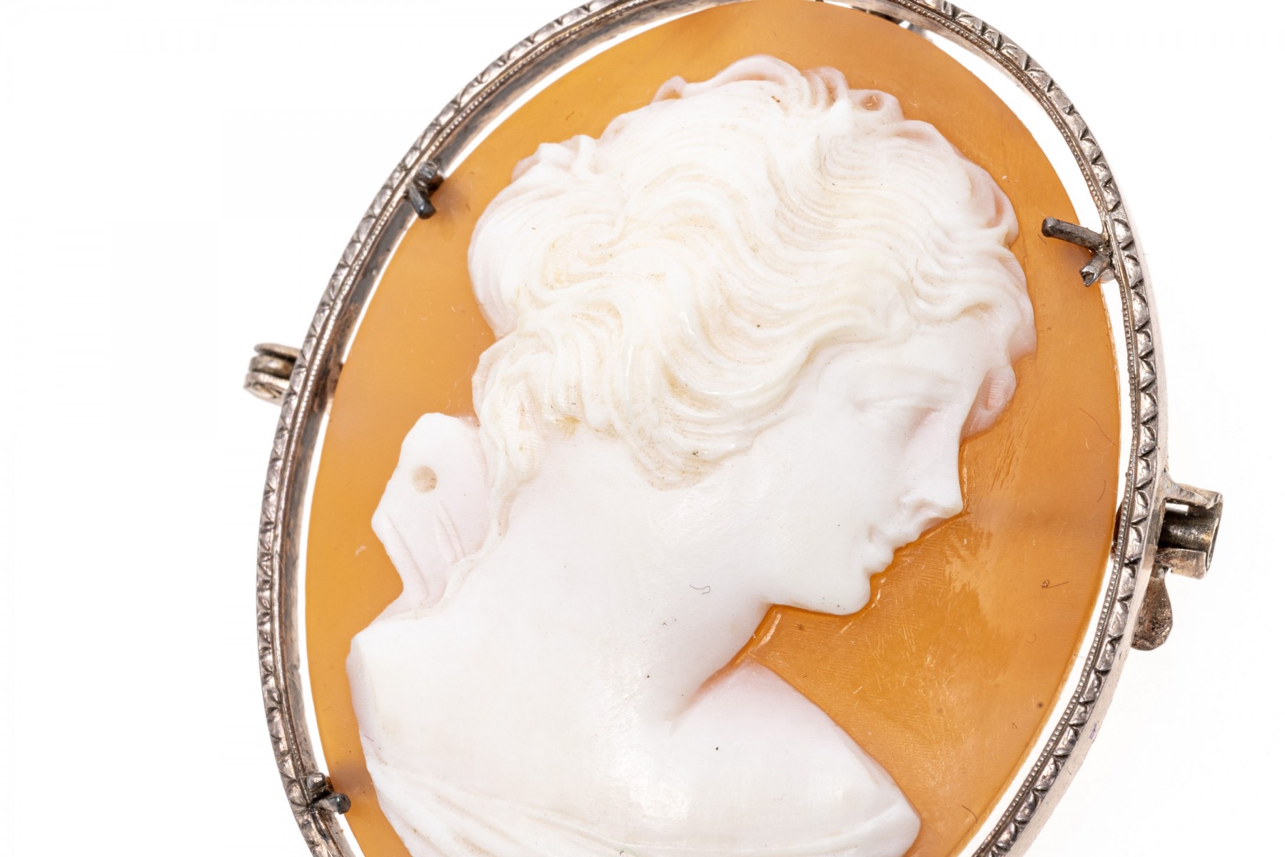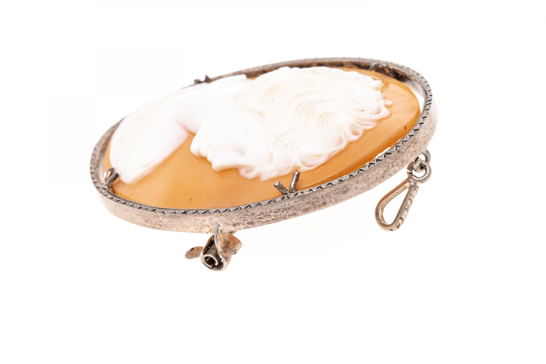 800 silver cameo. This lovely shell cameo features a beautiful right facing silhouette, and is set in a silver frame, decorated with a simple embellishment. The pin also has a hinged bale so it can be worn as a pendant.