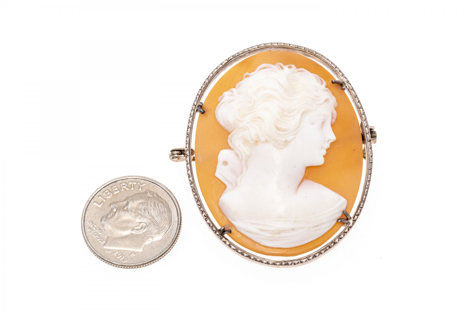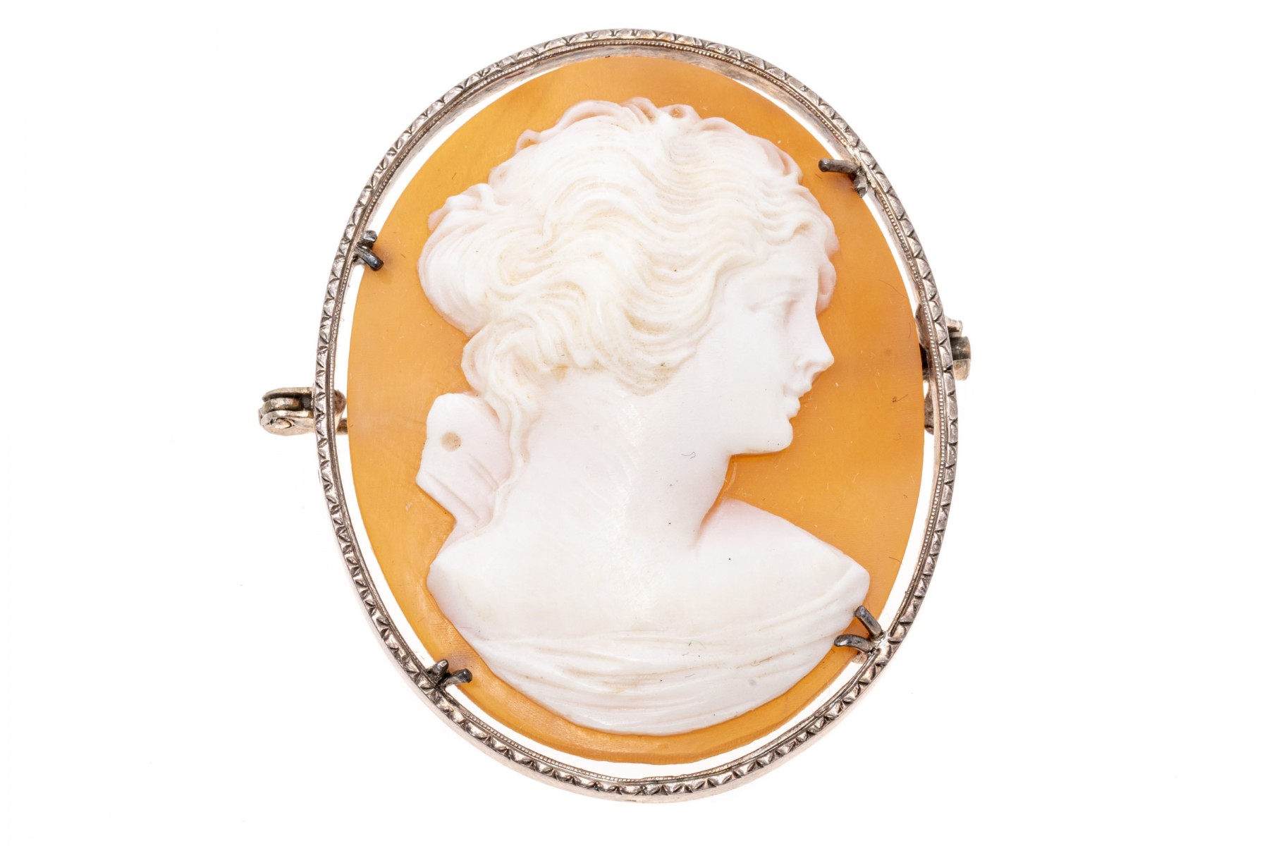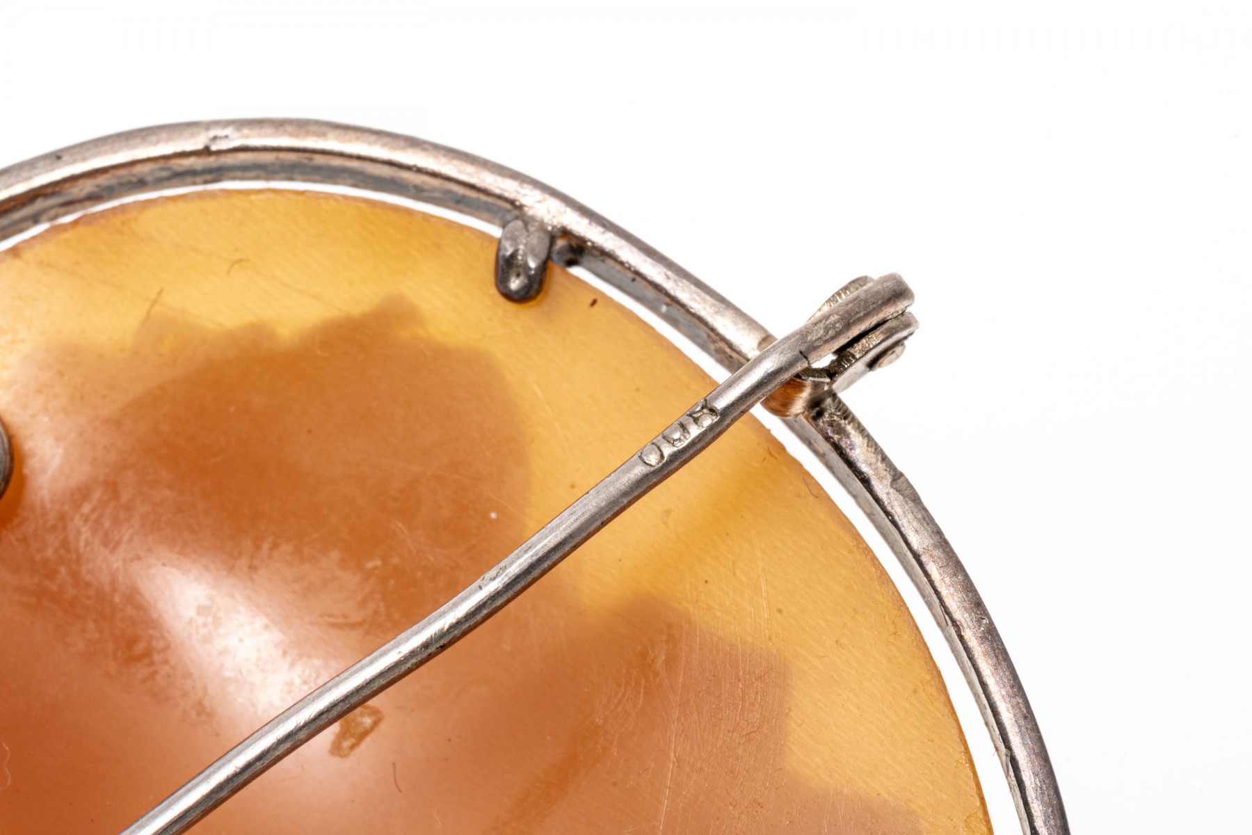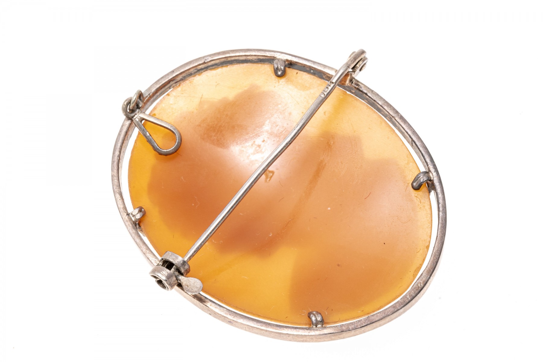 800 silver cameo. This lovely shell cameo features a beautiful right facing silhouette, and is set in a silver frame, decorated with a simple embellishment. The pin also has a hinged bale so it can be worn as a pendant.