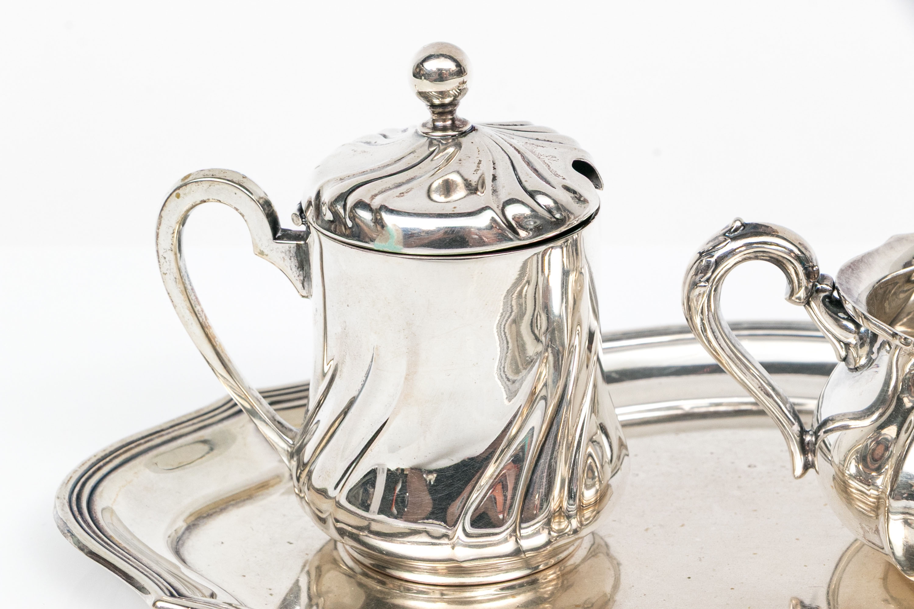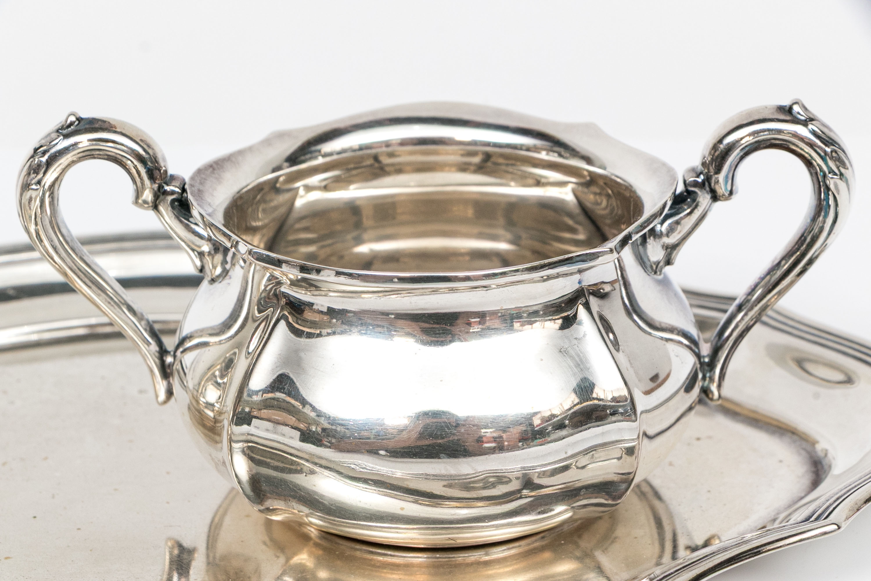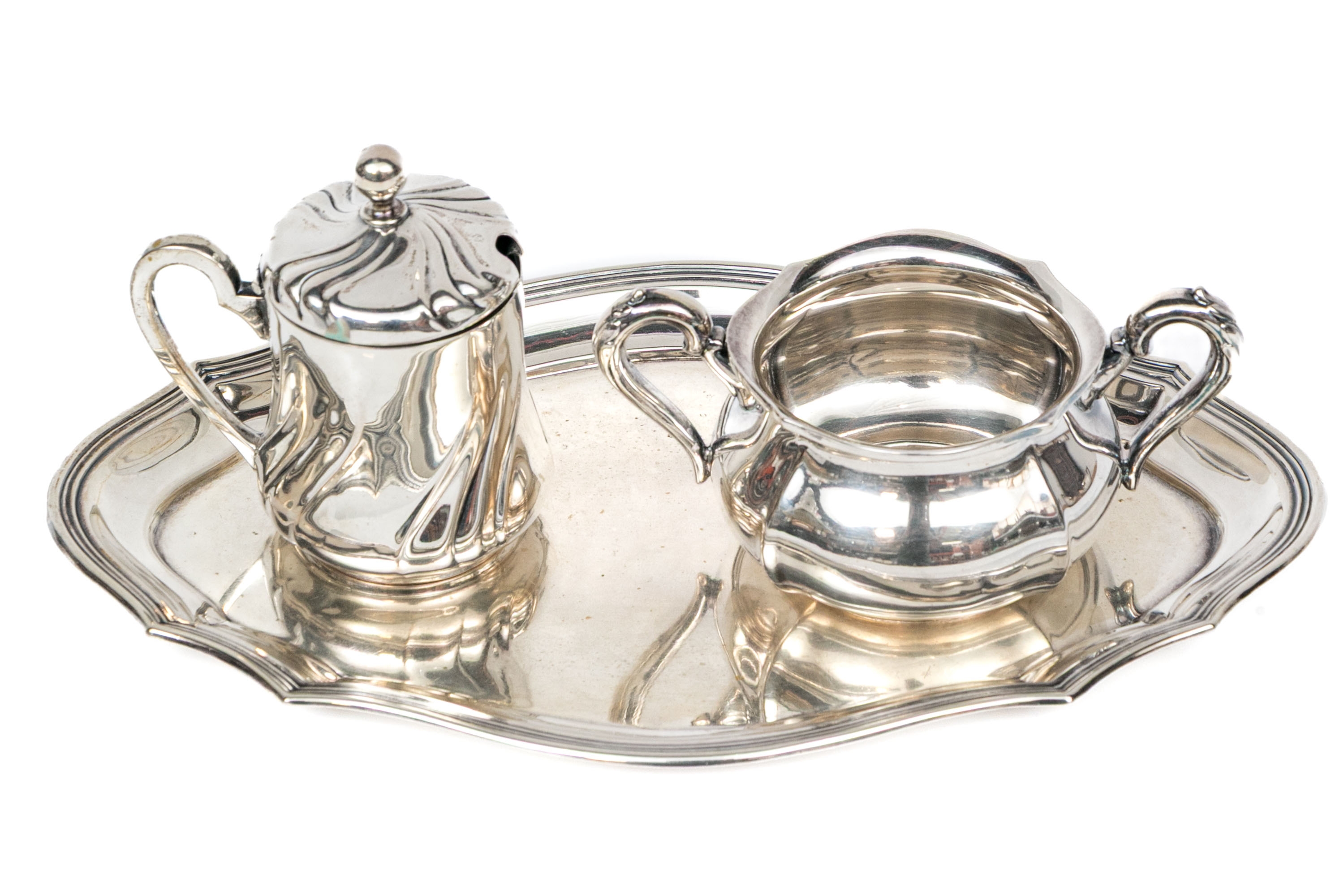 Including an oval serpentine tray with ribbed edge along with a compatible lobed open twin handled sugar bowl and a lidded swirled condiment jar with handle.