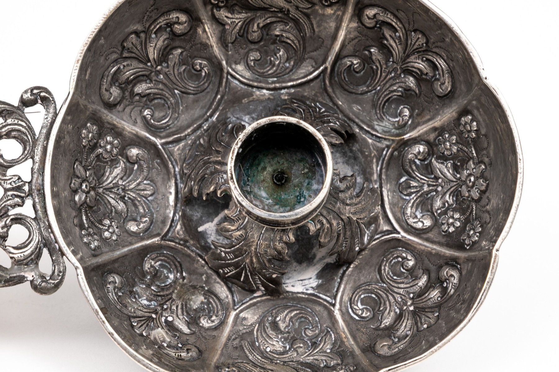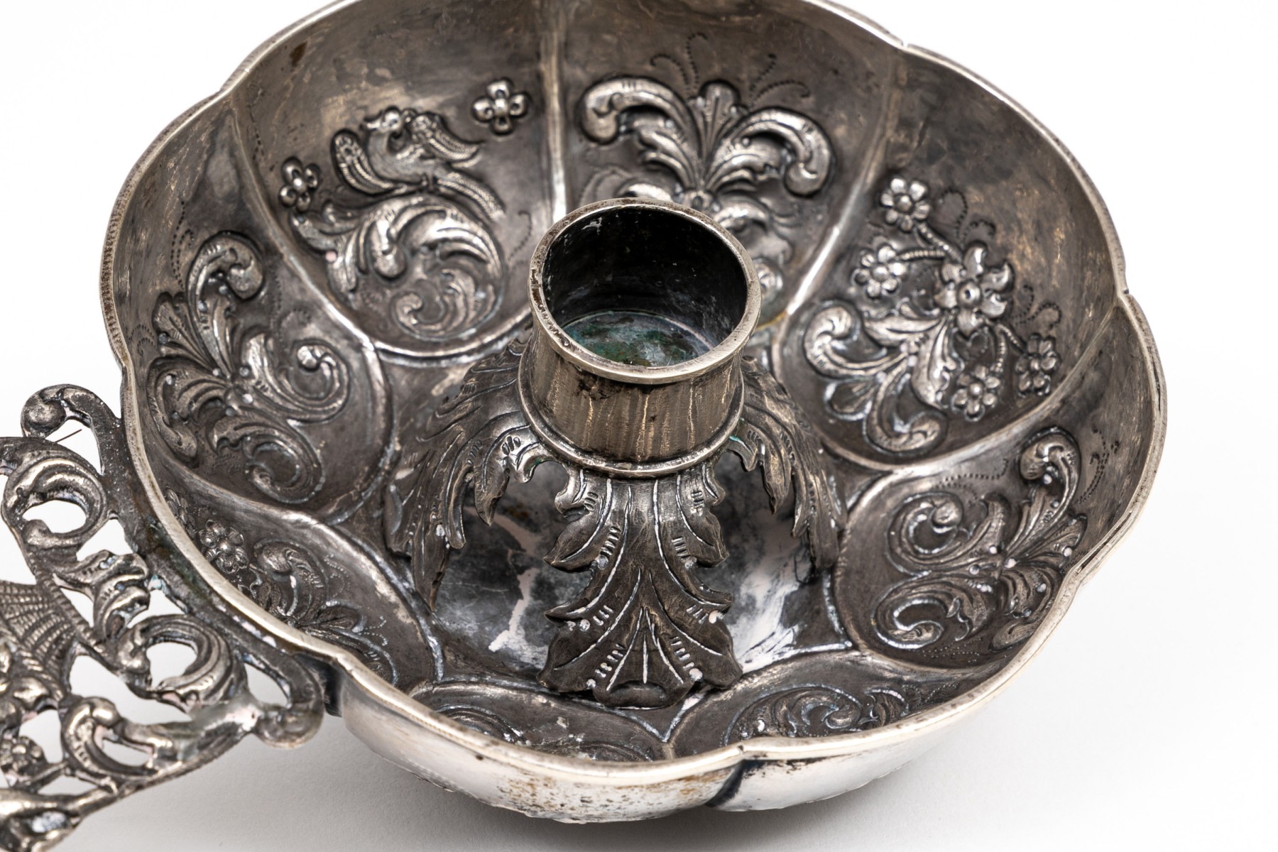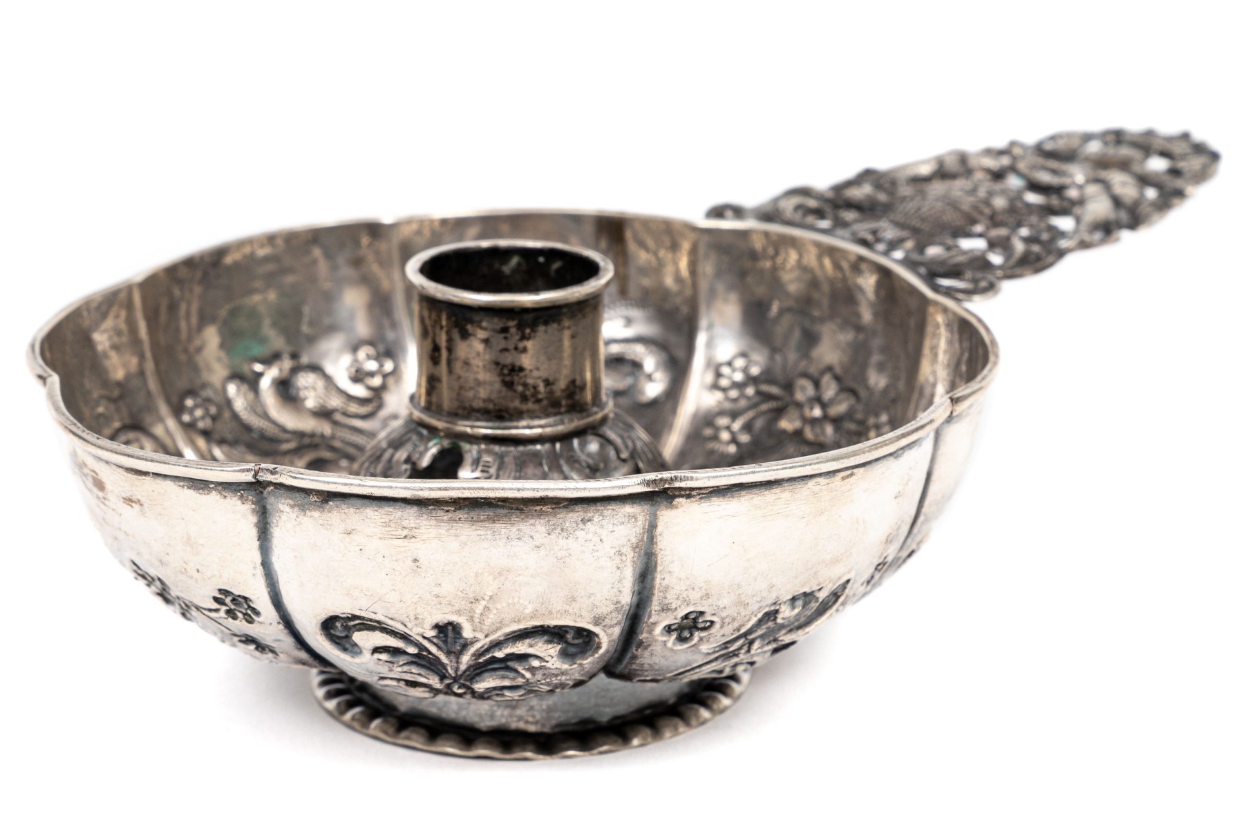 .835 silver Dutch antique repousse bowl, Amsterdam, with a later addition candlestick center and cast ornate handle