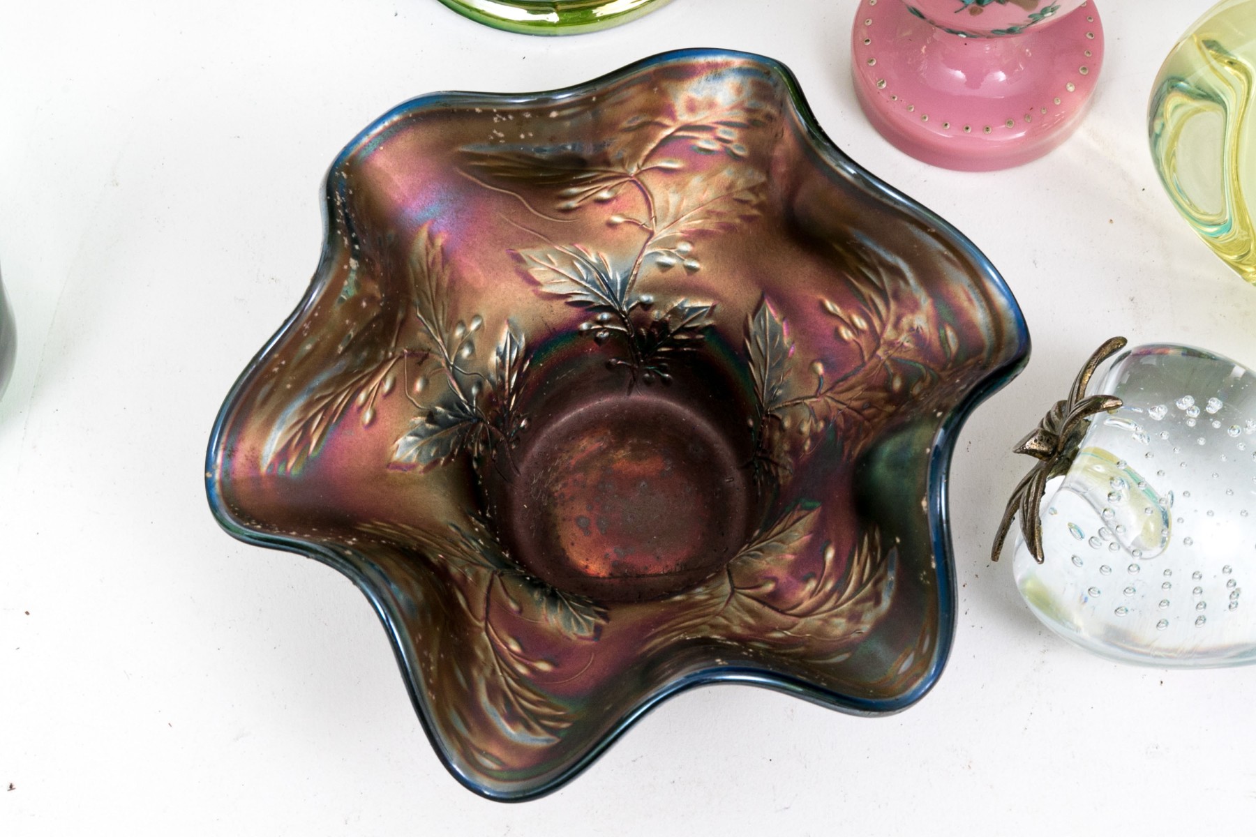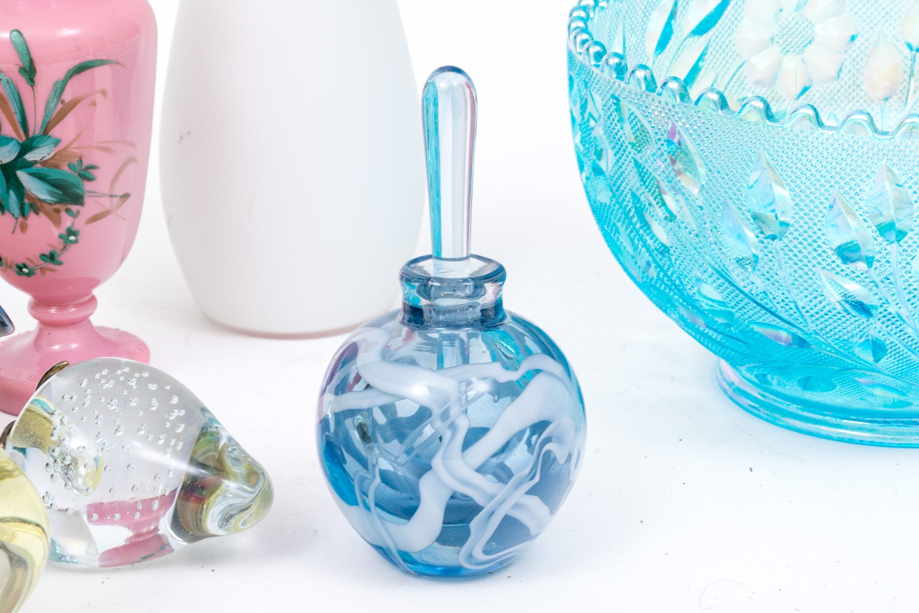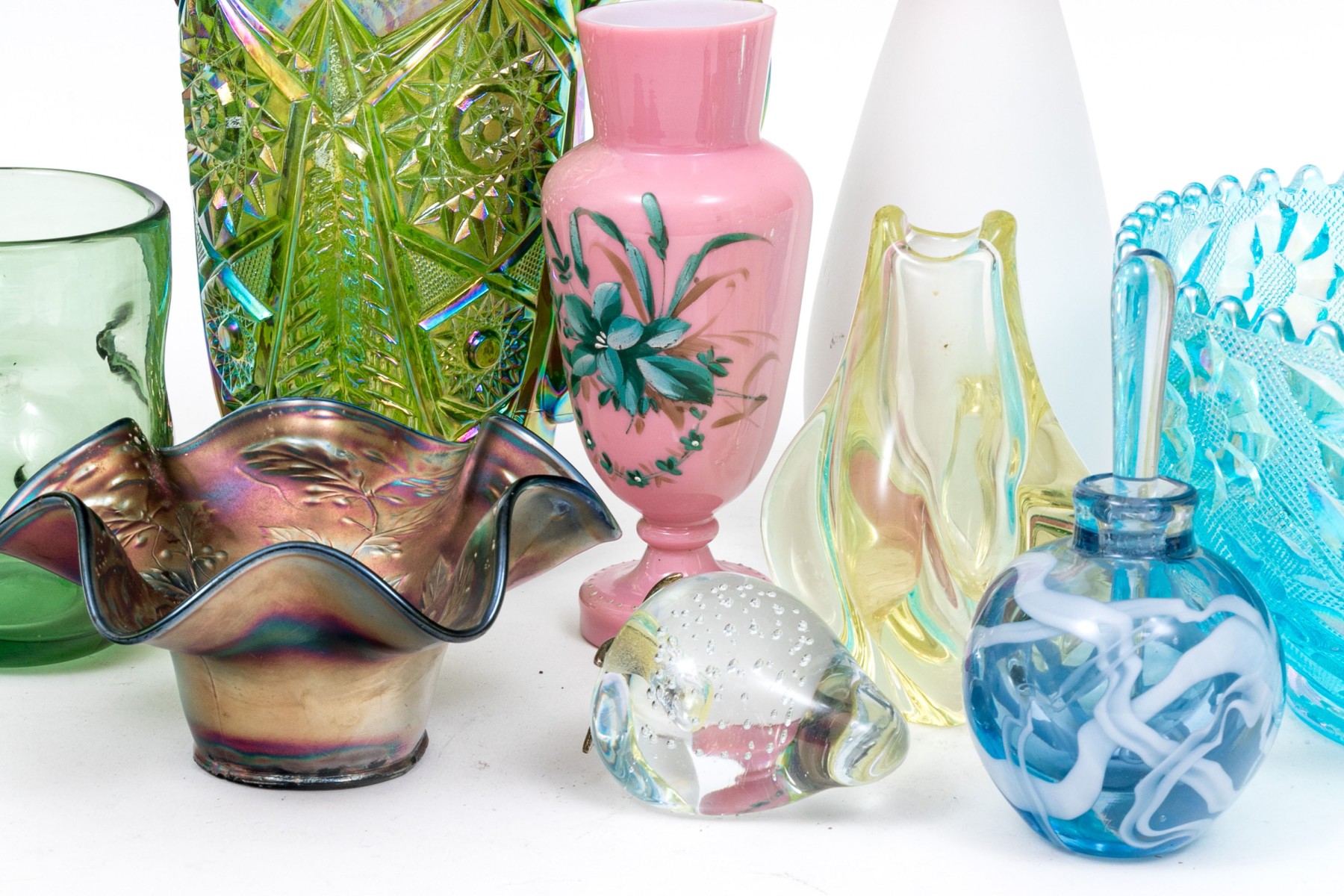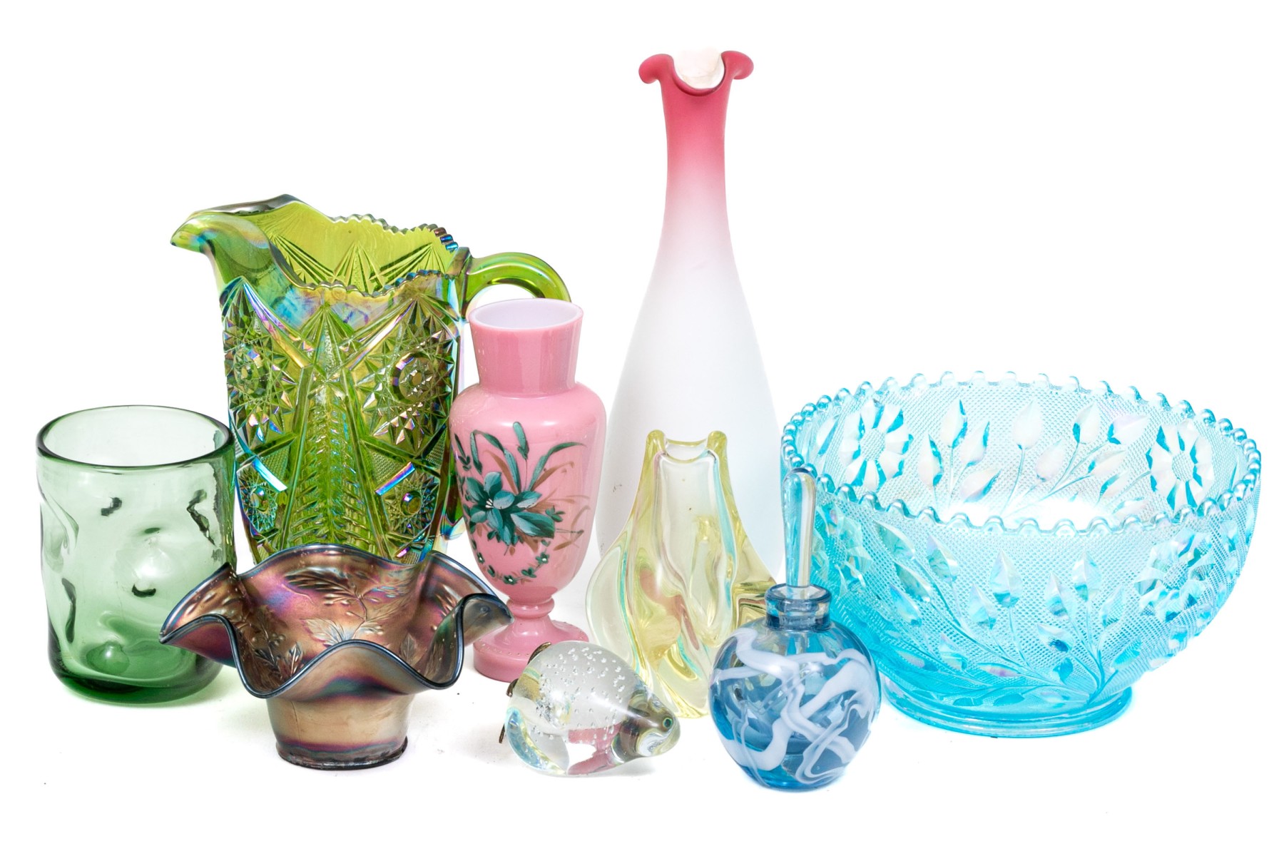 Comprised of a center bowl, three vases, two water pitchers, a glass, a small scalloped bowl, and a paperweight. Carnival glass and art glass.