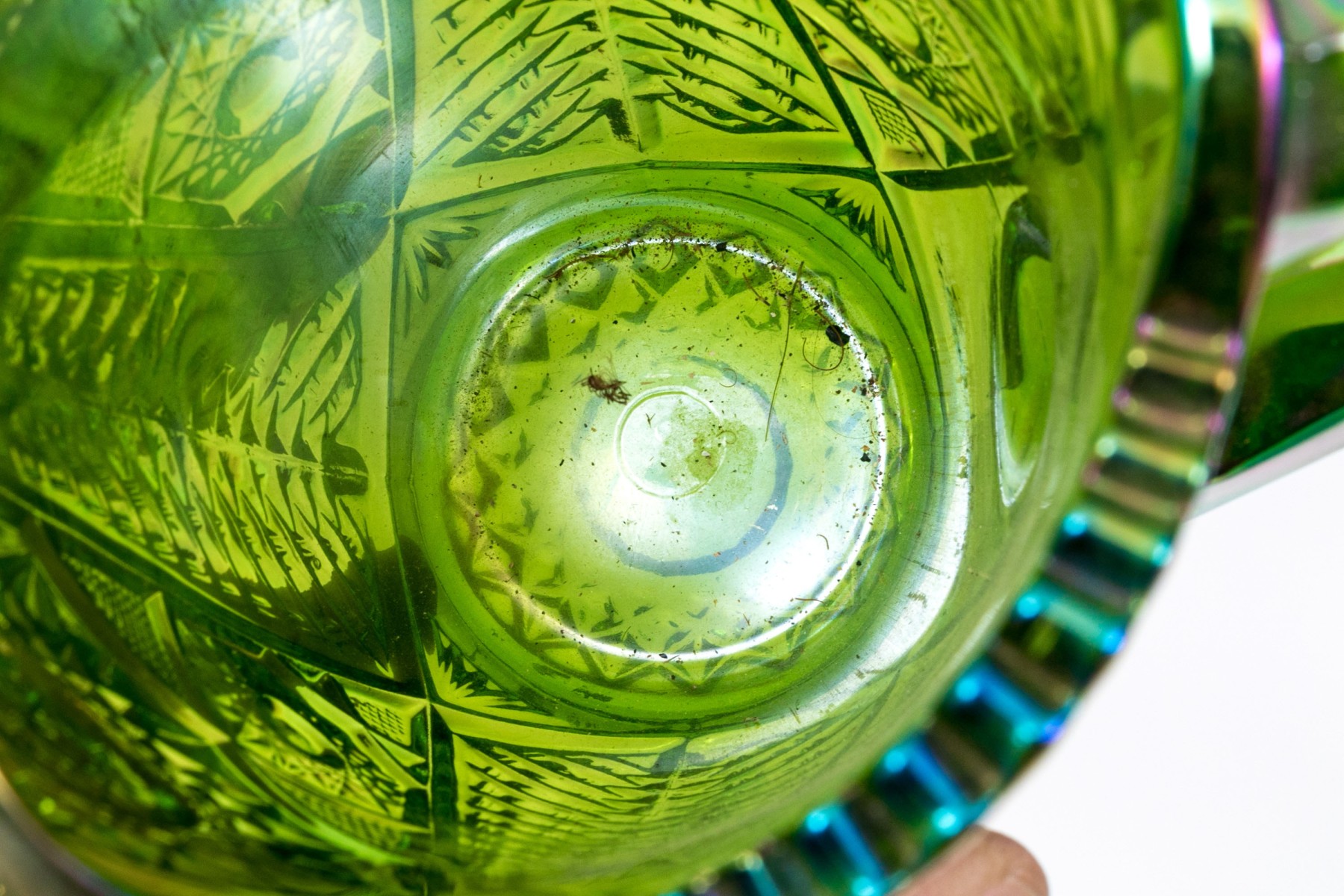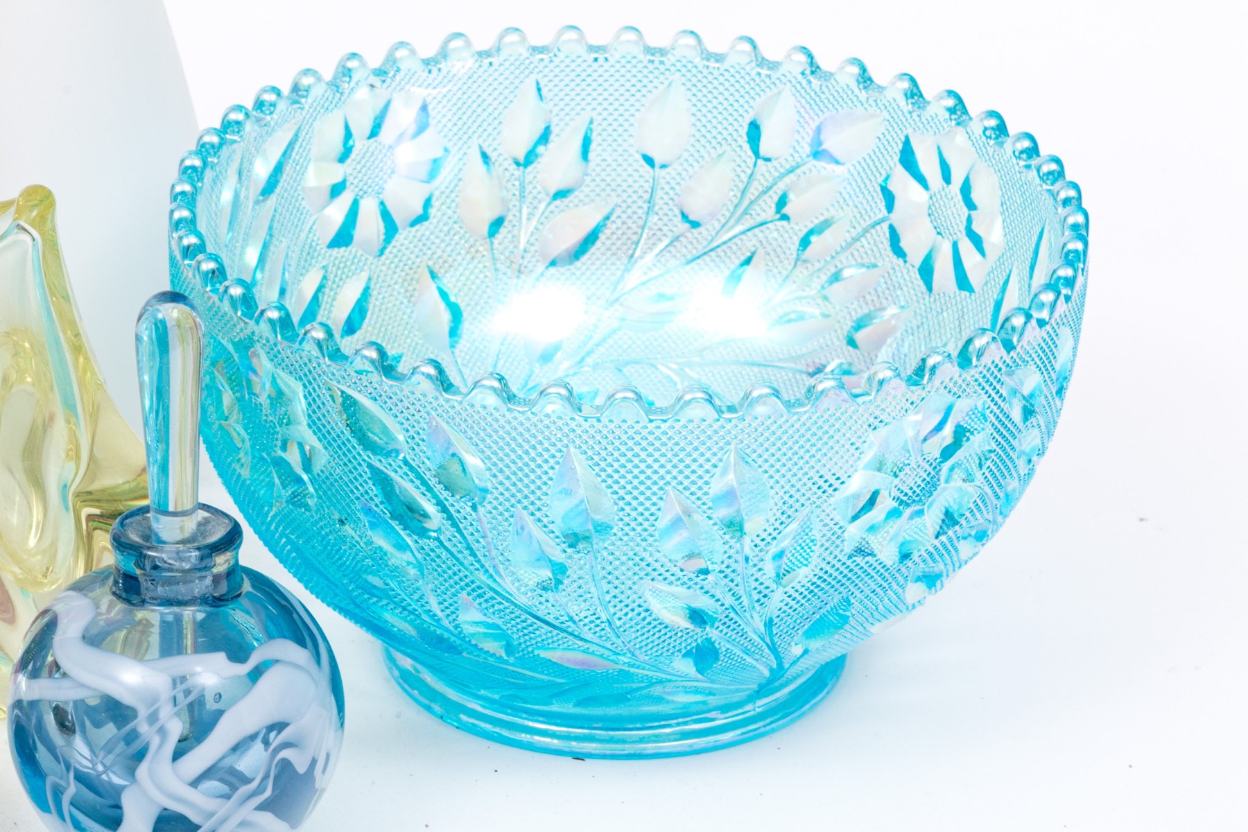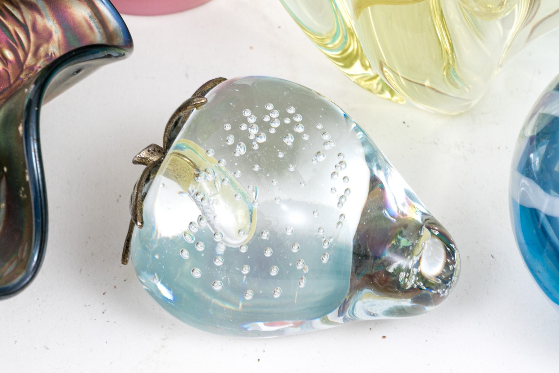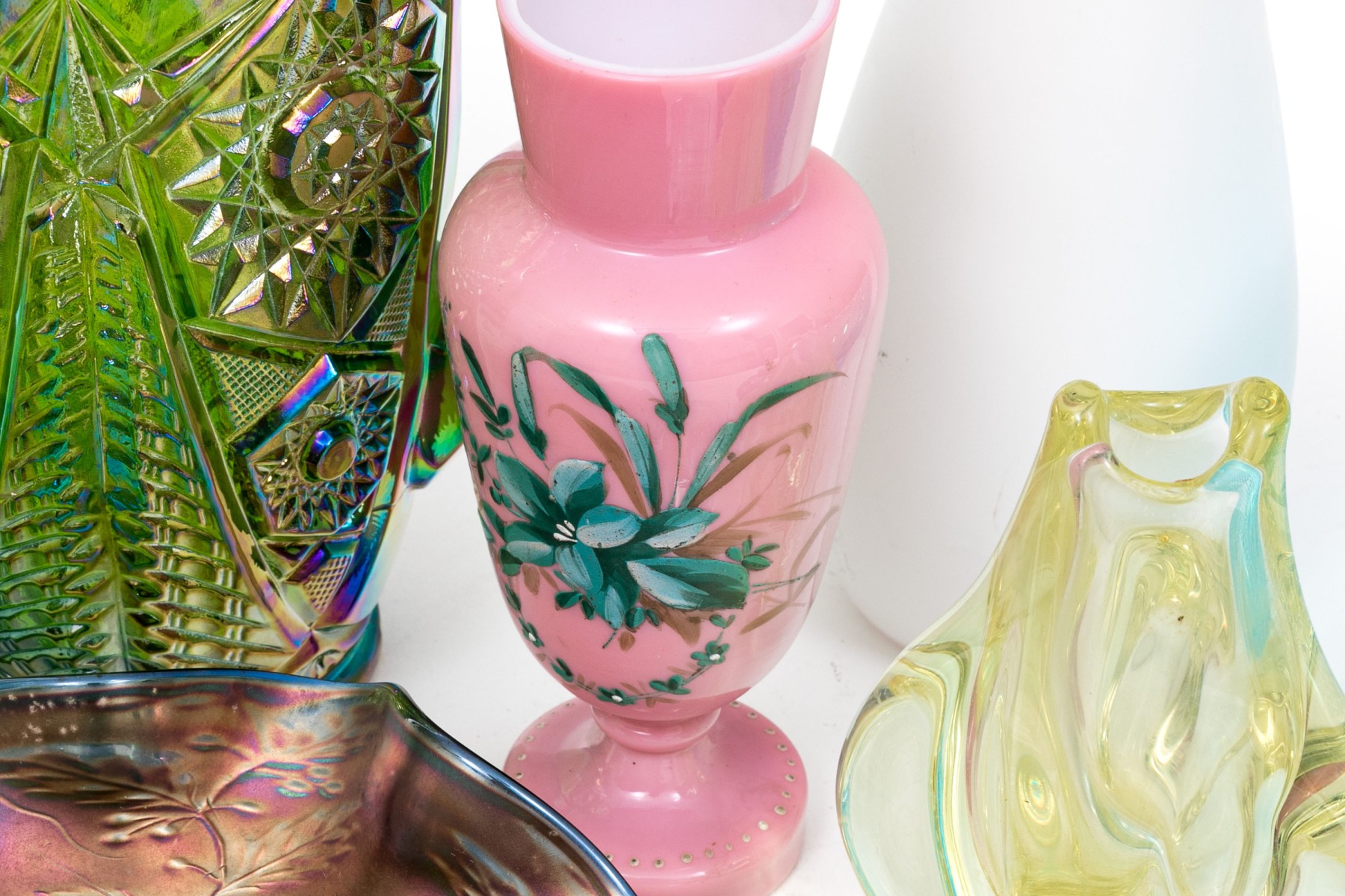 Comprised of a center bowl, three vases, two water pitchers, a glass, a small scalloped bowl, and a paperweight. Carnival glass and art glass.