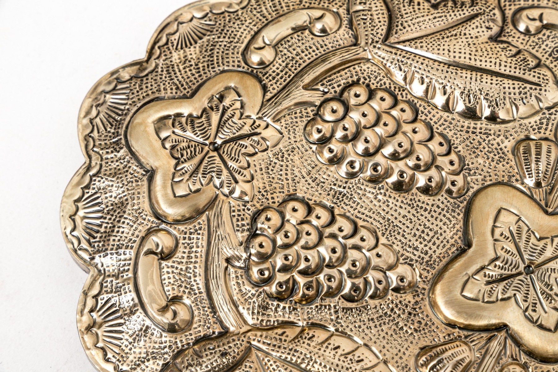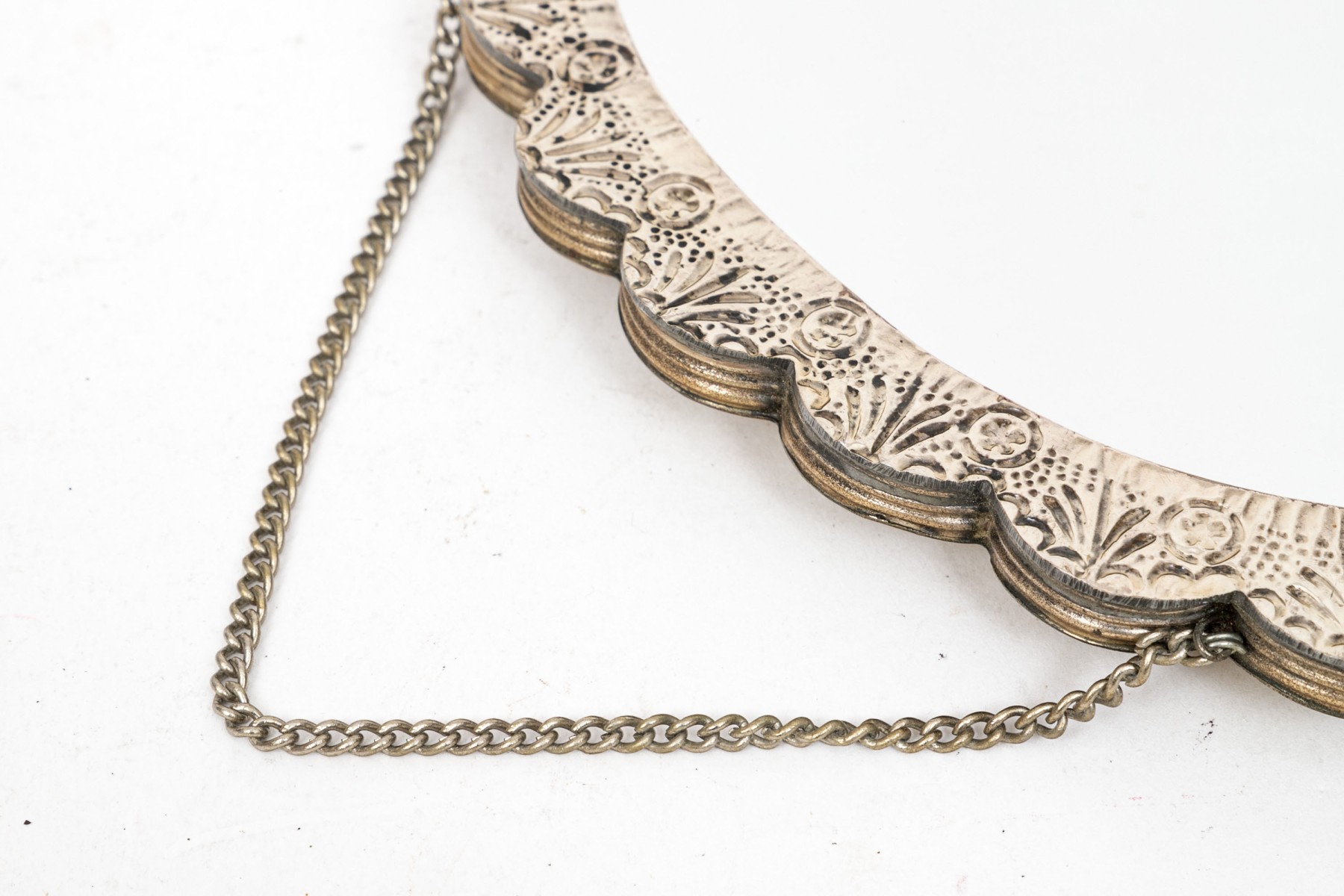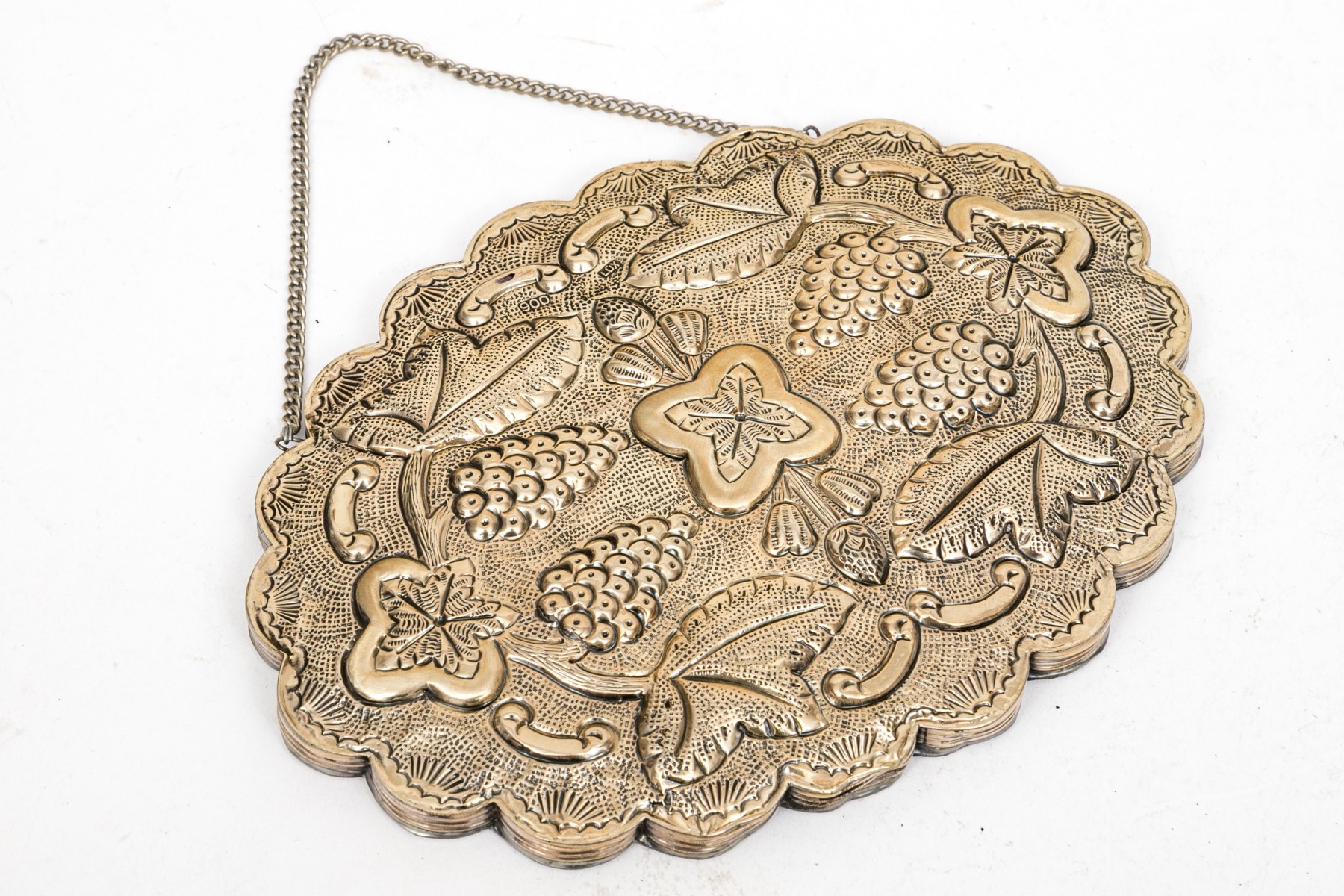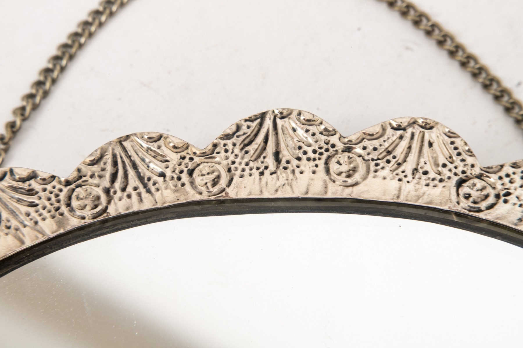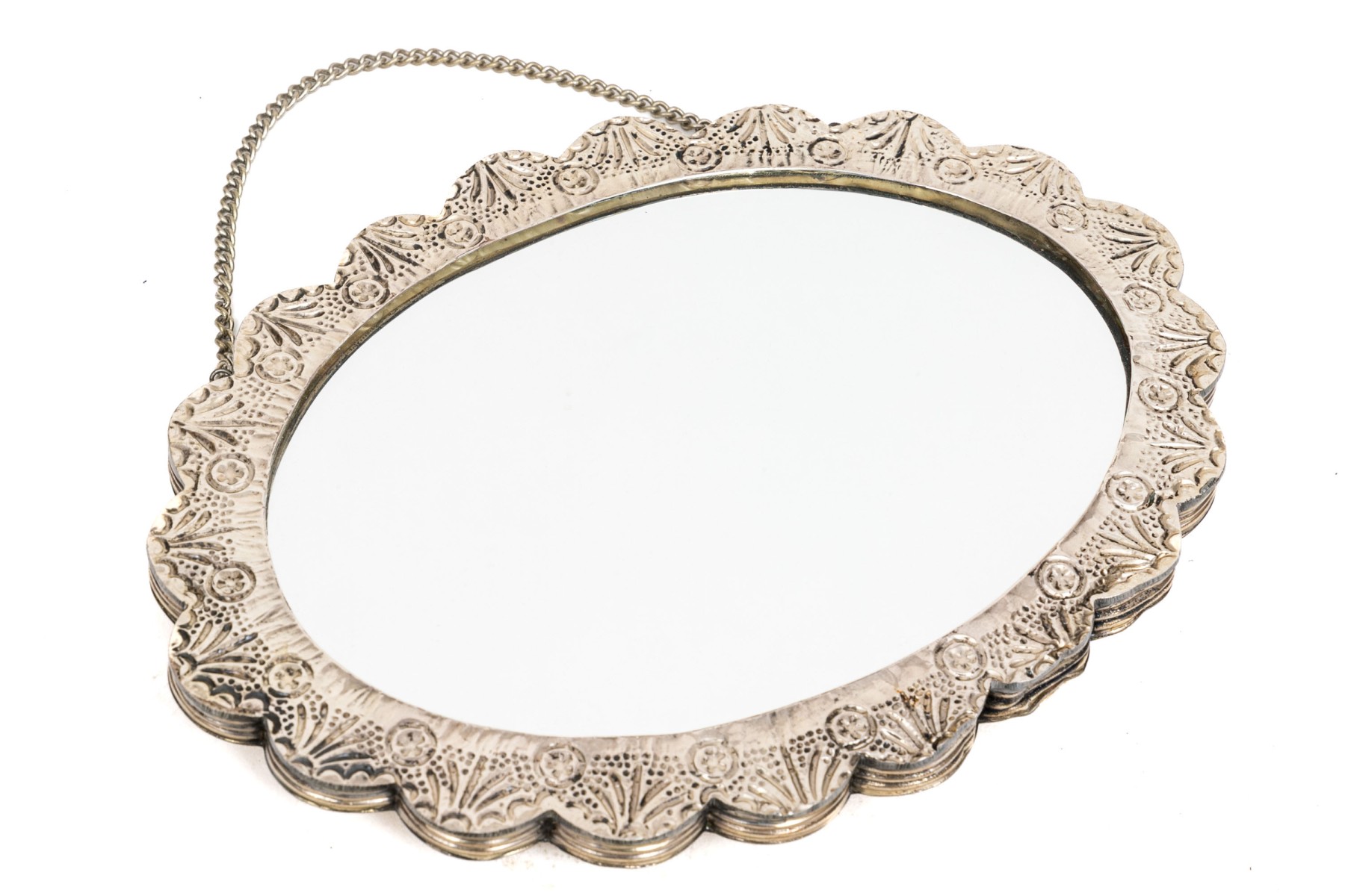 A fantastic 900 silver Turkish wedding mirror. The back of the mirror has an ornate design of grape clusters and leaves. Scalloped edges.