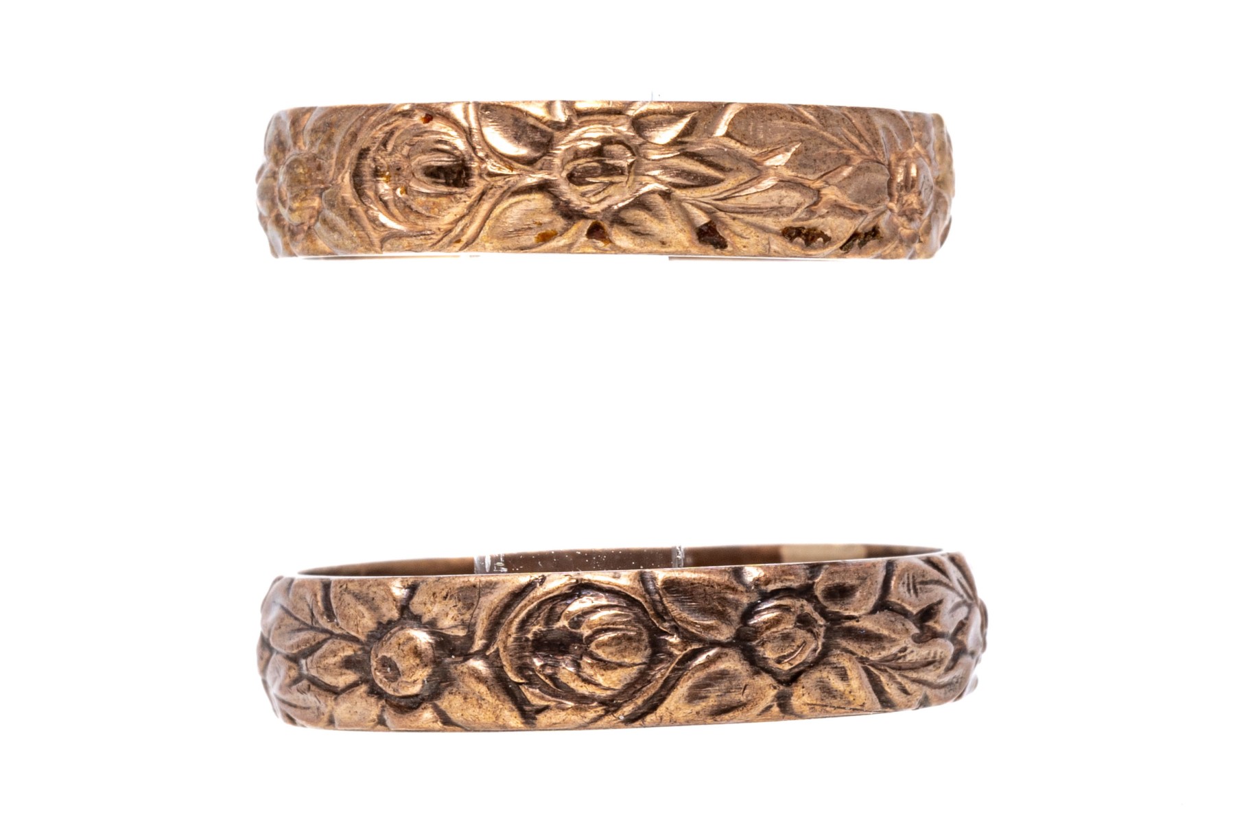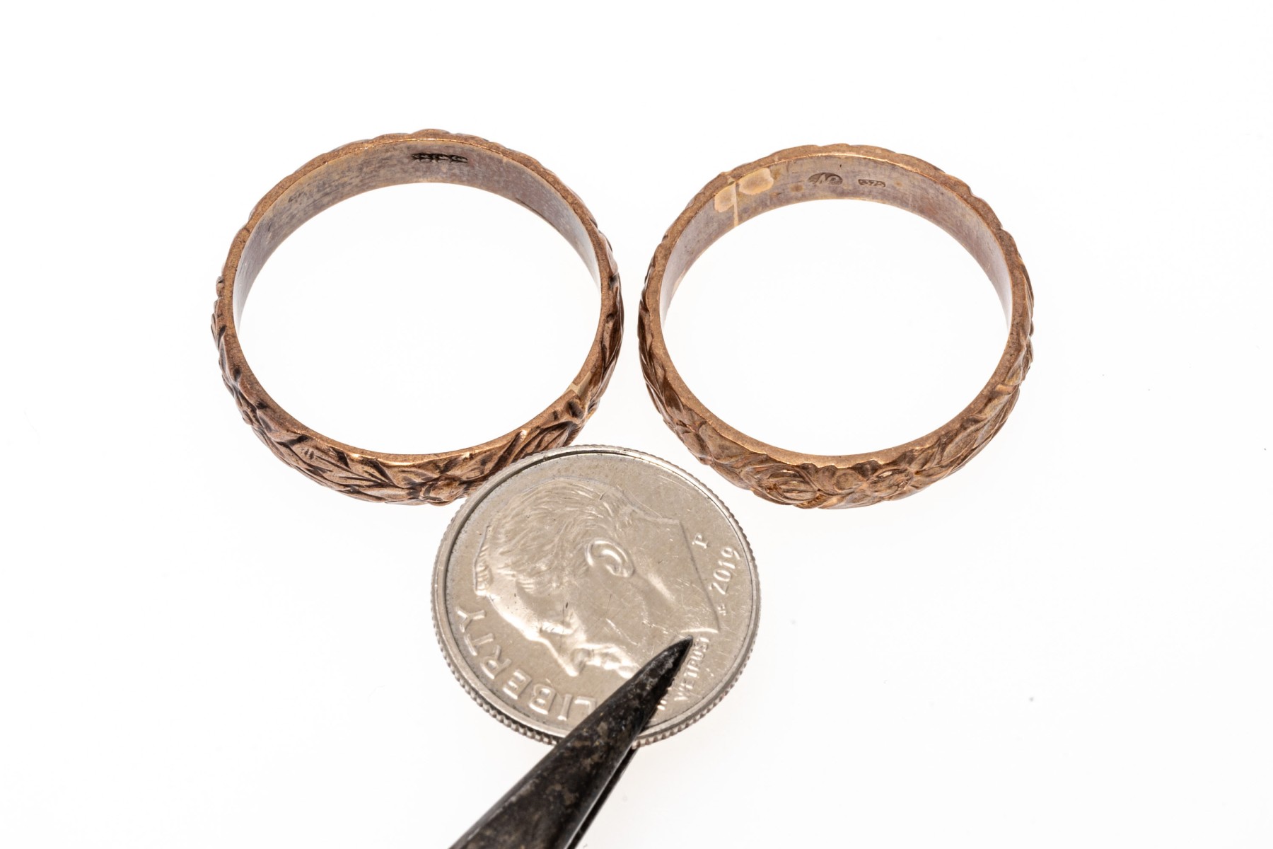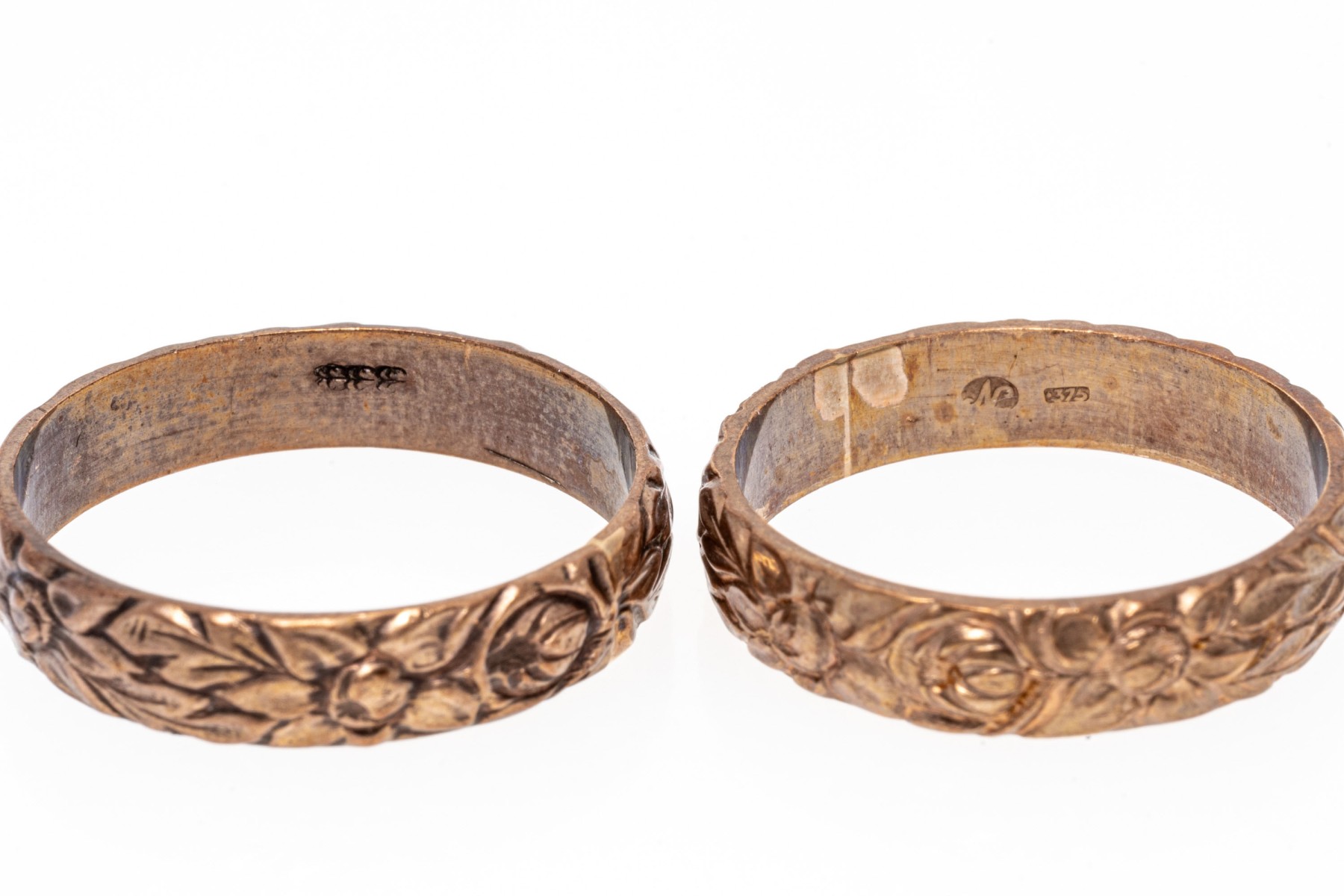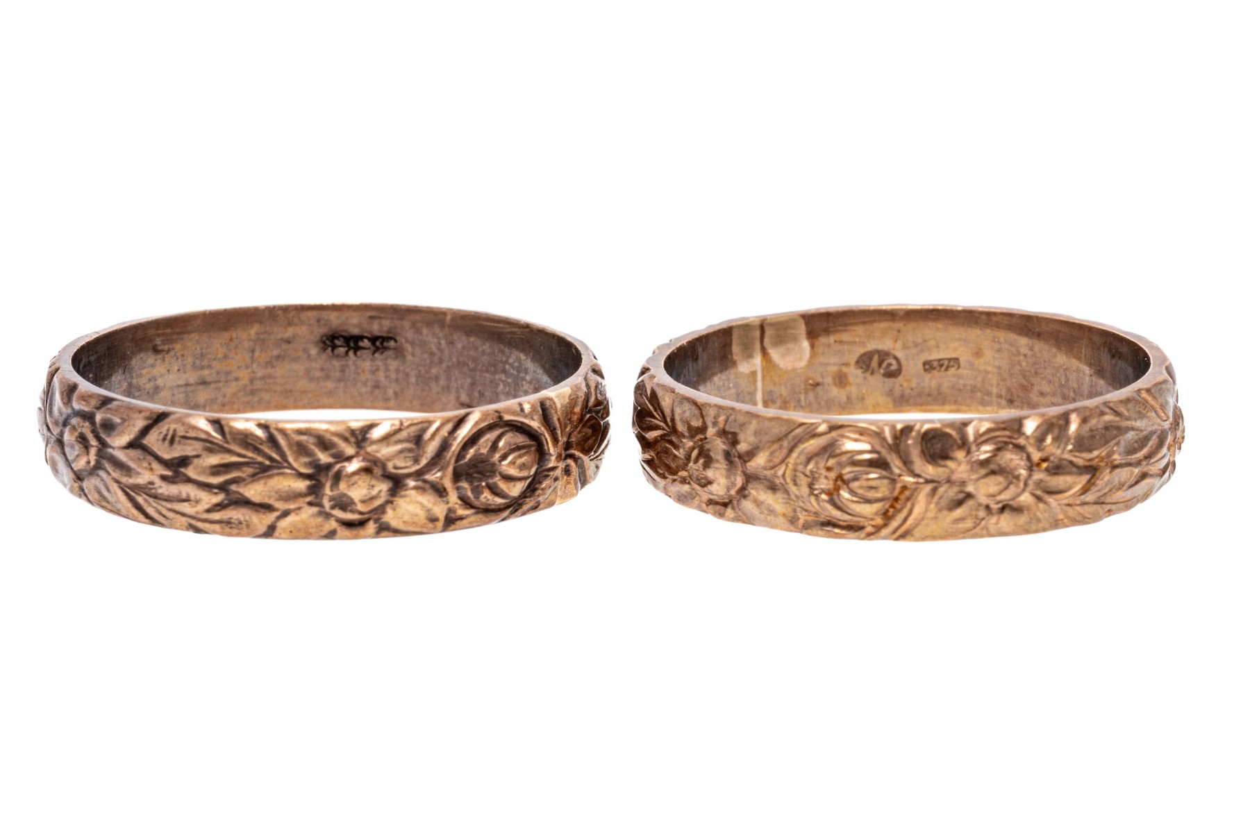 9k and sterling silver complementary flower patterned band style rings, sizes 10 and 11.25