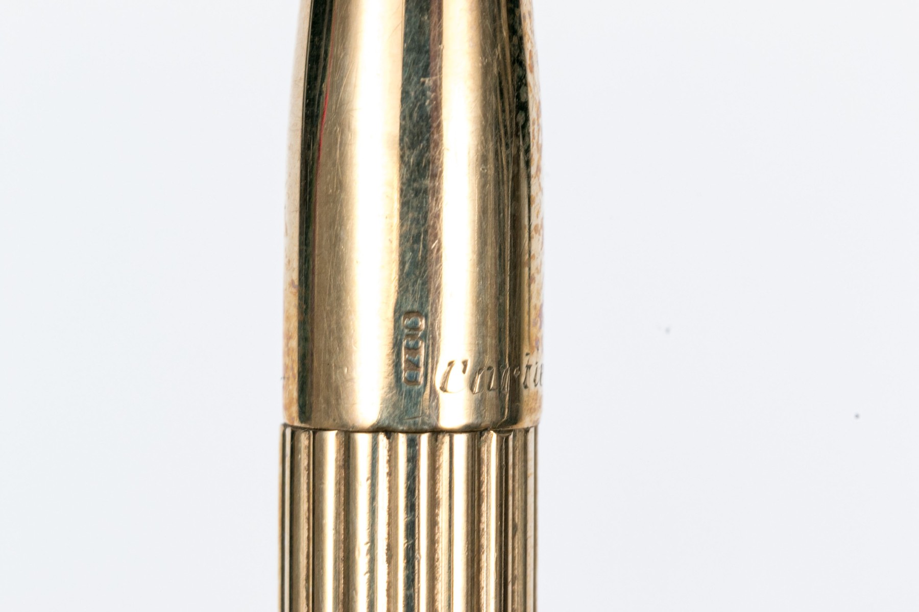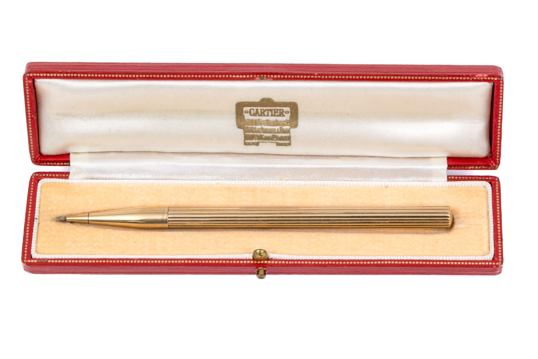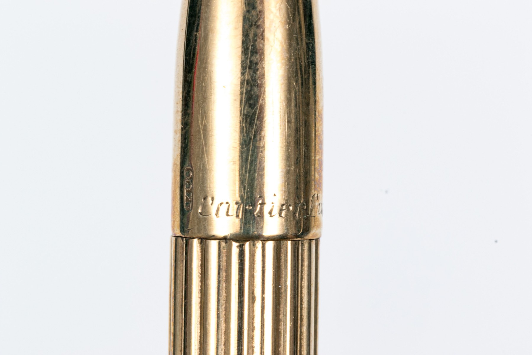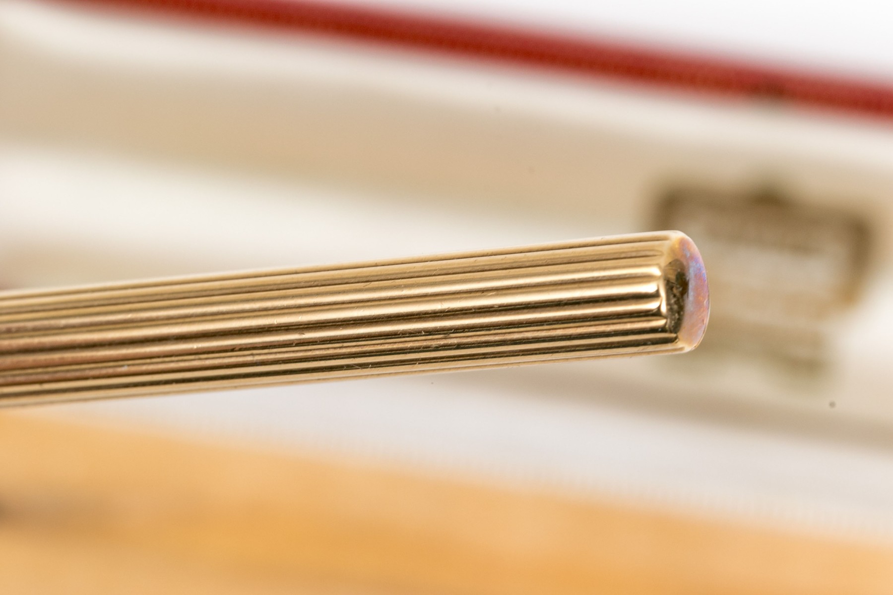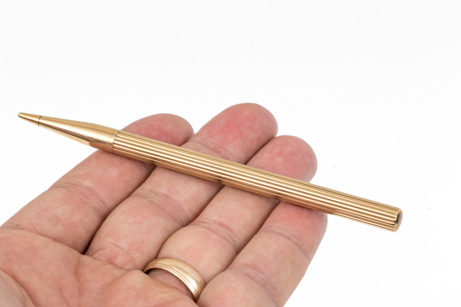 A 9K yellow gold mechanical pencil by Cartier. This pencil has a polished ribbed design.