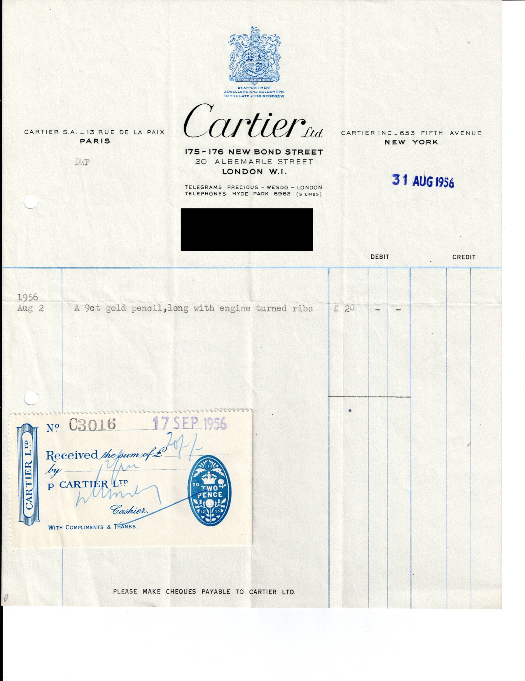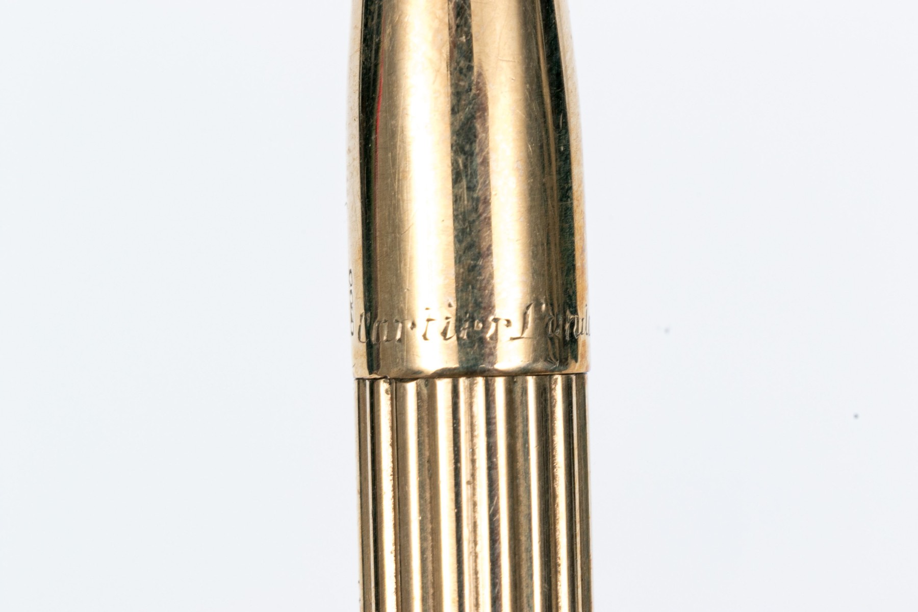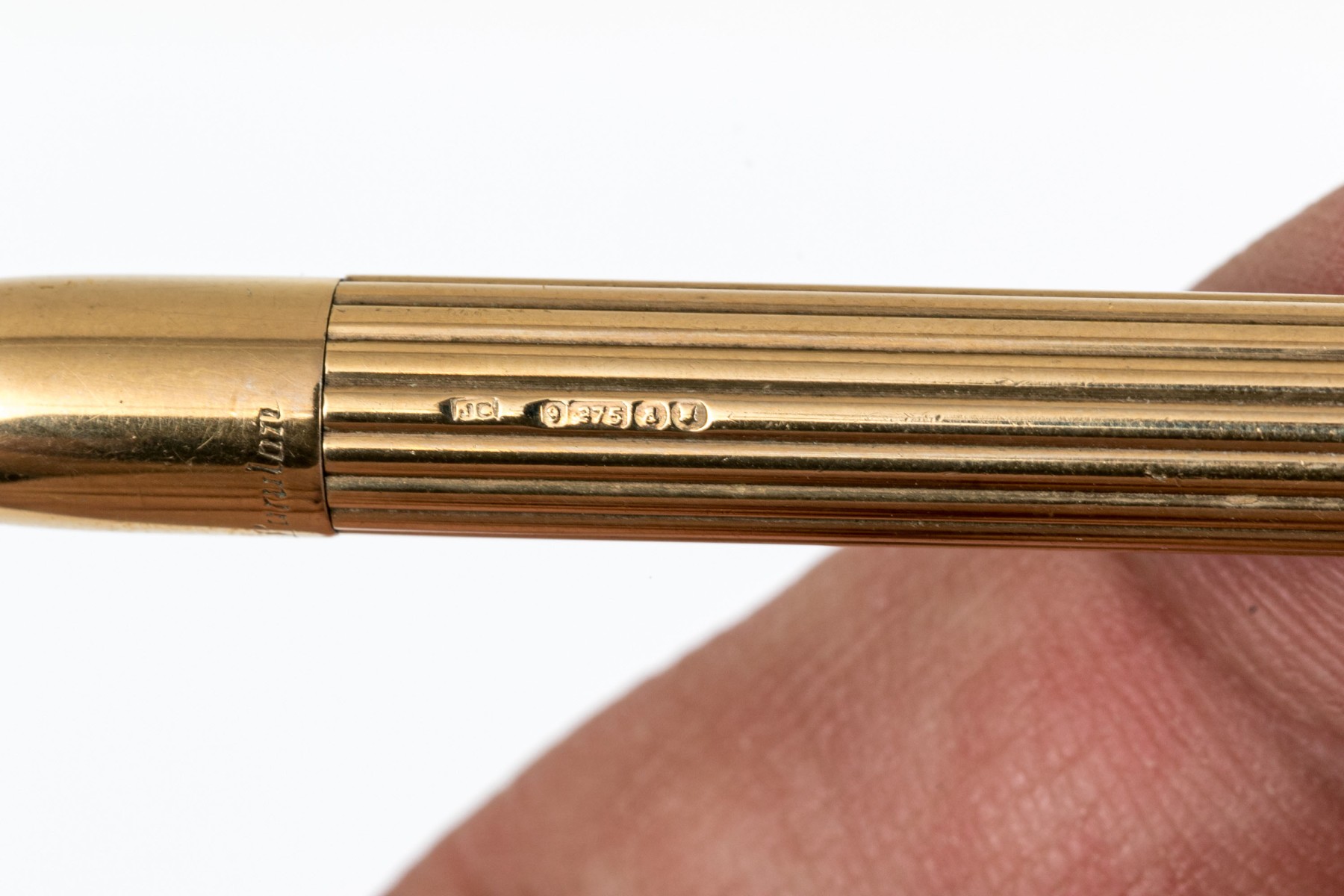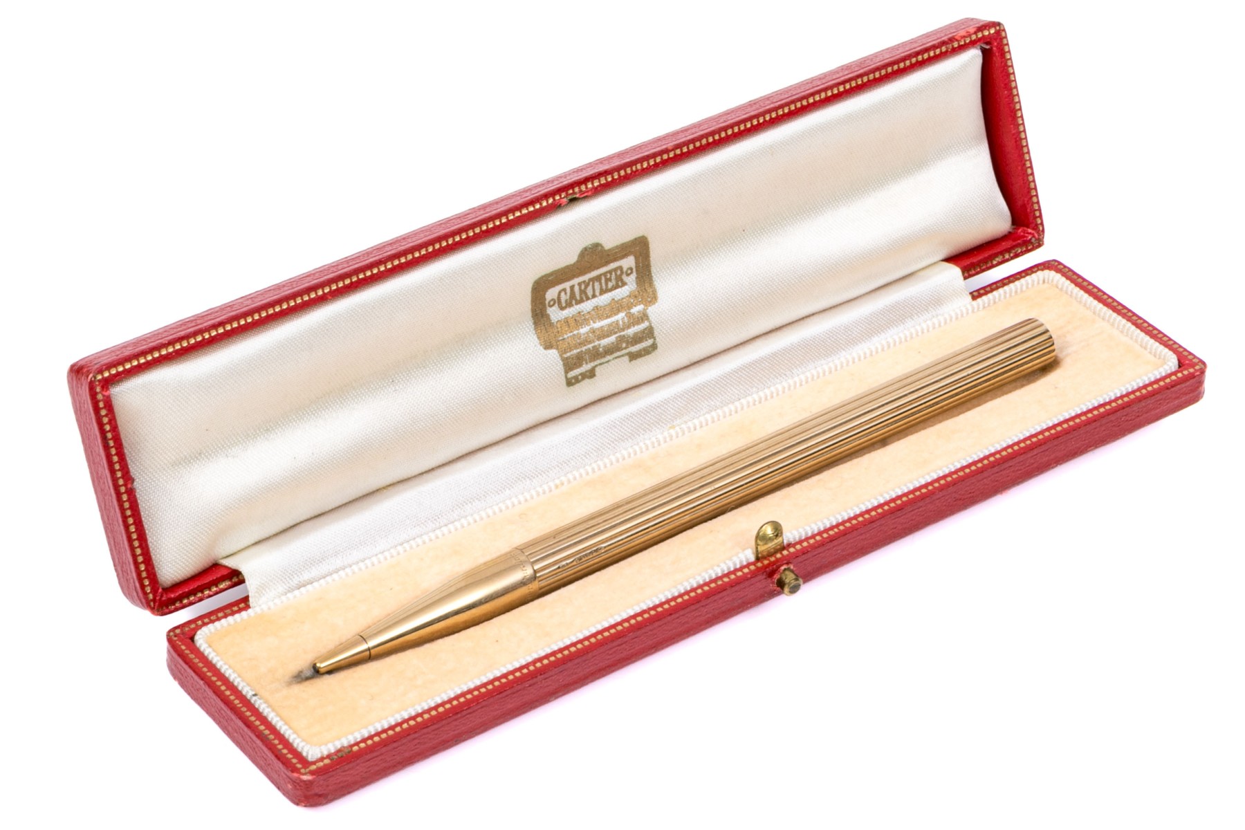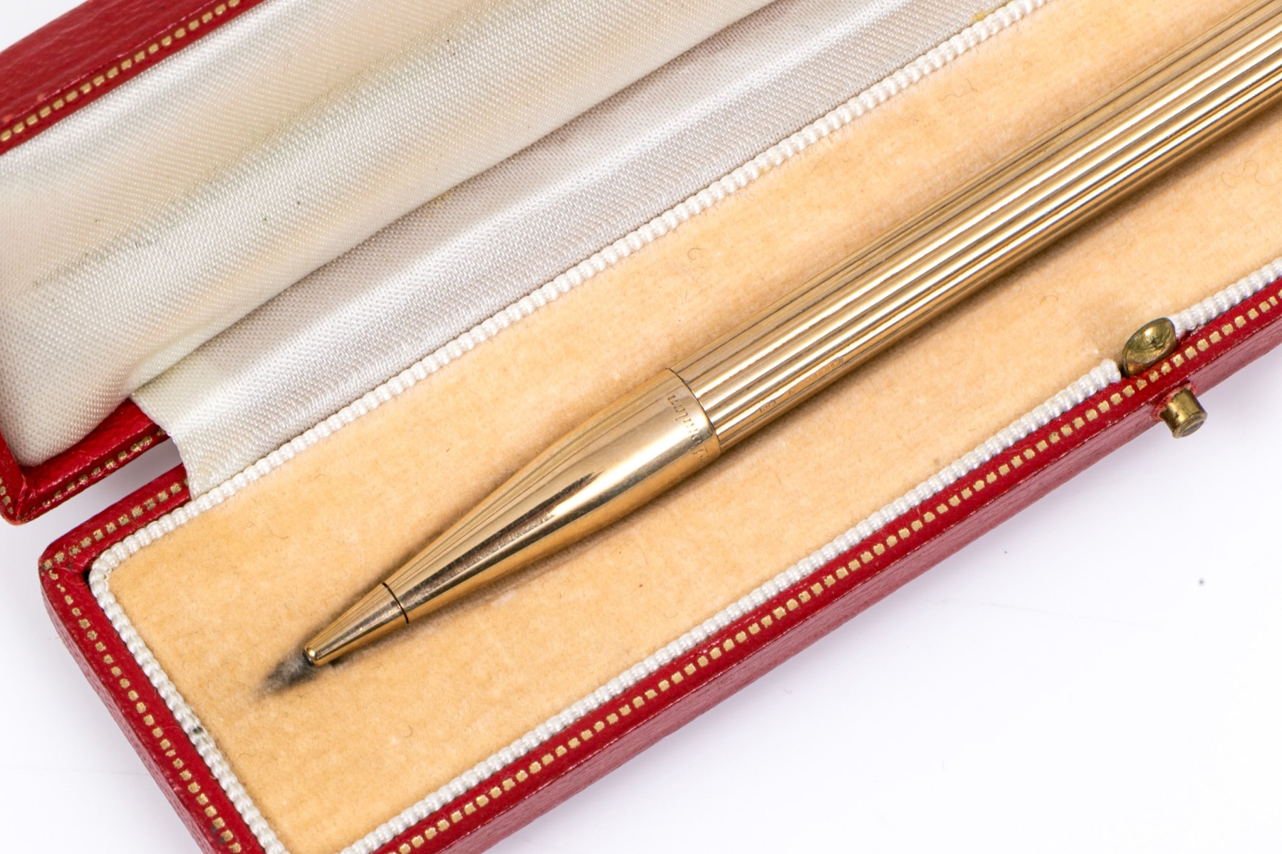 A 9K yellow gold mechanical pencil by Cartier. This pencil has a polished ribbed design.
