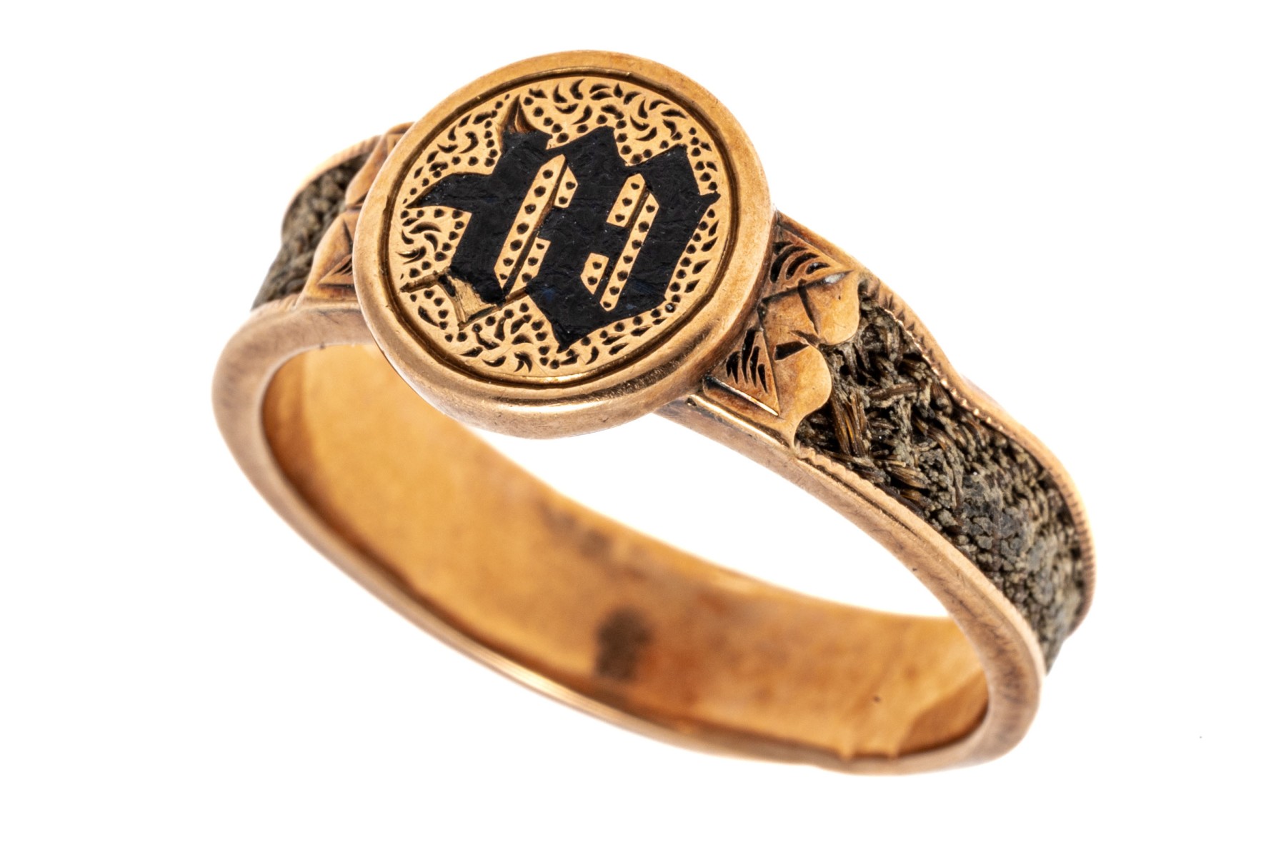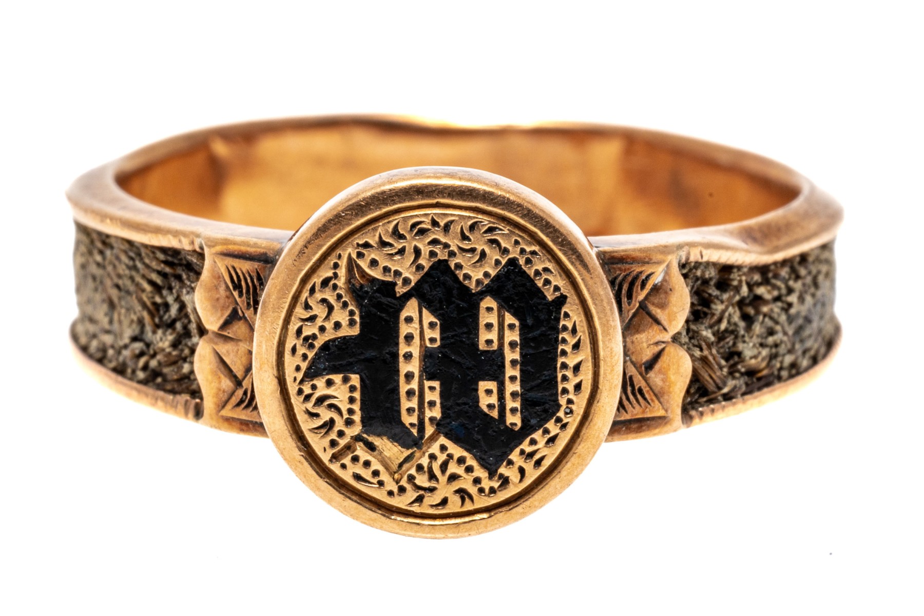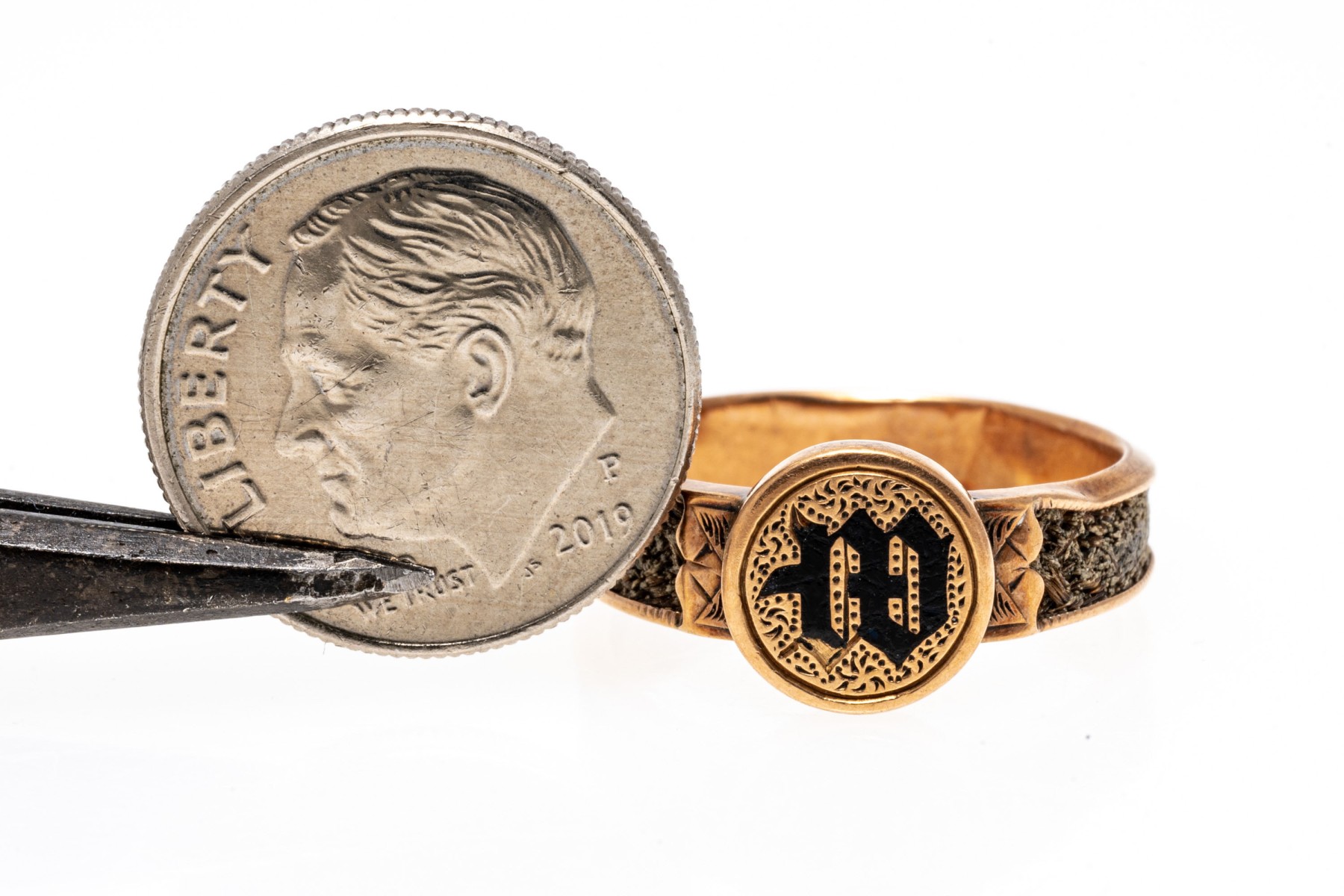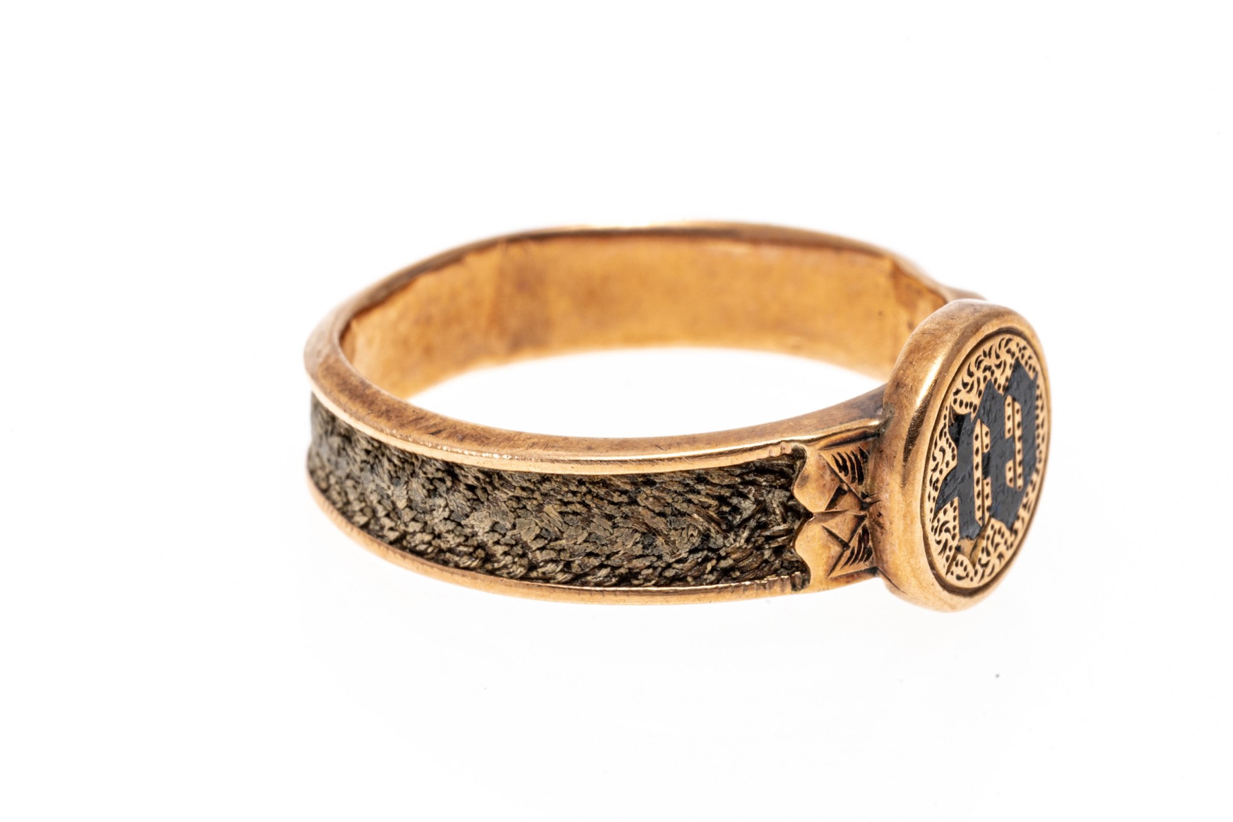 9k gold striking antique mourners ring, with braided hair inlaid band and enamel center, size 6.5. Please note, the ring cannot be sized