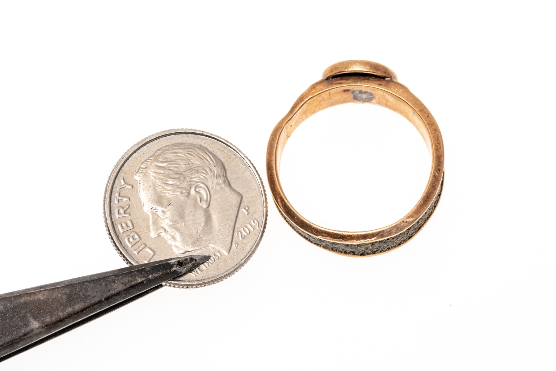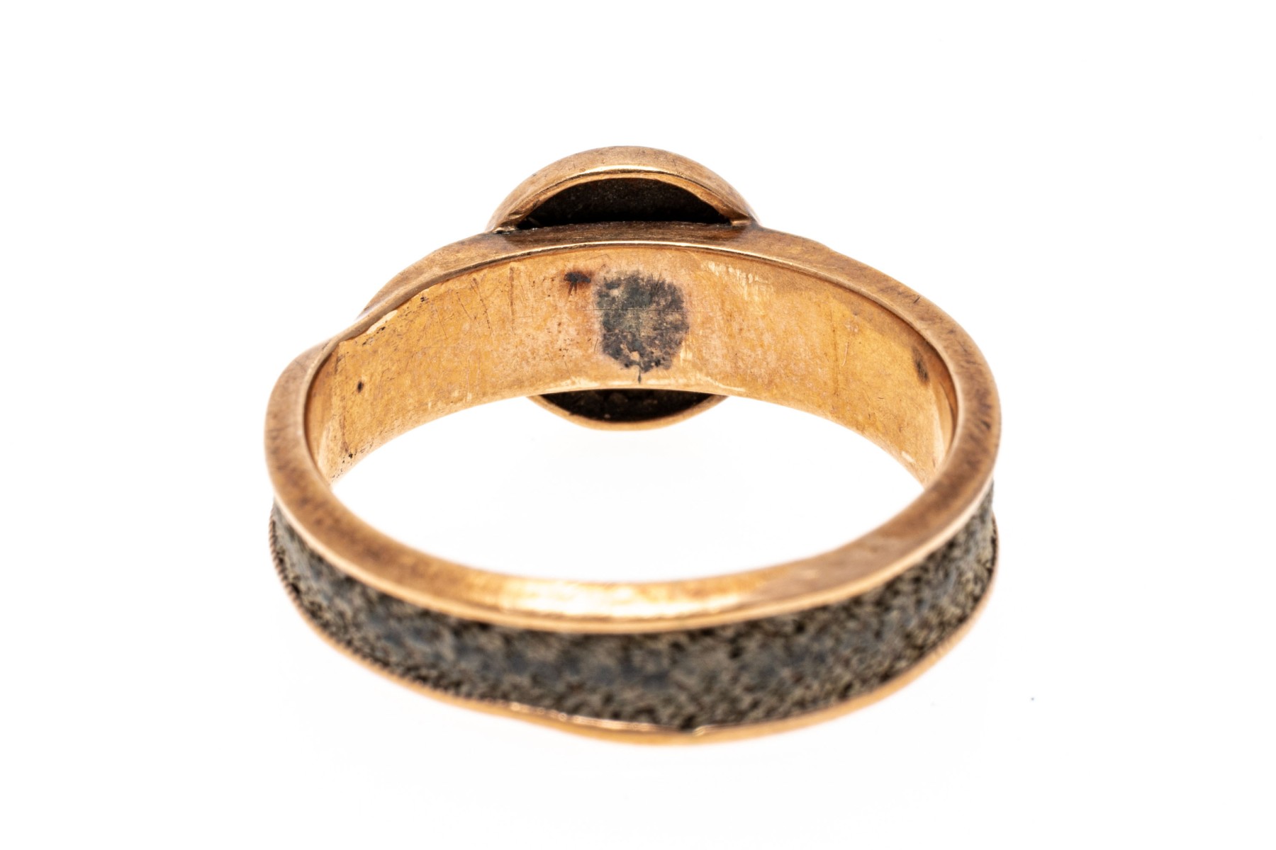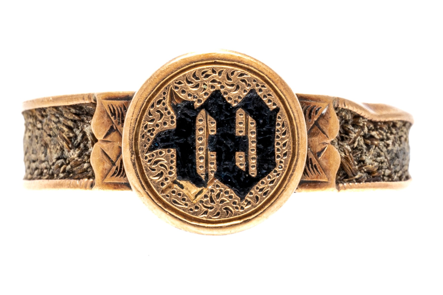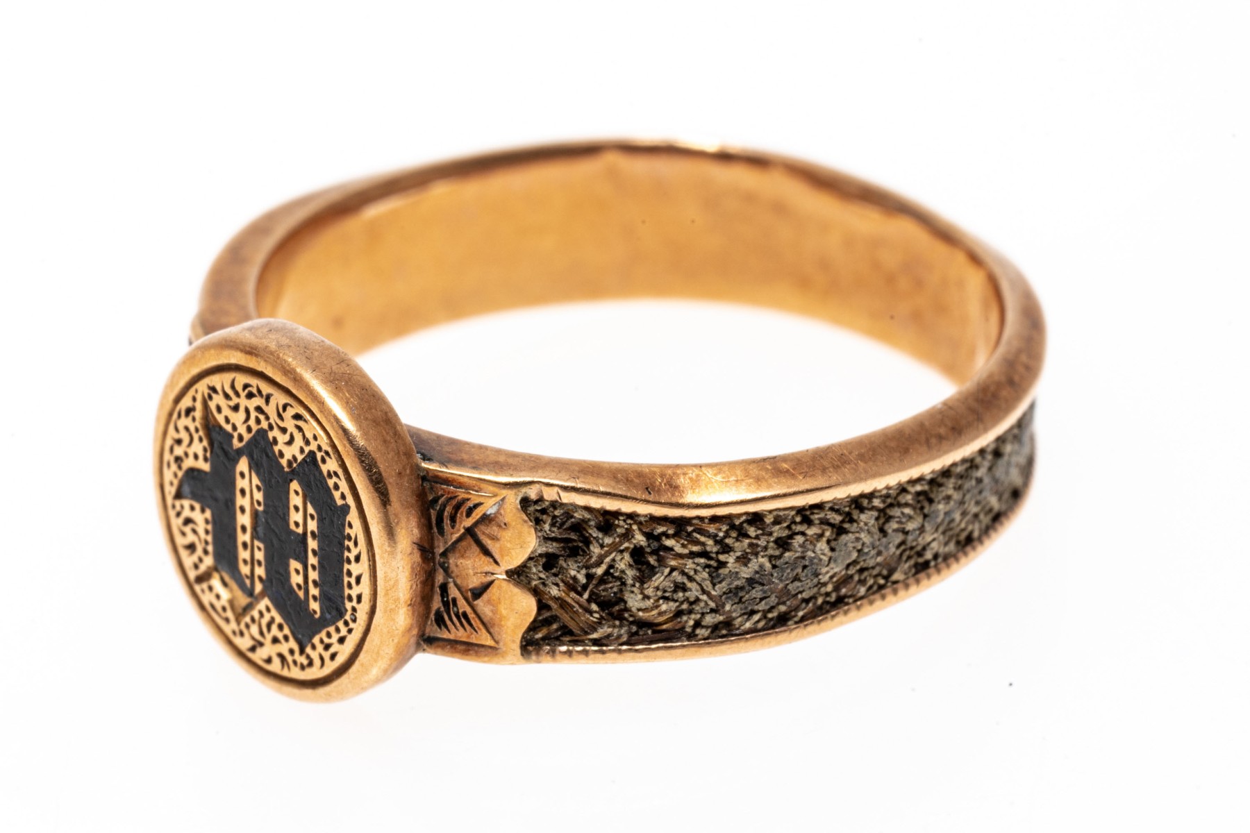 9k gold striking antique mourners ring, with braided hair inlaid band and enamel center, size 6.5. Please note, the ring cannot be sized
