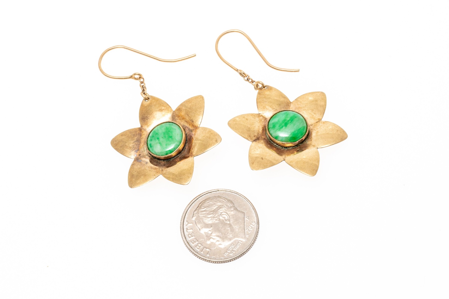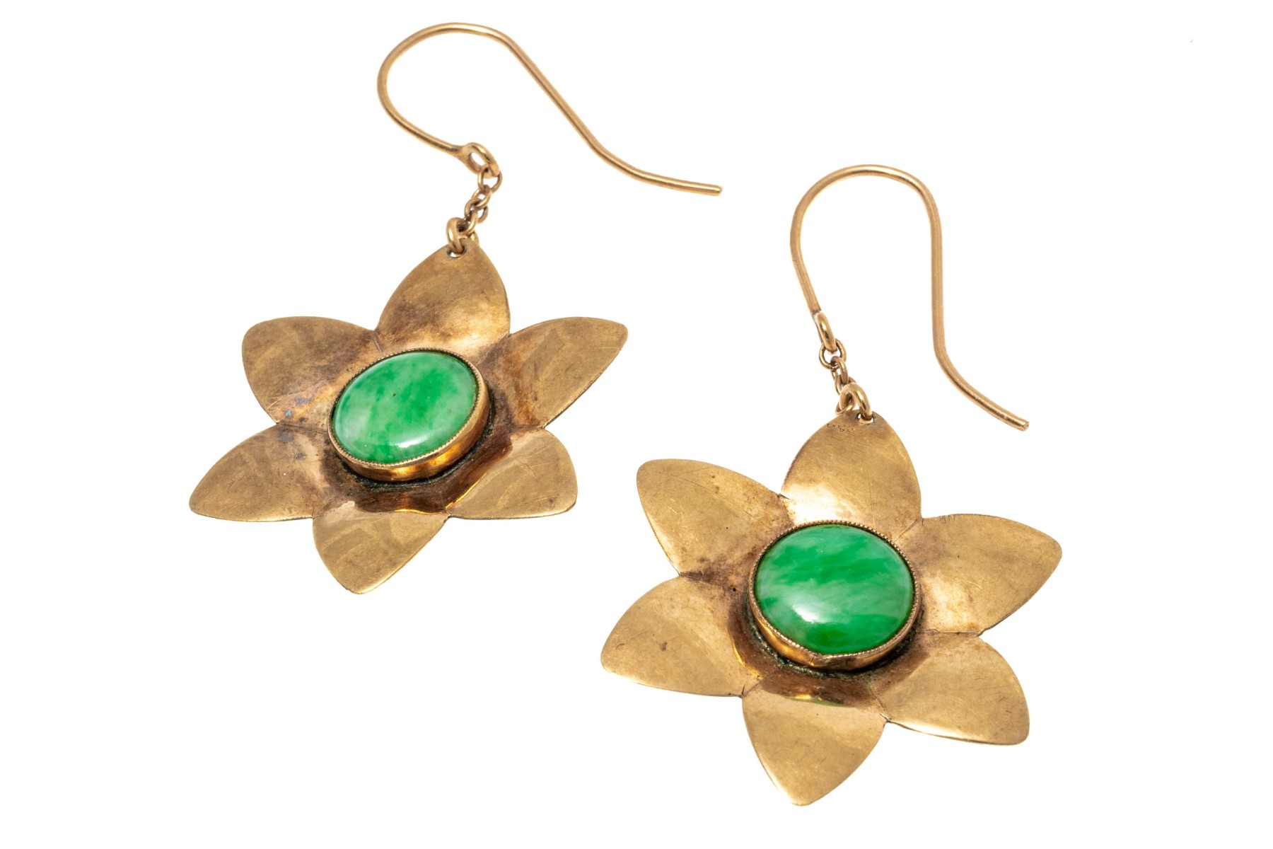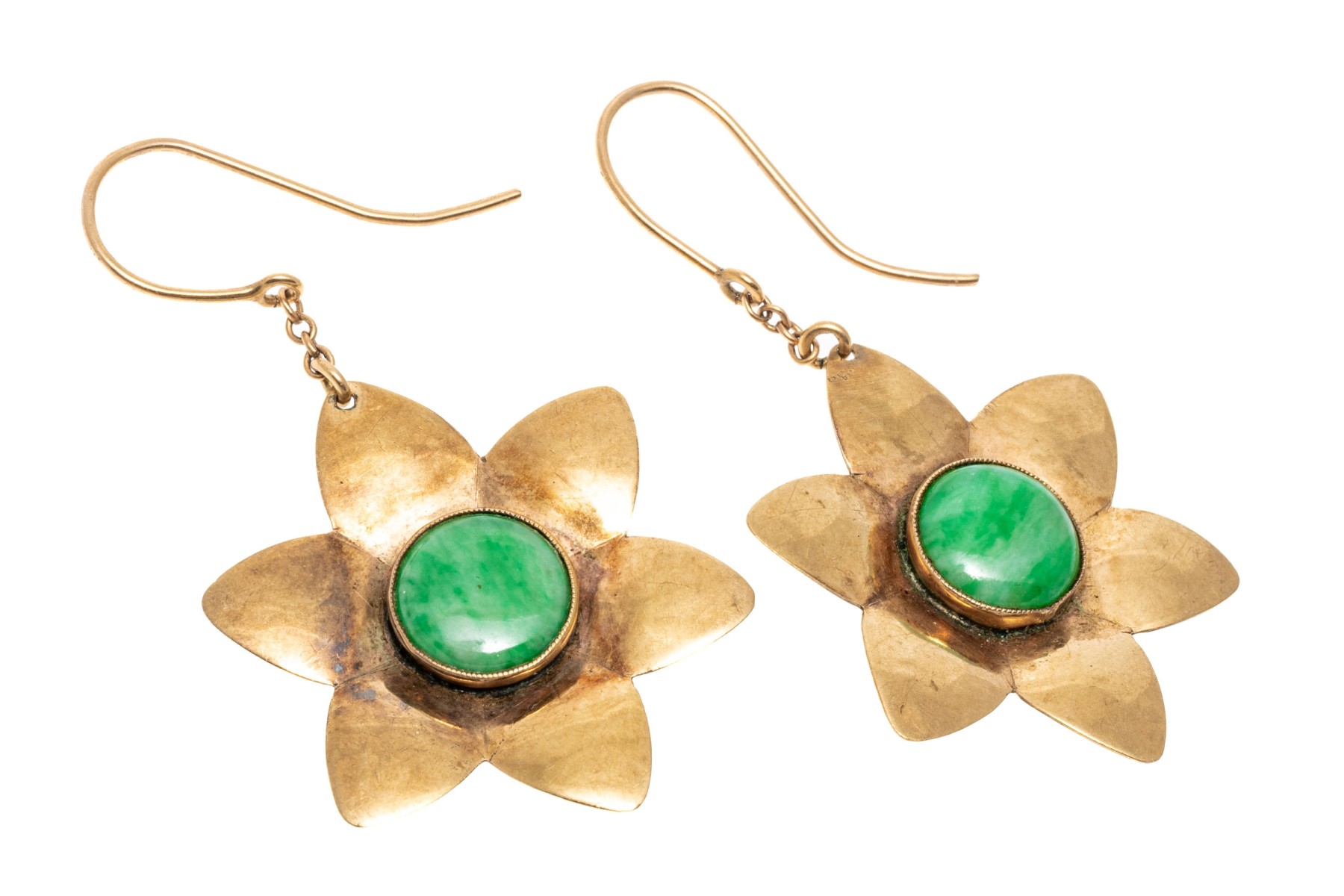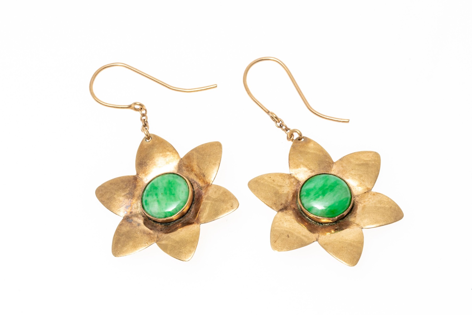 9k yellow gold fun nephrite jade set chunky flower motif earrings with shepherd's hook style backs